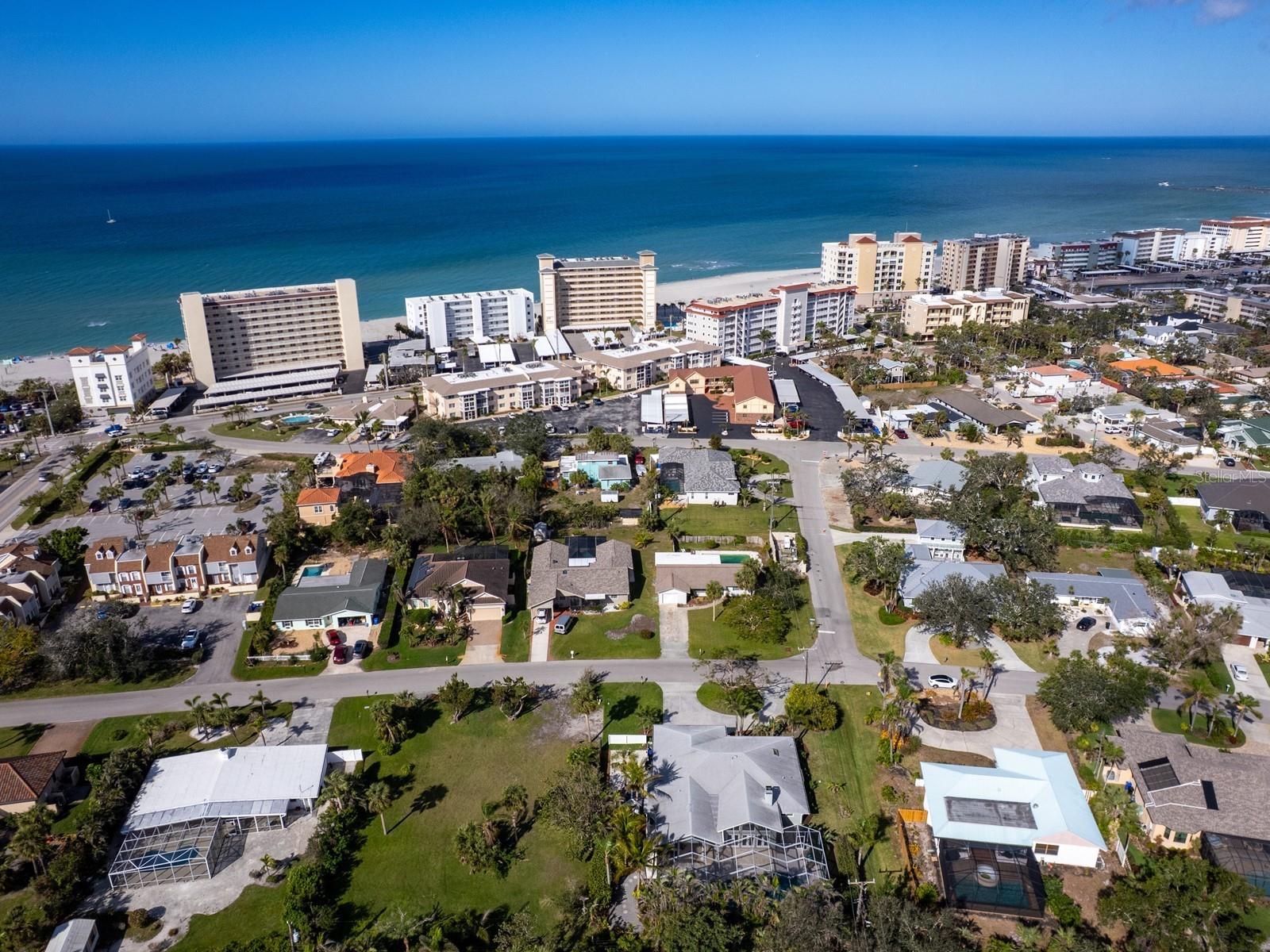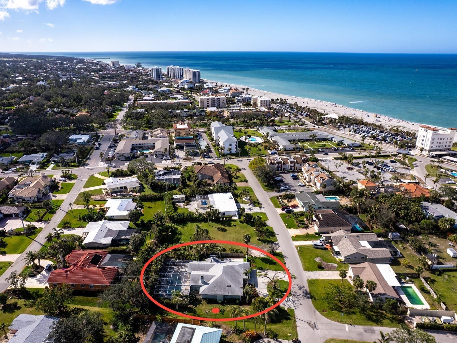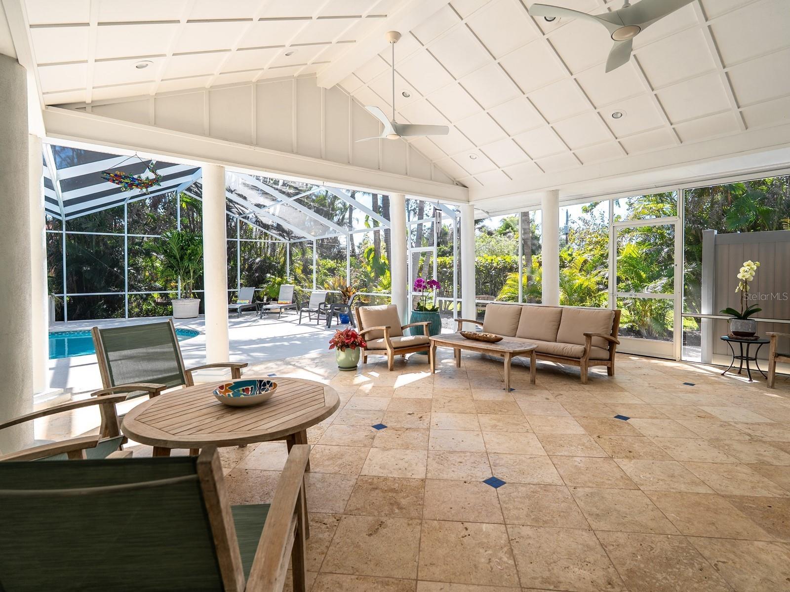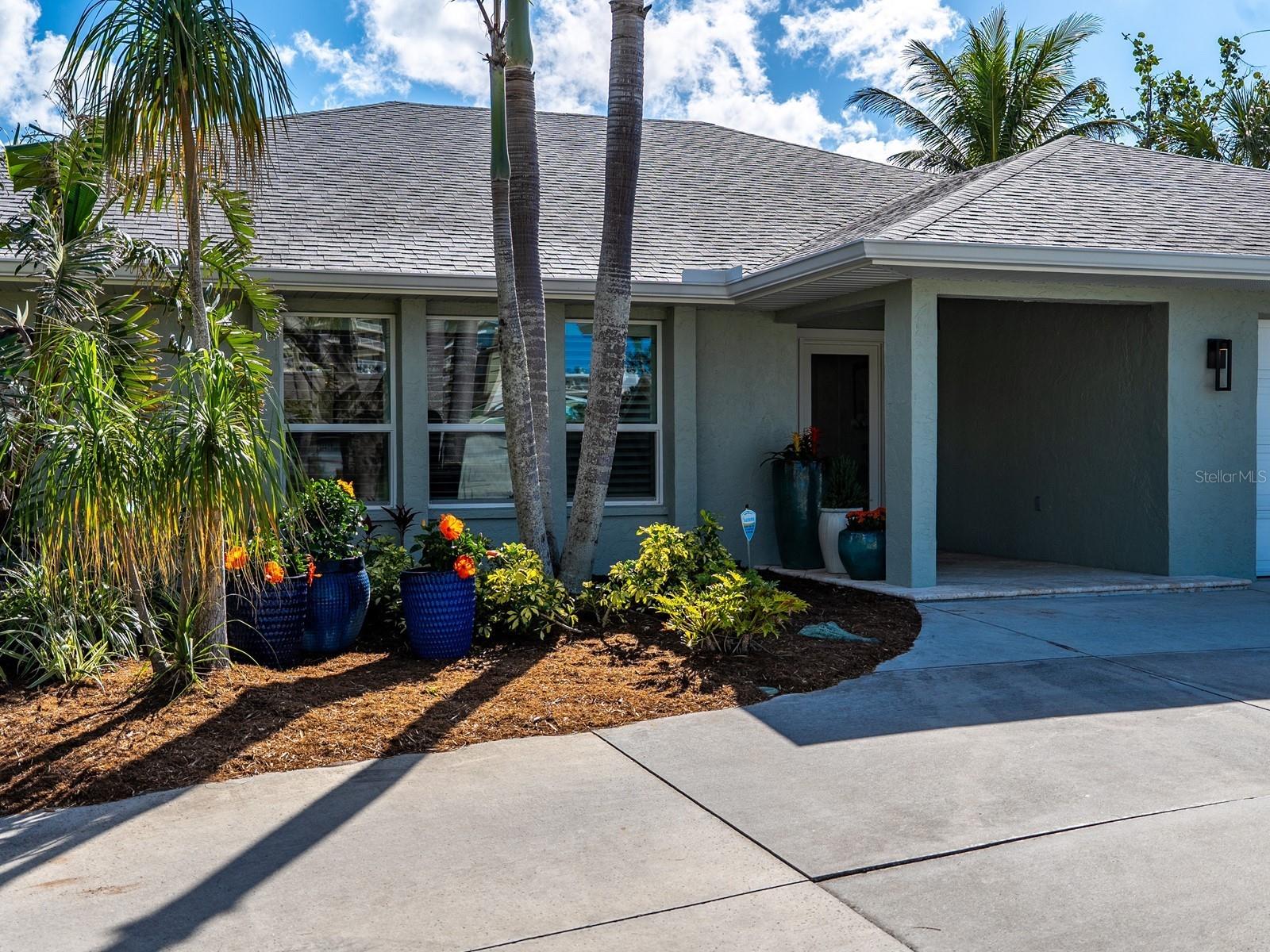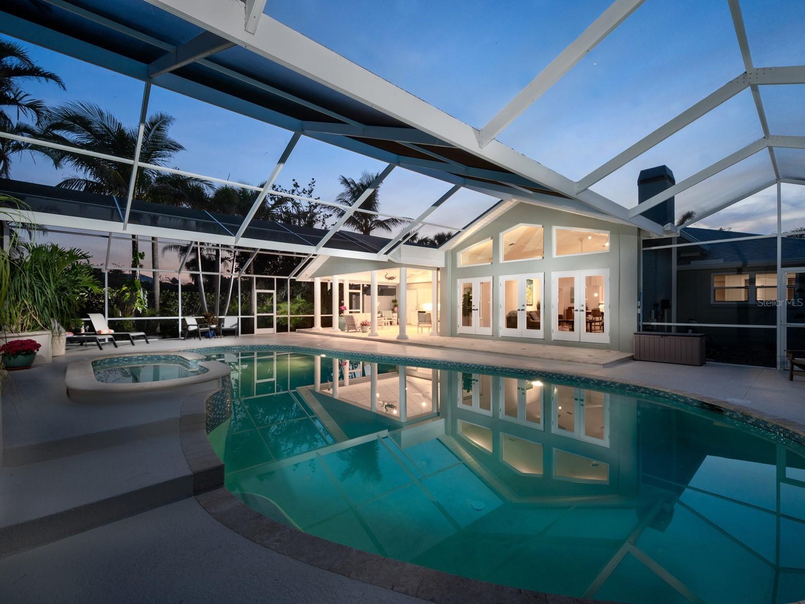 This stunning and spacious four-bedroom home has a den and features a captivating backyard oasis, ideal for relaxation and entertaining. It's just a short stroll away from the beach! Let the ocean breeze guide you to the shore, and you'll feel the warm sand beneath your toes in no time. After taking a moment to appreciate the curb appeal, you enter through the glass door into the foyer, which sets the tone for this remarkable home. The main living areas boast elegant, long-lasting, easy-care French Limestone flooring. While most of the bedrooms provide a warm, cozy ambiance with rich hardwood flooring. Numerous French doors throughout highlight the open and bright ambiance. A modern kitchen that impresses with its striking floor-to-ceiling cabinetry, exuding style. The lengthy Corian countertops create a culinary prep space that would make any chef envious. Additionally, there is a buffet area featuring built-in shelving and a planning center. The newer Bosch and GE stainless steel appliances remain. Nearby a remarkably large walk-in pantry awaits--a dream come true with its ingenious storage solutions. A trendy basin sink is beautifully oriented toward the breakfast bar, seamlessly connecting to the great room and enhancing the flow of the layout. In the dining and living areas, you are enveloped by spaciousness created by the soaring vaulted ceilings, a dramatic French Limestone fireplace, and clerestory windows. Three sets of French doors crowned by three clerestory windows overlook the impressive outdoor entertainment area. Experience a dream sanctuary, complete with an expansive vaulted cage pool that beckons you to unwind in the luxurious spa with a soothing spillover feature. Imagine entertaining in the nearly 600 square foot covered area, where laughter and joy flow as freely as the drinks from your nicely equipped summer kitchen. This is the ultimate haven for leisure and celebration, a paradise you won't want to leave! When it's time to recharge, the Primary Suite offers the privacy you desire. A sliding barn-style door opens to the renovated en suite bath with double walk-in closets, luxurious granite, elegant dual sinks, a French Limestone shower surround, and a private water closet. Adjacent is a den/study with stylish built-in cabinetry that enhances functionality and aesthetics. There is a guest wing with a bathroom and a bedroom featuring a Murphy bed, allowing flexible use. Two full bedrooms are located near a dual-function bathroom with a full and half bath with direct pool access. It is poised perfectly in a desirable area without association restrictions, with a side-yard patio, outbuilding storage, a 2-car garage, and a circular drive.