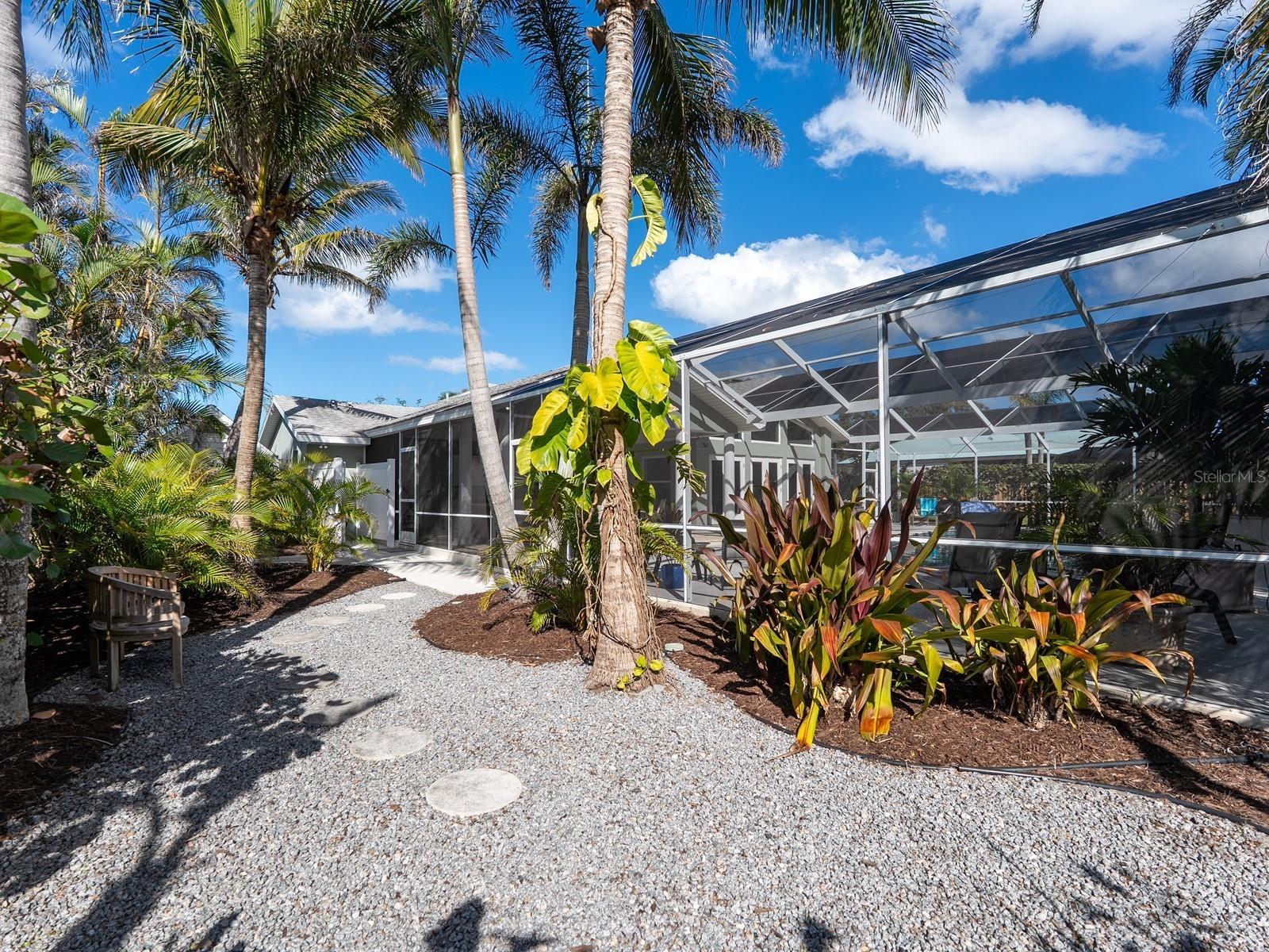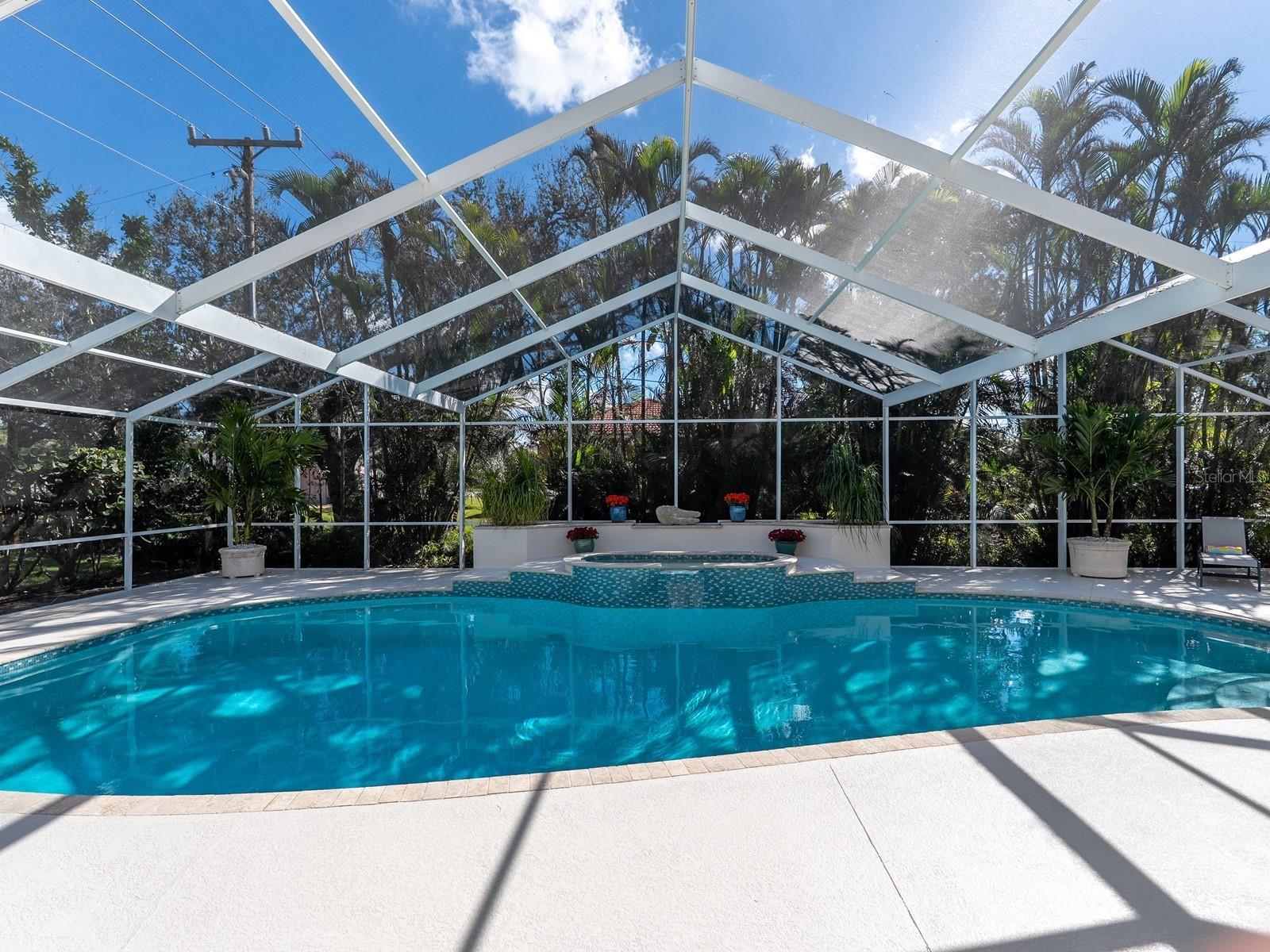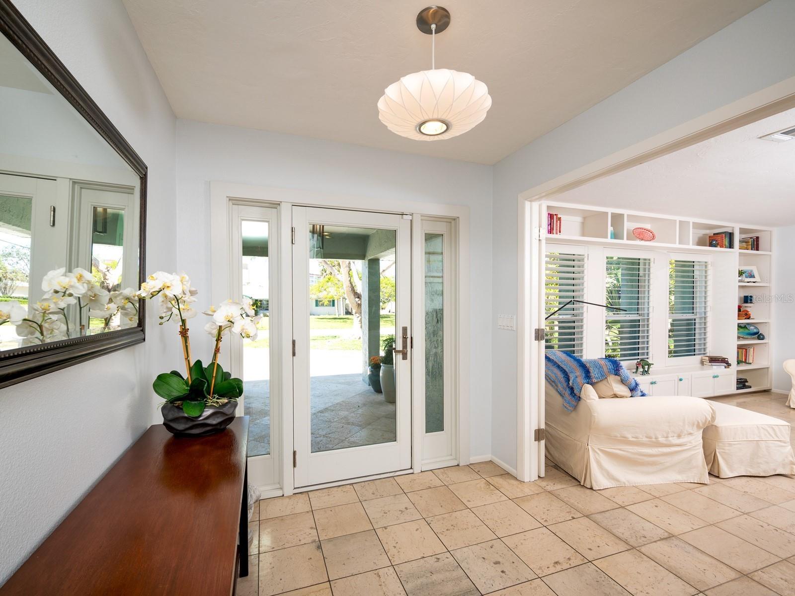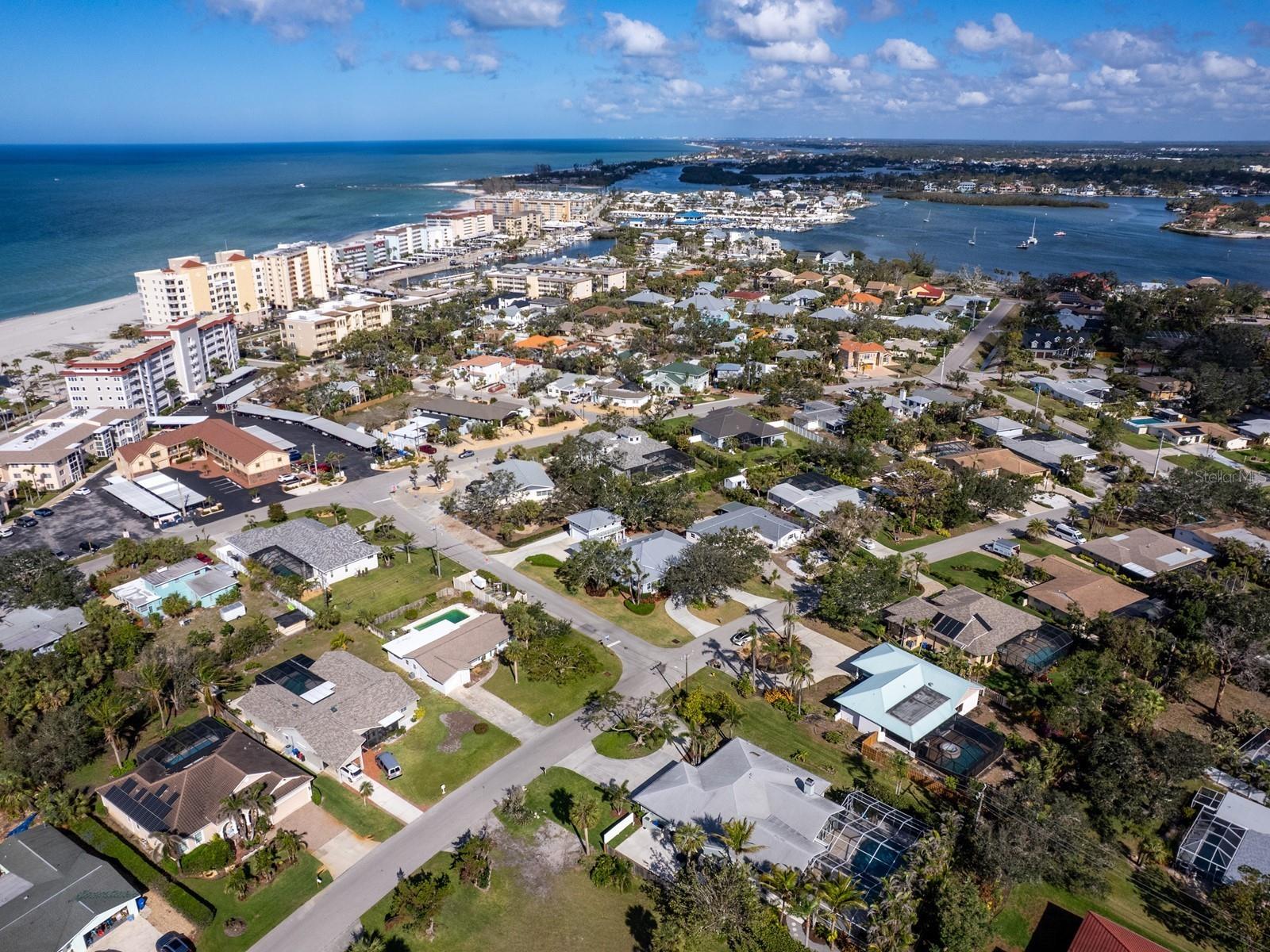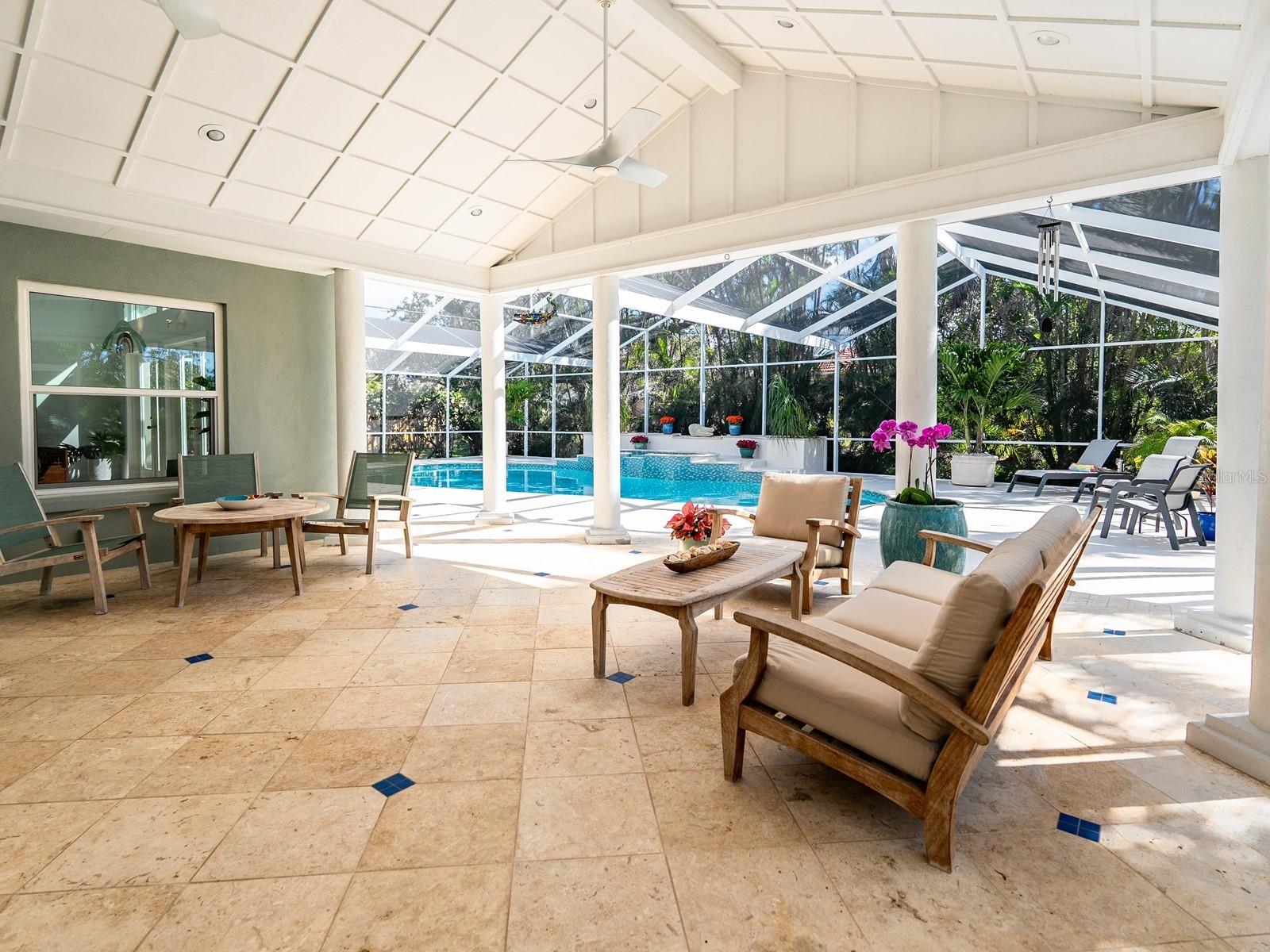 This stunning and spacious four-bedroom home has a den and features a captivating backyard oasis, ideal for relaxation and entertaining. It's just a short stroll away from the beach! Let the ocean breeze guide you to the shore, and you'll feel the warm sand beneath your toes in no time. After taking a moment to appreciate the curb appeal, you enter through the glass door into the foyer, which sets the tone for this remarkable home. The main living areas boast elegant, long-lasting, easy-care French Limestone flooring. While most of the bedrooms provide a warm, cozy ambiance with rich hardwood flooring. Numerous French doors throughout highlight the open and bright ambiance. A modern kitchen that impresses with its striking floor-to-ceiling cabinetry, exuding style. The lengthy Corian countertops create a culinary prep space that would make any chef envious. Additionally, there is a buffet area featuring built-in shelving and a planning center. The newer Bosch and GE stainless steel appliances remain. Nearby a remarkably large walk-in pantry awaits--a dream come true with its ingenious storage solutions. A trendy basin sink is beautifully oriented toward the breakfast bar, seamlessly connecting to the great room and enhancing the flow of the layout. In the dining and living areas, you are enveloped by spaciousness created by the soaring vaulted ceilings, a dramatic French Limestone fireplace, and clerestory windows. Three sets of French doors crowned by three clerestory windows overlook the impressive outdoor entertainment area. Experience a dream sanctuary, complete with an expansive vaulted cage pool that beckons you to unwind in the luxurious spa with a soothing spillover feature. Imagine entertaining in the nearly 600 square foot covered area, where laughter and joy flow as freely as the drinks from your nicely equipped summer kitchen. This is the ultimate haven for leisure and celebration, a paradise you won't want to leave! When it's time to recharge, the Primary Suite offers the privacy you desire. A sliding barn-style door opens to the renovated en suite bath with double walk-in closets, luxurious granite, elegant dual sinks, a French Limestone shower surround, and a private water closet. Adjacent is a den/study with stylish built-in cabinetry that enhances functionality and aesthetics. There is a guest wing with a bathroom and a bedroom featuring a Murphy bed, allowing flexible use. Two full bedrooms are located near a dual-function bathroom with a full and half bath with direct pool access. It is poised perfectly in a desirable area without association restrictions, with a side-yard patio, outbuilding storage, a 2-car garage, and a circular drive.