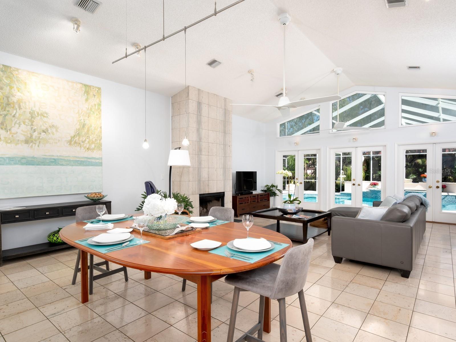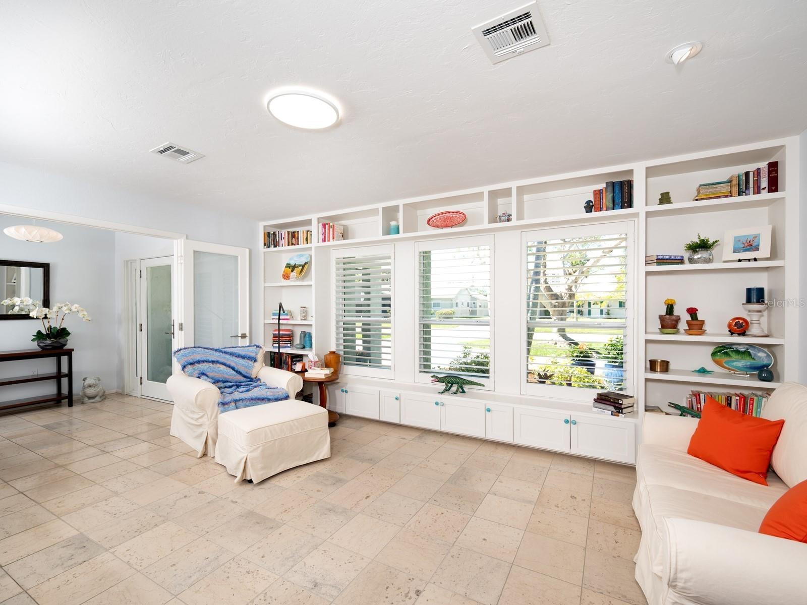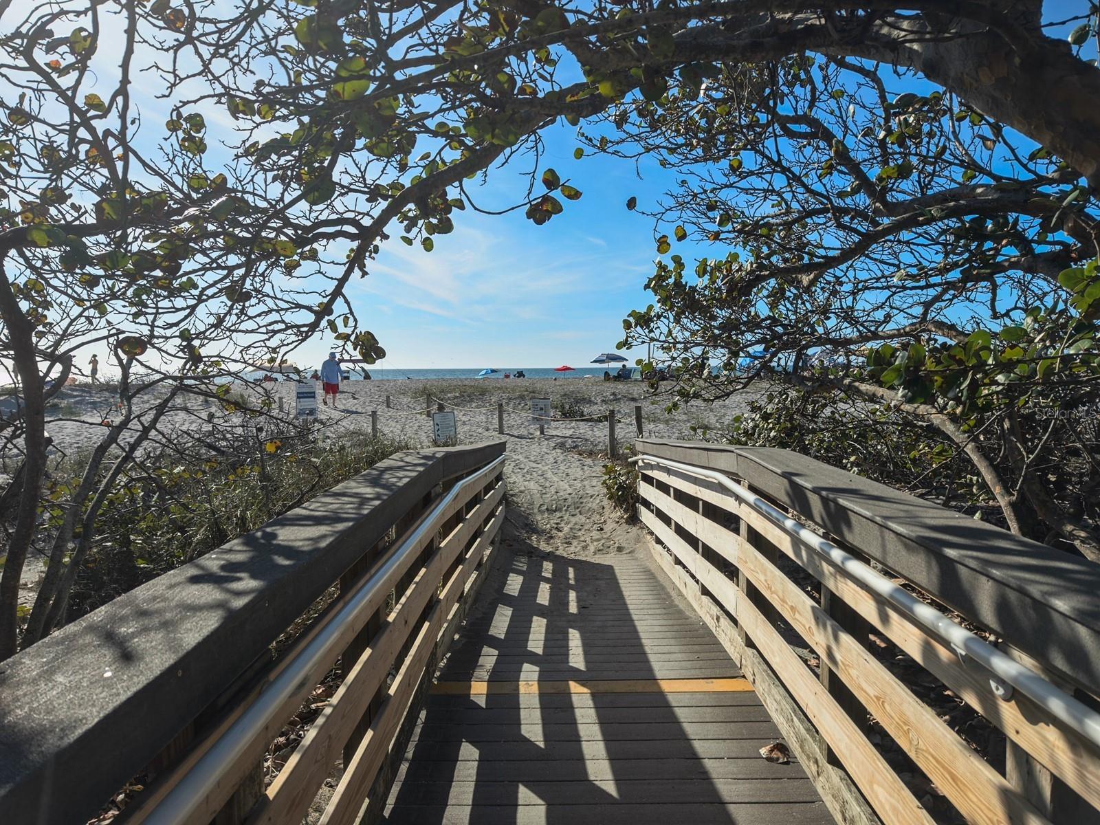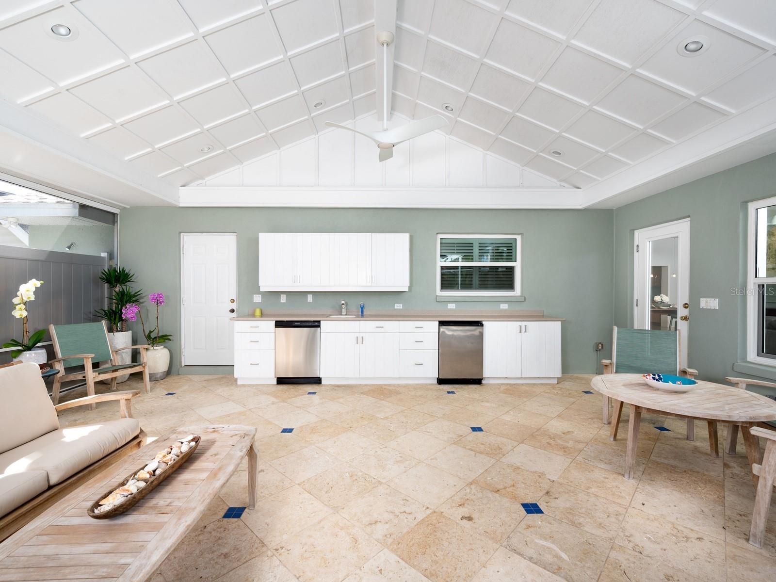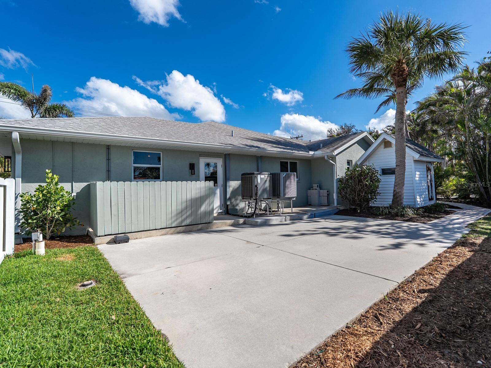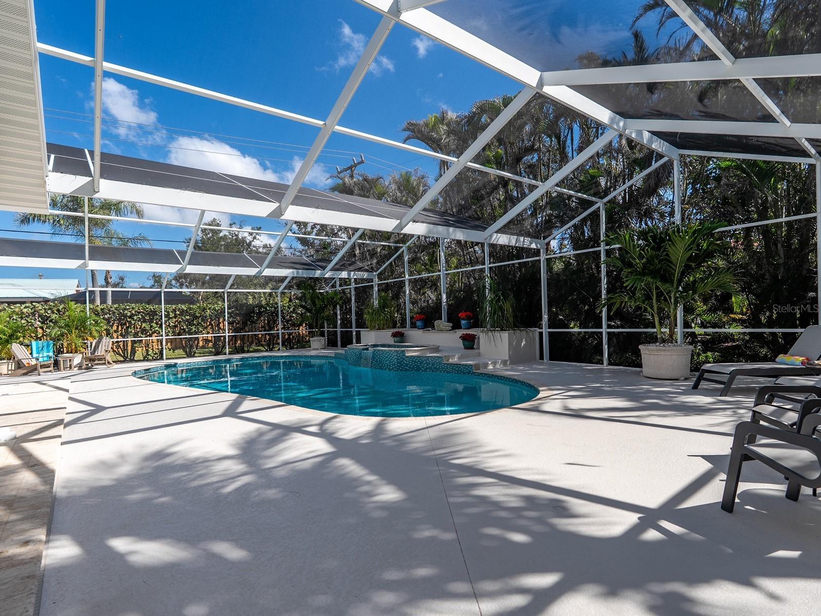 This stunning and spacious four-bedroom home has a den and features a captivating backyard oasis, ideal for relaxation and entertaining. It's just a short stroll away from the beach! Let the ocean breeze guide you to the shore, and you'll feel the warm sand beneath your toes in no time. After taking a moment to appreciate the curb appeal, you enter through the glass door into the foyer, which sets the tone for this remarkable home. The main living areas boast elegant, long-lasting, easy-care French Limestone flooring. While most of the bedrooms provide a warm, cozy ambiance with rich hardwood flooring. Numerous French doors throughout highlight the open and bright ambiance. A modern kitchen that impresses with its striking floor-to-ceiling cabinetry, exuding style. The lengthy Corian countertops create a culinary prep space that would make any chef envious. Additionally, there is a buffet area featuring built-in shelving and a planning center. The newer Bosch and GE stainless steel appliances remain. Nearby a remarkably large walk-in pantry awaits--a dream come true with its ingenious storage solutions. A trendy basin sink is beautifully oriented toward the breakfast bar, seamlessly connecting to the great room and enhancing the flow of the layout. In the dining and living areas, you are enveloped by spaciousness created by the soaring vaulted ceilings, a dramatic French Limestone fireplace, and clerestory windows. Three sets of French doors crowned by three clerestory windows overlook the impressive outdoor entertainment area. Experience a dream sanctuary, complete with an expansive vaulted cage pool that beckons you to unwind in the luxurious spa with a soothing spillover feature. Imagine entertaining in the nearly 600 square foot covered area, where laughter and joy flow as freely as the drinks from your nicely equipped summer kitchen. This is the ultimate haven for leisure and celebration, a paradise you won't want to leave! When it's time to recharge, the Primary Suite offers the privacy you desire. A sliding barn-style door opens to the renovated en suite bath with double walk-in closets, luxurious granite, elegant dual sinks, a French Limestone shower surround, and a private water closet. Adjacent is a den/study with stylish built-in cabinetry that enhances functionality and aesthetics. There is a guest wing with a bathroom and a bedroom featuring a Murphy bed, allowing flexible use. Two full bedrooms are located near a dual-function bathroom with a full and half bath with direct pool access. It is poised perfectly in a desirable area without association restrictions, with a side-yard patio, outbuilding storage, a 2-car garage, and a circular drive.