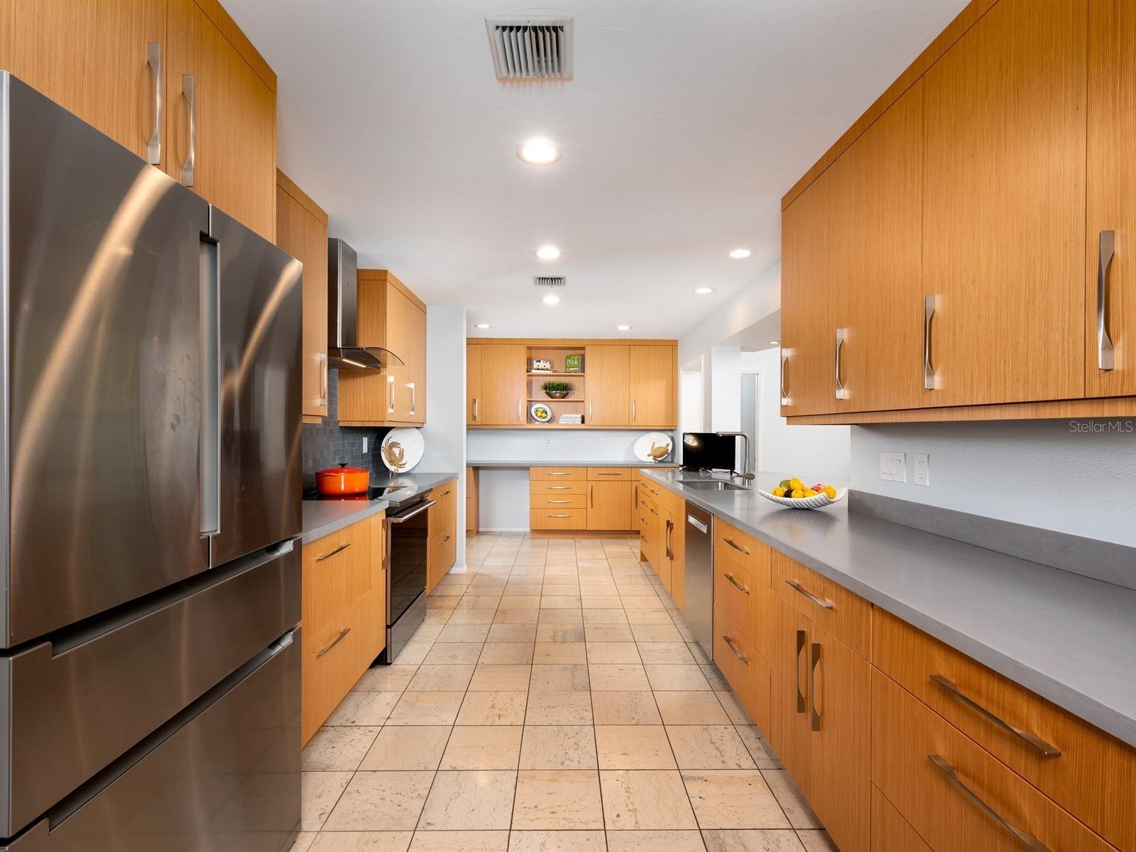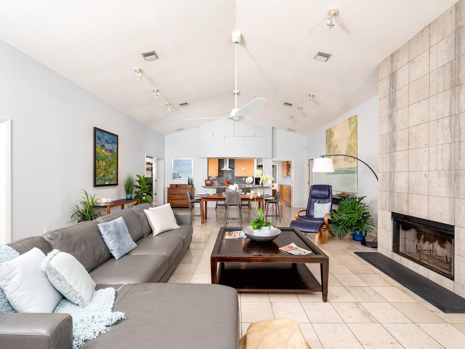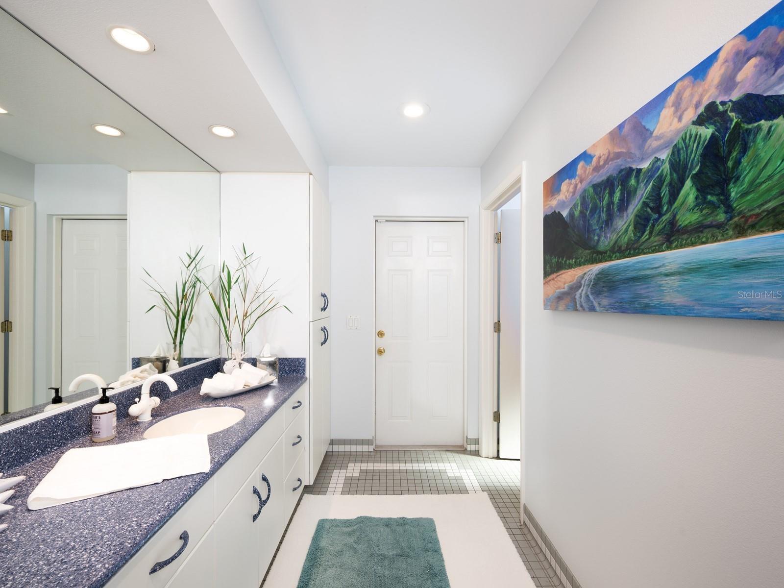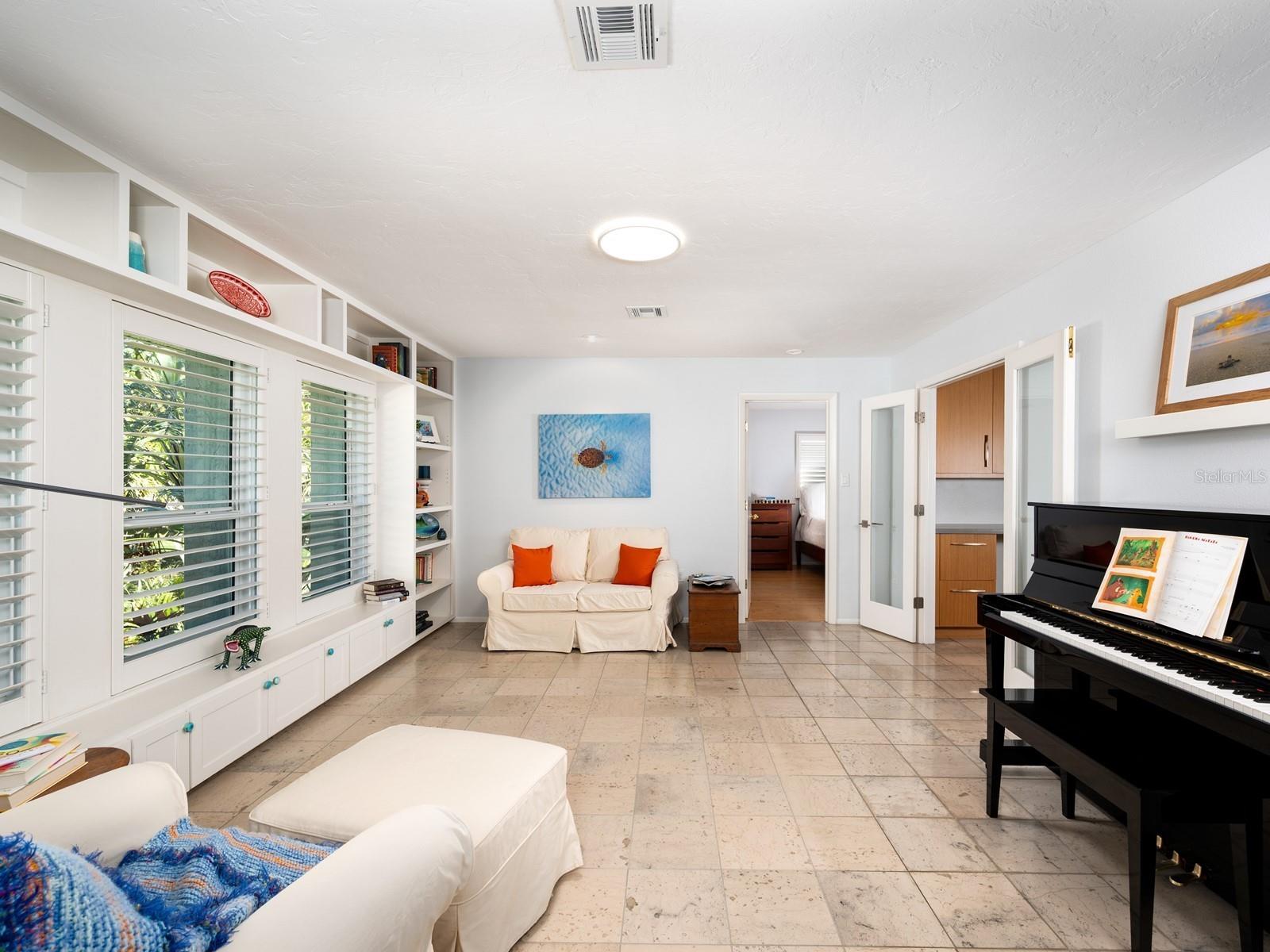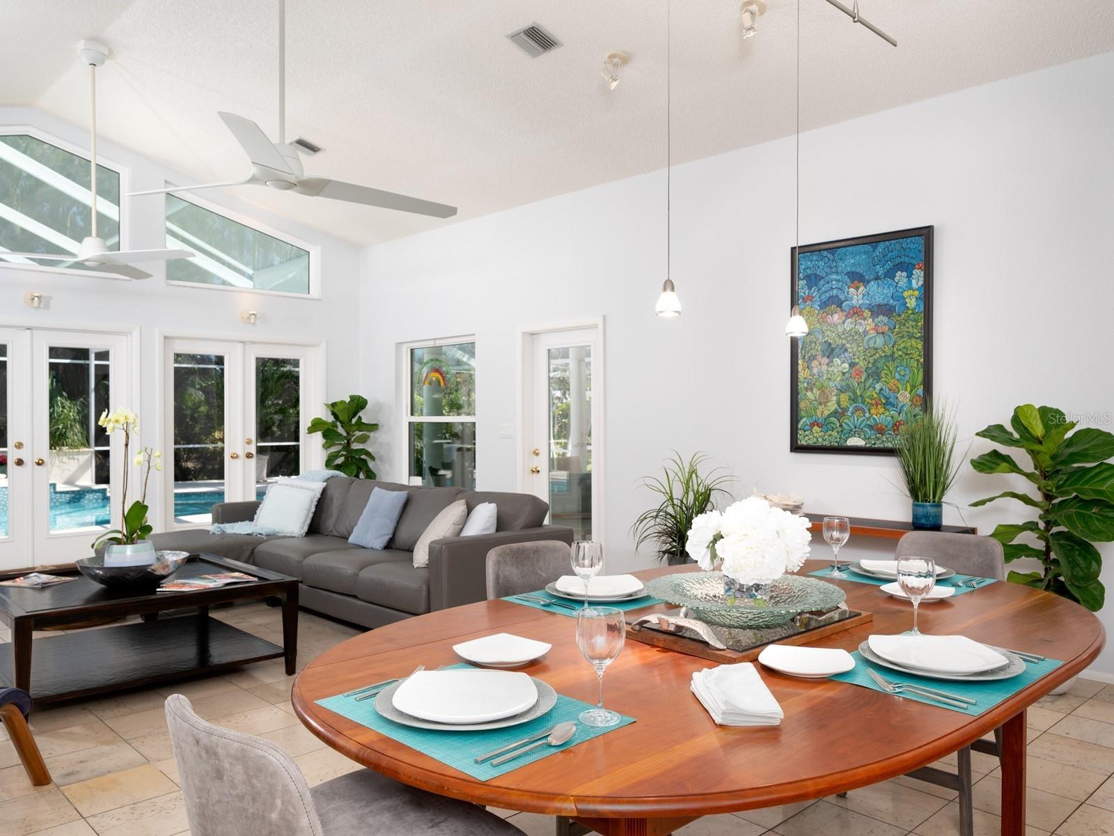 This stunning and spacious four-bedroom home has a den and features a captivating backyard oasis, ideal for relaxation and entertaining. It's just a short stroll away from the beach! Let the ocean breeze guide you to the shore, and you'll feel the warm sand beneath your toes in no time. After taking a moment to appreciate the curb appeal, you enter through the glass door into the foyer, which sets the tone for this remarkable home. The main living areas boast elegant, long-lasting, easy-care French Limestone flooring. While most of the bedrooms provide a warm, cozy ambiance with rich hardwood flooring. Numerous French doors throughout highlight the open and bright ambiance. A modern kitchen that impresses with its striking floor-to-ceiling cabinetry, exuding style. The lengthy Corian countertops create a culinary prep space that would make any chef envious. Additionally, there is a buffet area featuring built-in shelving and a planning center. The newer Bosch and GE stainless steel appliances remain. Nearby a remarkably large walk-in pantry awaits--a dream come true with its ingenious storage solutions. A trendy basin sink is beautifully oriented toward the breakfast bar, seamlessly connecting to the great room and enhancing the flow of the layout. In the dining and living areas, you are enveloped by spaciousness created by the soaring vaulted ceilings, a dramatic French Limestone fireplace, and clerestory windows. Three sets of French doors crowned by three clerestory windows overlook the impressive outdoor entertainment area. Experience a dream sanctuary, complete with an expansive vaulted cage pool that beckons you to unwind in the luxurious spa with a soothing spillover feature. Imagine entertaining in the nearly 600 square foot covered area, where laughter and joy flow as freely as the drinks from your nicely equipped summer kitchen. This is the ultimate haven for leisure and celebration, a paradise you won't want to leave! When it's time to recharge, the Primary Suite offers the privacy you desire. A sliding barn-style door opens to the renovated en suite bath with double walk-in closets, luxurious granite, elegant dual sinks, a French Limestone shower surround, and a private water closet. Adjacent is a den/study with stylish built-in cabinetry that enhances functionality and aesthetics. There is a guest wing with a bathroom and a bedroom featuring a Murphy bed, allowing flexible use. Two full bedrooms are located near a dual-function bathroom with a full and half bath with direct pool access. It is poised perfectly in a desirable area without association restrictions, with a side-yard patio, outbuilding storage, a 2-car garage, and a circular drive.