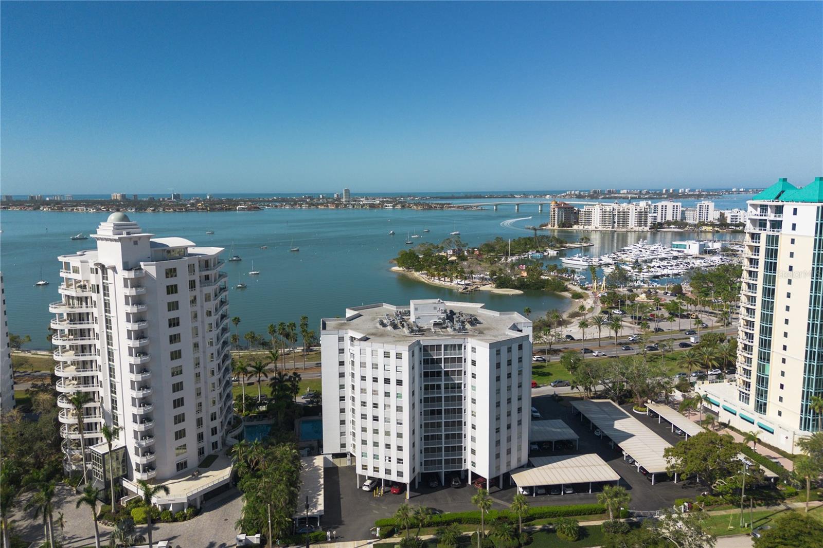 Motivated Sellers *The best Priced Penthouse with Direct Bayfront View *Rare Opportunity to own a Downtown Sarasota Penthouse for under 1 million with Stunning, breathtaking full-bay views, two bedrooms/two baths, and a luxurious condo with a spacious great room floor plan. Natural light is throughout, and beautiful harbor views overlook the Bayfront, Marina Jack, and Big Pass to the Gulf of Mexico. Enjoy nightly sunsets. Wood flooring flows throughout all the rooms. Designer kitchen with stainless steel appliances, classic, rich wood cabinets, luxurious granite countertops, cooktop, and wall oven- a chef's delight. A designed electric fireplace and a large primary bedroom suite entice you to enjoy tranquil water views of the bay, including the Ringling Bridge. Gorgeous bathrooms. New washer and dryer. Additional storage closets are available for your convenience. PLEASE NOTE: Older condos are experiencing BUYERS' concerns about the maintenance costs of aging buildings. However, it's important to note that this building has undergone a thorough inspection and maintains reasonable reserves, making it a solid investment opportunity. Experience maintenance-free living with 24-hour concierge service, a heated pool, a club room, an exercise room, and a library. Enjoy the rich cultural amenities of our fabulous town: fine dining, galleries, shops, opera, theatre, Whole Foods, and Selby Gardens. Prime location with the marina across the street and just minutes over the bridge to St. Armand's world-famous shopping. It is a short drive to Siesta Key and Lido beaches. The Selby Gardens is within a short distance. Restaurants are nearby. Walk to Palm Avenue, visit famous art galleries and great restaurants, and enjoy one of the best Sarasota areas to work and live in.