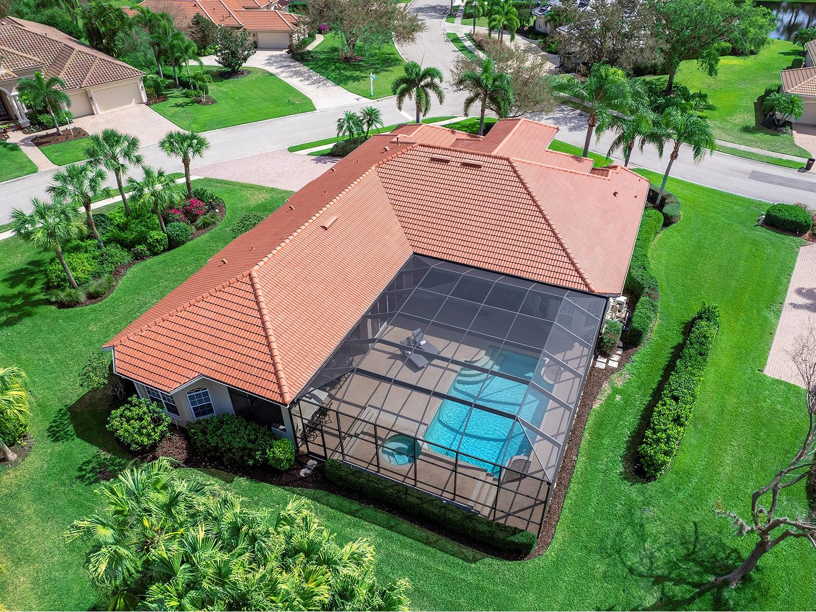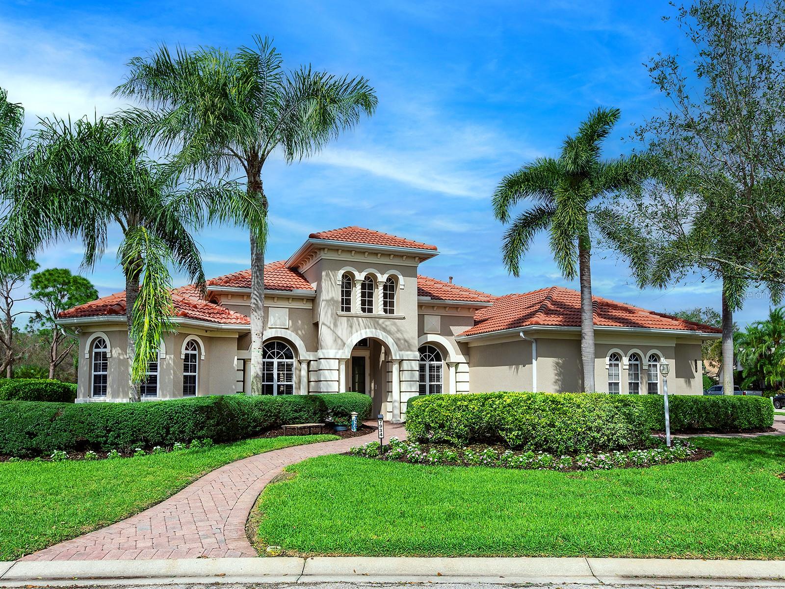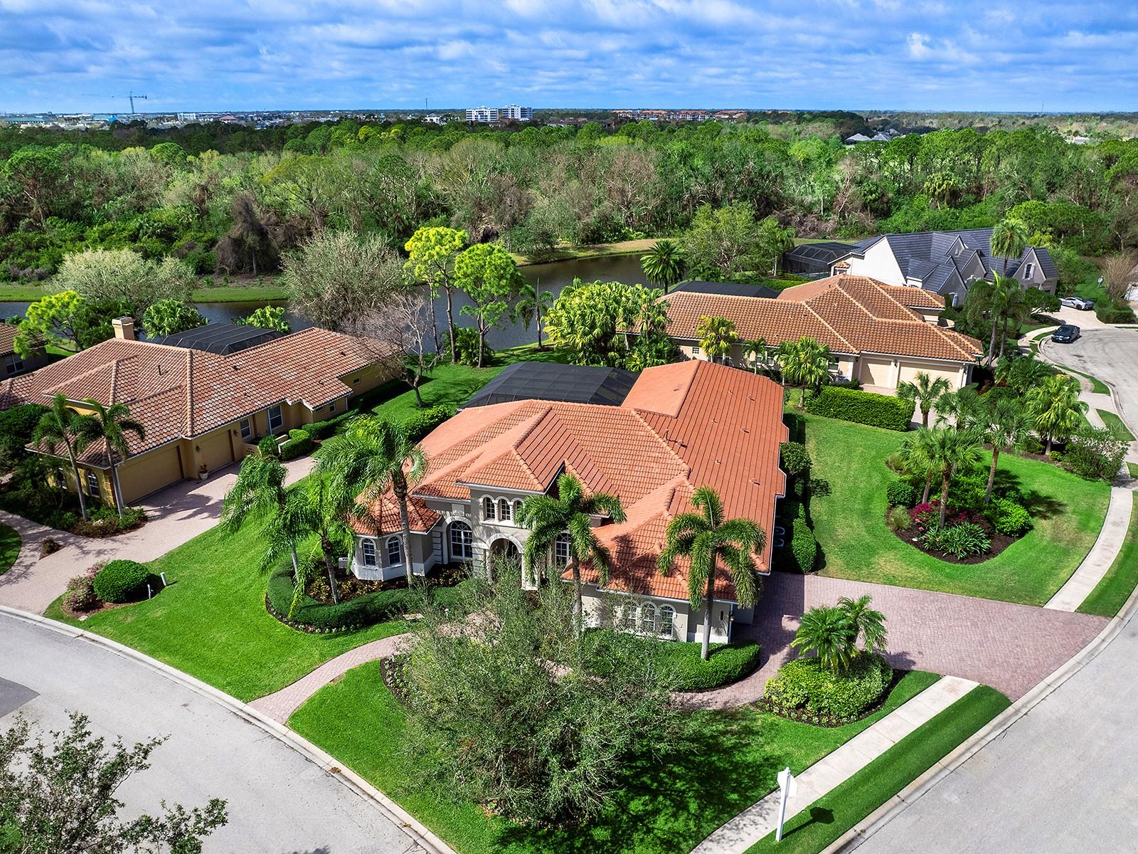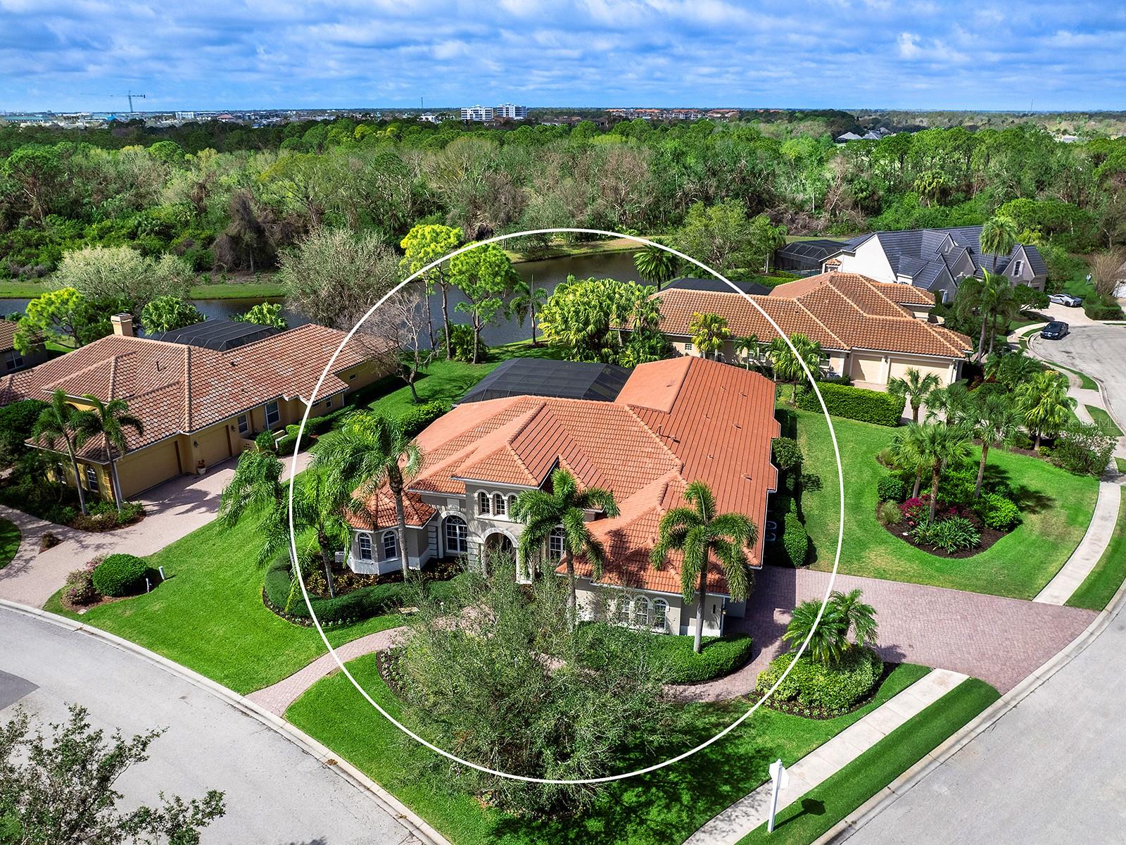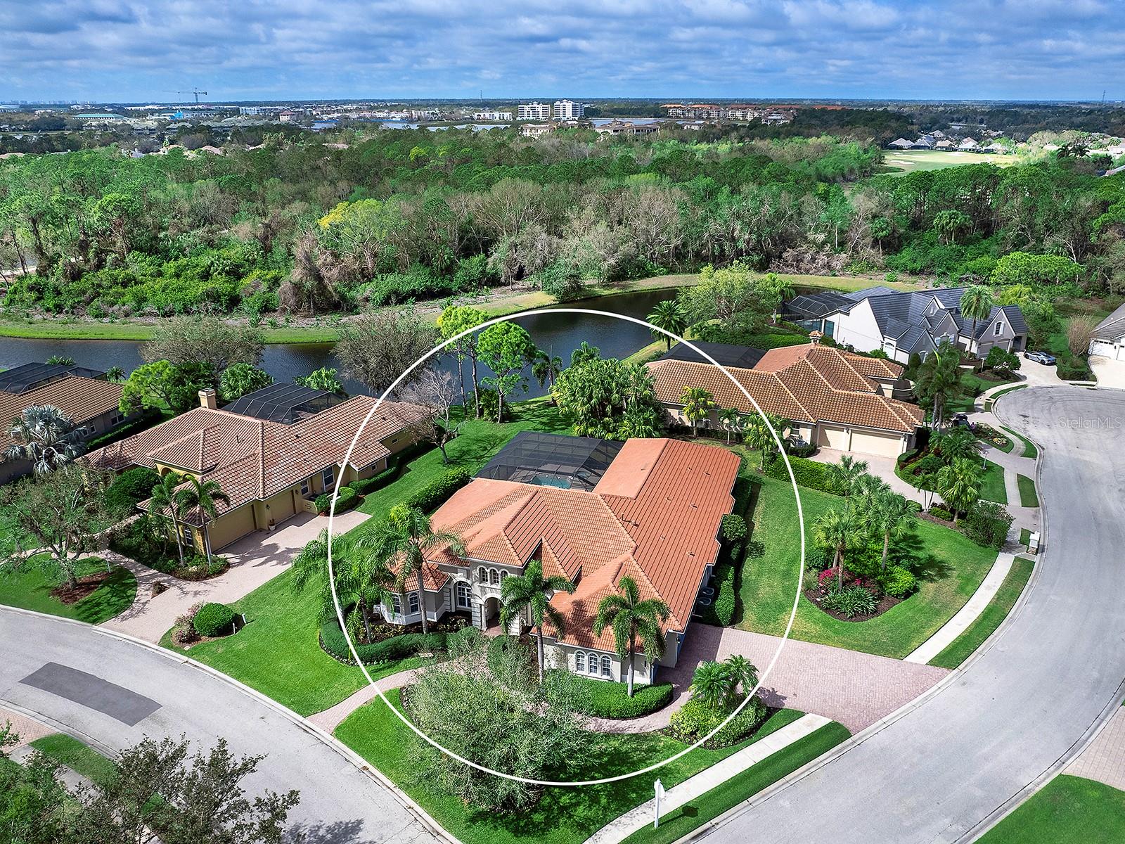 On a beautifully landscaped corner lot in esteemed Lakewood Ranch Country Club, this residence offers an exceptional blend of elegance, functionality and a serene lake view. New roof in December 2024. The home's striking exterior features an oversized paver driveway with manicured hedges, landscaped islands, a side-load garage with windows and a stately entrance framed by two columns. The glass double doors open to a foyer with a custom-trimmed wall niche and tile floors with a decorative inlay, setting the tone for the refined interior. Designed for grand entertaining and comfortable everyday living, the formal dining room boasts a double tray ceiling with crown molding and plantation-shuttered windows, while the living room impresses with soaring ceilings, custom moldings, a gas fireplace flanked by built-ins, and 10-foot sliding doors that invite indoor/outdoor living. The office, enclosed by glass French doors, is adorned with crown molding, hardwood floors and a large window with plantation shutters. The kitchen is designed for culinary excellence with quartz countertops, a glass tile backsplash and soft-close cabinetry. A central island provides prep space, while the counter features plenty of seating. The breakfast area offers views of the lanai and lake through an aquarium window. High-end stainless-steel appliances complete the space. The adjacent family room is ideal for gathering, featuring a tray ceiling, a built-in entertainment center, and walls of sliders that lead to the lanai. The primary suite is a retreat accessed through an alcove entry with double doors and a wall niche. A double tray ceiling, bay windows, beadboard accents and private lanai access through a glass door creates a serene atmosphere. The expansive walk-in closet is thoughtfully designed. The recently updated primary bath showcases an oversized walk-in shower with beautiful tile and seamless glass, porcelain tile floors, a dual-sink vanity with quartz countertops and a linen closet with wood shelving. Two additional bedrooms, each with walk-in closets and large windows, are well-appointed. One is an en suite, and two share a full bath with a tub and shower. A full pool bath with a glass-enclosed shower and hallway linen closet is conveniently accessible. The bonus room offers pocketing sliders, a spacious wall closet, access to the en-suite pool bath and flexibility to serve as an additional bedroom. Designed for year-round enjoyment, the lanai is fully equipped with an outdoor kitchen, complete with a Sedona Lynx grill, Fire-Magic mini refrigerator, prep sink and weather-resistant cabinetry, and plenty of bar-height seating at granite countertop. The lanai's Pro-Deck rubber flooring is eco-friendly, UV-resistant and anti-fungal, ensuring durability and comfort. A gas-heated pool and spa, two large, covered areas for dining and lounging, and lush landscaping enhance the tranquil ambiance with its breathtaking lake view. With the recent expansion to include a fourth golf course, Lakewood Ranch Golf and Country Club offers unmatched access to premier golfing. Residents can choose from a variety of membership options. Ideally just minutes from the UTC Mall, Waterside, Lakewood Ranch Main Street and downtown Sarasota, the home is also within easy reach of top-tier dining, shopping and the area's renowned beaches. 7934 Royal Birkdale Circle is a stunning residence in one of Lakewood Ranch's prestigious communities.