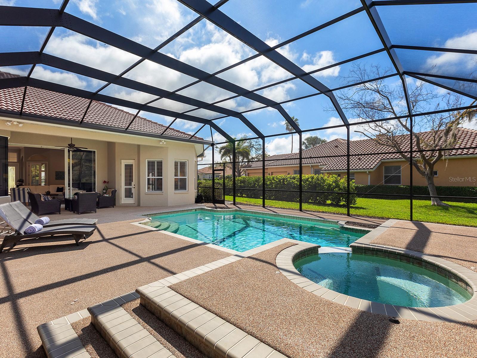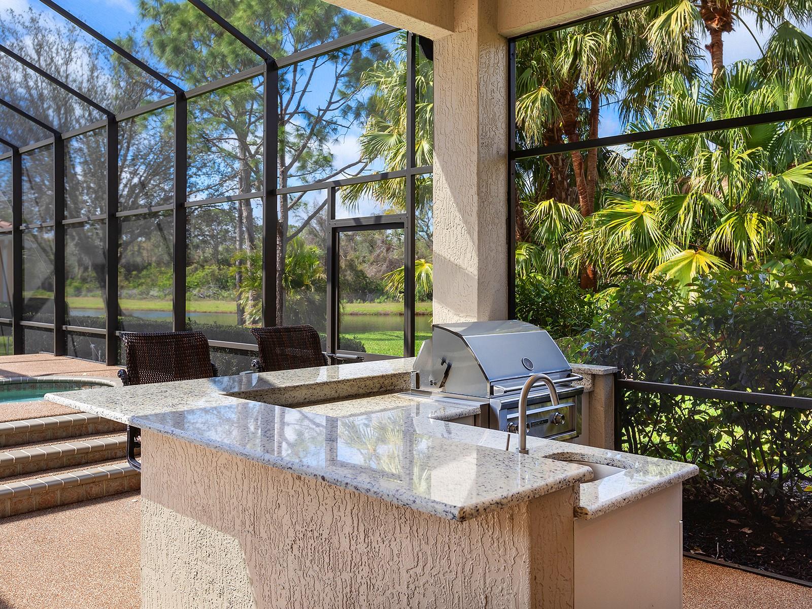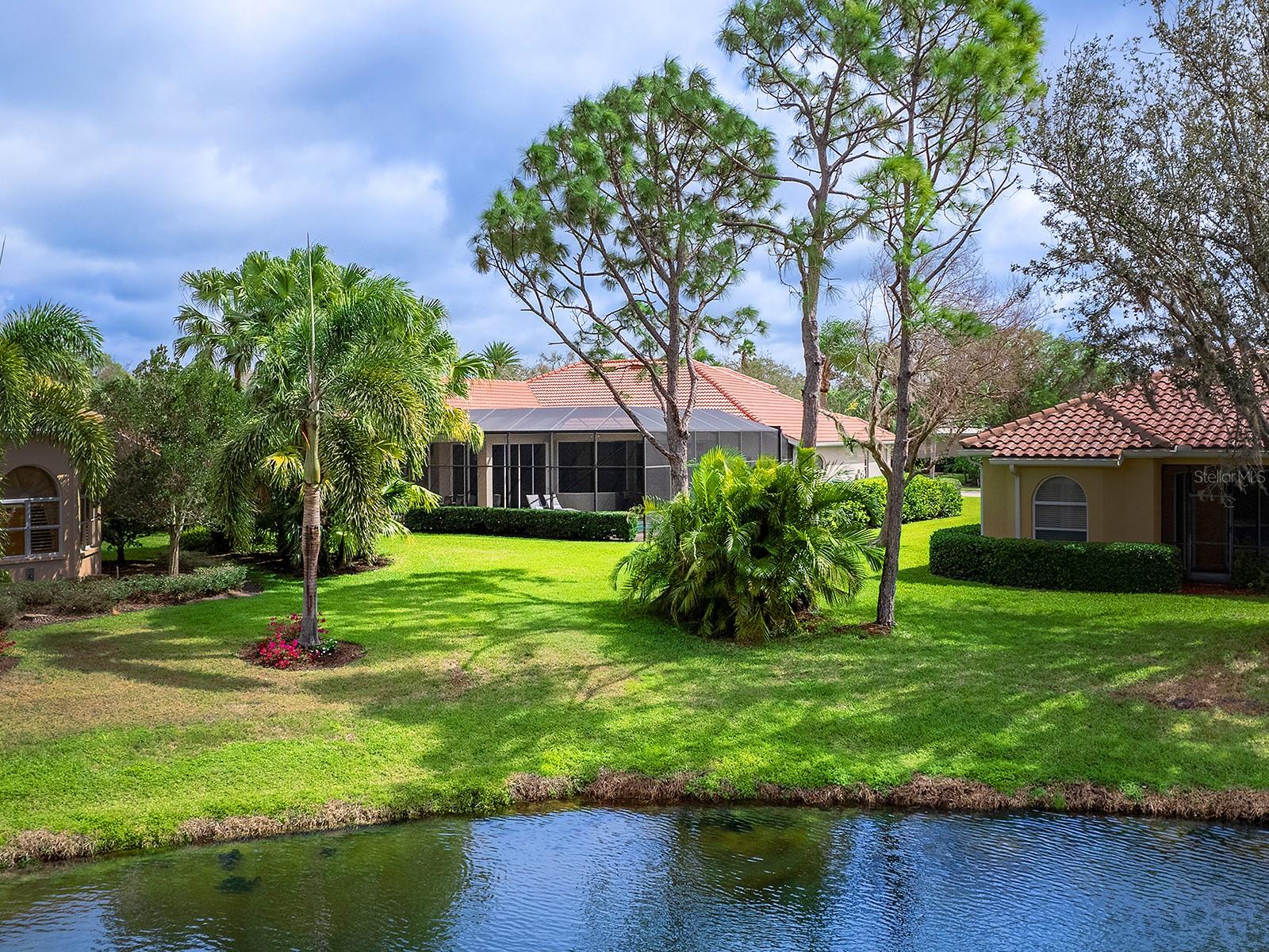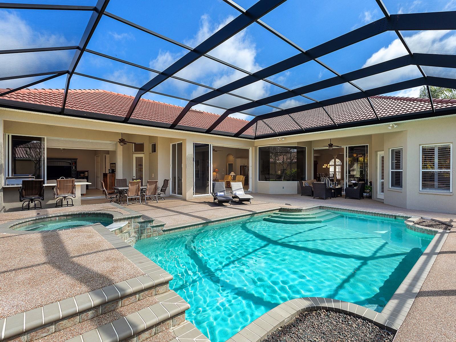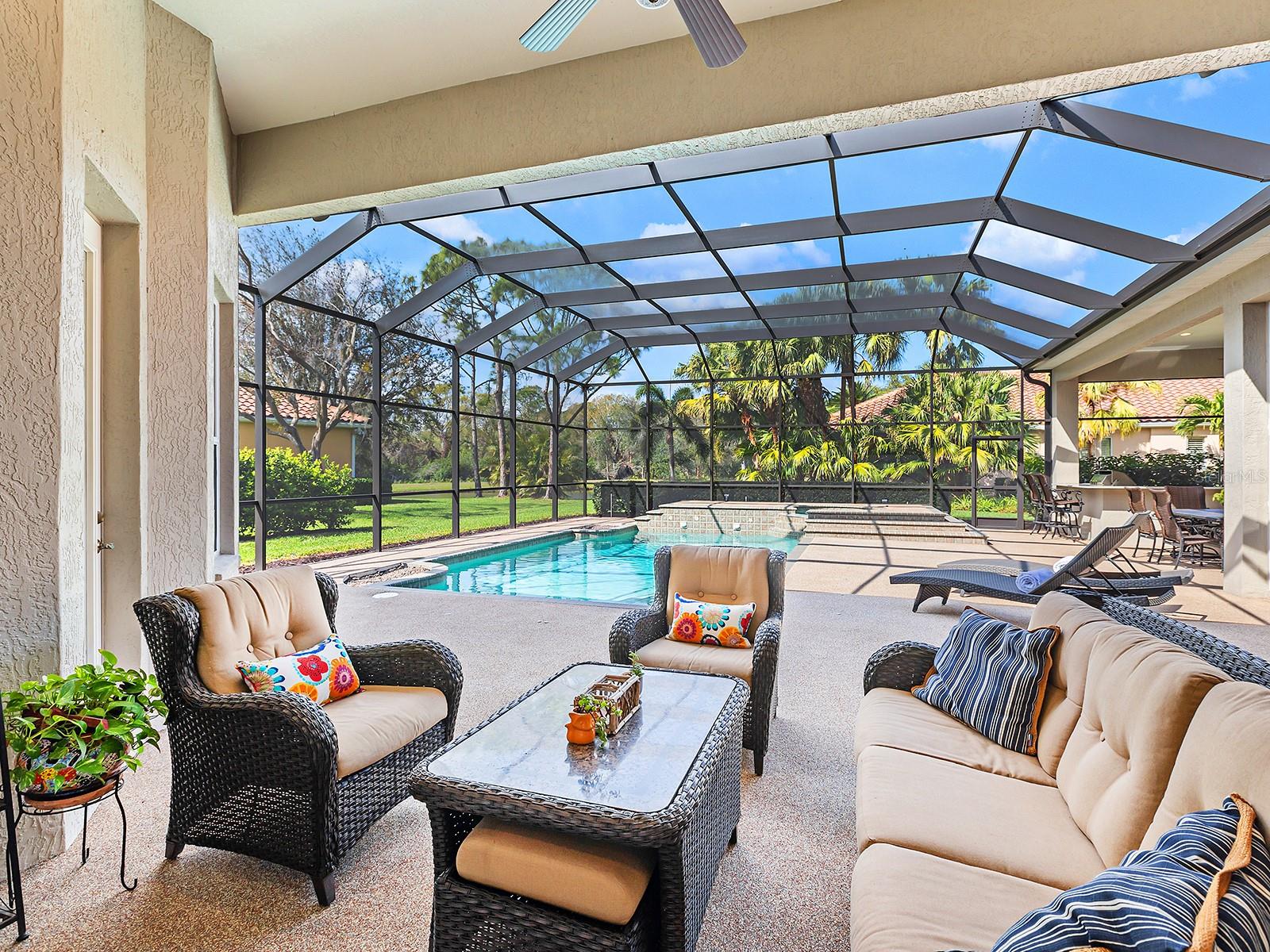 On a beautifully landscaped corner lot in esteemed Lakewood Ranch Country Club, this residence offers an exceptional blend of elegance, functionality and a serene lake view. New roof in December 2024. The home's striking exterior features an oversized paver driveway with manicured hedges, landscaped islands, a side-load garage with windows and a stately entrance framed by two columns. The glass double doors open to a foyer with a custom-trimmed wall niche and tile floors with a decorative inlay, setting the tone for the refined interior. Designed for grand entertaining and comfortable everyday living, the formal dining room boasts a double tray ceiling with crown molding and plantation-shuttered windows, while the living room impresses with soaring ceilings, custom moldings, a gas fireplace flanked by built-ins, and 10-foot sliding doors that invite indoor/outdoor living. The office, enclosed by glass French doors, is adorned with crown molding, hardwood floors and a large window with plantation shutters. The kitchen is designed for culinary excellence with quartz countertops, a glass tile backsplash and soft-close cabinetry. A central island provides prep space, while the counter features plenty of seating. The breakfast area offers views of the lanai and lake through an aquarium window. High-end stainless-steel appliances complete the space. The adjacent family room is ideal for gathering, featuring a tray ceiling, a built-in entertainment center, and walls of sliders that lead to the lanai. The primary suite is a retreat accessed through an alcove entry with double doors and a wall niche. A double tray ceiling, bay windows, beadboard accents and private lanai access through a glass door creates a serene atmosphere. The expansive walk-in closet is thoughtfully designed. The recently updated primary bath showcases an oversized walk-in shower with beautiful tile and seamless glass, porcelain tile floors, a dual-sink vanity with quartz countertops and a linen closet with wood shelving. Two additional bedrooms, each with walk-in closets and large windows, are well-appointed. One is an en suite, and two share a full bath with a tub and shower. A full pool bath with a glass-enclosed shower and hallway linen closet is conveniently accessible. The bonus room offers pocketing sliders, a spacious wall closet, access to the en-suite pool bath and flexibility to serve as an additional bedroom. Designed for year-round enjoyment, the lanai is fully equipped with an outdoor kitchen, complete with a Sedona Lynx grill, Fire-Magic mini refrigerator, prep sink and weather-resistant cabinetry, and plenty of bar-height seating at granite countertop. The lanai's Pro-Deck rubber flooring is eco-friendly, UV-resistant and anti-fungal, ensuring durability and comfort. A gas-heated pool and spa, two large, covered areas for dining and lounging, and lush landscaping enhance the tranquil ambiance with its breathtaking lake view. With the recent expansion to include a fourth golf course, Lakewood Ranch Golf and Country Club offers unmatched access to premier golfing. Residents can choose from a variety of membership options. Ideally just minutes from the UTC Mall, Waterside, Lakewood Ranch Main Street and downtown Sarasota, the home is also within easy reach of top-tier dining, shopping and the area's renowned beaches. 7934 Royal Birkdale Circle is a stunning residence in one of Lakewood Ranch's prestigious communities.