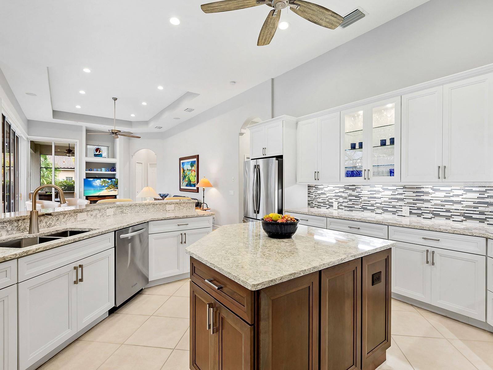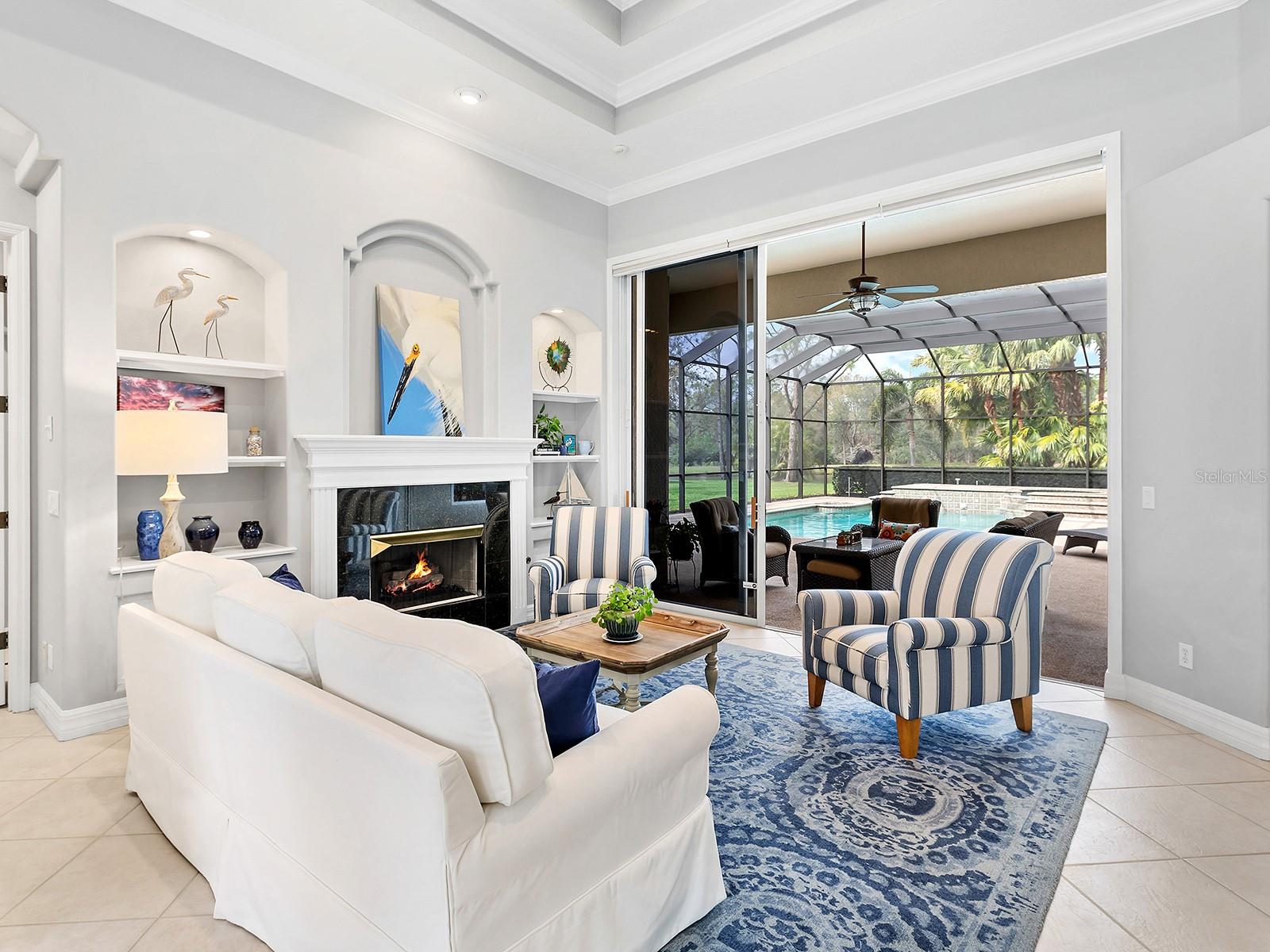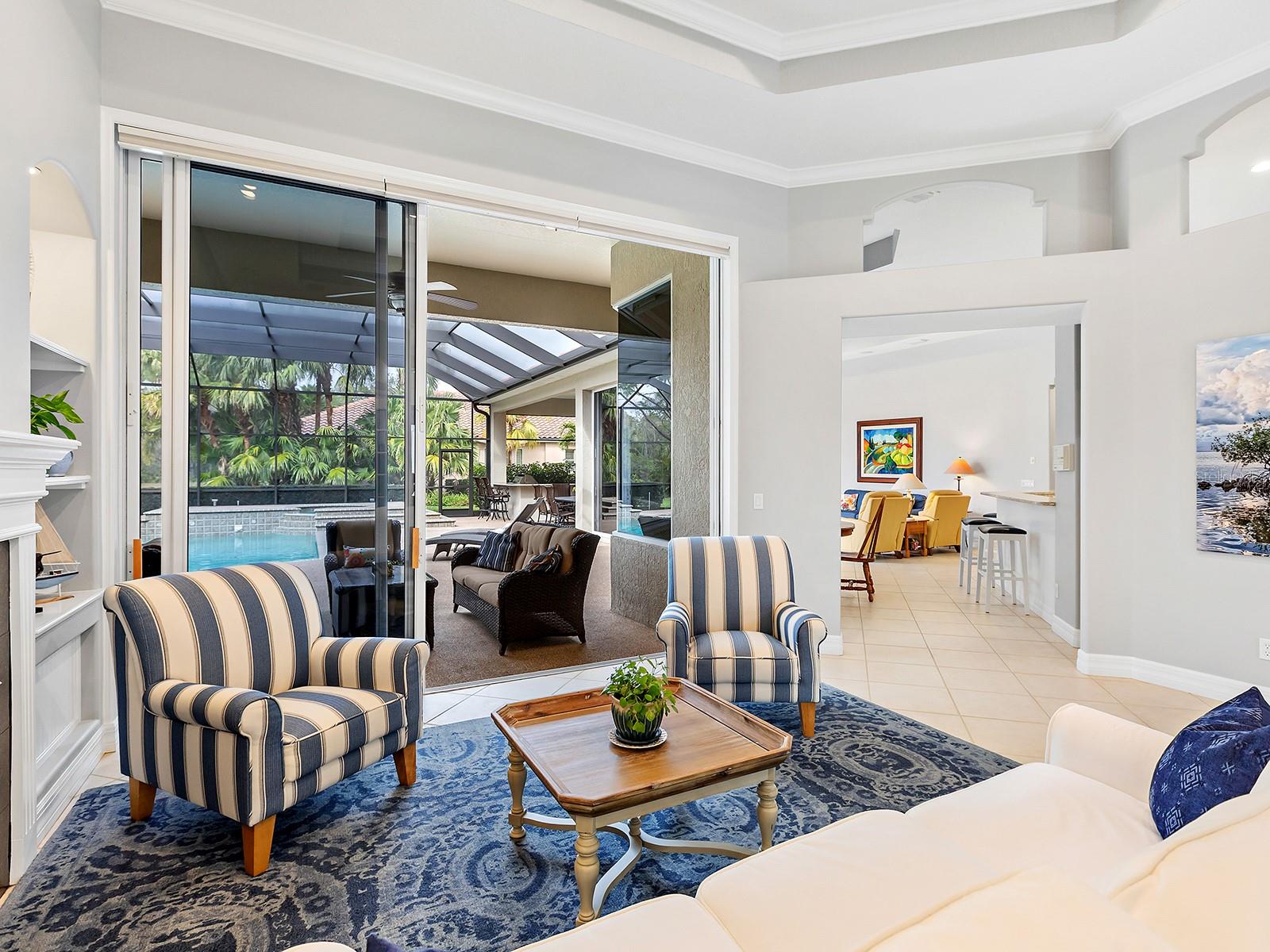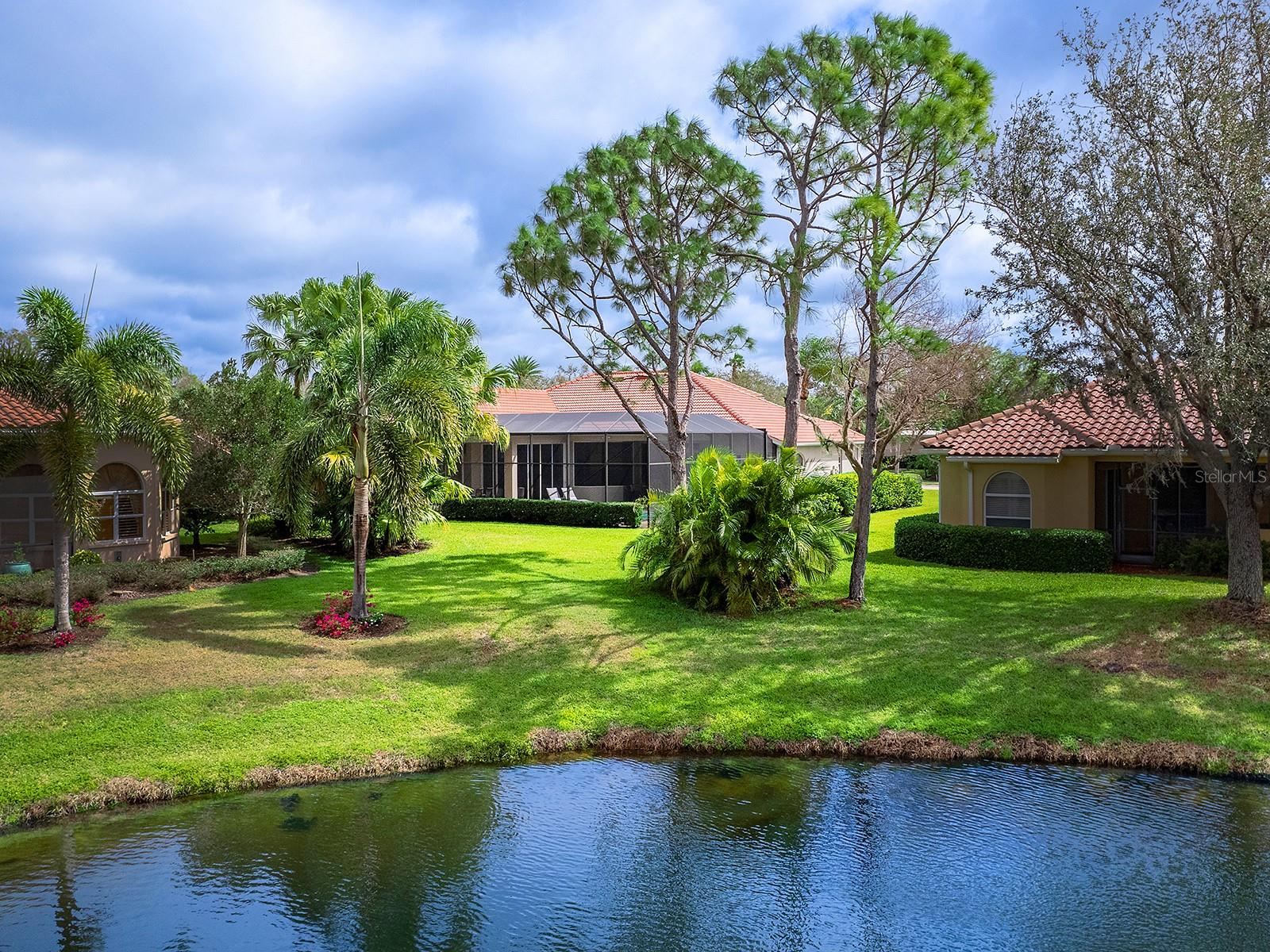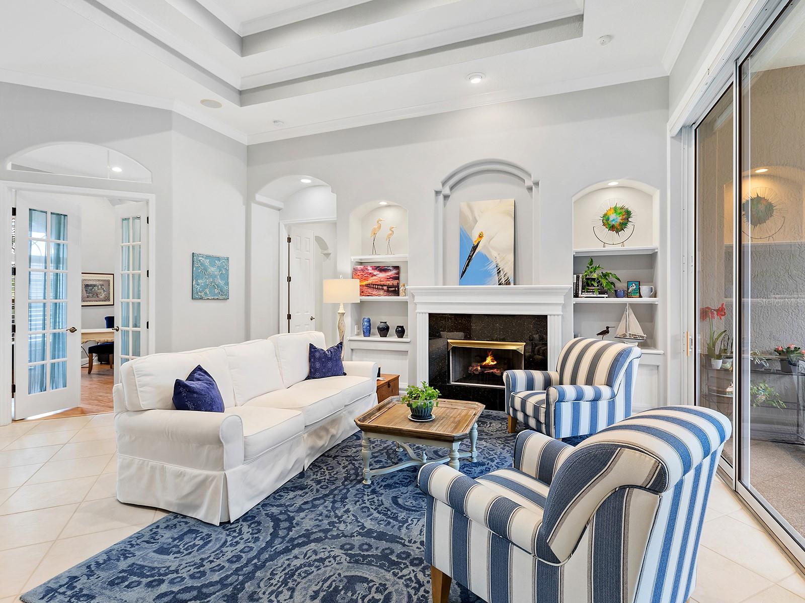 On a beautifully landscaped corner lot in esteemed Lakewood Ranch Country Club, this residence offers an exceptional blend of elegance, functionality and a serene lake view. New roof in December 2024. The home's striking exterior features an oversized paver driveway with manicured hedges, landscaped islands, a side-load garage with windows and a stately entrance framed by two columns. The glass double doors open to a foyer with a custom-trimmed wall niche and tile floors with a decorative inlay, setting the tone for the refined interior. Designed for grand entertaining and comfortable everyday living, the formal dining room boasts a double tray ceiling with crown molding and plantation-shuttered windows, while the living room impresses with soaring ceilings, custom moldings, a gas fireplace flanked by built-ins, and 10-foot sliding doors that invite indoor/outdoor living. The office, enclosed by glass French doors, is adorned with crown molding, hardwood floors and a large window with plantation shutters. The kitchen is designed for culinary excellence with quartz countertops, a glass tile backsplash and soft-close cabinetry. A central island provides prep space, while the counter features plenty of seating. The breakfast area offers views of the lanai and lake through an aquarium window. High-end stainless-steel appliances complete the space. The adjacent family room is ideal for gathering, featuring a tray ceiling, a built-in entertainment center, and walls of sliders that lead to the lanai. The primary suite is a retreat accessed through an alcove entry with double doors and a wall niche. A double tray ceiling, bay windows, beadboard accents and private lanai access through a glass door creates a serene atmosphere. The expansive walk-in closet is thoughtfully designed. The recently updated primary bath showcases an oversized walk-in shower with beautiful tile and seamless glass, porcelain tile floors, a dual-sink vanity with quartz countertops and a linen closet with wood shelving. Two additional bedrooms, each with walk-in closets and large windows, are well-appointed. One is an en suite, and two share a full bath with a tub and shower. A full pool bath with a glass-enclosed shower and hallway linen closet is conveniently accessible. The bonus room offers pocketing sliders, a spacious wall closet, access to the en-suite pool bath and flexibility to serve as an additional bedroom. Designed for year-round enjoyment, the lanai is fully equipped with an outdoor kitchen, complete with a Sedona Lynx grill, Fire-Magic mini refrigerator, prep sink and weather-resistant cabinetry, and plenty of bar-height seating at granite countertop. The lanai's Pro-Deck rubber flooring is eco-friendly, UV-resistant and anti-fungal, ensuring durability and comfort. A gas-heated pool and spa, two large, covered areas for dining and lounging, and lush landscaping enhance the tranquil ambiance with its breathtaking lake view. With the recent expansion to include a fourth golf course, Lakewood Ranch Golf and Country Club offers unmatched access to premier golfing. Residents can choose from a variety of membership options. Ideally just minutes from the UTC Mall, Waterside, Lakewood Ranch Main Street and downtown Sarasota, the home is also within easy reach of top-tier dining, shopping and the area's renowned beaches. 7934 Royal Birkdale Circle is a stunning residence in one of Lakewood Ranch's prestigious communities.