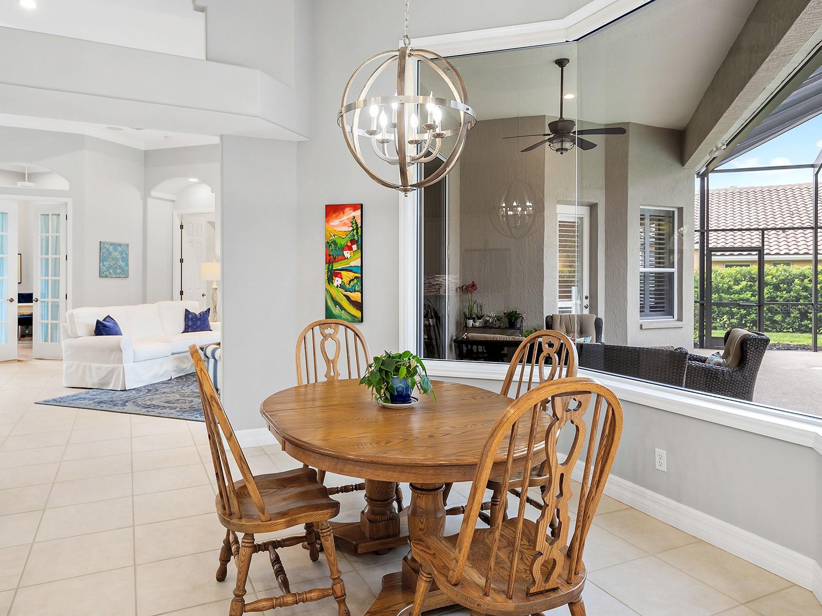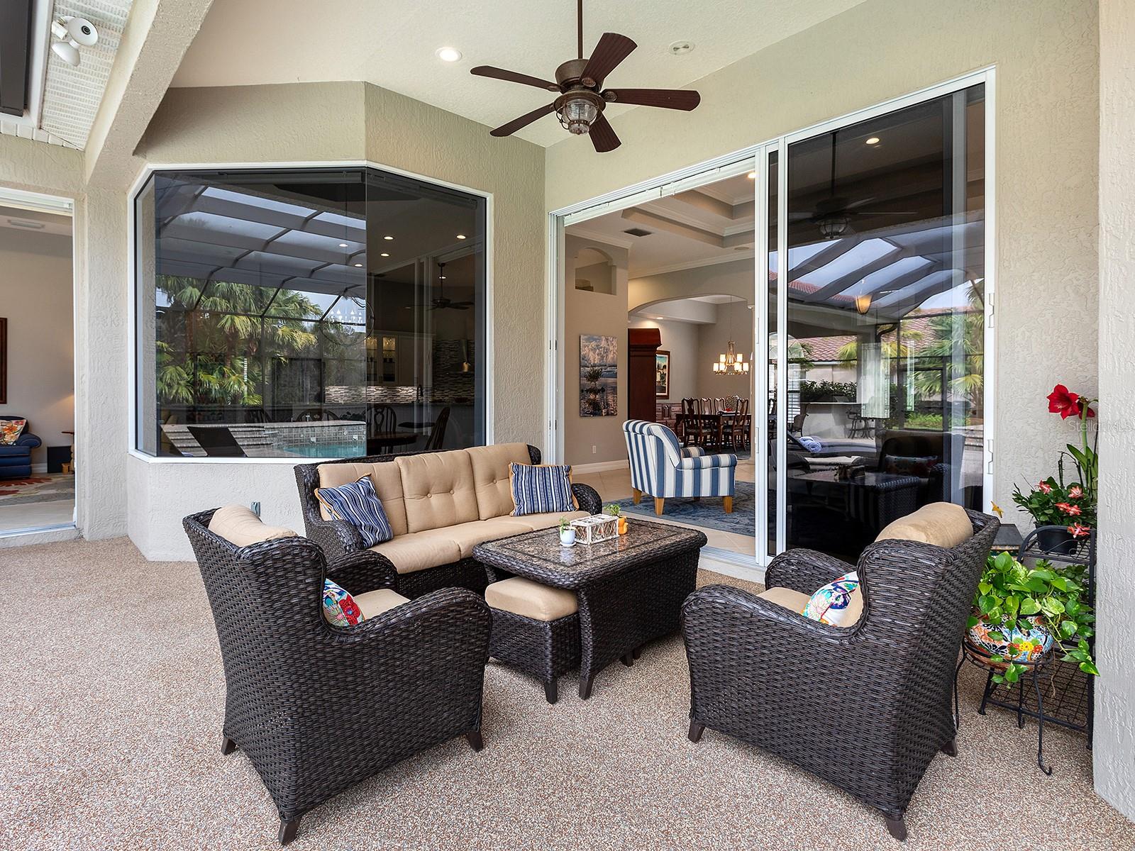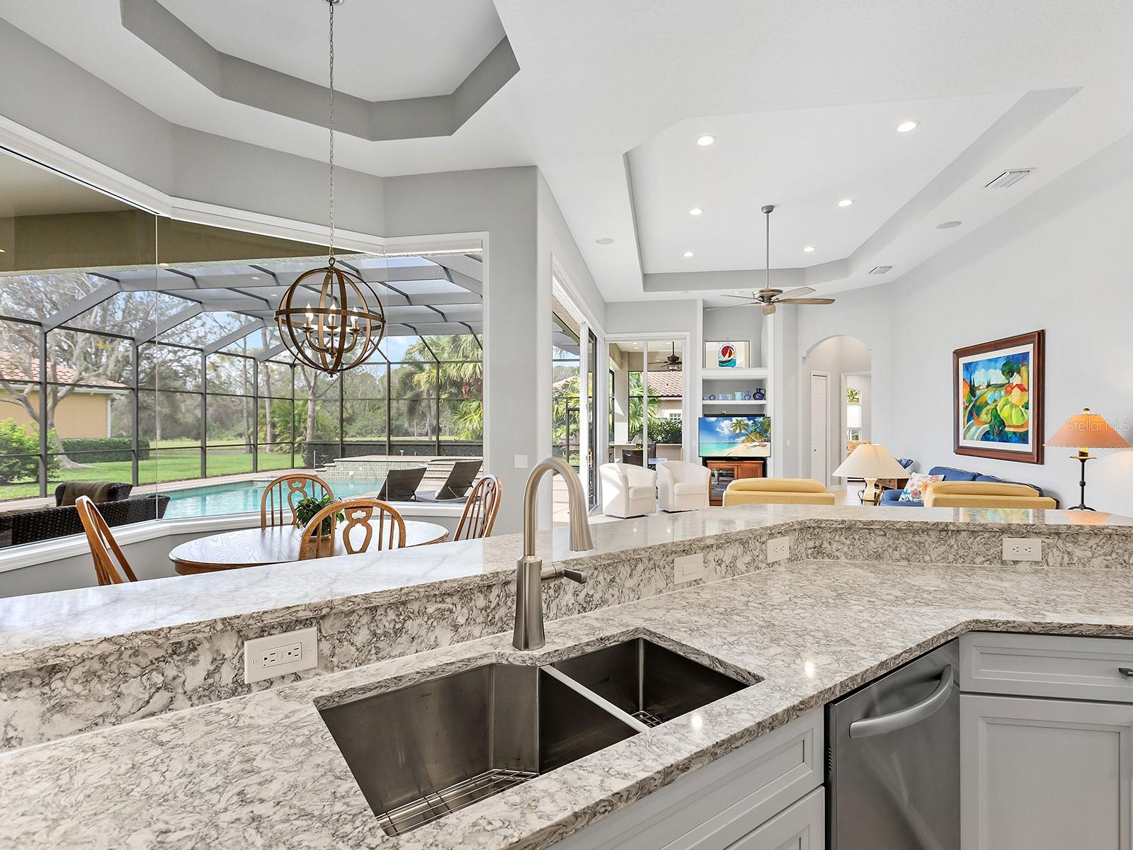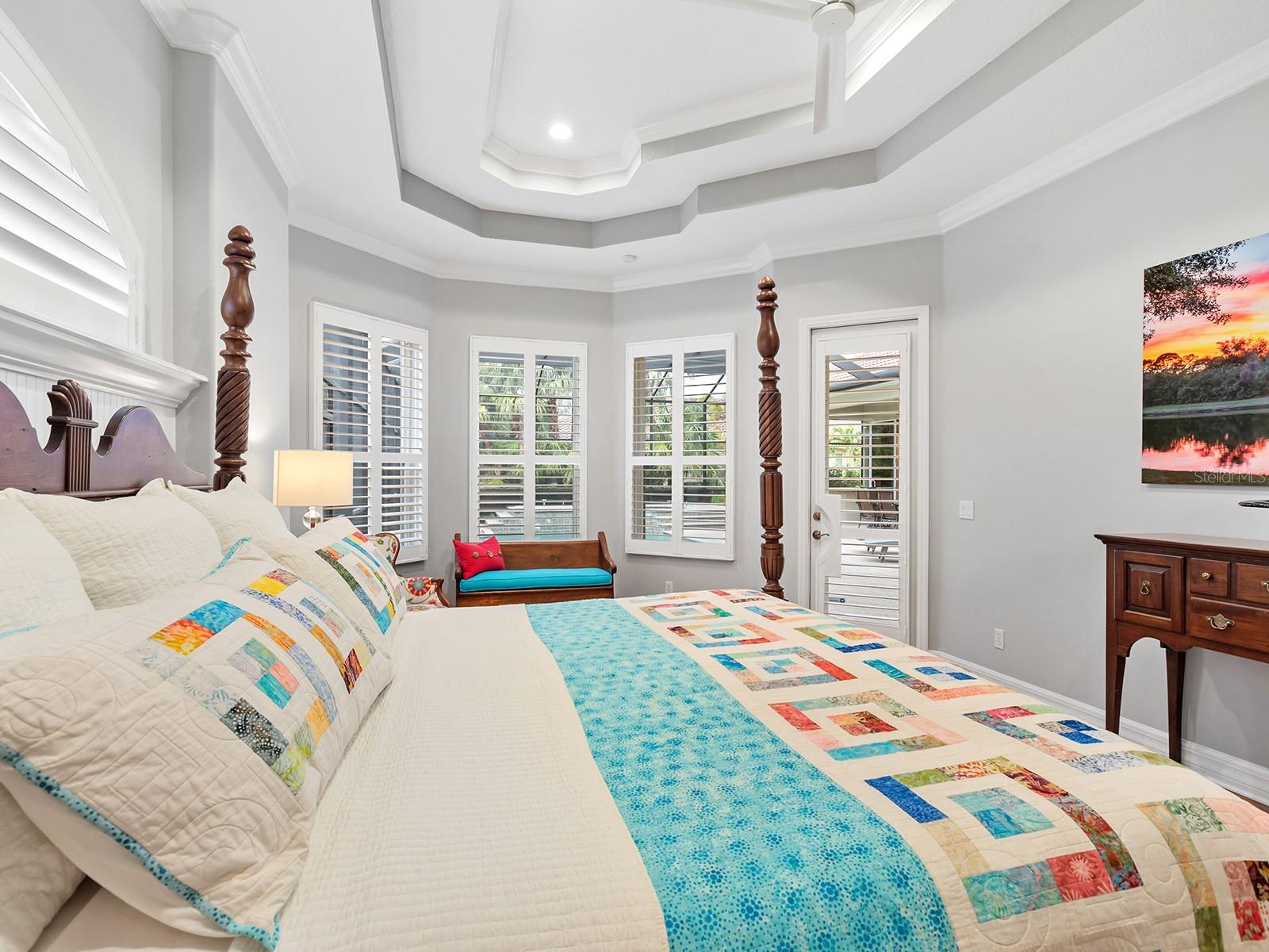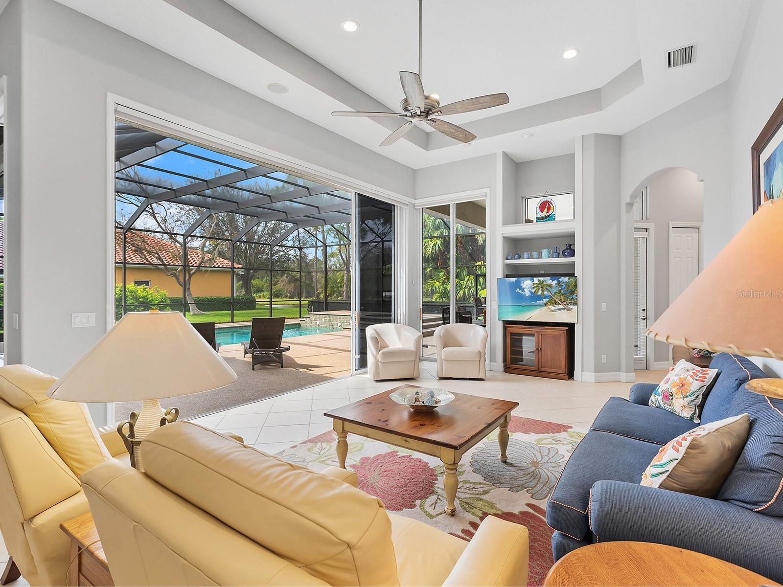 On a beautifully landscaped corner lot in esteemed Lakewood Ranch Country Club, this residence offers an exceptional blend of elegance, functionality and a serene lake view. New roof in December 2024. The home's striking exterior features an oversized paver driveway with manicured hedges, landscaped islands, a side-load garage with windows and a stately entrance framed by two columns. The glass double doors open to a foyer with a custom-trimmed wall niche and tile floors with a decorative inlay, setting the tone for the refined interior. Designed for grand entertaining and comfortable everyday living, the formal dining room boasts a double tray ceiling with crown molding and plantation-shuttered windows, while the living room impresses with soaring ceilings, custom moldings, a gas fireplace flanked by built-ins, and 10-foot sliding doors that invite indoor/outdoor living. The office, enclosed by glass French doors, is adorned with crown molding, hardwood floors and a large window with plantation shutters. The kitchen is designed for culinary excellence with quartz countertops, a glass tile backsplash and soft-close cabinetry. A central island provides prep space, while the counter features plenty of seating. The breakfast area offers views of the lanai and lake through an aquarium window. High-end stainless-steel appliances complete the space. The adjacent family room is ideal for gathering, featuring a tray ceiling, a built-in entertainment center, and walls of sliders that lead to the lanai. The primary suite is a retreat accessed through an alcove entry with double doors and a wall niche. A double tray ceiling, bay windows, beadboard accents and private lanai access through a glass door creates a serene atmosphere. The expansive walk-in closet is thoughtfully designed. The recently updated primary bath showcases an oversized walk-in shower with beautiful tile and seamless glass, porcelain tile floors, a dual-sink vanity with quartz countertops and a linen closet with wood shelving. Two additional bedrooms, each with walk-in closets and large windows, are well-appointed. One is an en suite, and two share a full bath with a tub and shower. A full pool bath with a glass-enclosed shower and hallway linen closet is conveniently accessible. The bonus room offers pocketing sliders, a spacious wall closet, access to the en-suite pool bath and flexibility to serve as an additional bedroom. Designed for year-round enjoyment, the lanai is fully equipped with an outdoor kitchen, complete with a Sedona Lynx grill, Fire-Magic mini refrigerator, prep sink and weather-resistant cabinetry, and plenty of bar-height seating at granite countertop. The lanai's Pro-Deck rubber flooring is eco-friendly, UV-resistant and anti-fungal, ensuring durability and comfort. A gas-heated pool and spa, two large, covered areas for dining and lounging, and lush landscaping enhance the tranquil ambiance with its breathtaking lake view. With the recent expansion to include a fourth golf course, Lakewood Ranch Golf and Country Club offers unmatched access to premier golfing. Residents can choose from a variety of membership options. Ideally just minutes from the UTC Mall, Waterside, Lakewood Ranch Main Street and downtown Sarasota, the home is also within easy reach of top-tier dining, shopping and the area's renowned beaches. 7934 Royal Birkdale Circle is a stunning residence in one of Lakewood Ranch's prestigious communities.