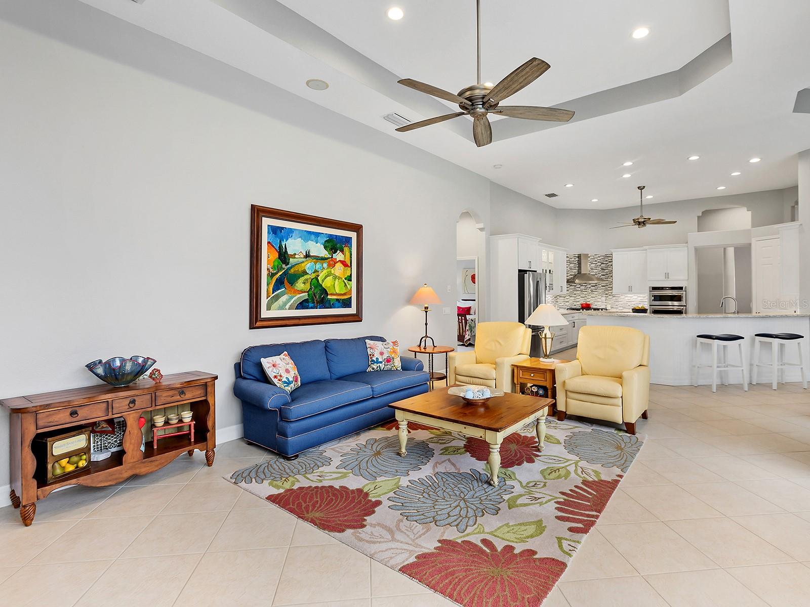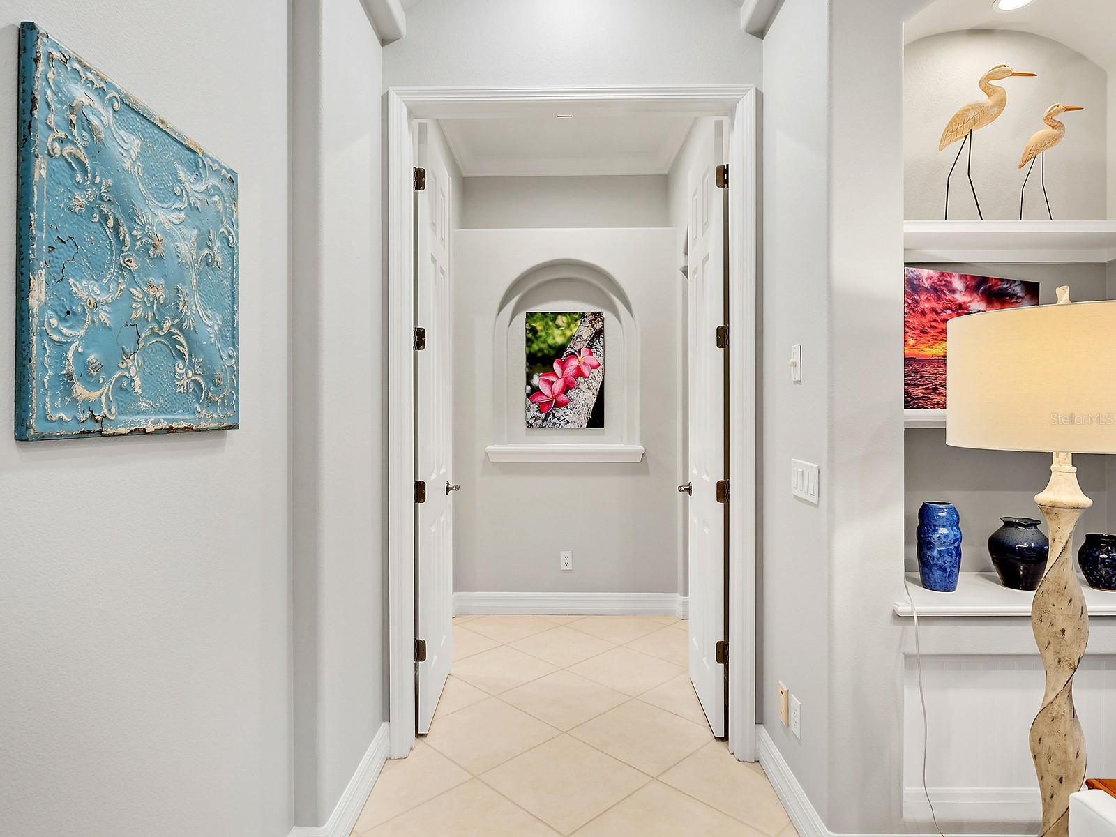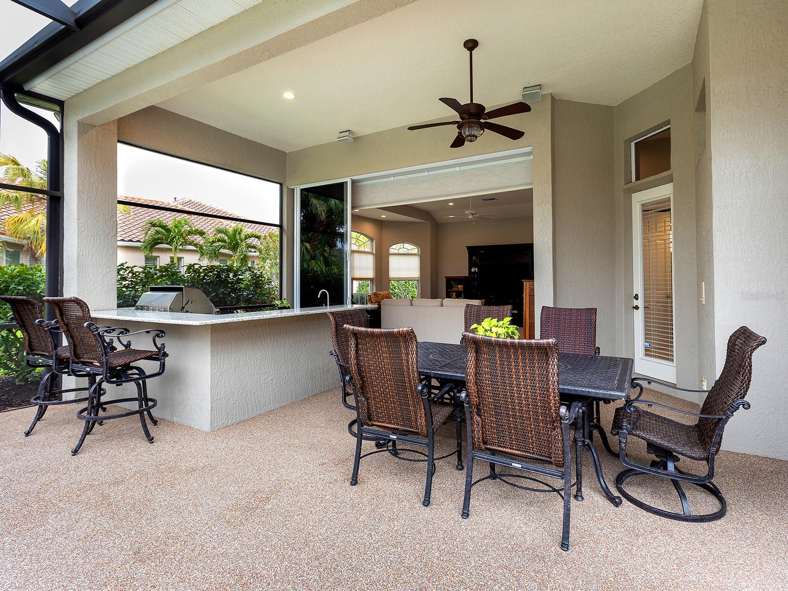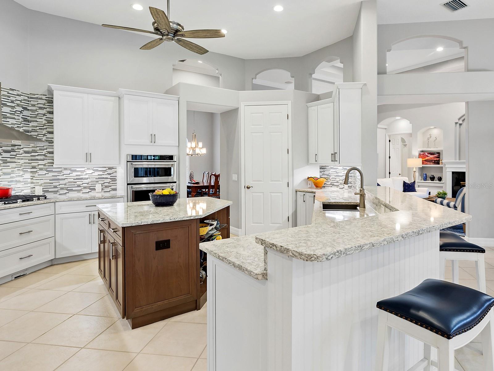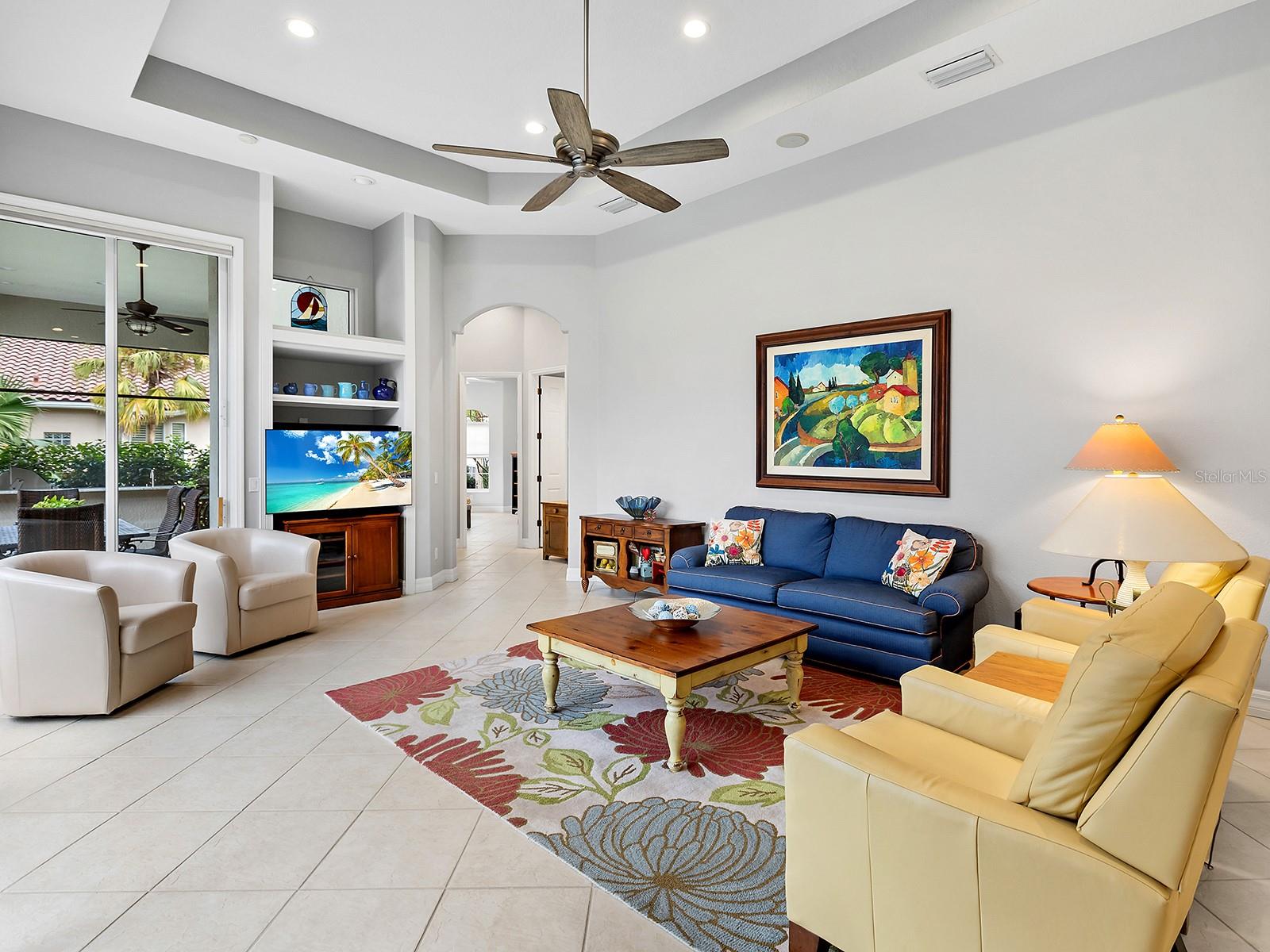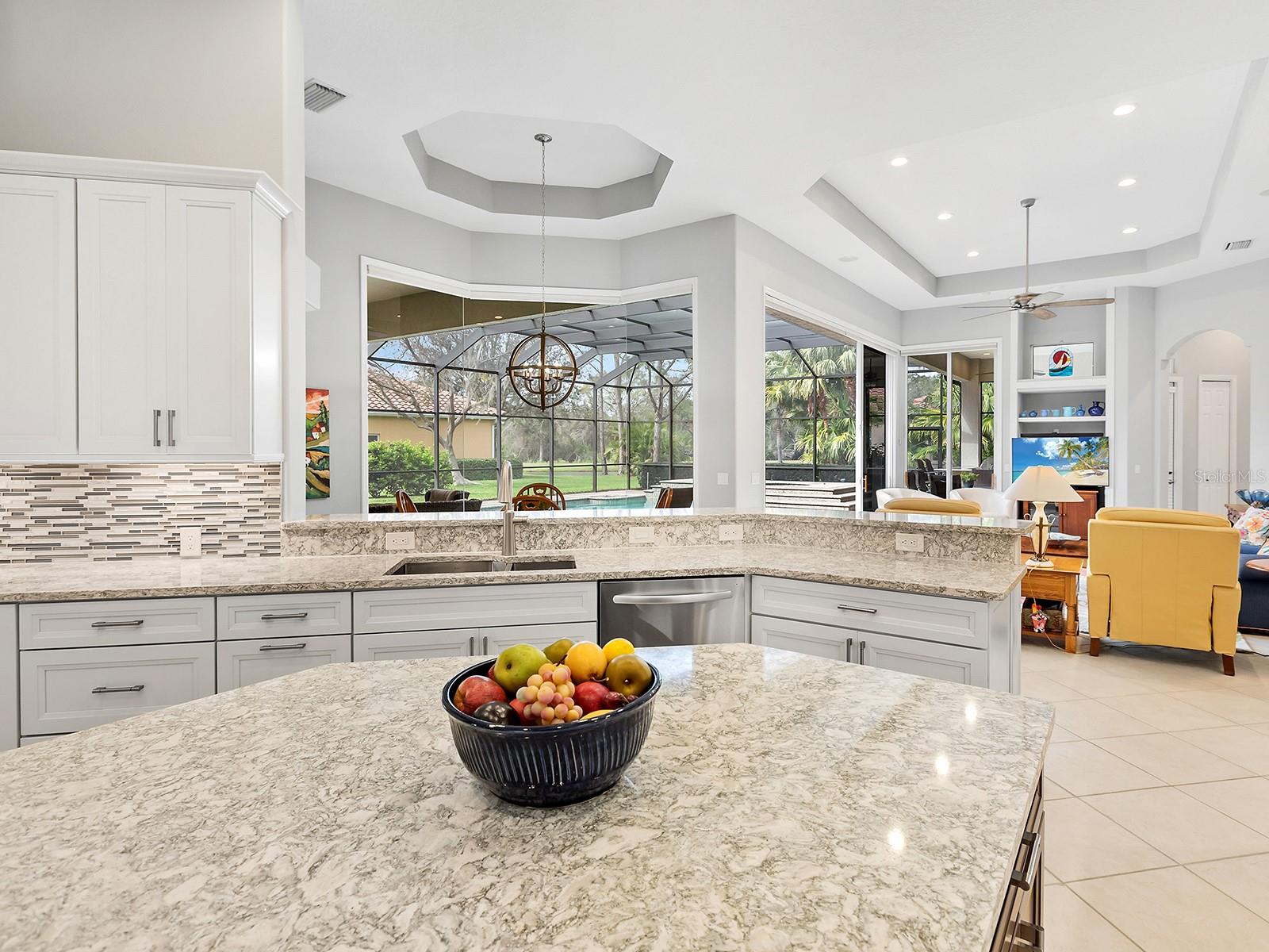 On a beautifully landscaped corner lot in esteemed Lakewood Ranch Country Club, this residence offers an exceptional blend of elegance, functionality and a serene lake view. New roof in December 2024. The home's striking exterior features an oversized paver driveway with manicured hedges, landscaped islands, a side-load garage with windows and a stately entrance framed by two columns. The glass double doors open to a foyer with a custom-trimmed wall niche and tile floors with a decorative inlay, setting the tone for the refined interior. Designed for grand entertaining and comfortable everyday living, the formal dining room boasts a double tray ceiling with crown molding and plantation-shuttered windows, while the living room impresses with soaring ceilings, custom moldings, a gas fireplace flanked by built-ins, and 10-foot sliding doors that invite indoor/outdoor living. The office, enclosed by glass French doors, is adorned with crown molding, hardwood floors and a large window with plantation shutters. The kitchen is designed for culinary excellence with quartz countertops, a glass tile backsplash and soft-close cabinetry. A central island provides prep space, while the counter features plenty of seating. The breakfast area offers views of the lanai and lake through an aquarium window. High-end stainless-steel appliances complete the space. The adjacent family room is ideal for gathering, featuring a tray ceiling, a built-in entertainment center, and walls of sliders that lead to the lanai. The primary suite is a retreat accessed through an alcove entry with double doors and a wall niche. A double tray ceiling, bay windows, beadboard accents and private lanai access through a glass door creates a serene atmosphere. The expansive walk-in closet is thoughtfully designed. The recently updated primary bath showcases an oversized walk-in shower with beautiful tile and seamless glass, porcelain tile floors, a dual-sink vanity with quartz countertops and a linen closet with wood shelving. Two additional bedrooms, each with walk-in closets and large windows, are well-appointed. One is an en suite, and two share a full bath with a tub and shower. A full pool bath with a glass-enclosed shower and hallway linen closet is conveniently accessible. The bonus room offers pocketing sliders, a spacious wall closet, access to the en-suite pool bath and flexibility to serve as an additional bedroom. Designed for year-round enjoyment, the lanai is fully equipped with an outdoor kitchen, complete with a Sedona Lynx grill, Fire-Magic mini refrigerator, prep sink and weather-resistant cabinetry, and plenty of bar-height seating at granite countertop. The lanai's Pro-Deck rubber flooring is eco-friendly, UV-resistant and anti-fungal, ensuring durability and comfort. A gas-heated pool and spa, two large, covered areas for dining and lounging, and lush landscaping enhance the tranquil ambiance with its breathtaking lake view. With the recent expansion to include a fourth golf course, Lakewood Ranch Golf and Country Club offers unmatched access to premier golfing. Residents can choose from a variety of membership options. Ideally just minutes from the UTC Mall, Waterside, Lakewood Ranch Main Street and downtown Sarasota, the home is also within easy reach of top-tier dining, shopping and the area's renowned beaches. 7934 Royal Birkdale Circle is a stunning residence in one of Lakewood Ranch's prestigious communities.