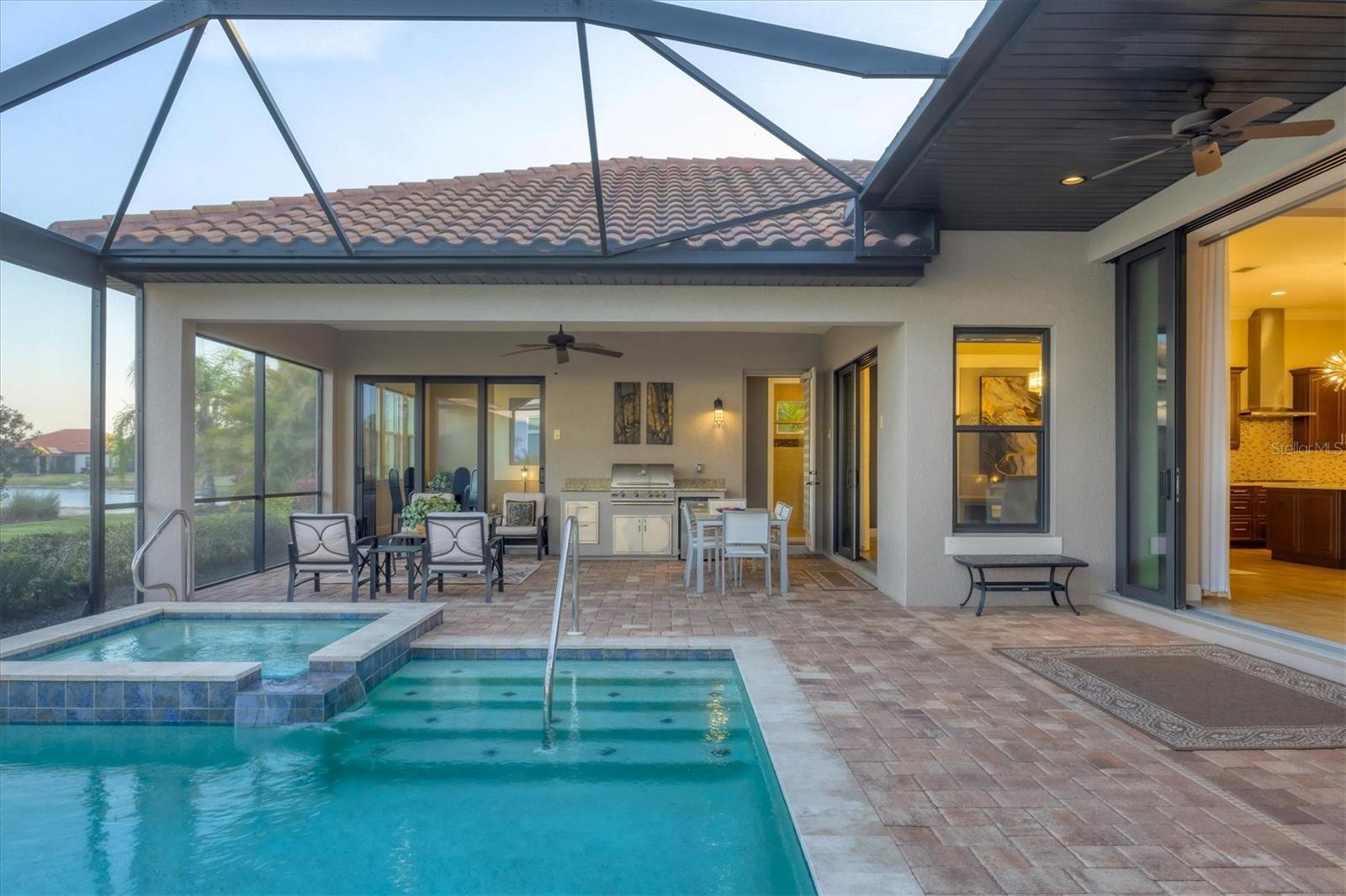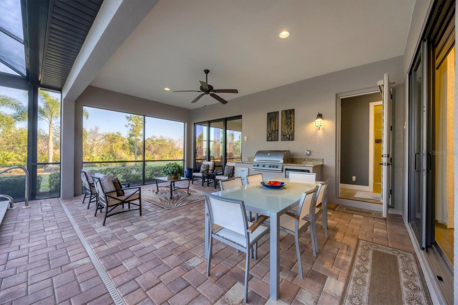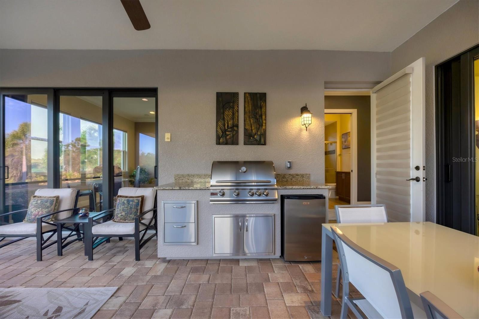 - Exterior: Outdoor Grill, Outdoor Kitchen, Rain Gutters, Sidewalk, Sliding Doors