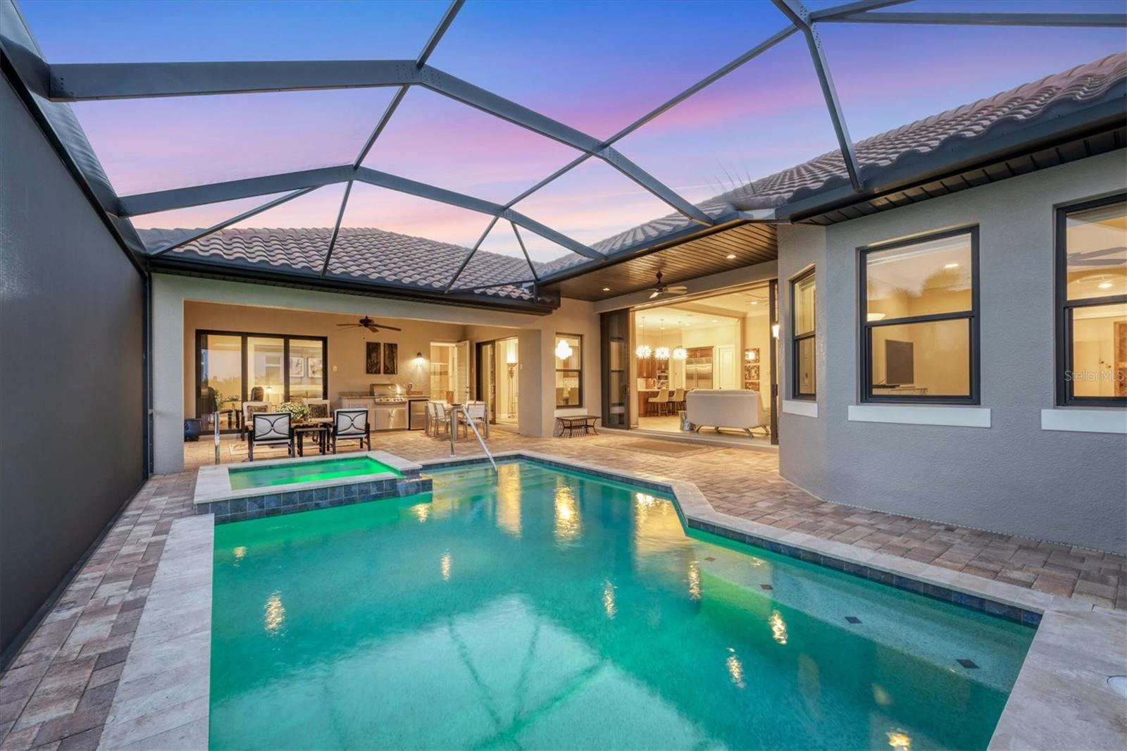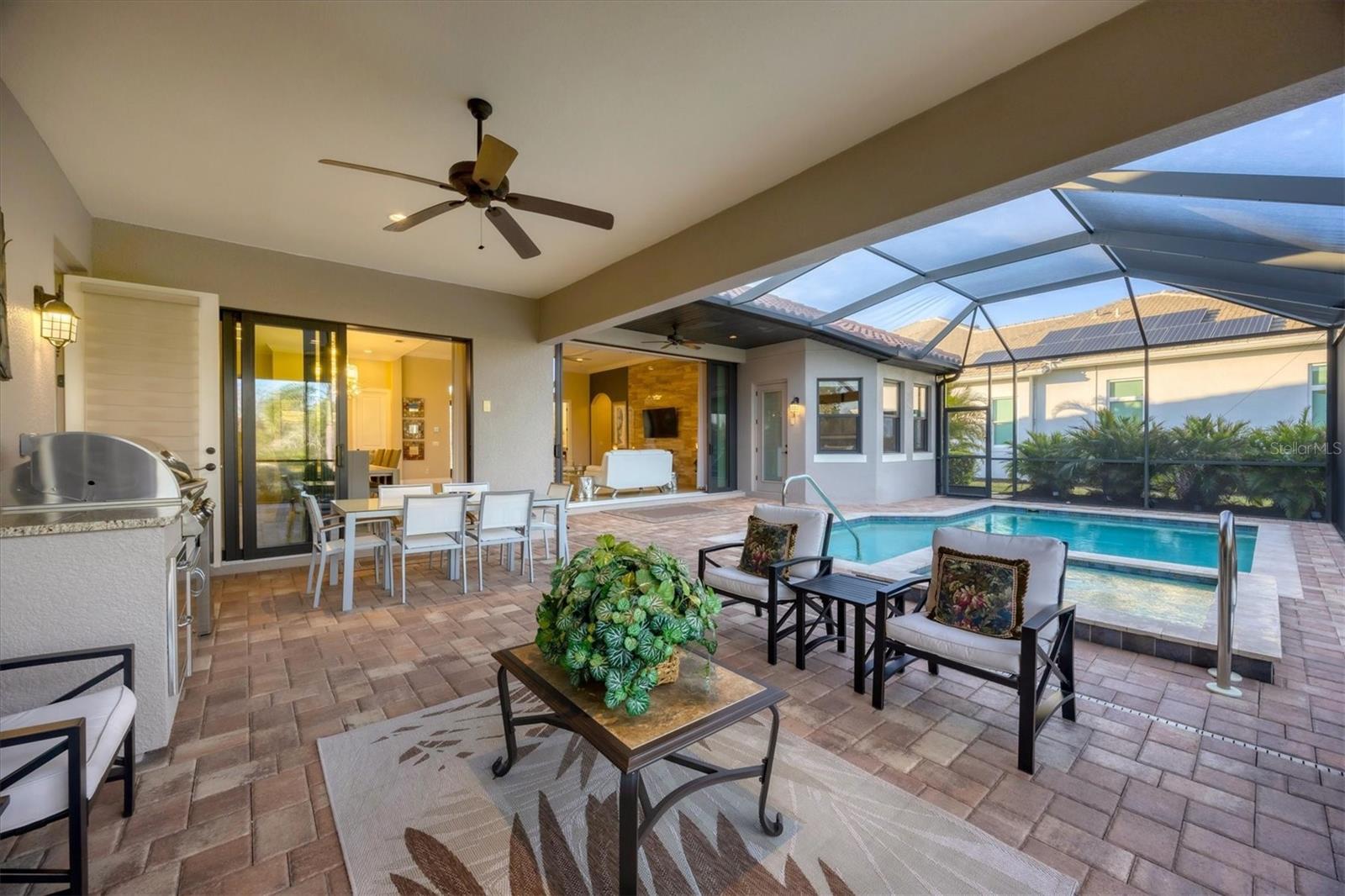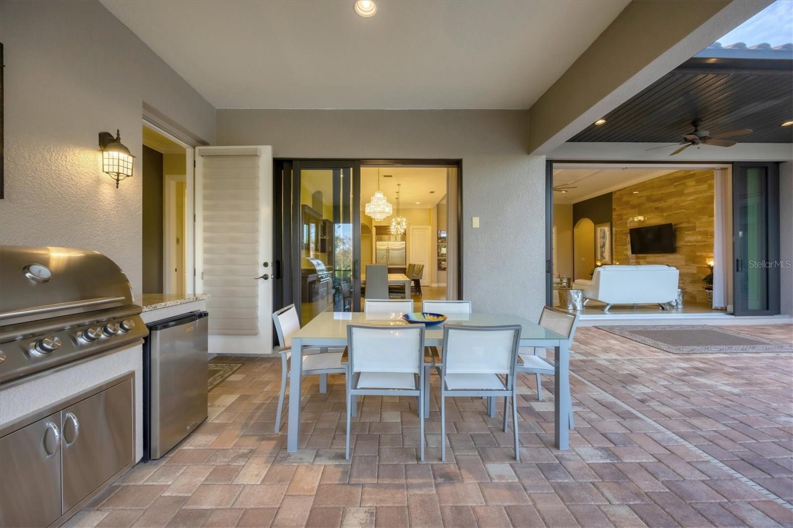 - Exterior: Outdoor Grill, Outdoor Kitchen, Rain Gutters, Sidewalk, Sliding Doors