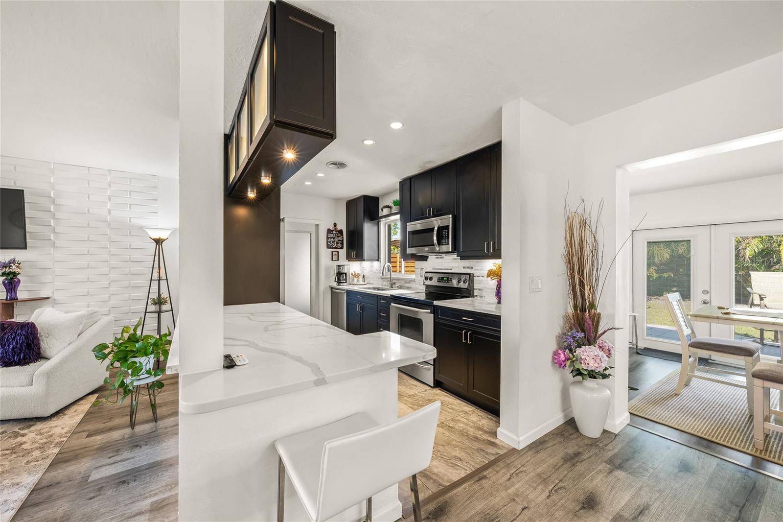 You are in luck! Chic Coastal Living is now possible, right in the Heart of Sarasota!Nestled in the desirable South Gate community, this impeccably updated home blends modern elegance with timeless charm. From the moment you arrive, you'll be captivated by its pristine curb appeal, accentuated by lush landscaping and swaying palms. Step inside to experience an airy, sun-drenched interior with stylish finishes and thoughtful renovations from floor to ceiling.The open-concept living area features a newer roof, newer HVAC, newer hot water heater, luxury vinyl plank flooring, fresh neutral tones, and a stunning accent wall that adds character and depth to the space. A wall of PGT replacement windows bathes the home in natural light, enhancing the warm and welcoming atmosphere. At the heart of the home, the modern chef's kitchen has been tastefully redesigned with sleek quartz countertops, bold black cabinetry, and an elegant pass-through bar, perfect for entertaining. Stainless steel appliances, upgraded fixtures, and a stylish glass-front display cabinet elevate the space, making meal prep a delight.The spacious dining area is a true showstopper, boasting vaulted ceilings, dual French doors, and expansive backyard views. Whether hosting an intimate dinner or a festive gathering, this space seamlessly blends indoor-outdoor living. Retreat to the serene primary suite, a tranquil haven featuring plush carpeting, oversized windows, and ample storage. The secondary bedrooms are equally inviting, offering flexible spaces for family, guests, or a home office.Step outside into your private oasis, where a fully fenced backyard provides both privacy and serenity. The large paver patio is perfect for al fresco dining, shaded under a chic umbrella, while tropical landscaping adds a touch of paradise. Whether enjoying your morning coffee or hosting an evening get-together, this backyard is an entertainer's dream.Additional highlights include a newer roof, updated HVAC and hot water heater, knockdown finished ceilings, and fresh paint. Situated on a quiet street, this home is just minutes from Downtown Sarasota, St. Armands Circle, and the world-famous Siesta Key Beach--ranked #1 in the U.S.! Experience Florida living at its finest--schedule your private tour today before this gem is gone!