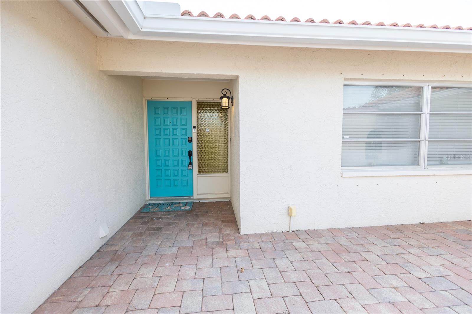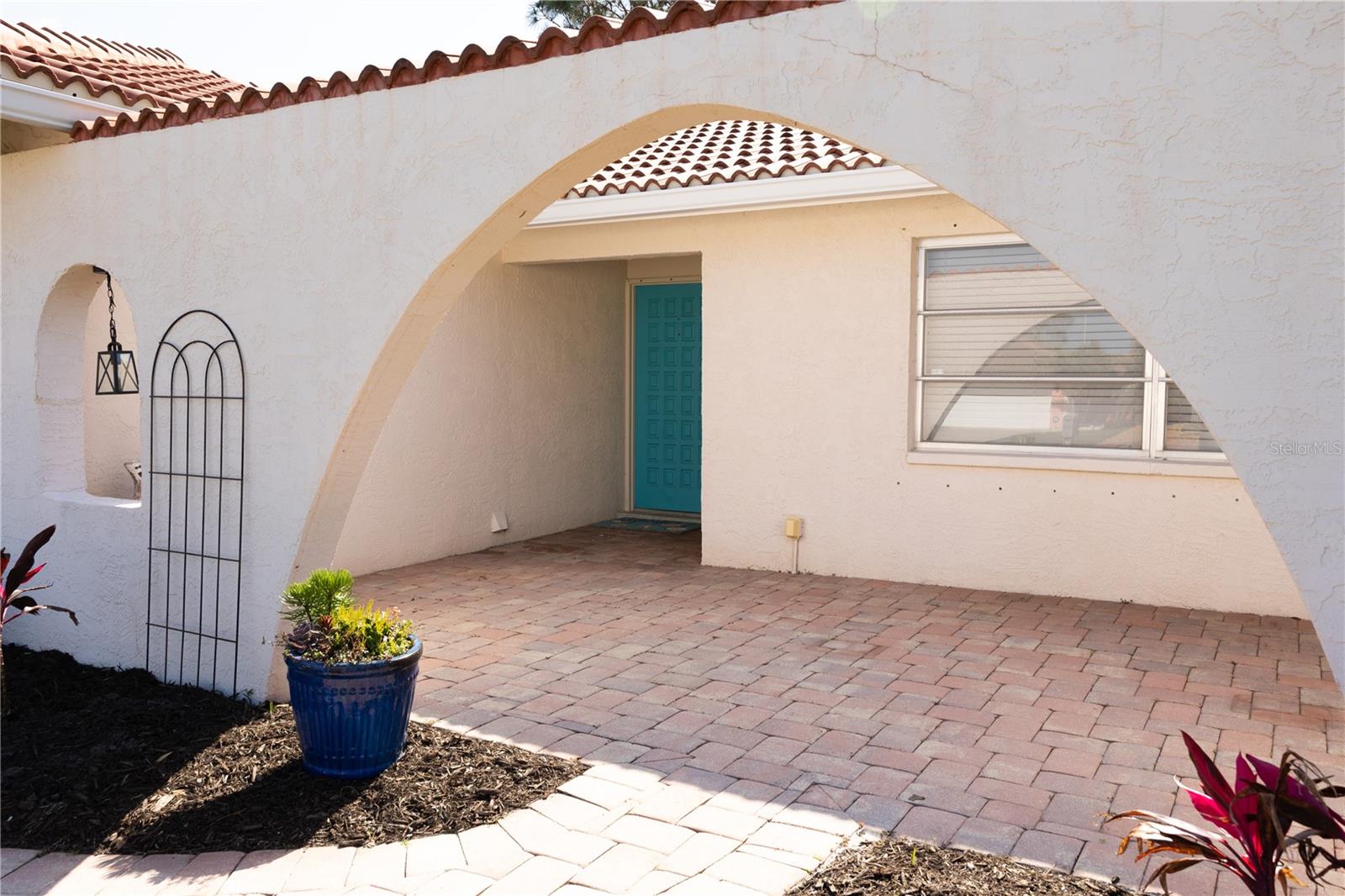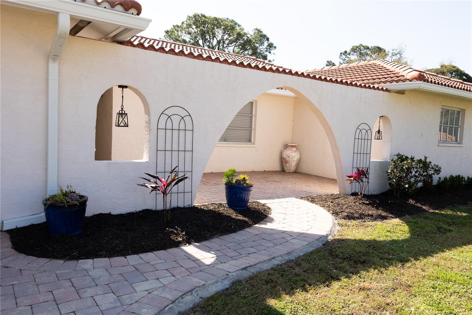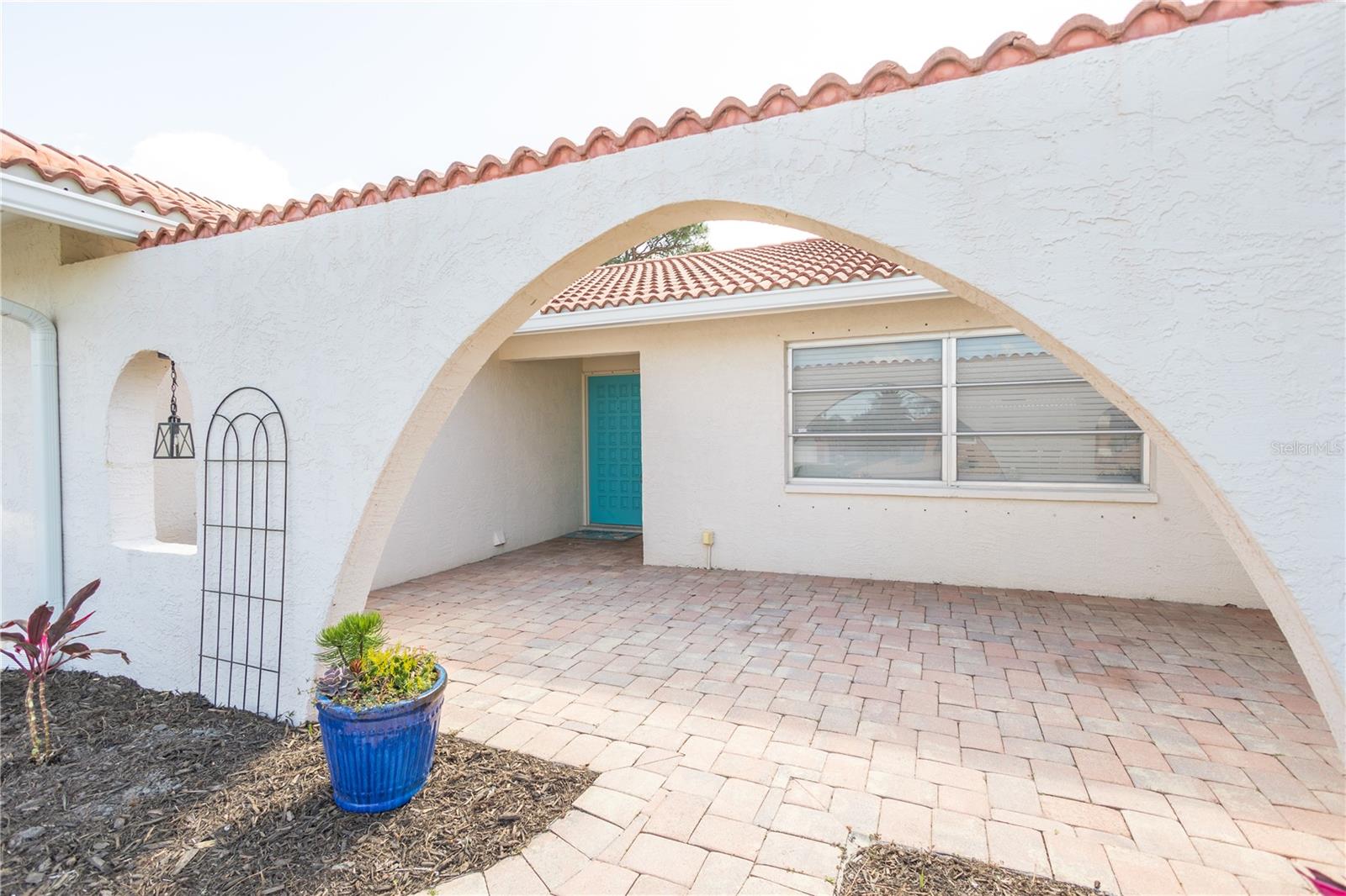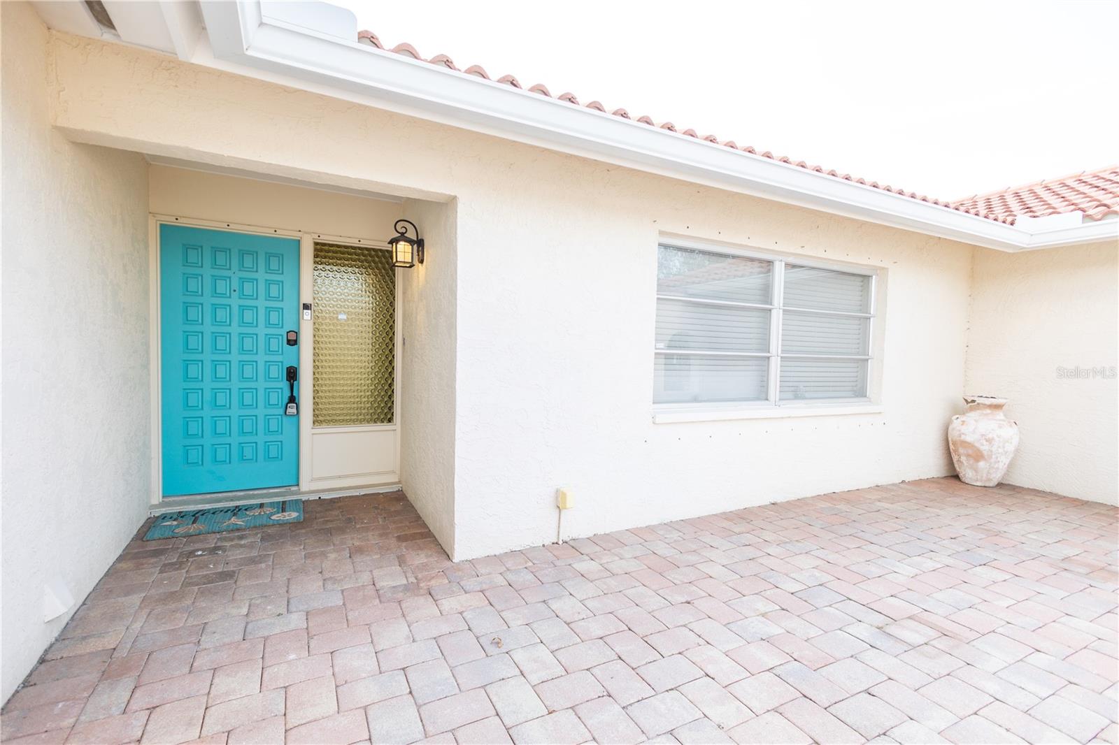 - Exterior: Courtyard, Hurricane Shutters, Private Mailbox, Rain Gutters, Sidewalk, Sliding Doors