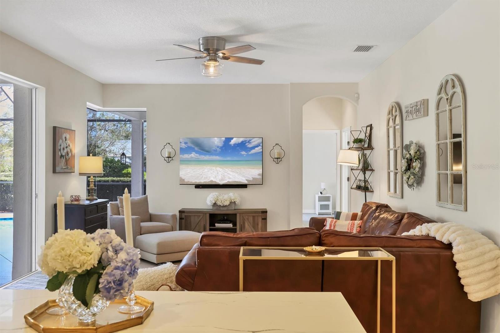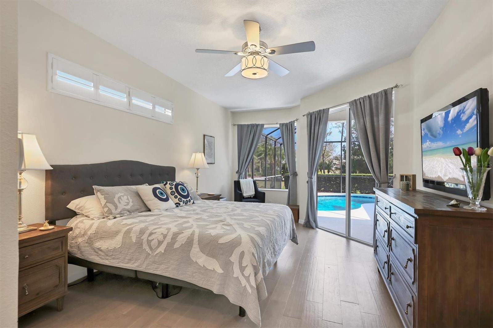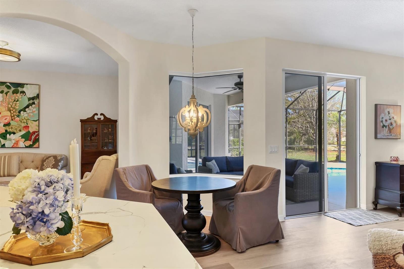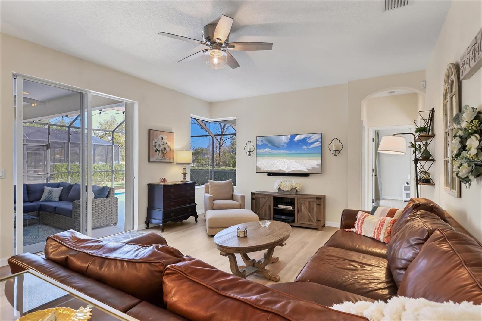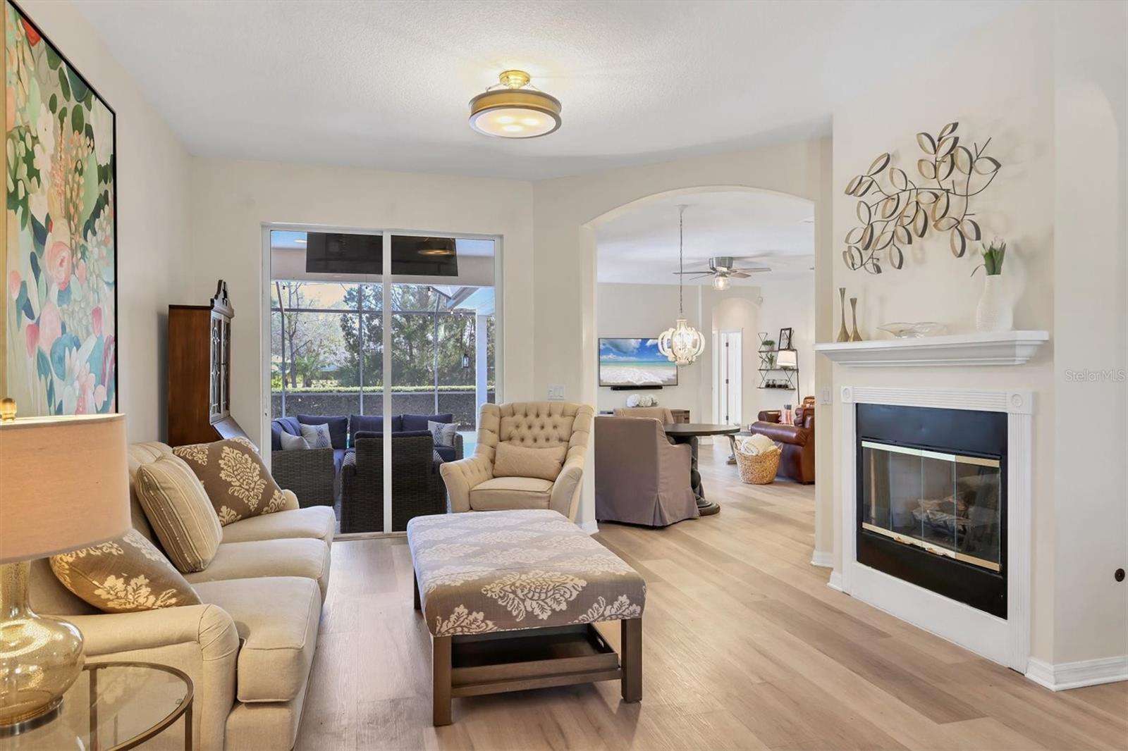Price Improvement! In the heart of Greenbrook's Chase neighborhood, this beautifully updated home is a short walk/bike ride to top-rated schools, scenic parks, playgrounds and nature trails. Generously sized with 4 full bedrooms, plus a large bonus/flex room for a 5th bedroom, office or playroom. Roof replaced November 2022.Interior imbued with blonde oak luxury vinyl flooring and soft, muted walls. Dining and living rooms share a natural gas fireplace. The tastefully refreshed kitchen boasts alabaster quartz countertops, built-in white linen cabinetry and upgraded appliances. The spacious family room leads directly to an inviting outdoor living space with a drop-down TV. The gas-heated saltwater pool resurfaced in 2022. Owners' retreat has walk-in closets and large en-suite bathroom. Side entry 2.5-car garage boasts a large attic space, overhead storage, and a mini-split air-conditioning unit. Whole-house water softener and Air Knight air purification systems provide a healthy environment for your family.