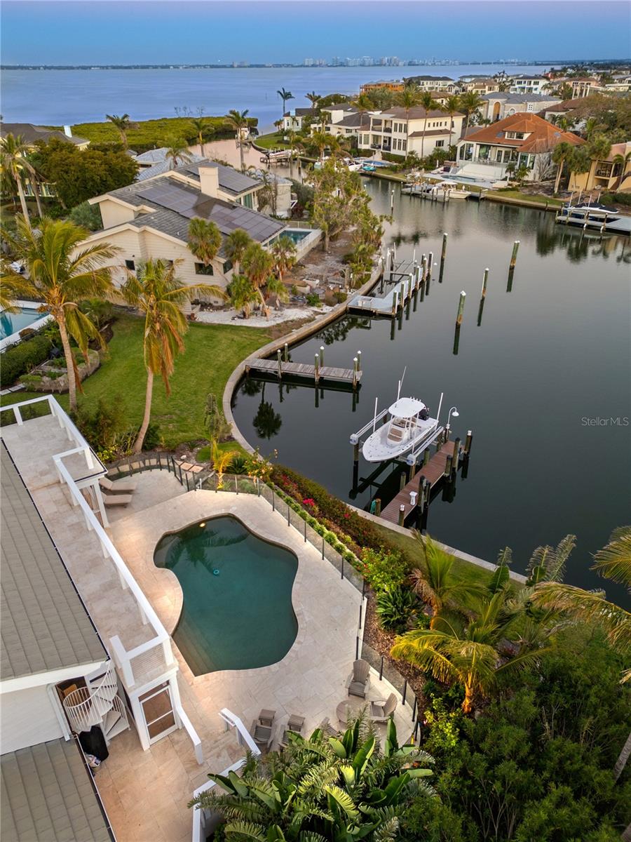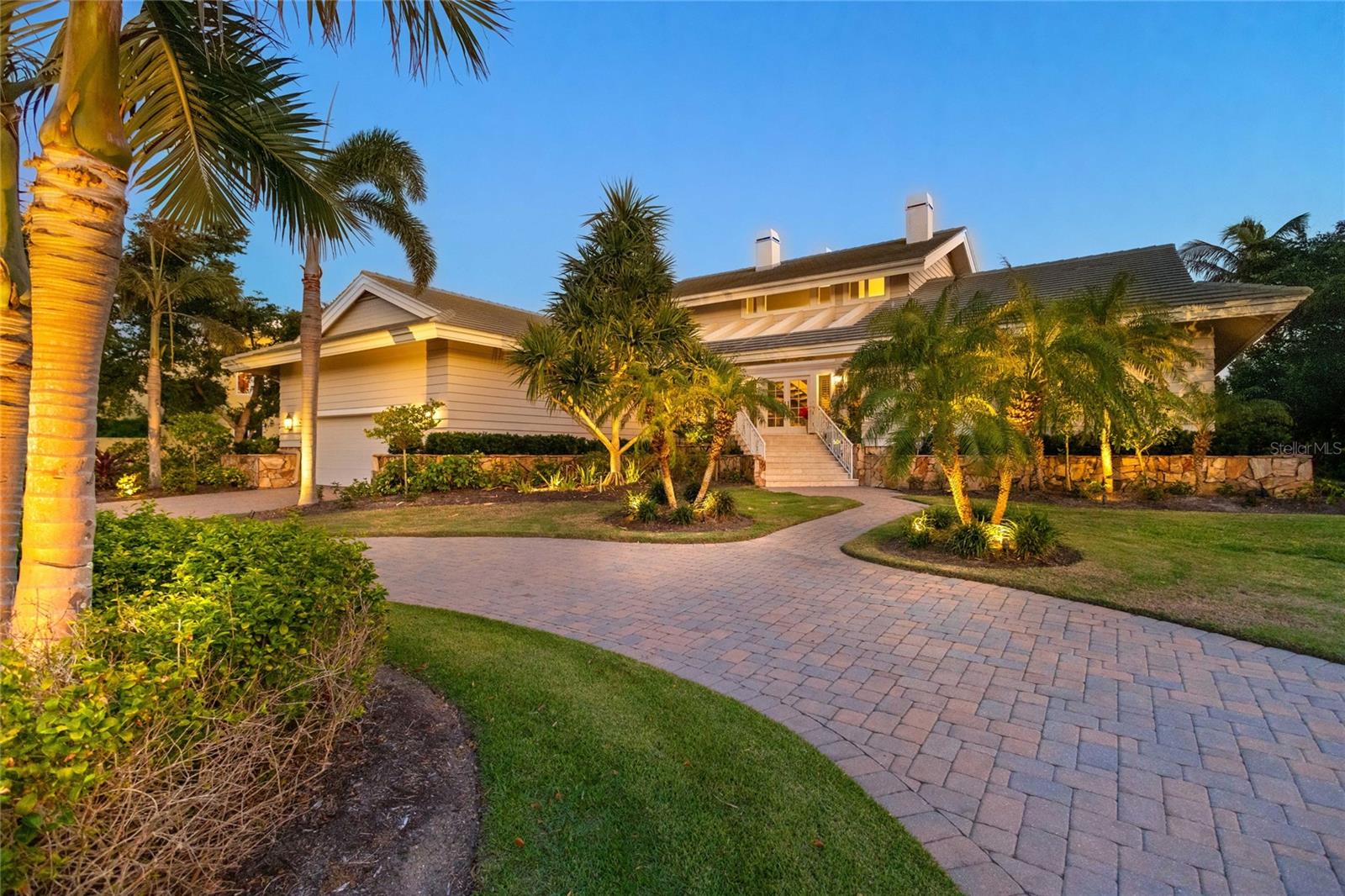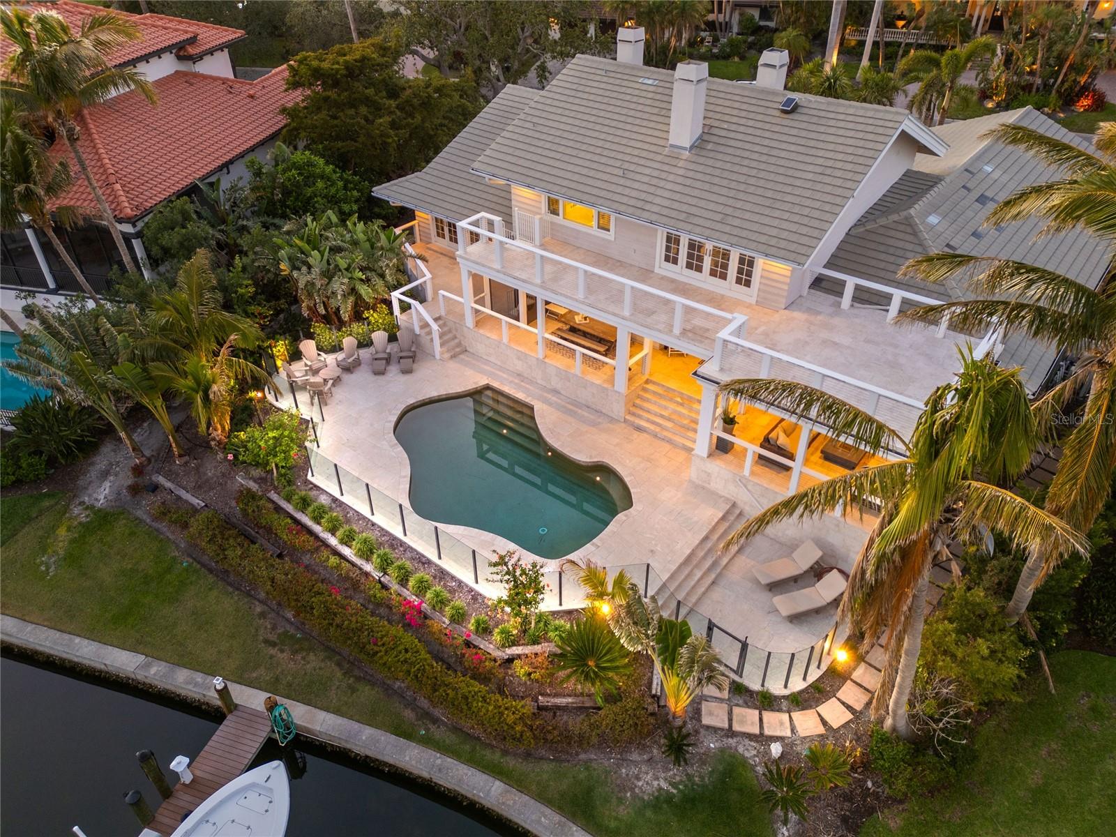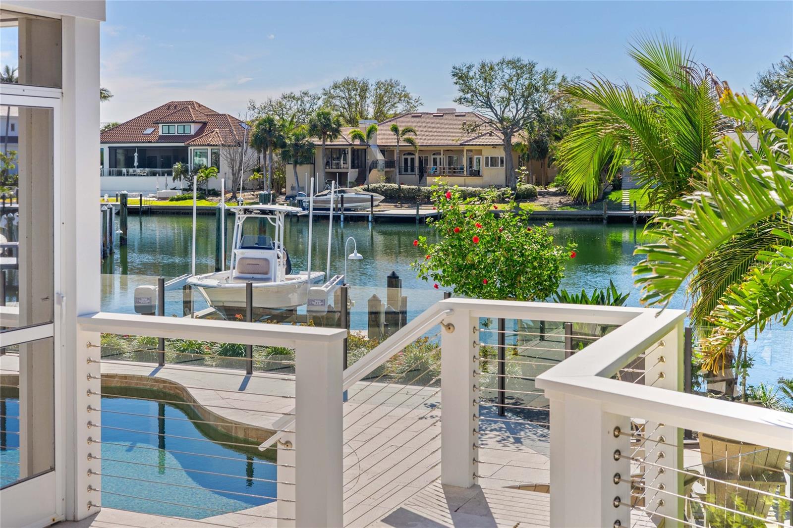This exquisite two-story waterfront home located in the coveted Harbor section of Bay Isles has been meticulously renovated to embody modern elegance and luxurious coastal living. Surrounded by lush tropical landscaping, the home welcomes you through an elegant French door entrance into the grand foyer, where soaring ceilings, gleaming travertine flooring, and a striking wrought iron floating staircase with rich, dark wood steps set the tone for the refined elegance that unfolds throughout the home. The lower level boasts a bright and airy open space with hardwood floors throughout, creating a welcoming atmosphere that effortlessly combines sophistication with the timeless beauty of natural materials. The spacious family room is anchored by a stunning fireplace with decorative columns and an elegant mantel, complemented by French doors leading to the expansive waterfront lanai, reinforcing the home's seamless connection to its stunning natural surroundings. A culinary enthusiast's dream, the generously sized kitchen features a large island with a waterfall granite countertop, custom cabinetry, ample storage space, and high-end stainless steel appliances, including a six-burner gas range and double ovens. Adjacent to the kitchen, the dining area and great room spaces flow seamlessly into each other. The great room is both grand and inviting, showcasing a dramatic wood-clad cathedral ceiling that adds warmth and character. A second stone fireplace enhances the ambiance, while three sets of French doors that open onto the lanai offer an effortless transition between indoor and outdoor living. Also on this level are two generous guest suites, each with a full bath, one with direct lanai access, and a den with full bath. Upstairs, the primary suite is a true retreat. Floor-to-ceiling windows illuminate the space, and French doors open to a spacious private balcony, offering captivating water views that create a peaceful escape. A cozy fireplace adds to the intimate atmosphere, while the spa-inspired en-suite bath indulges with marble flooring, soaking tub, dual vanities, frameless glass walk-in shower, and water closet, all overlooking the serene waterway. The outdoor living space is equally spectacular, designed for both relaxation and entertaining. The expansive lanai features multiple covered areas with a rich wood-clad ceiling and retractable screens, a sun-drenched open-air section, and a stunning saltwater pool with travertine decking framed by verdant tropical landscaping. Just beyond the pool, a private dock with a boat lift sits on a deep-water basin and wide canal with no bridges to Sarasota Bay, offering quick and direct access for boating enthusiasts. Bay Isles Beach Club membership is included. This extraordinary home seamlessly blends elegance, comfort, and the unparalleled beauty of waterfront living, creating a sanctuary that is as functional as it is breathtaking.