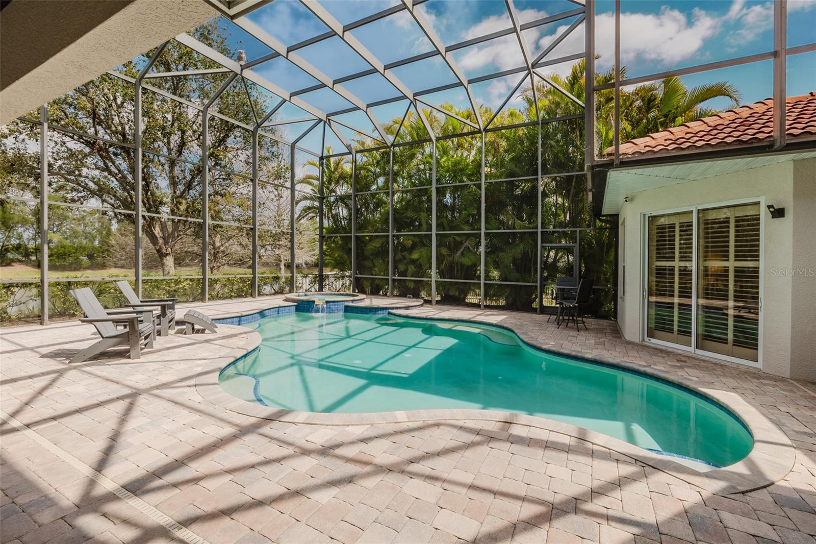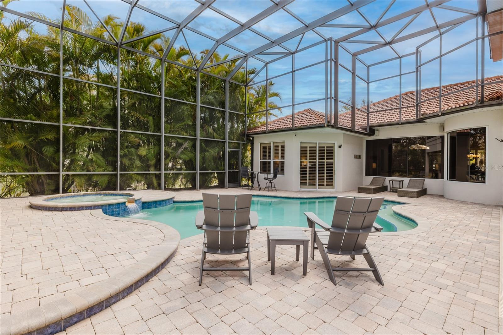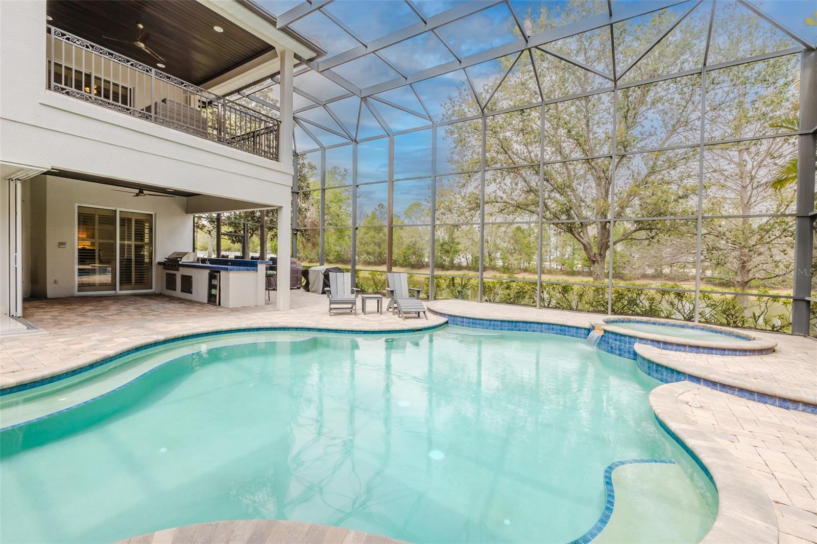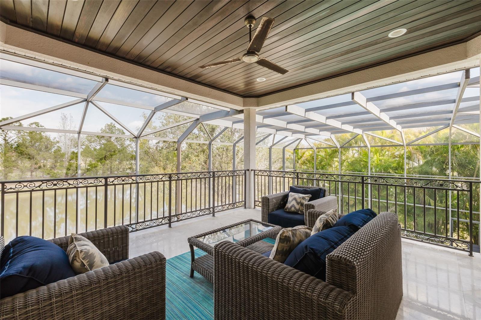 Located in Greenbrook Preserve, this spacious 5-bedroom, 4-bath home plus bonus room and office offers over 4,050 sq. ft. under air (5,235 sq. ft. overall) with a two-story screened lanai, private balcony, pool, spa, and serene pond views.Upon entry, a combined living and dining room welcomes you with a soaring bay window that frames views of the lanai. The main floor is finished with stunning 18x18 Karya Royal marble flooring, which extends through the kitchen and family room, creating a seamless and elegant space. The chef's kitchen is designed for both style and function, featuring custom hardwood cabinetry, Cambria quartz countertops, a large center island, Bosch stainless steel appliances, custom stone backsplash, and a double wall pantry with slide-out shelving. The family room is designed for effortless indoor-outdoor living, featuring a full pocket corner sliding door that opens completely to the lanai, creating a seamless transition between the interior and outdoor spaces.The primary suite is a private retreat with a bay window seating area, direct lanai access, and a spa-inspired bath featuring a free-standing soaking tub over a Brazilian teak wood base, an oversized walk-in shower with dual heads and custom river stone accents, mood lighting under cabinets and soaking tub and a custom walk-in closet with built-in shelving. Two additional first-floor guest bedrooms feature custom built-in closet shelving and share access to two additional full baths. A dedicated office with direct lanai access provides a quiet workspace or flexible bonus space.Upstairs, a spacious bonus room is accompanied by two additional bedrooms, a full bath, and a private marble-floored balcony overlooking the resort-style pool and spa.The two-story screened lanai is designed to make the most of Florida's lifestyle, featuring a teakwood tongue-and-groove ceiling, a summer kitchen with a beverage fridge and sink, and peaceful pond views. Additional highlights include a barrel tile roof, plantation shutters, custom window treatments, a first-floor laundry room with shelving, wired for ADT Security System, Full Perimeter Electric Pet Fence, and a three-car garage with epoxy floors.Greenbrook Preserve is nestled within the award-winning master-planned community of Lakewood Ranch, offering an exceptional lifestyle with access to top-rated amenities. Residents enjoy two community parks, including Adventure Park, featuring sports fields, playgrounds, a dog park, a pavilion, in-line skating, and miles of scenic walking trails. This home is ideally situated just minutes from Waterside Place, Lakewood Ranch Main Street, and UTC's premier shopping and dining. With championship golf courses, top medical facilities, and the stunning Gulf Coast beaches nearby, plus quick access to I-75, Greenbrook Preserve combines convenience with Florida's sought-after outdoor lifestyle.