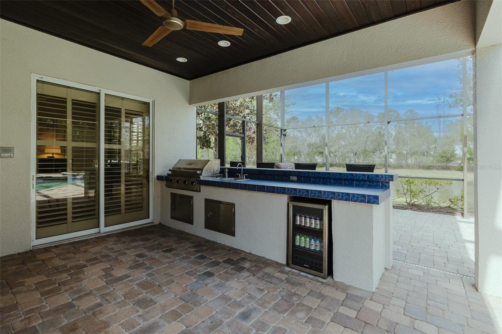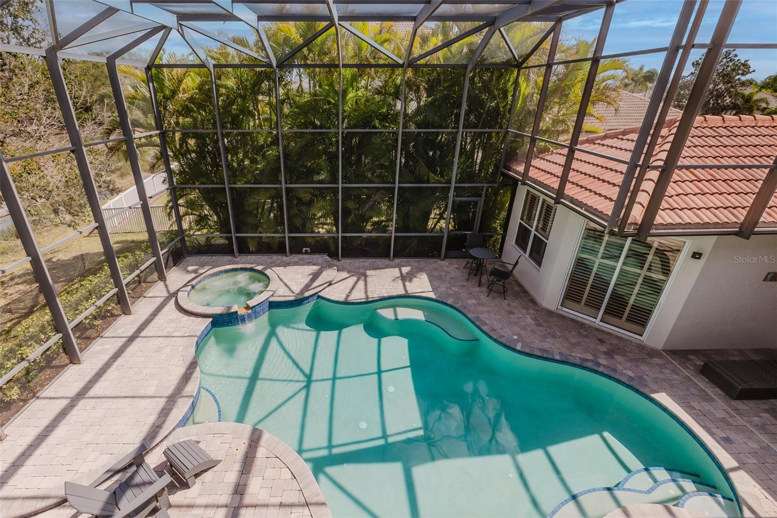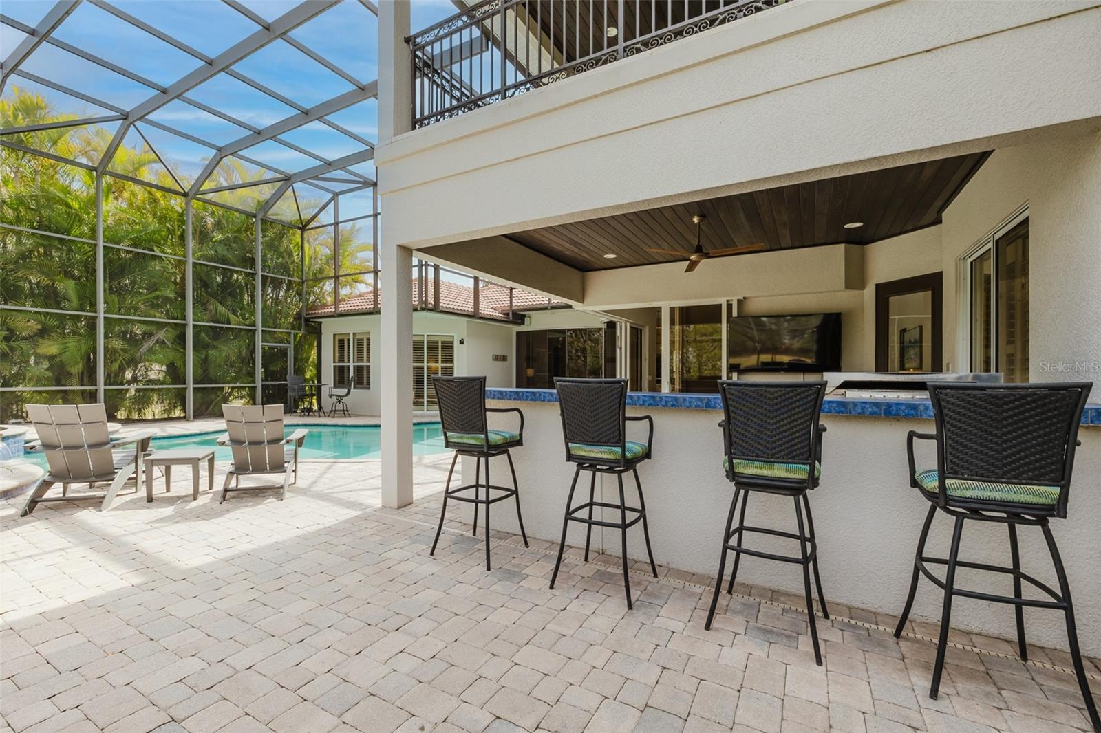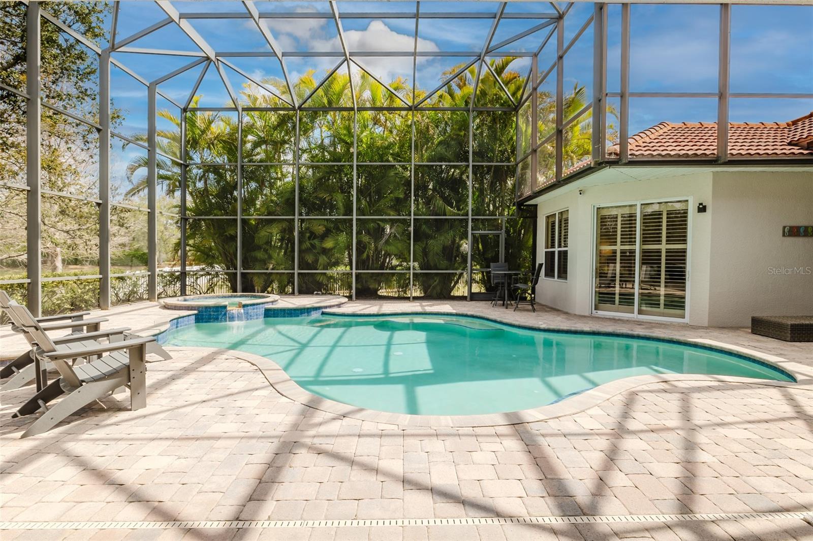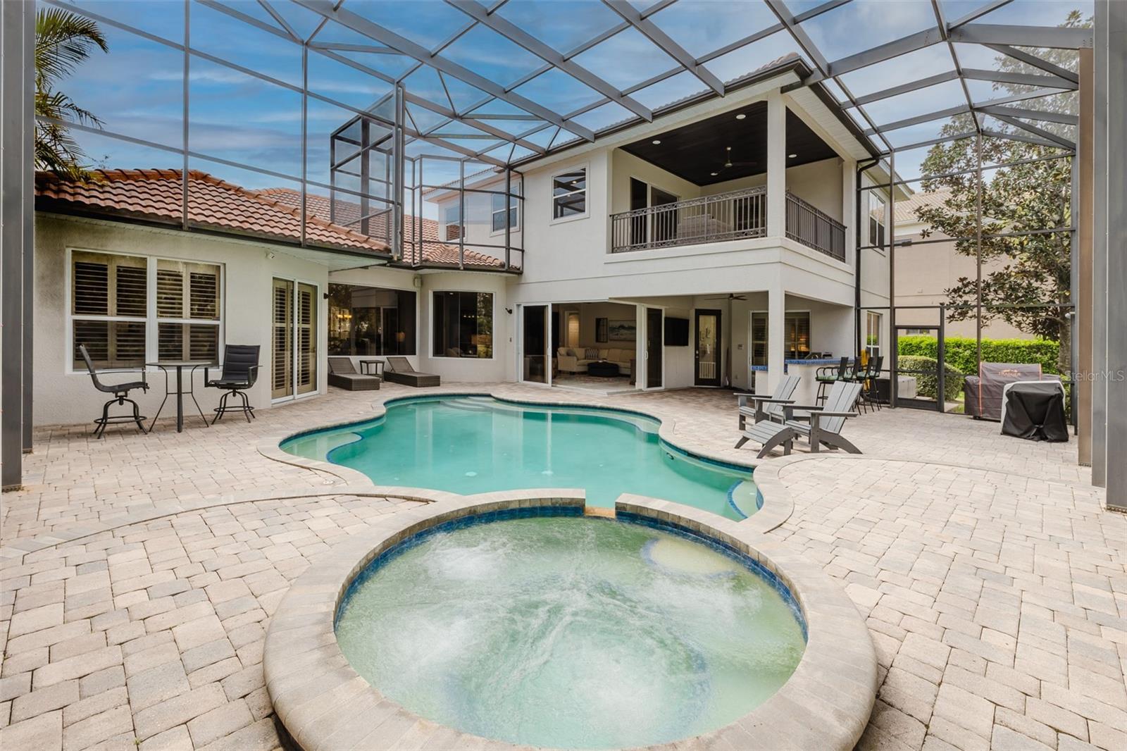 Located in Greenbrook Preserve, this spacious 5-bedroom, 4-bath home plus bonus room and office offers over 4,050 sq. ft. under air (5,235 sq. ft. overall) with a two-story screened lanai, private balcony, pool, spa, and serene pond views.Upon entry, a combined living and dining room welcomes you with a soaring bay window that frames views of the lanai. The main floor is finished with stunning 18x18 Karya Royal marble flooring, which extends through the kitchen and family room, creating a seamless and elegant space. The chef's kitchen is designed for both style and function, featuring custom hardwood cabinetry, Cambria quartz countertops, a large center island, Bosch stainless steel appliances, custom stone backsplash, and a double wall pantry with slide-out shelving. The family room is designed for effortless indoor-outdoor living, featuring a full pocket corner sliding door that opens completely to the lanai, creating a seamless transition between the interior and outdoor spaces.The primary suite is a private retreat with a bay window seating area, direct lanai access, and a spa-inspired bath featuring a free-standing soaking tub over a Brazilian teak wood base, an oversized walk-in shower with dual heads and custom river stone accents, mood lighting under cabinets and soaking tub and a custom walk-in closet with built-in shelving. Two additional first-floor guest bedrooms feature custom built-in closet shelving and share access to two additional full baths. A dedicated office with direct lanai access provides a quiet workspace or flexible bonus space.Upstairs, a spacious bonus room is accompanied by two additional bedrooms, a full bath, and a private marble-floored balcony overlooking the resort-style pool and spa.The two-story screened lanai is designed to make the most of Florida's lifestyle, featuring a teakwood tongue-and-groove ceiling, a summer kitchen with a beverage fridge and sink, and peaceful pond views. Additional highlights include a barrel tile roof, plantation shutters, custom window treatments, a first-floor laundry room with shelving, wired for ADT Security System, Full Perimeter Electric Pet Fence, and a three-car garage with epoxy floors.Greenbrook Preserve is nestled within the award-winning master-planned community of Lakewood Ranch, offering an exceptional lifestyle with access to top-rated amenities. Residents enjoy two community parks, including Adventure Park, featuring sports fields, playgrounds, a dog park, a pavilion, in-line skating, and miles of scenic walking trails. This home is ideally situated just minutes from Waterside Place, Lakewood Ranch Main Street, and UTC's premier shopping and dining. With championship golf courses, top medical facilities, and the stunning Gulf Coast beaches nearby, plus quick access to I-75, Greenbrook Preserve combines convenience with Florida's sought-after outdoor lifestyle.