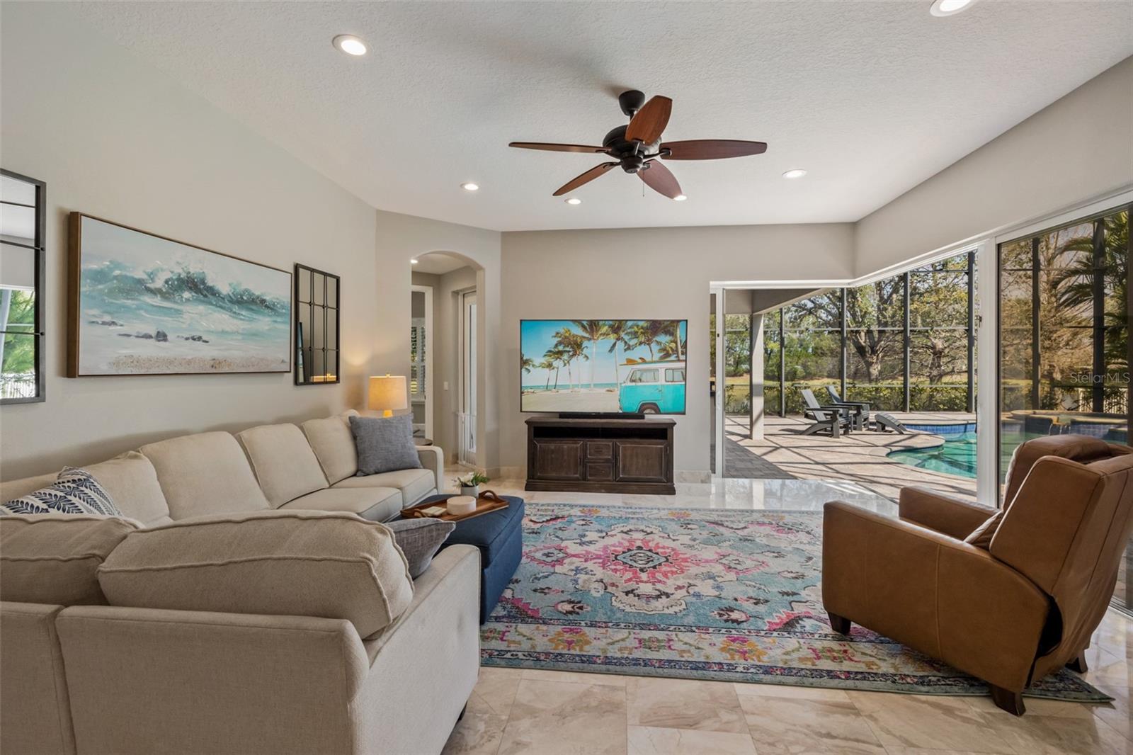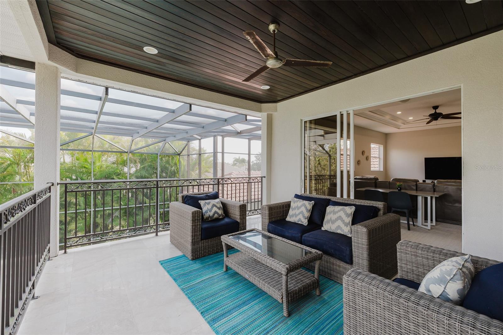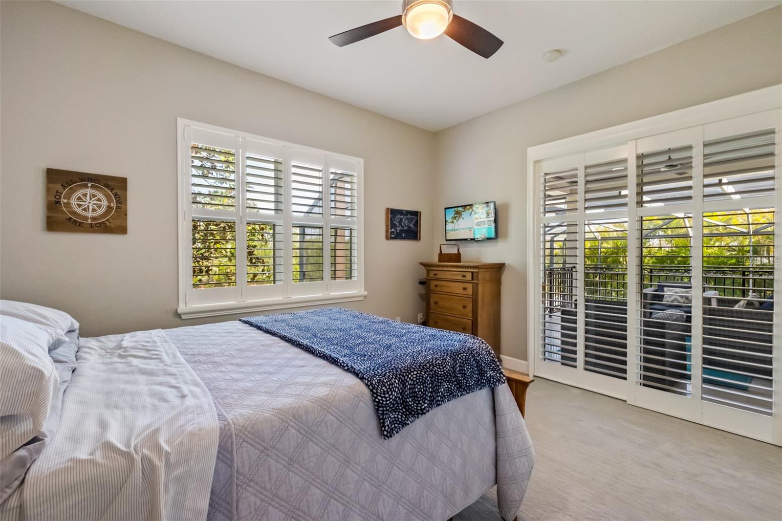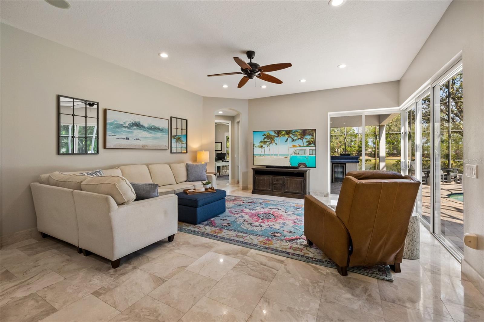 Located in Greenbrook Preserve, this spacious 5-bedroom, 4-bath home plus bonus room and office offers over 4,050 sq. ft. under air (5,235 sq. ft. overall) with a two-story screened lanai, private balcony, pool, spa, and serene pond views.Upon entry, a combined living and dining room welcomes you with a soaring bay window that frames views of the lanai. The main floor is finished with stunning 18x18 Karya Royal marble flooring, which extends through the kitchen and family room, creating a seamless and elegant space. The chef's kitchen is designed for both style and function, featuring custom hardwood cabinetry, Cambria quartz countertops, a large center island, Bosch stainless steel appliances, custom stone backsplash, and a double wall pantry with slide-out shelving. The family room is designed for effortless indoor-outdoor living, featuring a full pocket corner sliding door that opens completely to the lanai, creating a seamless transition between the interior and outdoor spaces.The primary suite is a private retreat with a bay window seating area, direct lanai access, and a spa-inspired bath featuring a free-standing soaking tub over a Brazilian teak wood base, an oversized walk-in shower with dual heads and custom river stone accents, mood lighting under cabinets and soaking tub and a custom walk-in closet with built-in shelving. Two additional first-floor guest bedrooms feature custom built-in closet shelving and share access to two additional full baths. A dedicated office with direct lanai access provides a quiet workspace or flexible bonus space.Upstairs, a spacious bonus room is accompanied by two additional bedrooms, a full bath, and a private marble-floored balcony overlooking the resort-style pool and spa.The two-story screened lanai is designed to make the most of Florida's lifestyle, featuring a teakwood tongue-and-groove ceiling, a summer kitchen with a beverage fridge and sink, and peaceful pond views. Additional highlights include a barrel tile roof, plantation shutters, custom window treatments, a first-floor laundry room with shelving, wired for ADT Security System, Full Perimeter Electric Pet Fence, and a three-car garage with epoxy floors.Greenbrook Preserve is nestled within the award-winning master-planned community of Lakewood Ranch, offering an exceptional lifestyle with access to top-rated amenities. Residents enjoy two community parks, including Adventure Park, featuring sports fields, playgrounds, a dog park, a pavilion, in-line skating, and miles of scenic walking trails. This home is ideally situated just minutes from Waterside Place, Lakewood Ranch Main Street, and UTC's premier shopping and dining. With championship golf courses, top medical facilities, and the stunning Gulf Coast beaches nearby, plus quick access to I-75, Greenbrook Preserve combines convenience with Florida's sought-after outdoor lifestyle.