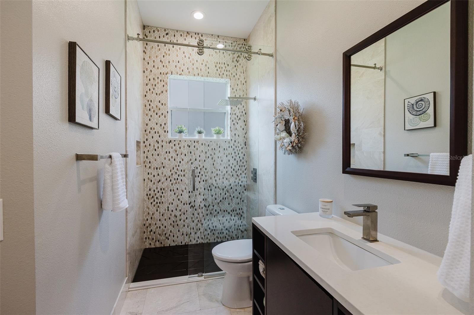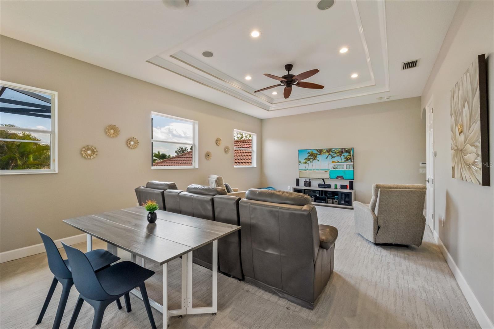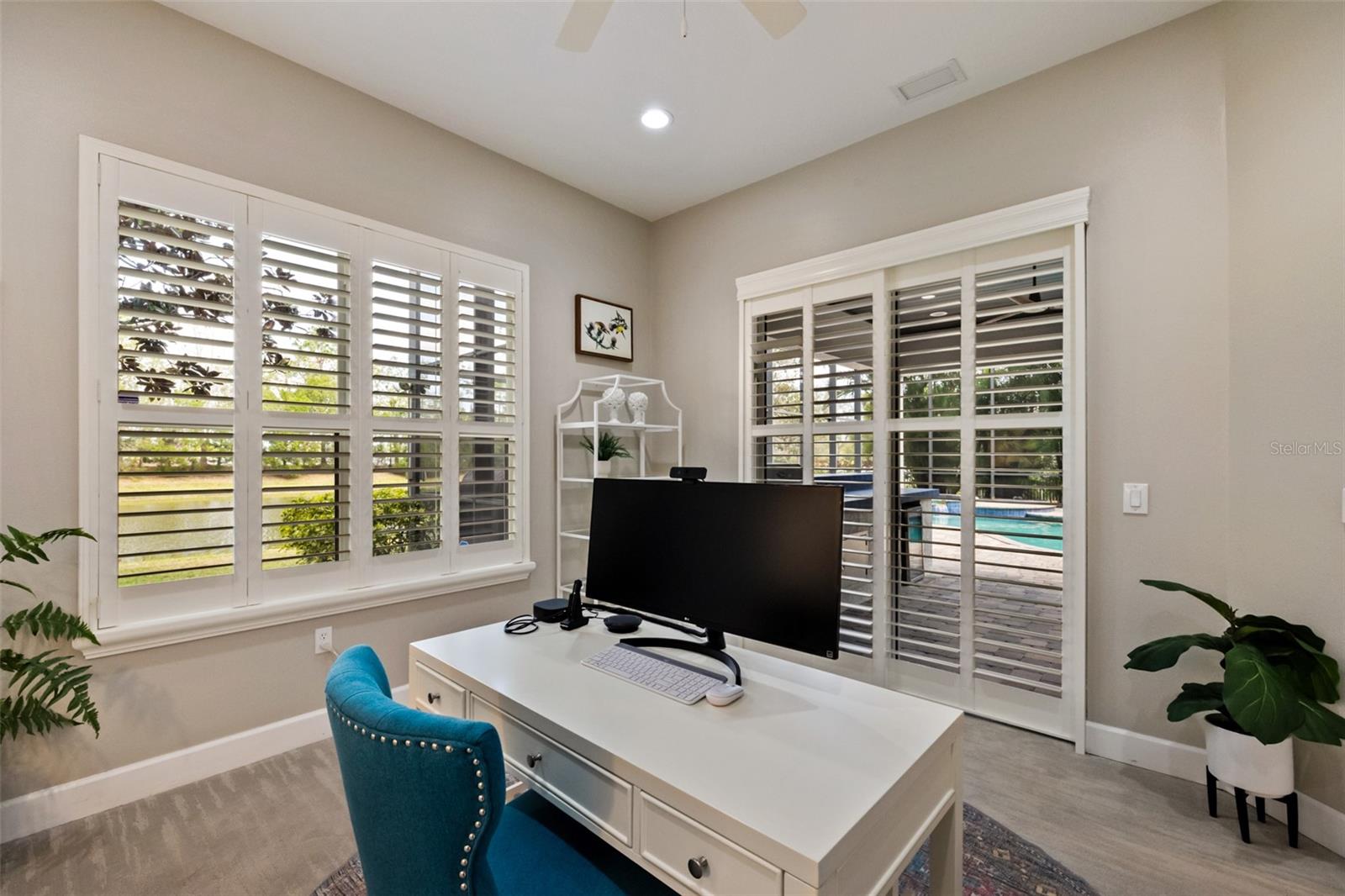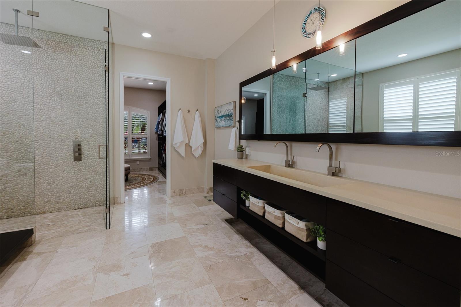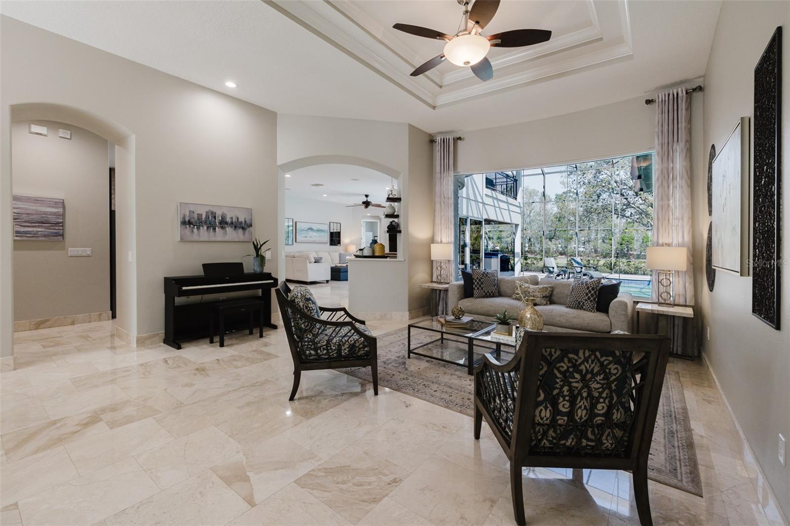 Located in Greenbrook Preserve, this spacious 5-bedroom, 4-bath home plus bonus room and office offers over 4,050 sq. ft. under air (5,235 sq. ft. overall) with a two-story screened lanai, private balcony, pool, spa, and serene pond views.Upon entry, a combined living and dining room welcomes you with a soaring bay window that frames views of the lanai. The main floor is finished with stunning 18x18 Karya Royal marble flooring, which extends through the kitchen and family room, creating a seamless and elegant space. The chef's kitchen is designed for both style and function, featuring custom hardwood cabinetry, Cambria quartz countertops, a large center island, Bosch stainless steel appliances, custom stone backsplash, and a double wall pantry with slide-out shelving. The family room is designed for effortless indoor-outdoor living, featuring a full pocket corner sliding door that opens completely to the lanai, creating a seamless transition between the interior and outdoor spaces.The primary suite is a private retreat with a bay window seating area, direct lanai access, and a spa-inspired bath featuring a free-standing soaking tub over a Brazilian teak wood base, an oversized walk-in shower with dual heads and custom river stone accents, mood lighting under cabinets and soaking tub and a custom walk-in closet with built-in shelving. Two additional first-floor guest bedrooms feature custom built-in closet shelving and share access to two additional full baths. A dedicated office with direct lanai access provides a quiet workspace or flexible bonus space.Upstairs, a spacious bonus room is accompanied by two additional bedrooms, a full bath, and a private marble-floored balcony overlooking the resort-style pool and spa.The two-story screened lanai is designed to make the most of Florida's lifestyle, featuring a teakwood tongue-and-groove ceiling, a summer kitchen with a beverage fridge and sink, and peaceful pond views. Additional highlights include a barrel tile roof, plantation shutters, custom window treatments, a first-floor laundry room with shelving, wired for ADT Security System, Full Perimeter Electric Pet Fence, and a three-car garage with epoxy floors.Greenbrook Preserve is nestled within the award-winning master-planned community of Lakewood Ranch, offering an exceptional lifestyle with access to top-rated amenities. Residents enjoy two community parks, including Adventure Park, featuring sports fields, playgrounds, a dog park, a pavilion, in-line skating, and miles of scenic walking trails. This home is ideally situated just minutes from Waterside Place, Lakewood Ranch Main Street, and UTC's premier shopping and dining. With championship golf courses, top medical facilities, and the stunning Gulf Coast beaches nearby, plus quick access to I-75, Greenbrook Preserve combines convenience with Florida's sought-after outdoor lifestyle.