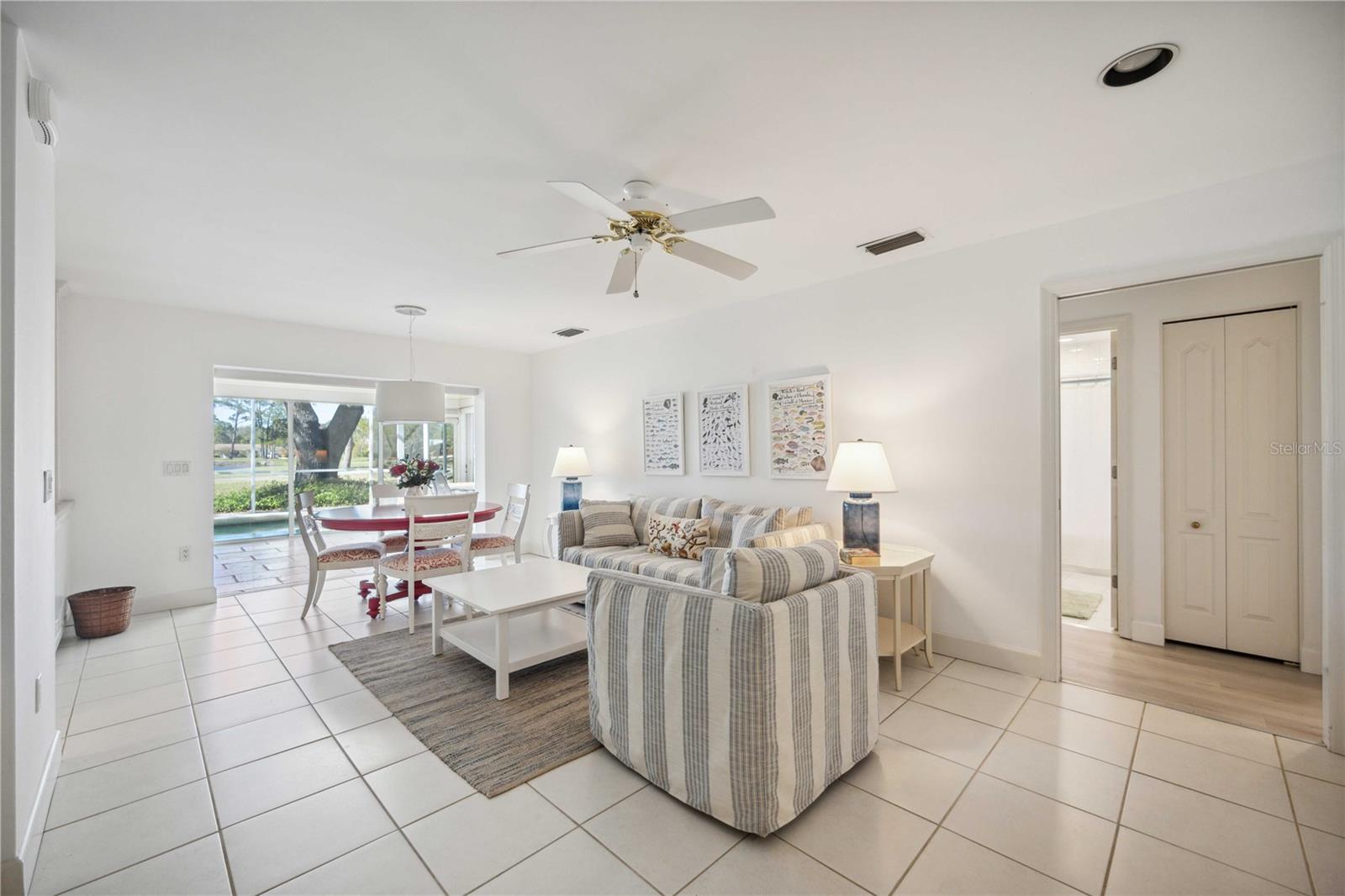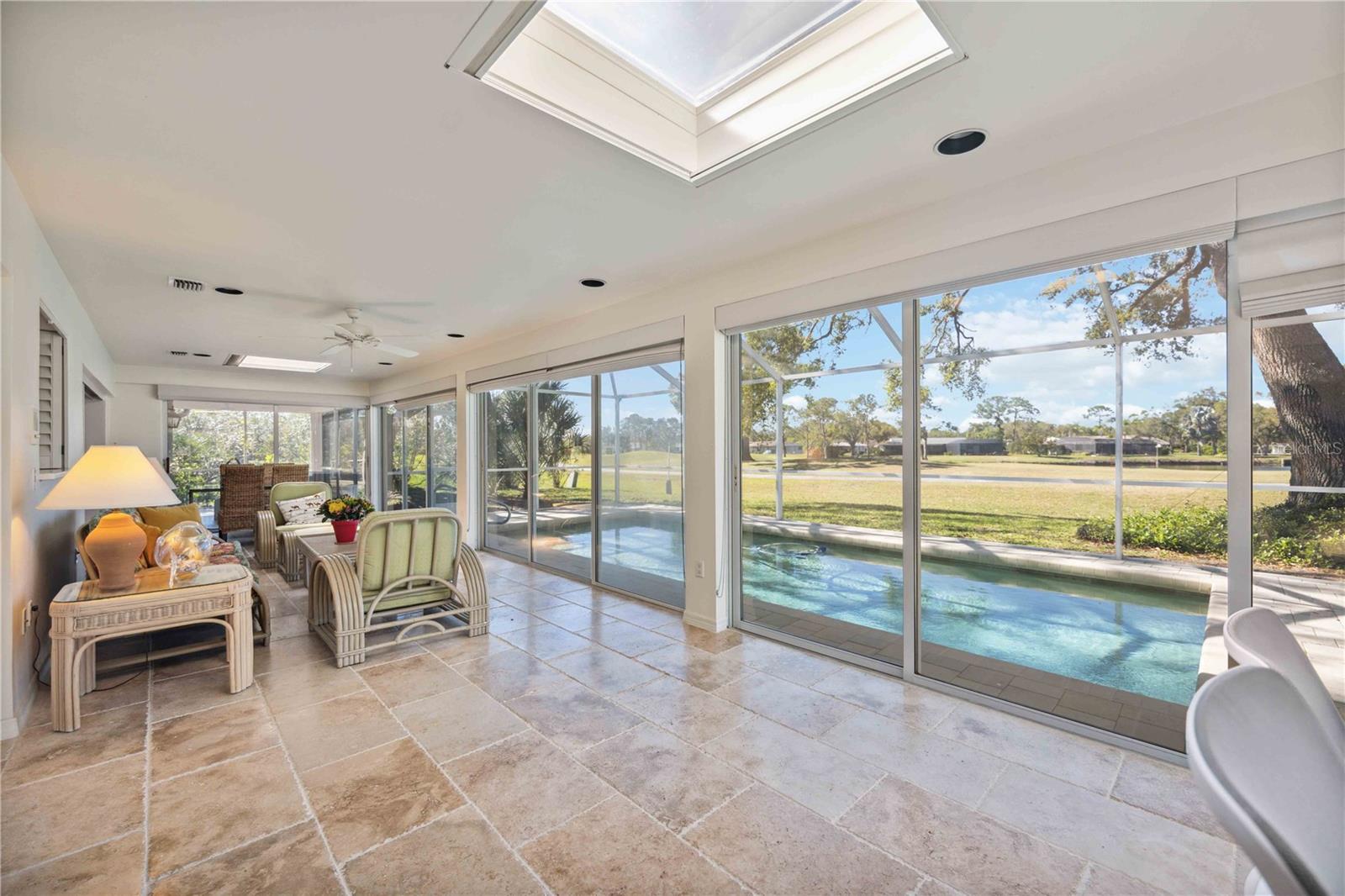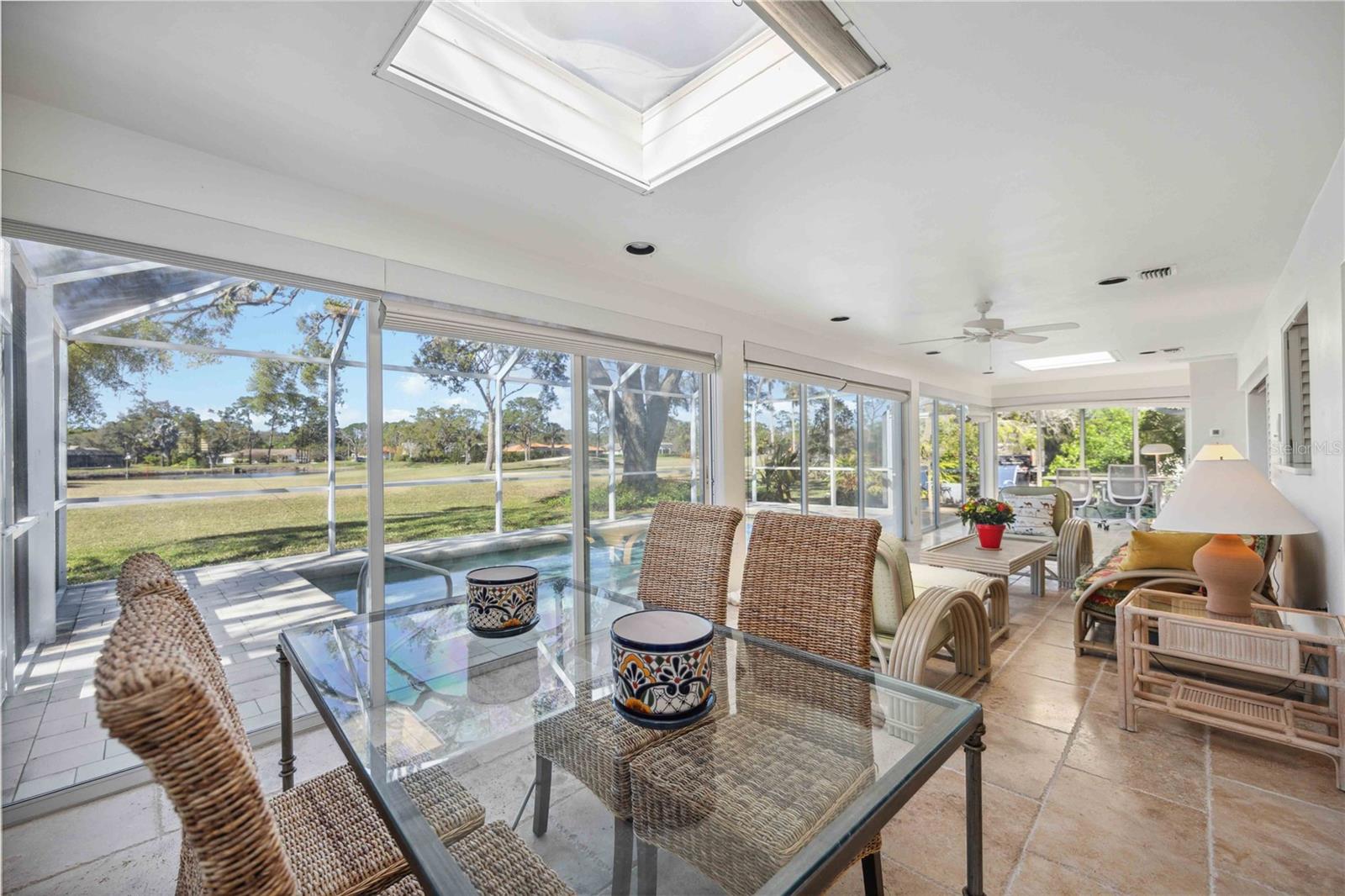 MASSIVE PRICE IMPROVEMENT! Priced UNDER market value... MOTIVATED SELLER. Live the Florida Lifestyle in The Meadows! Discover your private oasis with stunning golf course views overlooking the 2nd hole of The Highlands course in Sarasota's sought-after Meadows community. This light, bright, and beautifully updated home features a huge Florida room and a new pool cage with paver deck, perfect for relaxing afternoons or entertaining friends. Surrounded by giant oak trees and lush, mature landscaping, the setting is peaceful and serene. Inside, you'll love the new laminate flooring, giving the home a fresh and modern feel. The spacious layout includes multiple living areas and a garden spa tub in the master suite. The Meadows offers resort-style amenities, including a new state-of-the-art fitness center, pickleball courts, a Junior Olympic pool, and discounted greens fees on 36 holes of golf. Optional membership at The Meadows Country Club adds exclusive access to 17 Har-Tru tennis courts and a members-only golf course. Plus, with lots of social events, clubs, and activities, there's always something to enjoy. Just minutes to UTC shopping, Nathan Benderson Park, and downtown Sarasota. Furnishings are included but optional.