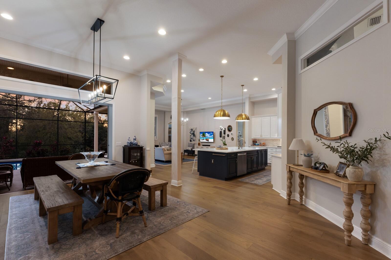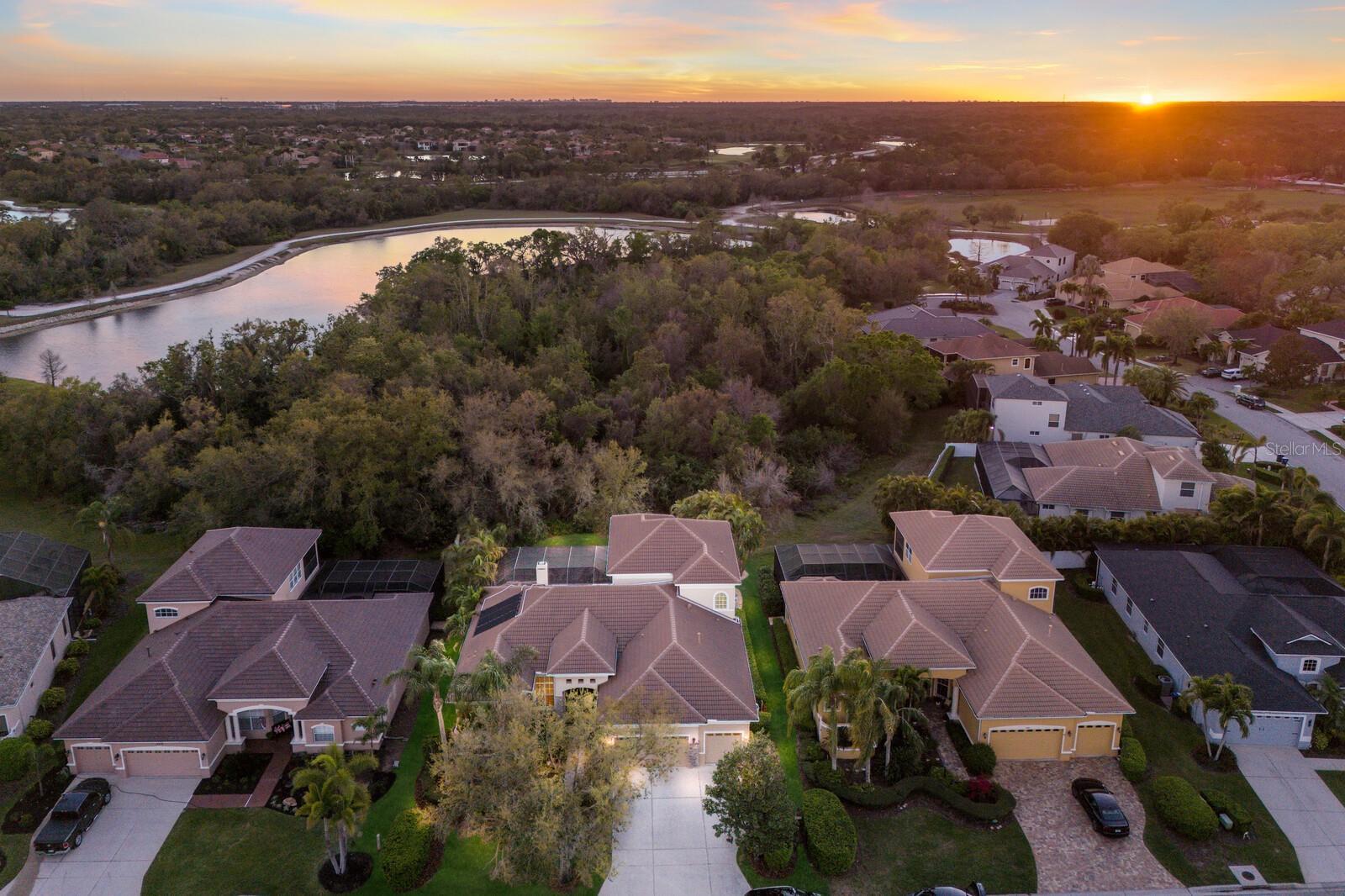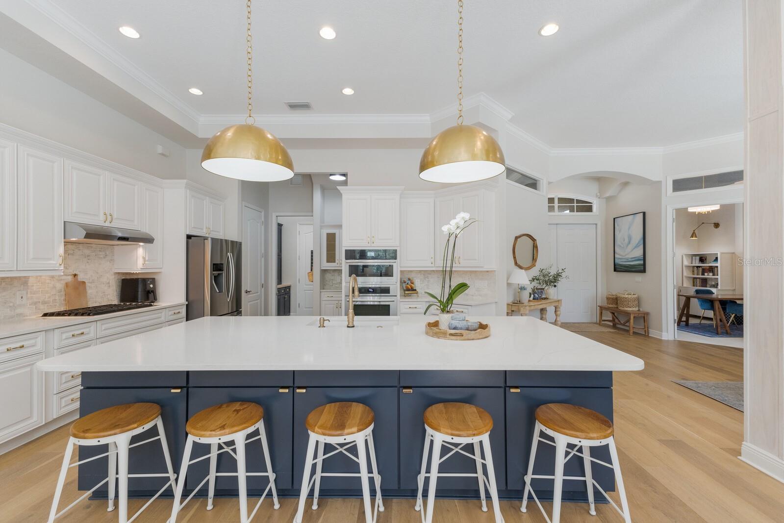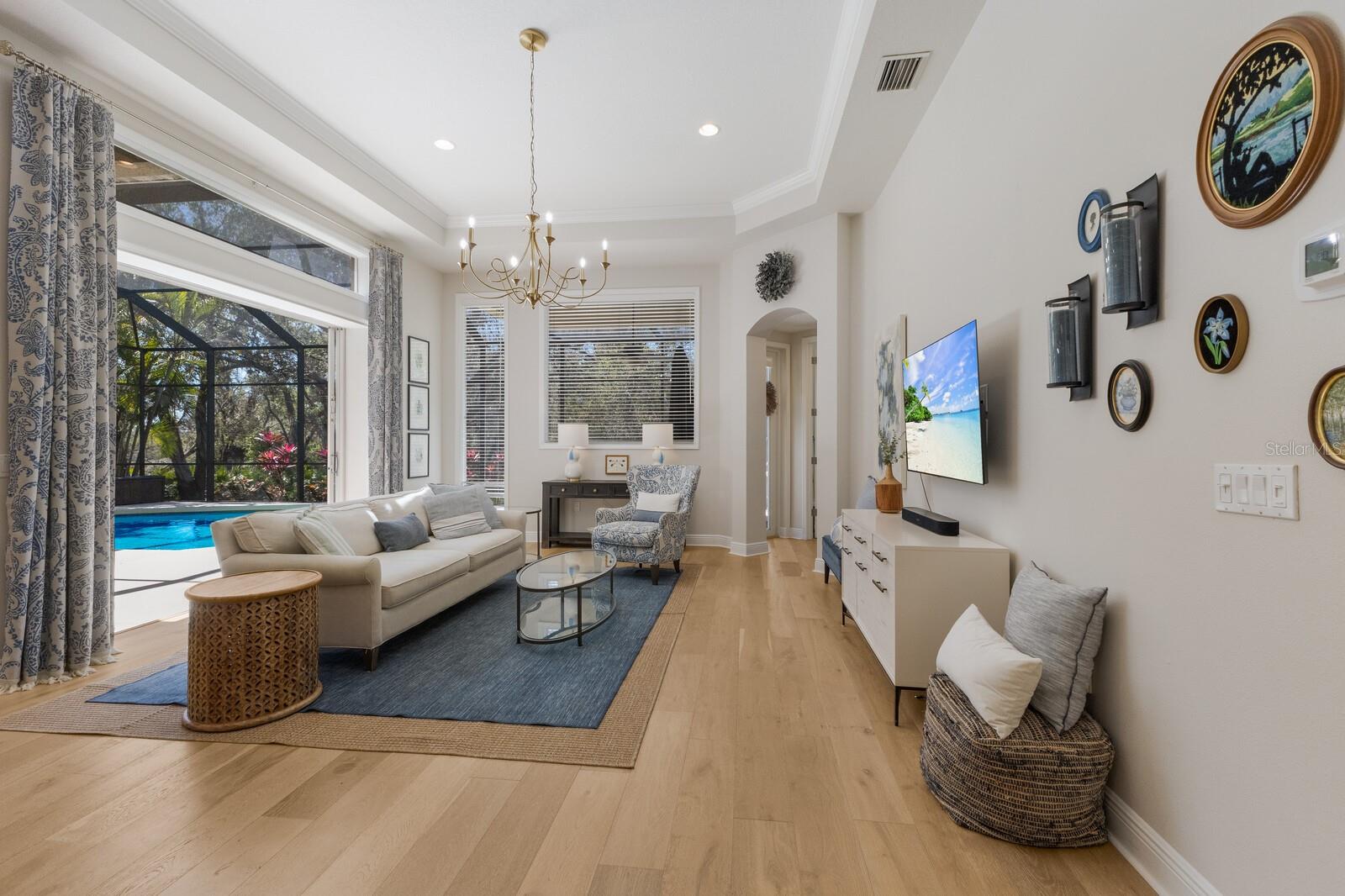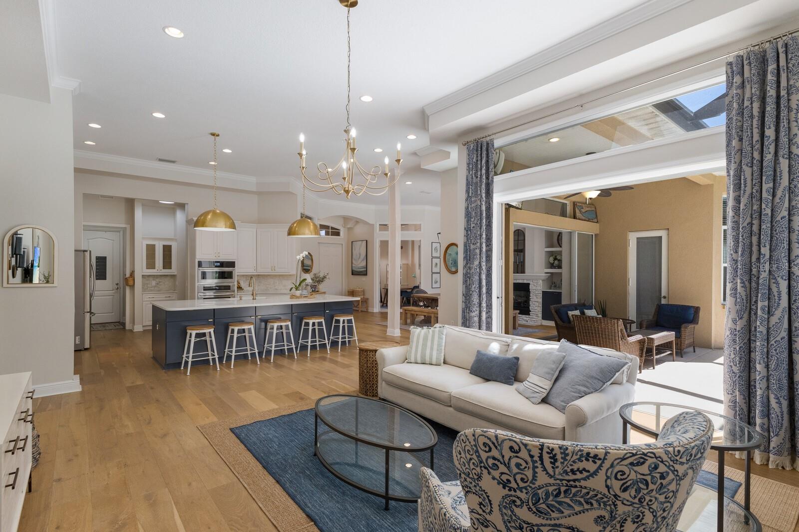 Nestled in the highly coveted Vistas section of Greenbrook, this meticulously designed residence offers an unparalleled blend of modern elegance and tranquil privacy. Built by Homes by Towne, this exceptional 5-bedroom, 4-bath home spans 3,795 square feet of beautifully renovated and refined living space. As you approach the property, you're greeted by striking curb appeal, including a tile roof, stacked stone accents, and lush, upgraded landscaping, which culminates in a grand double-entry door with a transom window. Inside, this home looks straight out of a design magazine, with fully remodeled main living spaces that have been thoughtfully opened up to provide an open, airy feel. Soaring ceilings, crown molding, white oak flooring and designer touches throughout create an atmosphere of timeless sophistication. The chef's kitchen is a standout feature, having been completely renovated and reconfigured to enhance both functionality and style. A large center island serves as the focal point, complemented by custom cabinetry finished in navy and white hues, gold hardware, stunning quartz countertops, and designer lighting. A true culinary haven, the kitchen seamlessly flows into the dining area, which boasts a gas fireplace framed by custom cabinetry and shelving. Oversized sliding glass doors with transom windows in both the living and dining rooms blur the lines between indoor and outdoor living, leading to the covered lanai and pool area -- perfect for enjoying the Florida lifestyle. The main level also houses the primary suite, a serene retreat designed for relaxation. With tray ceilings, crown molding, abundant natural light, and direct access to the lanai, this luxurious bedroom is a private sanctuary. The generous walk-in closet and spa-like en suite bathroom, featuring double vanities, a walk-in shower, soaking tub, and light cabinetry with stone countertops, complete the owner's retreat. Additionally, three well-appointed bedrooms and two full bathrooms on the main floor offer ample space for family and guests. Upstairs, you'll find a spacious bonus room, a 5th bedroom, and a 4th full bathroom, offering flexibility and comfort. A balcony overlooks the pool and preserve, providing an idyllic setting for morning coffee or evening relaxation. This upstairs area could serve as the perfect in-law suite, guest quarters or teen haven. The home's outdoor space is equally impressive, with a pool overlooking the majestic oak trees and preserve. A gas heater and solar panels, recently replaced in 2024, ensure year-round enjoyment. The lanai was freshly painted and sealed in 2025, further elevating the outdoor living experience. A true testament to modern luxury, this residence also includes a Pinterest-worthy laundry room and mudroom offering both style and practicality at every turn. Greenbrook is zoned for A-rated McNeal Elementary, Nolan Middle and Lakewood Ranch High School. Plus, it has a very low HOA fee of $115/year. Adventure Park is just around the corner which includes a playground, basketball court, baseball/soccer fields, sand volleyball court, in-link skate rink, dog park and more. Greenbrook's central Lakewood Ranch location means you are conveniently located to all that the area offers including countless community events, golfing, tennis, restaurants, shopping, and it's just a short drive to the world-famous beaches.