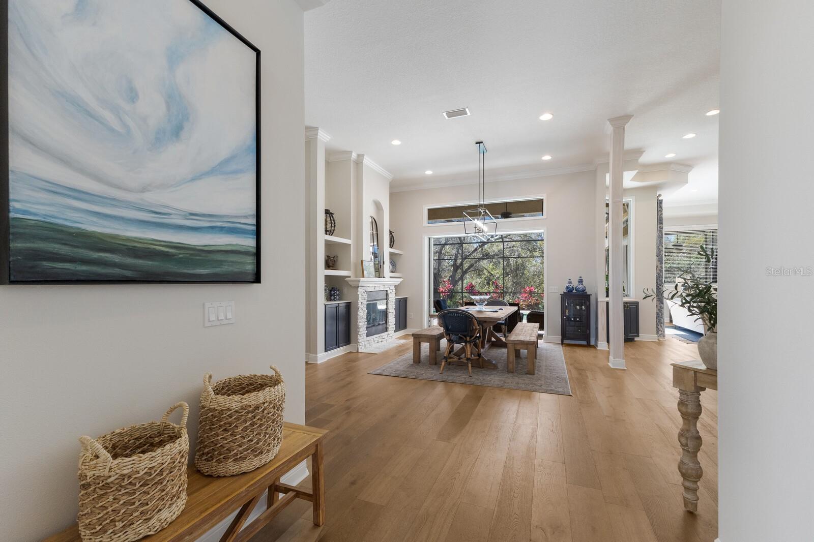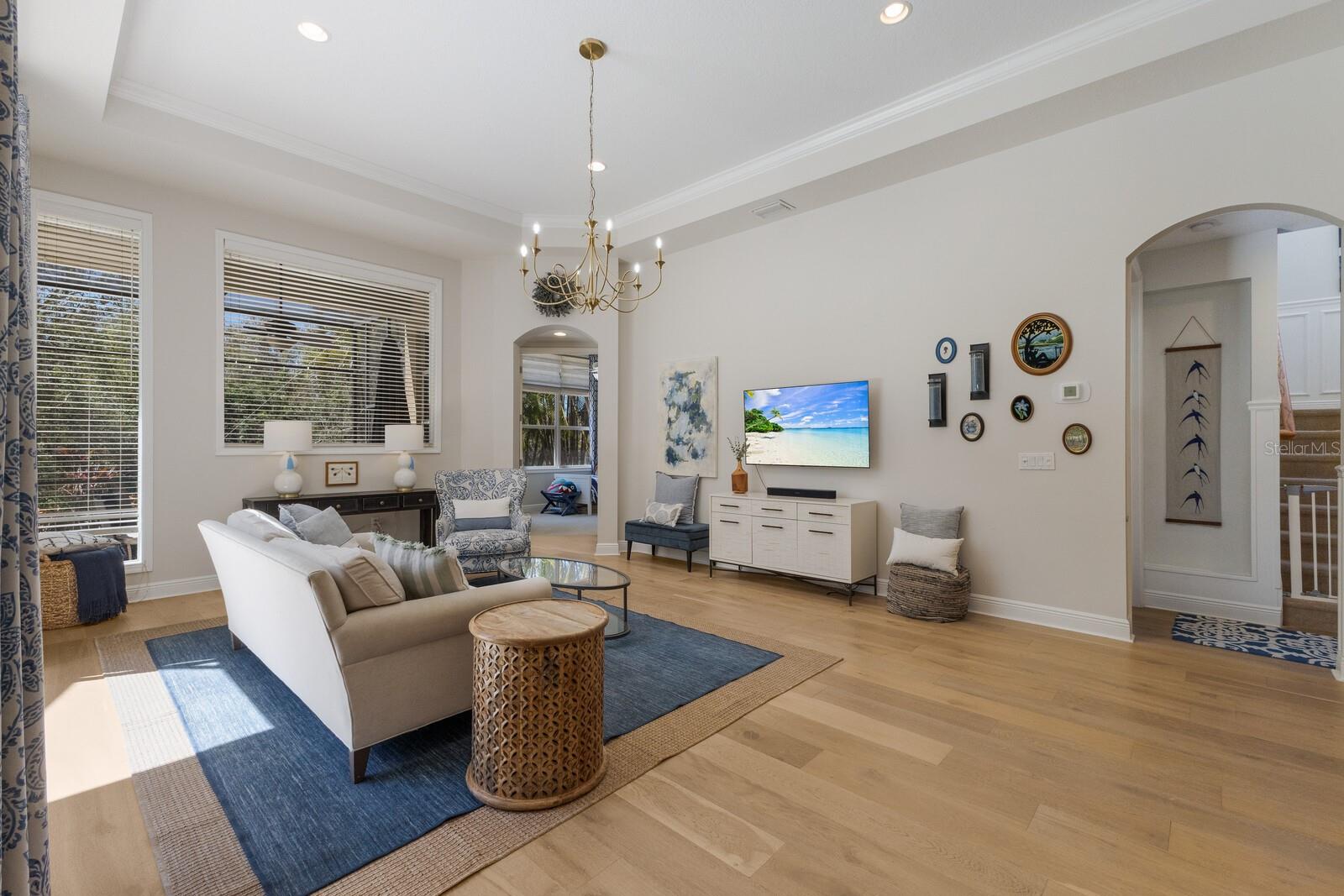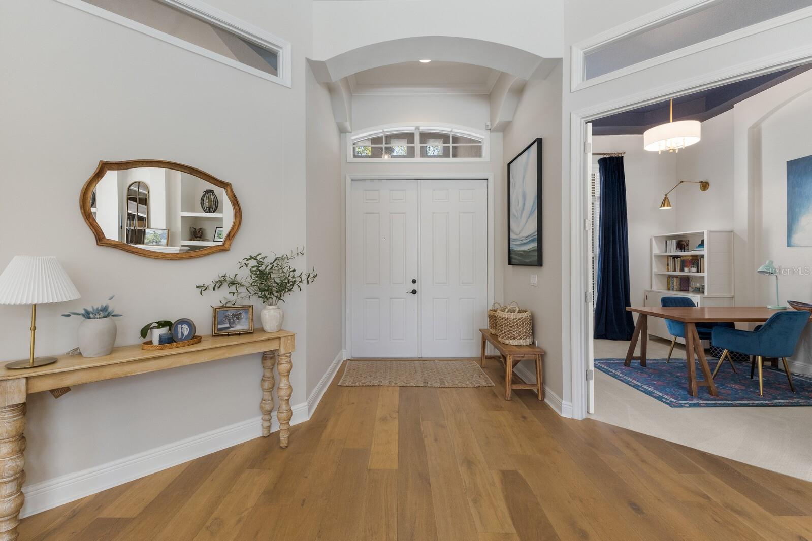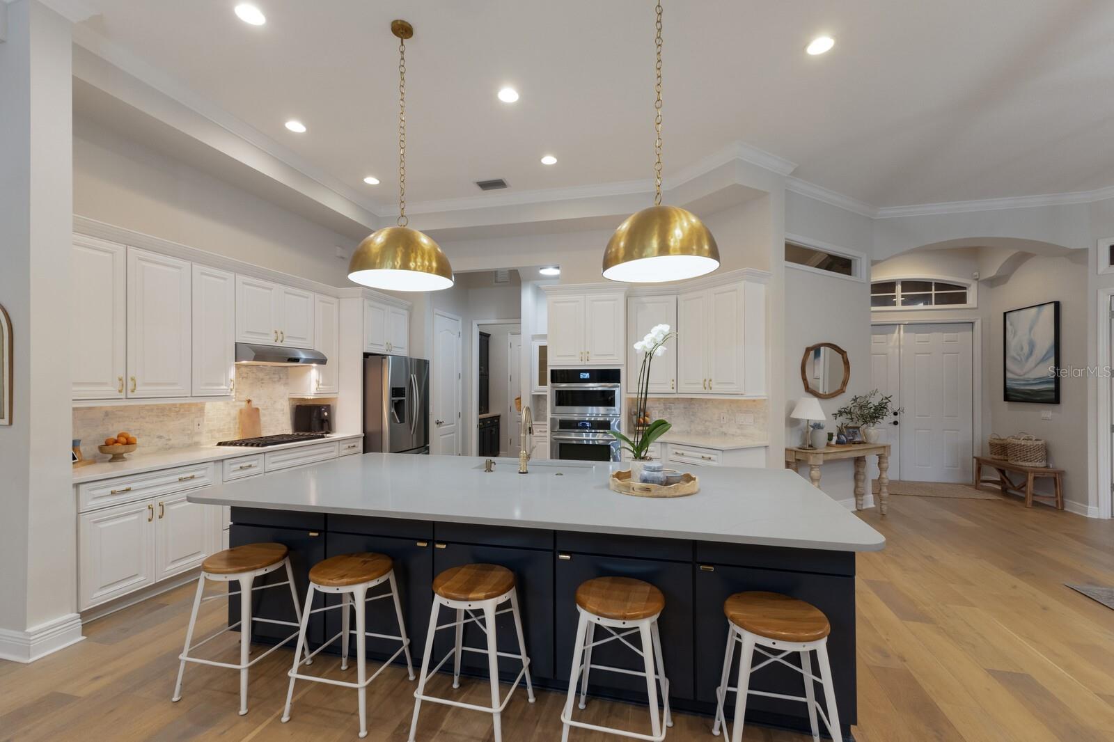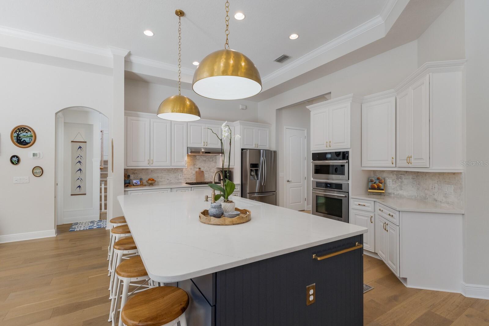 Nestled in the highly coveted Vistas section of Greenbrook, this meticulously designed residence offers an unparalleled blend of modern elegance and tranquil privacy. Built by Homes by Towne, this exceptional 5-bedroom, 4-bath home spans 3,795 square feet of beautifully renovated and refined living space. As you approach the property, you're greeted by striking curb appeal, including a tile roof, stacked stone accents, and lush, upgraded landscaping, which culminates in a grand double-entry door with a transom window. Inside, this home looks straight out of a design magazine, with fully remodeled main living spaces that have been thoughtfully opened up to provide an open, airy feel. Soaring ceilings, crown molding, white oak flooring and designer touches throughout create an atmosphere of timeless sophistication. The chef's kitchen is a standout feature, having been completely renovated and reconfigured to enhance both functionality and style. A large center island serves as the focal point, complemented by custom cabinetry finished in navy and white hues, gold hardware, stunning quartz countertops, and designer lighting. A true culinary haven, the kitchen seamlessly flows into the dining area, which boasts a gas fireplace framed by custom cabinetry and shelving. Oversized sliding glass doors with transom windows in both the living and dining rooms blur the lines between indoor and outdoor living, leading to the covered lanai and pool area -- perfect for enjoying the Florida lifestyle. The main level also houses the primary suite, a serene retreat designed for relaxation. With tray ceilings, crown molding, abundant natural light, and direct access to the lanai, this luxurious bedroom is a private sanctuary. The generous walk-in closet and spa-like en suite bathroom, featuring double vanities, a walk-in shower, soaking tub, and light cabinetry with stone countertops, complete the owner's retreat. Additionally, three well-appointed bedrooms and two full bathrooms on the main floor offer ample space for family and guests. Upstairs, you'll find a spacious bonus room, a 5th bedroom, and a 4th full bathroom, offering flexibility and comfort. A balcony overlooks the pool and preserve, providing an idyllic setting for morning coffee or evening relaxation. This upstairs area could serve as the perfect in-law suite, guest quarters or teen haven. The home's outdoor space is equally impressive, with a pool overlooking the majestic oak trees and preserve. A gas heater and solar panels, recently replaced in 2024, ensure year-round enjoyment. The lanai was freshly painted and sealed in 2025, further elevating the outdoor living experience. A true testament to modern luxury, this residence also includes a Pinterest-worthy laundry room and mudroom offering both style and practicality at every turn. Greenbrook is zoned for A-rated McNeal Elementary, Nolan Middle and Lakewood Ranch High School. Plus, it has a very low HOA fee of $115/year. Adventure Park is just around the corner which includes a playground, basketball court, baseball/soccer fields, sand volleyball court, in-link skate rink, dog park and more. Greenbrook's central Lakewood Ranch location means you are conveniently located to all that the area offers including countless community events, golfing, tennis, restaurants, shopping, and it's just a short drive to the world-famous beaches.