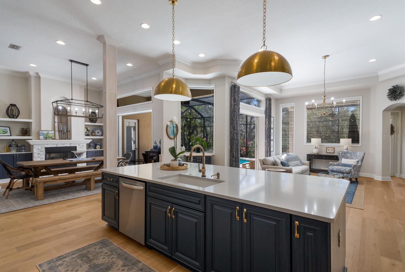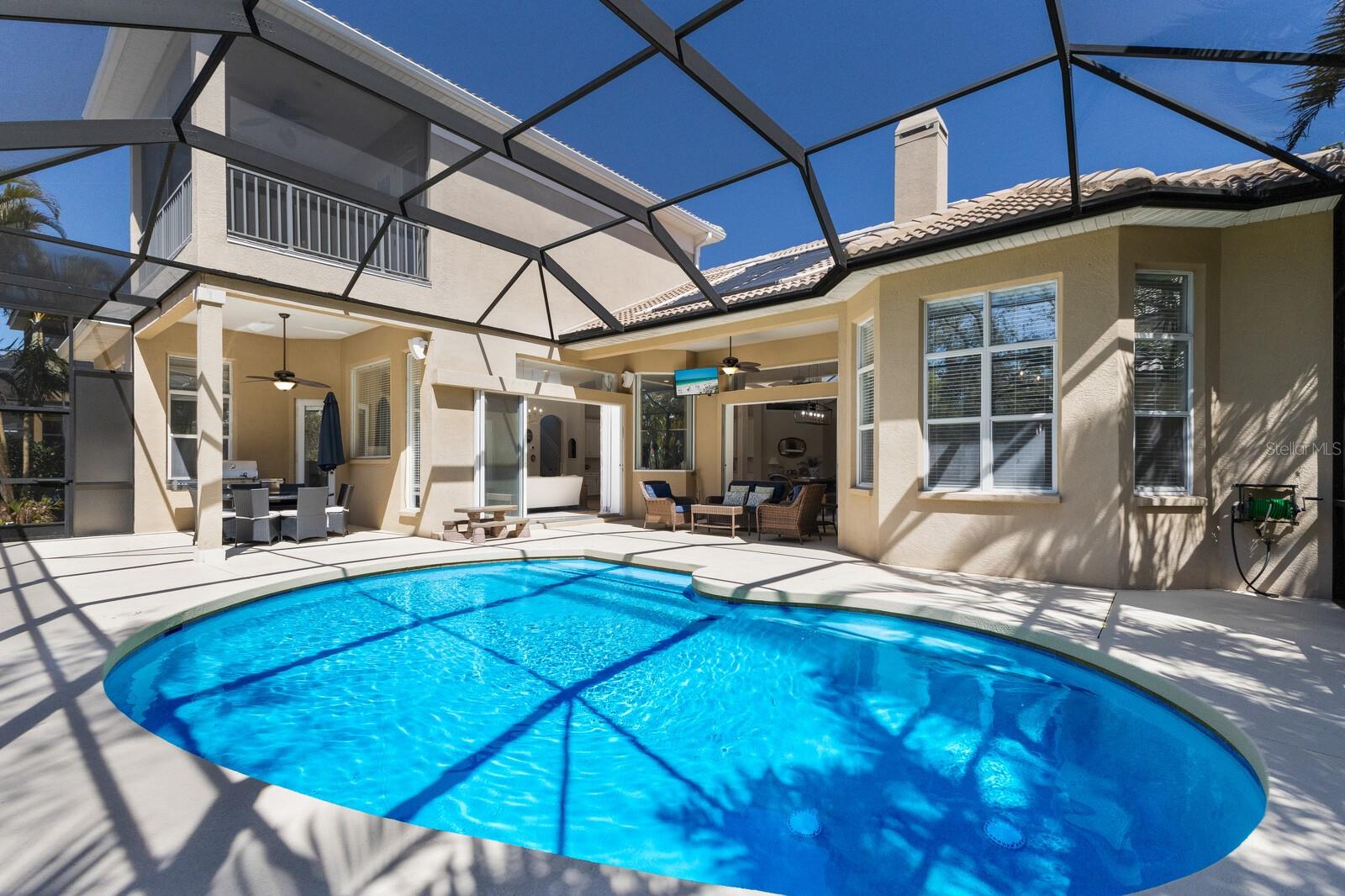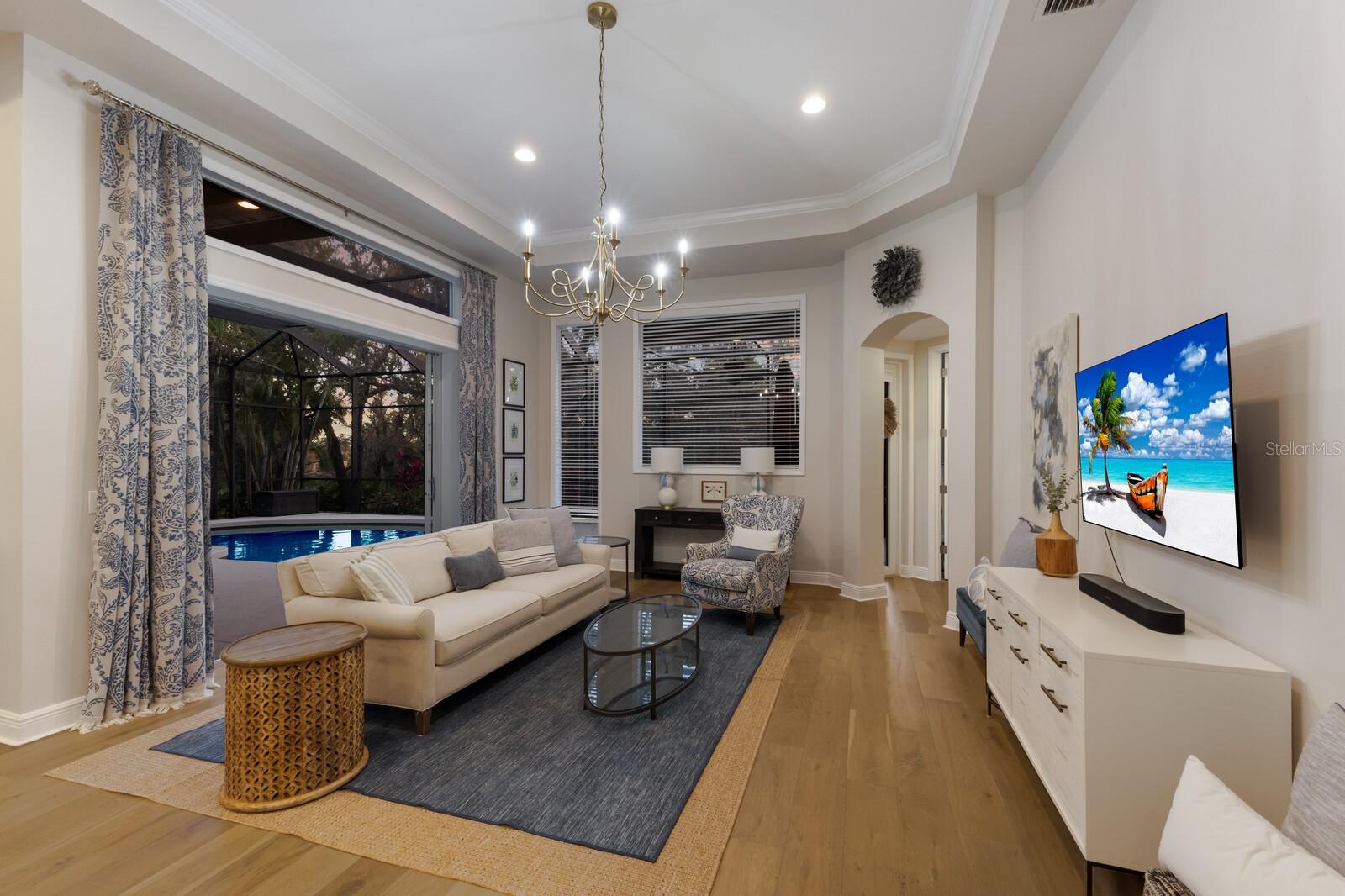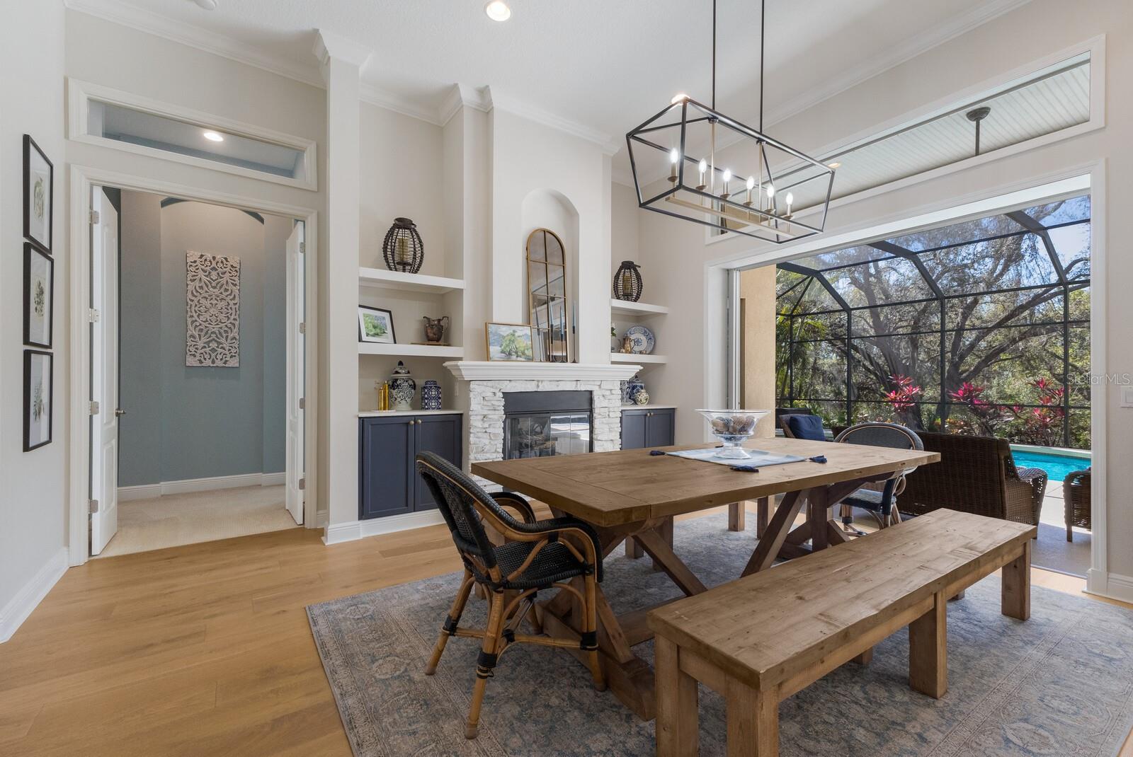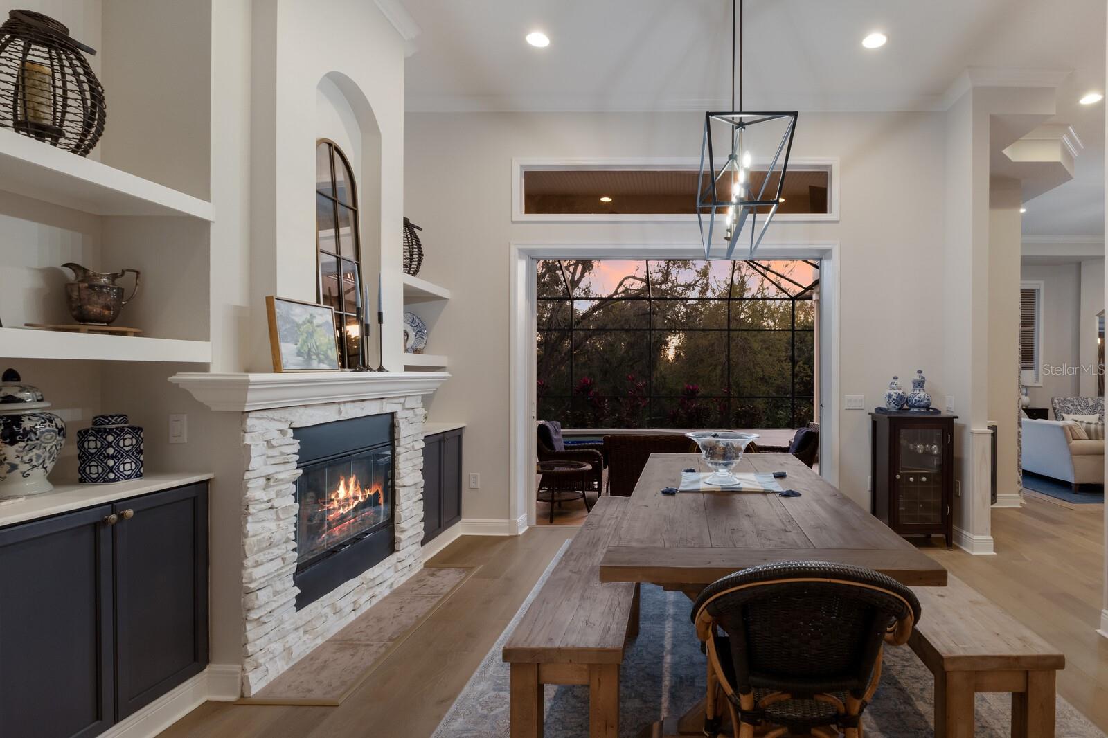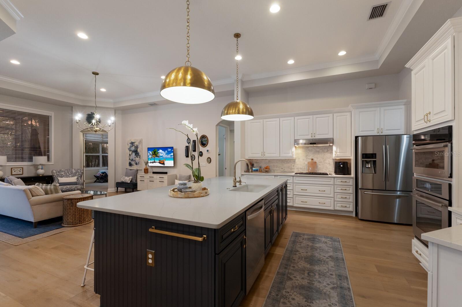 Nestled in the highly coveted Vistas section of Greenbrook, this meticulously designed residence offers an unparalleled blend of modern elegance and tranquil privacy. Built by Homes by Towne, this exceptional 5-bedroom, 4-bath home spans 3,795 square feet of beautifully renovated and refined living space. As you approach the property, you're greeted by striking curb appeal, including a tile roof, stacked stone accents, and lush, upgraded landscaping, which culminates in a grand double-entry door with a transom window. Inside, this home looks straight out of a design magazine, with fully remodeled main living spaces that have been thoughtfully opened up to provide an open, airy feel. Soaring ceilings, crown molding, white oak flooring and designer touches throughout create an atmosphere of timeless sophistication. The chef's kitchen is a standout feature, having been completely renovated and reconfigured to enhance both functionality and style. A large center island serves as the focal point, complemented by custom cabinetry finished in navy and white hues, gold hardware, stunning quartz countertops, and designer lighting. A true culinary haven, the kitchen seamlessly flows into the dining area, which boasts a gas fireplace framed by custom cabinetry and shelving. Oversized sliding glass doors with transom windows in both the living and dining rooms blur the lines between indoor and outdoor living, leading to the covered lanai and pool area -- perfect for enjoying the Florida lifestyle. The main level also houses the primary suite, a serene retreat designed for relaxation. With tray ceilings, crown molding, abundant natural light, and direct access to the lanai, this luxurious bedroom is a private sanctuary. The generous walk-in closet and spa-like en suite bathroom, featuring double vanities, a walk-in shower, soaking tub, and light cabinetry with stone countertops, complete the owner's retreat. Additionally, three well-appointed bedrooms and two full bathrooms on the main floor offer ample space for family and guests. Upstairs, you'll find a spacious bonus room, a 5th bedroom, and a 4th full bathroom, offering flexibility and comfort. A balcony overlooks the pool and preserve, providing an idyllic setting for morning coffee or evening relaxation. This upstairs area could serve as the perfect in-law suite, guest quarters or teen haven. The home's outdoor space is equally impressive, with a pool overlooking the majestic oak trees and preserve. A gas heater and solar panels, recently replaced in 2024, ensure year-round enjoyment. The lanai was freshly painted and sealed in 2025, further elevating the outdoor living experience. A true testament to modern luxury, this residence also includes a Pinterest-worthy laundry room and mudroom offering both style and practicality at every turn. Greenbrook is zoned for A-rated McNeal Elementary, Nolan Middle and Lakewood Ranch High School. Plus, it has a very low HOA fee of $115/year. Adventure Park is just around the corner which includes a playground, basketball court, baseball/soccer fields, sand volleyball court, in-link skate rink, dog park and more. Greenbrook's central Lakewood Ranch location means you are conveniently located to all that the area offers including countless community events, golfing, tennis, restaurants, shopping, and it's just a short drive to the world-famous beaches.