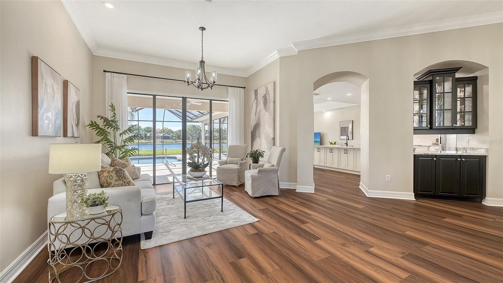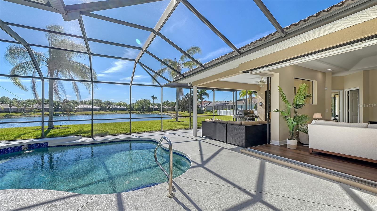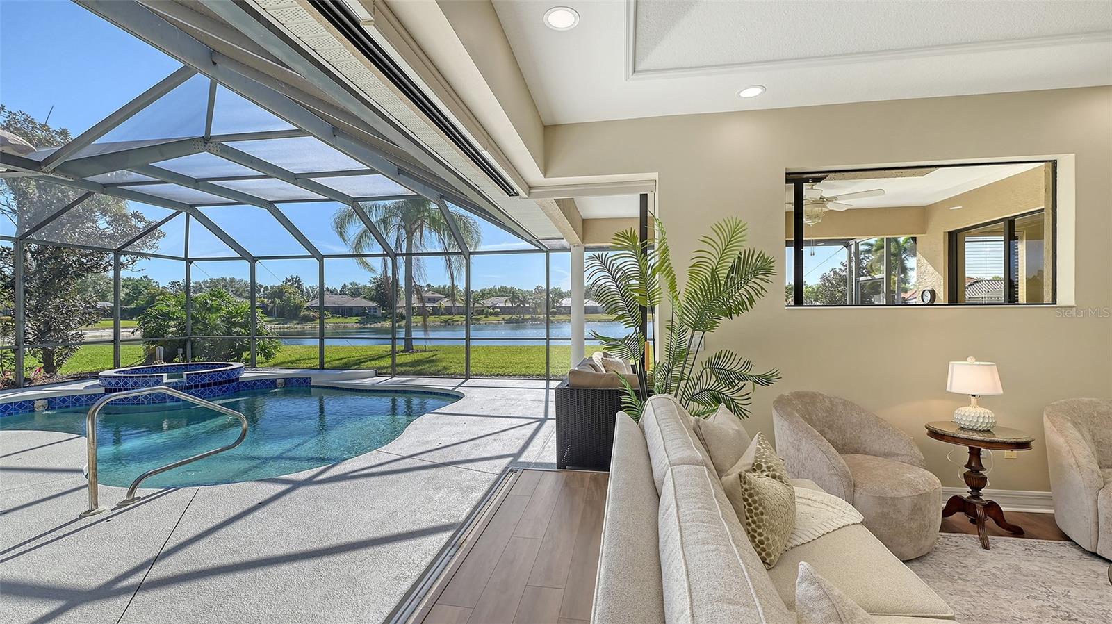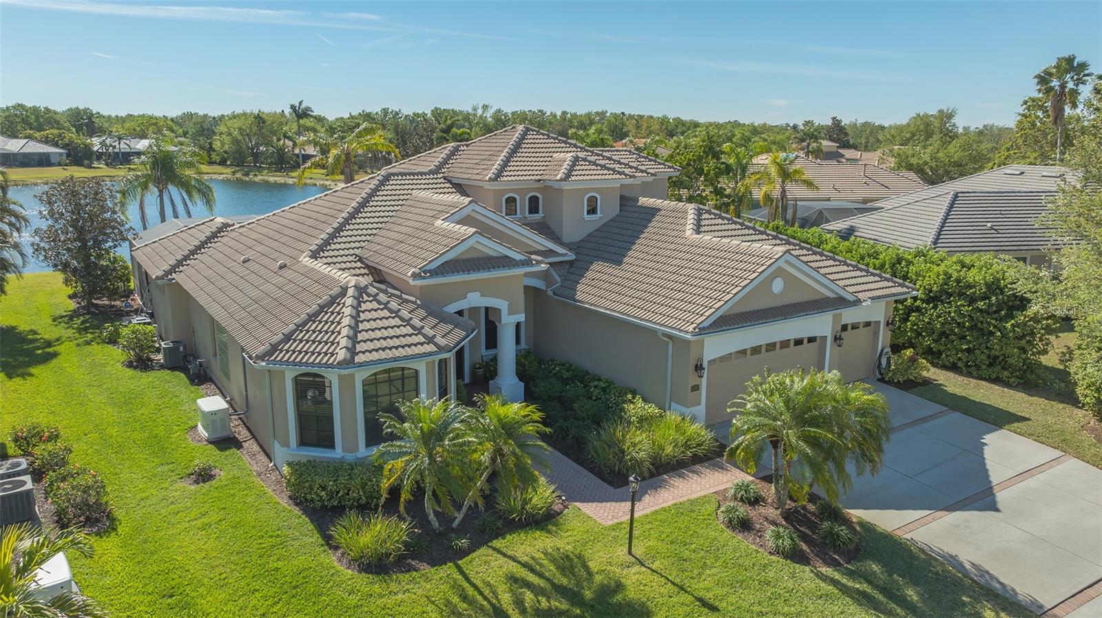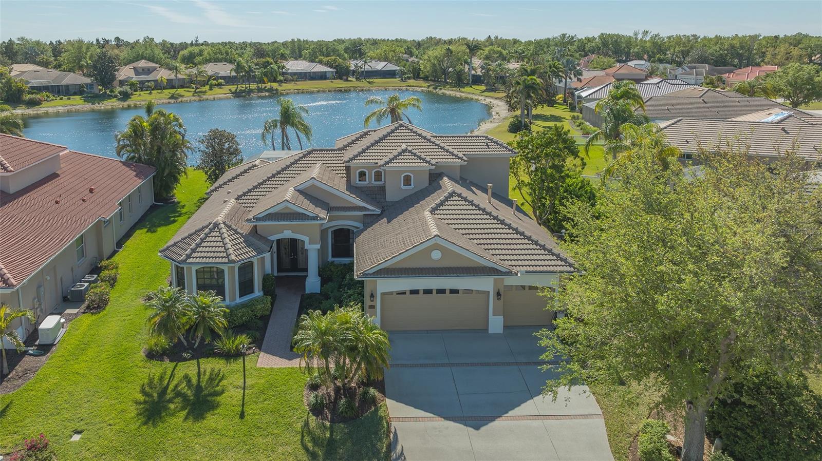 Welcome to this beautifully remodeled and move-in-ready Lee Wetherington home, perfectly nestled in the heart of Lakewood Ranch. Enjoy breathtaking and private views of the serene lake from this thoughtfully updated residence.Boasting five bedrooms, four full baths, and multiple living spaces, this home is designed for both comfort and versatility. The expansive floor plan includes a formal dining room, butler's bar, executive office, and a flexible upstairs fifth bedroom--ideal as a bonus room, guest retreat, or in-law suite with a full bath.The gourmet kitchen has been completely renovated, featuring high-grade granite countertops, a stylish tile backsplash, stainless steel appliances (including range hood, 6-burner gas range, refrigerator, dishwasher, and an in-cabinet microwave), and an oversized island with storage and seating. The stunning soft-close wood cabinetry and large walk-in pantry complete this chef's dream.The primary suite is a true sanctuary with two custom walk-in closets, a cozy sitting area, private lanai access, and a completed renovated, spa-inspired bathroom featuring separate vanities, a walk-in shower, and a soaking tub.Step outside to your peaceful oasis with an expansive lanai with a heated pool and spa, where you can relax and take in the stunning lake views--perfect for entertaining and embracing the Florida lifestyle.Additional upgrades include: new whole-house generator, new luxury vinyl flooring throughout (no carpet!), new light fixtures, ceiling fans, and LED lighting, exquisite crown molding & tray ceilings, fresh interior paint, and a well-appointed laundry room with utility sink and cabinetry.Located in Riverwalk Ridge, a hidden gem of Lakewood Ranch, this home is within an A-rated school district and just minutes from Lakewood Ranch Main Street, Waterside Place, UTC Mall, downtown Sarasota, three airports, and world-famous beaches including Siesta Key, Lido Key, Longboat Key, and Anna Maria Island.This exceptional home won't last long--schedule your private showing today!