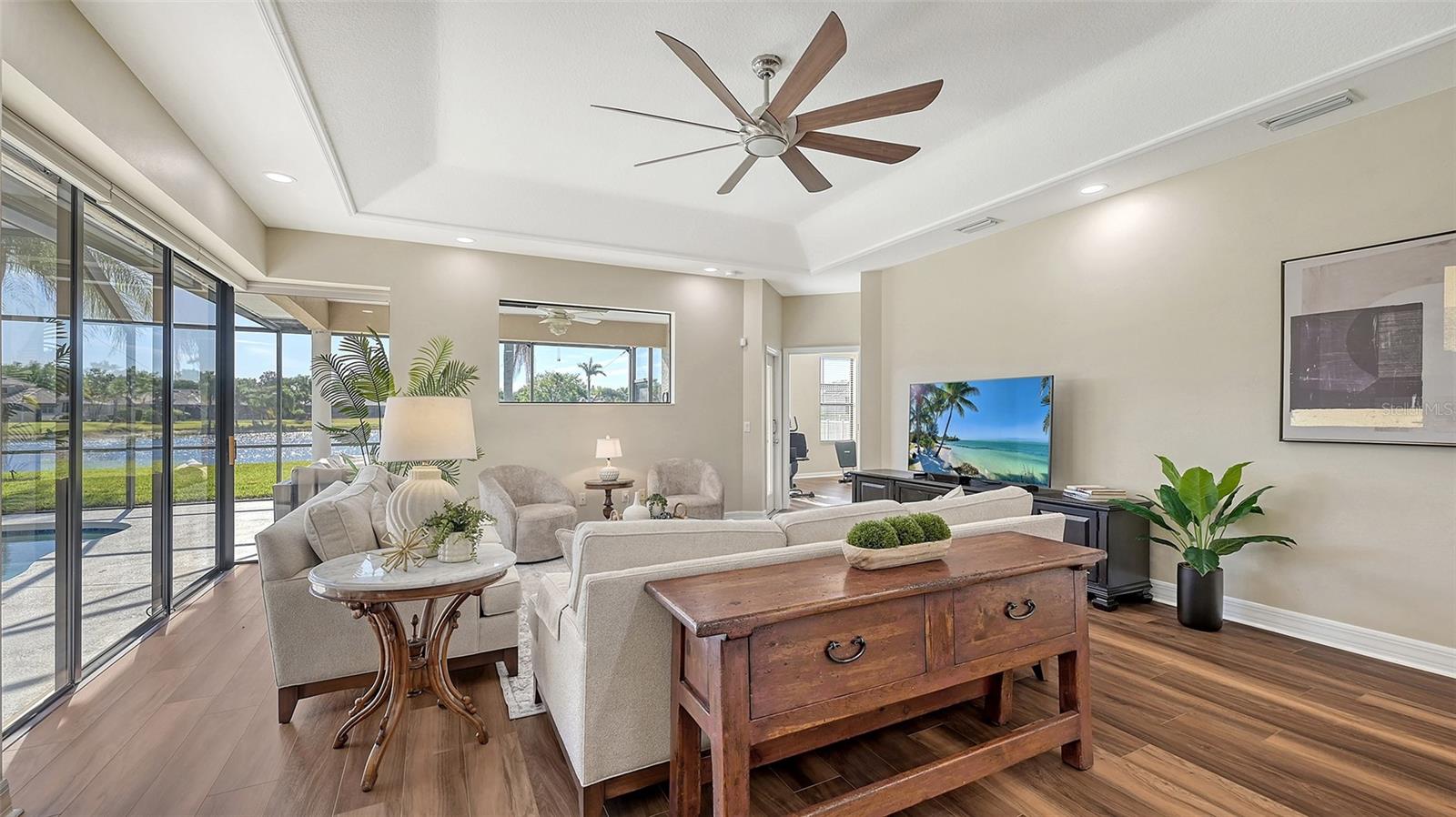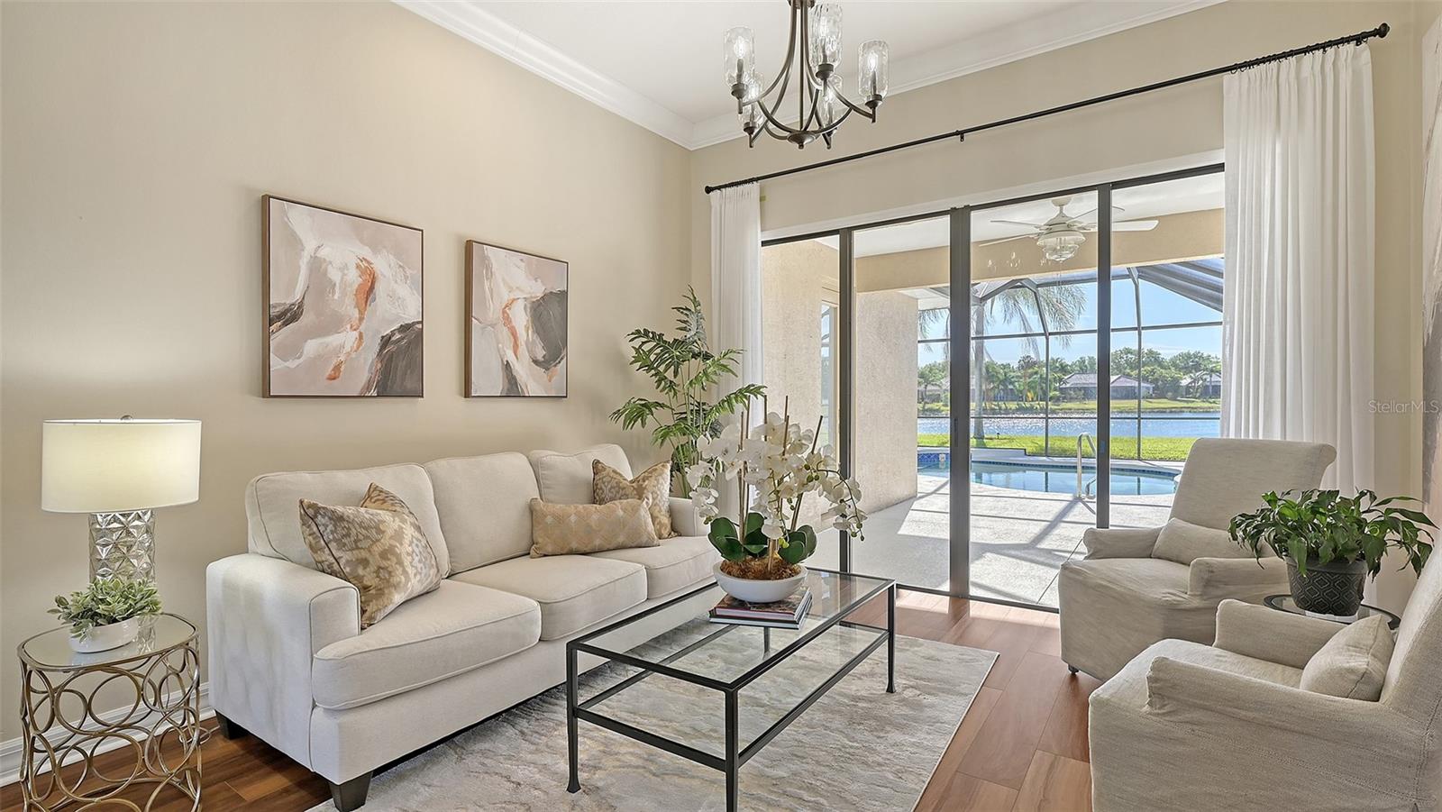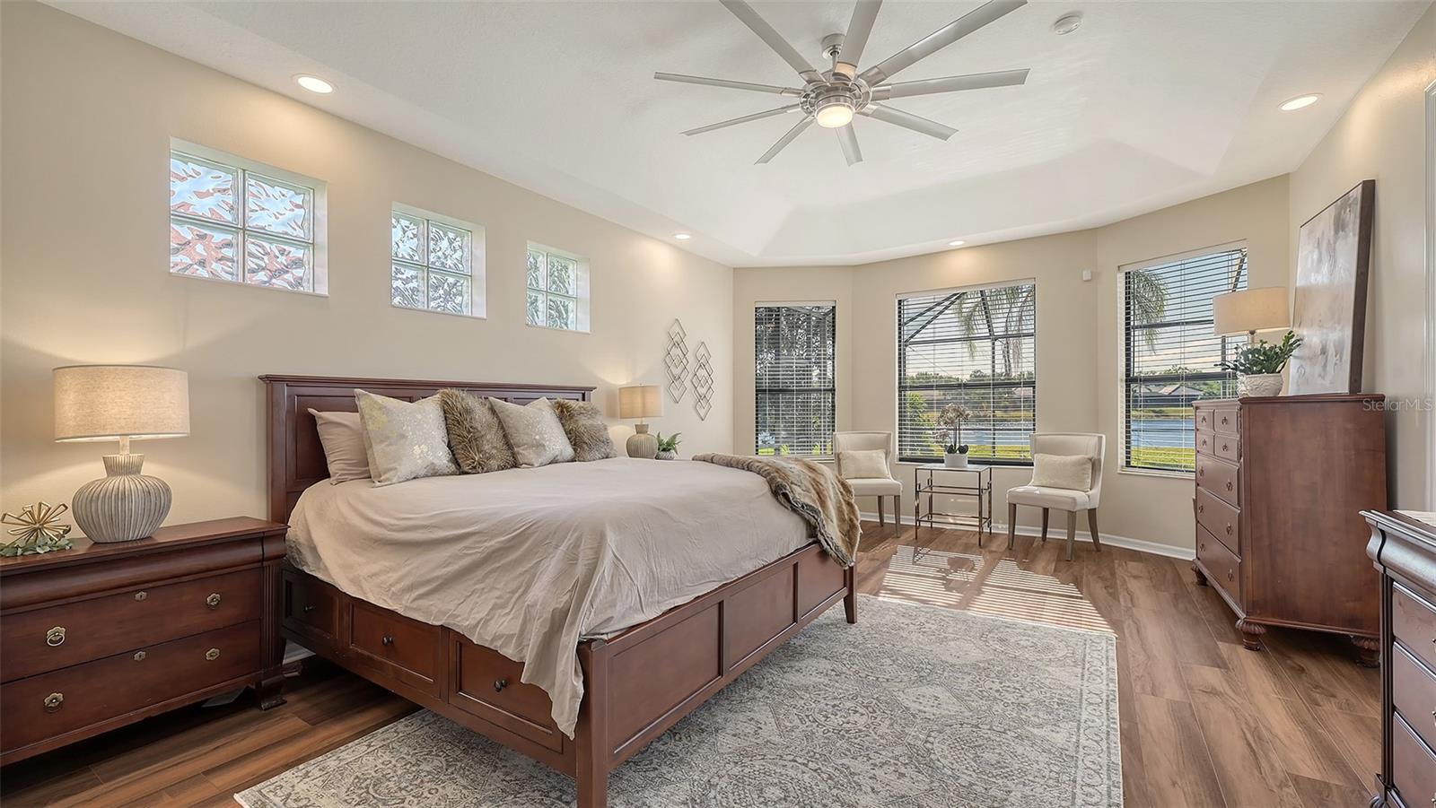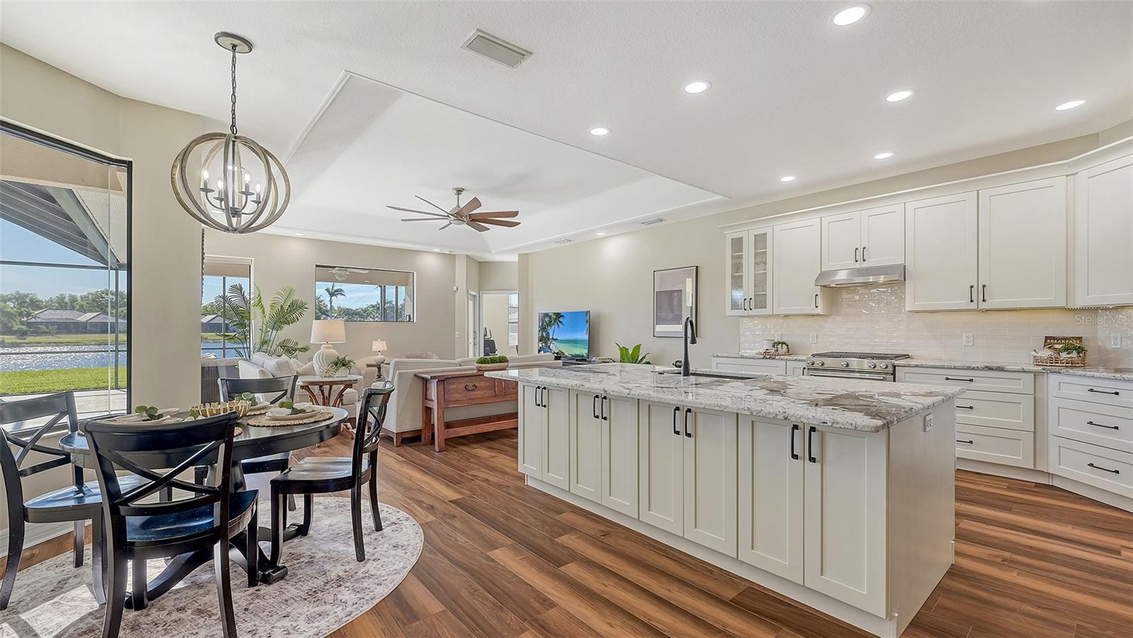Welcome to this beautifully remodeled and move-in-ready Lee Wetherington home, perfectly nestled in the heart of Lakewood Ranch. Enjoy breathtaking and private views of the serene lake from this thoughtfully updated residence.Boasting five bedrooms, four full baths, and multiple living spaces, this home is designed for both comfort and versatility. The expansive floor plan includes a formal dining room, butler's bar, executive office, and a flexible upstairs fifth bedroom--ideal as a bonus room, guest retreat, or in-law suite with a full bath.The gourmet kitchen has been completely renovated, featuring high-grade granite countertops, a stylish tile backsplash, stainless steel appliances (including range hood, 6-burner gas range, refrigerator, dishwasher, and an in-cabinet microwave), and an oversized island with storage and seating. The stunning soft-close wood cabinetry and large walk-in pantry complete this chef's dream.The primary suite is a true sanctuary with two custom walk-in closets, a cozy sitting area, private lanai access, and a completed renovated, spa-inspired bathroom featuring separate vanities, a walk-in shower, and a soaking tub.Step outside to your peaceful oasis with an expansive lanai with a heated pool and spa, where you can relax and take in the stunning lake views--perfect for entertaining and embracing the Florida lifestyle.Additional upgrades include: new whole-house generator, new luxury vinyl flooring throughout (no carpet!), new light fixtures, ceiling fans, and LED lighting, exquisite crown molding & tray ceilings, fresh interior paint, and a well-appointed laundry room with utility sink and cabinetry.Located in Riverwalk Ridge, a hidden gem of Lakewood Ranch, this home is within an A-rated school district and just minutes from Lakewood Ranch Main Street, Waterside Place, UTC Mall, downtown Sarasota, three airports, and world-famous beaches including Siesta Key, Lido Key, Longboat Key, and Anna Maria Island.This exceptional home won't last long--schedule your private showing today!