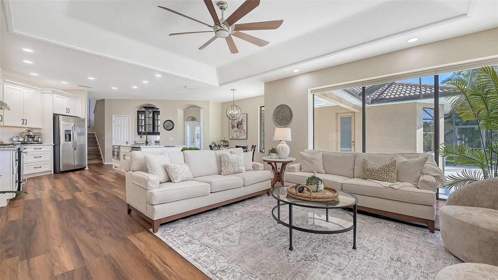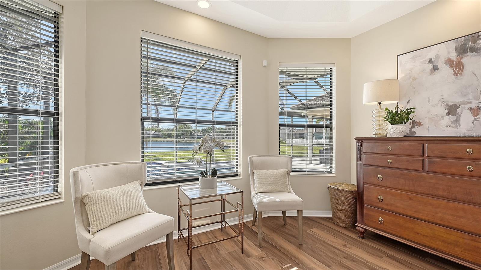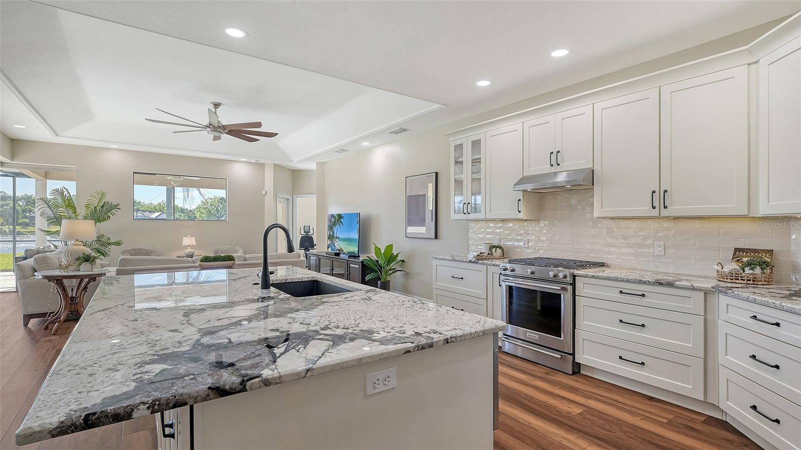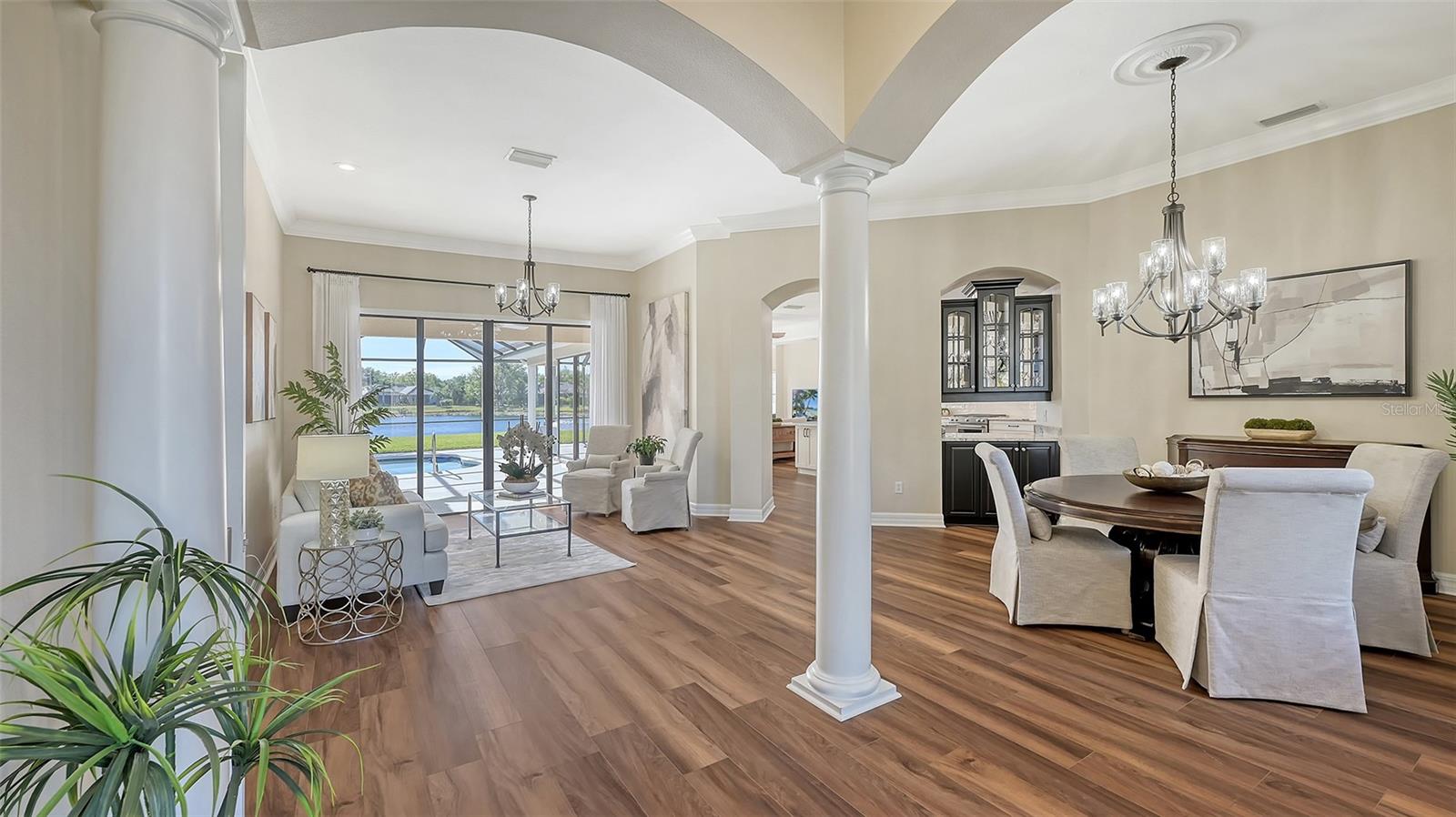 Welcome to this beautifully remodeled and move-in-ready Lee Wetherington home, perfectly nestled in the heart of Lakewood Ranch. Enjoy breathtaking and private views of the serene lake from this thoughtfully updated residence.Boasting five bedrooms, four full baths, and multiple living spaces, this home is designed for both comfort and versatility. The expansive floor plan includes a formal dining room, butler's bar, executive office, and a flexible upstairs fifth bedroom--ideal as a bonus room, guest retreat, or in-law suite with a full bath.The gourmet kitchen has been completely renovated, featuring high-grade granite countertops, a stylish tile backsplash, stainless steel appliances (including range hood, 6-burner gas range, refrigerator, dishwasher, and an in-cabinet microwave), and an oversized island with storage and seating. The stunning soft-close wood cabinetry and large walk-in pantry complete this chef's dream.The primary suite is a true sanctuary with two custom walk-in closets, a cozy sitting area, private lanai access, and a completed renovated, spa-inspired bathroom featuring separate vanities, a walk-in shower, and a soaking tub.Step outside to your peaceful oasis with an expansive lanai with a heated pool and spa, where you can relax and take in the stunning lake views--perfect for entertaining and embracing the Florida lifestyle.Additional upgrades include: new whole-house generator, new luxury vinyl flooring throughout (no carpet!), new light fixtures, ceiling fans, and LED lighting, exquisite crown molding & tray ceilings, fresh interior paint, and a well-appointed laundry room with utility sink and cabinetry.Located in Riverwalk Ridge, a hidden gem of Lakewood Ranch, this home is within an A-rated school district and just minutes from Lakewood Ranch Main Street, Waterside Place, UTC Mall, downtown Sarasota, three airports, and world-famous beaches including Siesta Key, Lido Key, Longboat Key, and Anna Maria Island.This exceptional home won't last long--schedule your private showing today!