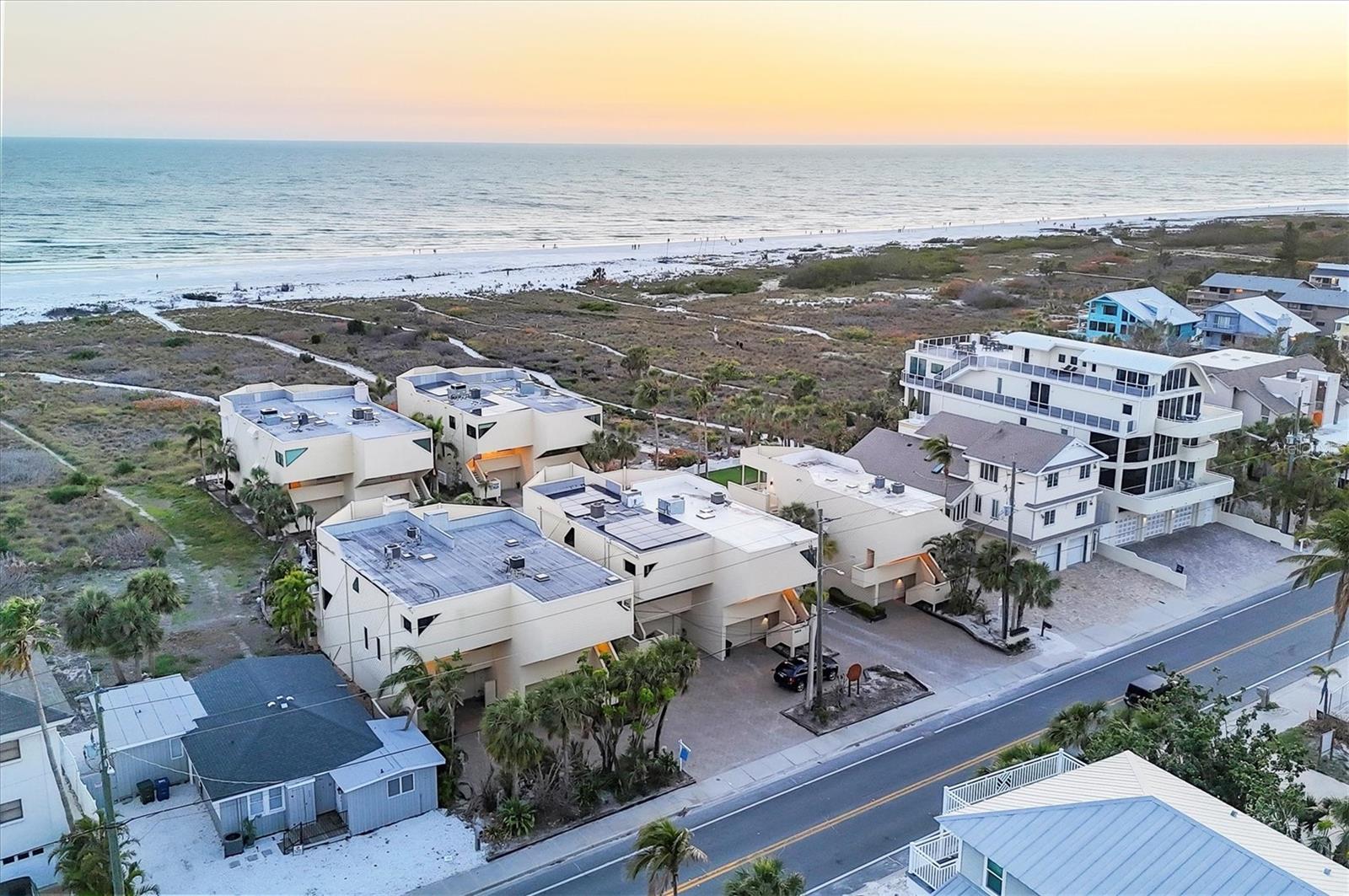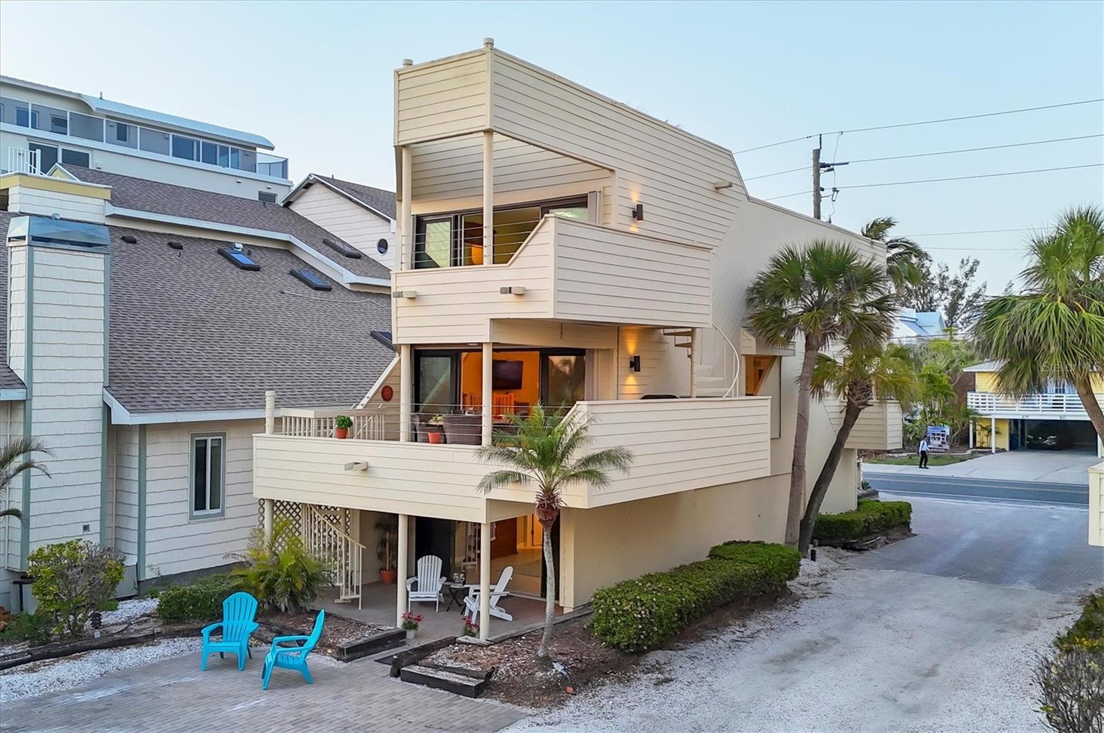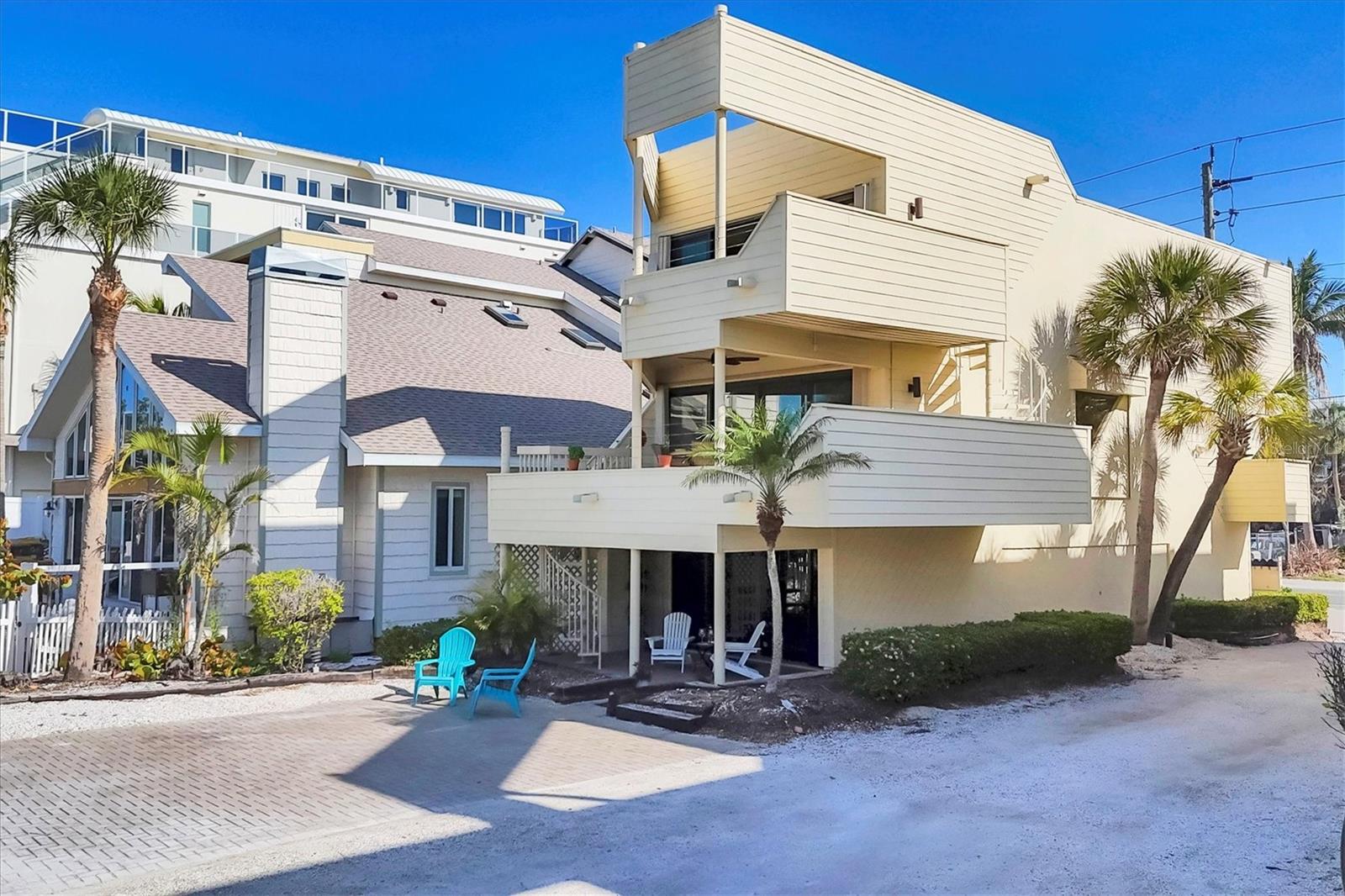 A beachfront home for the price of a condo. 540 Beach Road on Siesta Key is a three-story standalone Gulf front residence with private beach access and breathtaking views directly on famed Siesta Key Beach. Privacy and exclusivity await at Tiffany Sands, an enclave of only 9 units. With expansive Gulf views from the moment you open the front door, 540 Beach Road is a detached single-family condo overlooking the sandy shores of the #1 beach in America. This meticulously maintained 2 bedroom, 3 bath home features a bonus cabana room and one-car attached garage. With pride of ownership and nearly 1,900 sq ft under air, this maintenance-free standalone villa features private beach access. Every floor boasts floor-to-ceiling sliding glass doors and expansive terraces with stunning unobstructed views of the shimmering shores of the Gulf. With just over 3,000 sq ft total combined living space, the light-filled, open-plan main level consists of a recently remodeled kitchen, half bath, living room and dining area. 16' newly installed sliding glass doors provide access to the main covered deck, a great spot for your morning coffee and perfect for entertaining or relaxing as you revel at the majestic views of the beach and stunning sunsets. On the upper floor you will find 2 large en-suite bedrooms with private, newly updated full baths. The main suite has spectacular views with floor-to-ceiling sliding glass doors that open to a private deck, the perfect spot for sunning or reading a book. Main suite has 3 large closets and an oversized bathroom with double vanities and skylights. The 2nd bedroom features a cozy deck with sliders and a private bath with skylight. On the upper floor you will find a large laundry closet with new washer & dryer. The downstairs cabana room is complete with full bath and storage, floor-to-ceiling sliders and a covered patio with direct access to the beach. 540 Beach comes with private parking for 5 cars and additional guest parking. 540 Beach is situated precisely one-half mile to the heart of Siesta Key Village and a half mile to world renowned Siesta Key Public Beach. You have the option to make this your forever home or a lucrative vacation rental, as the present owners enjoy months of using the residence for their personal pleasure and rent it for a portion of the year, garnering substantial rental income. Home is equipped with 2 A/C units- one of which is BRAND NEW, new sliders on the upper levels, new hot water heater and storm shutters. 15+ years remain on the roof warranty. A one-of-a-kind property, 540 Beach is a private beachfront residence that feels like a home but is priced like a condo. Available turnkey furnished.