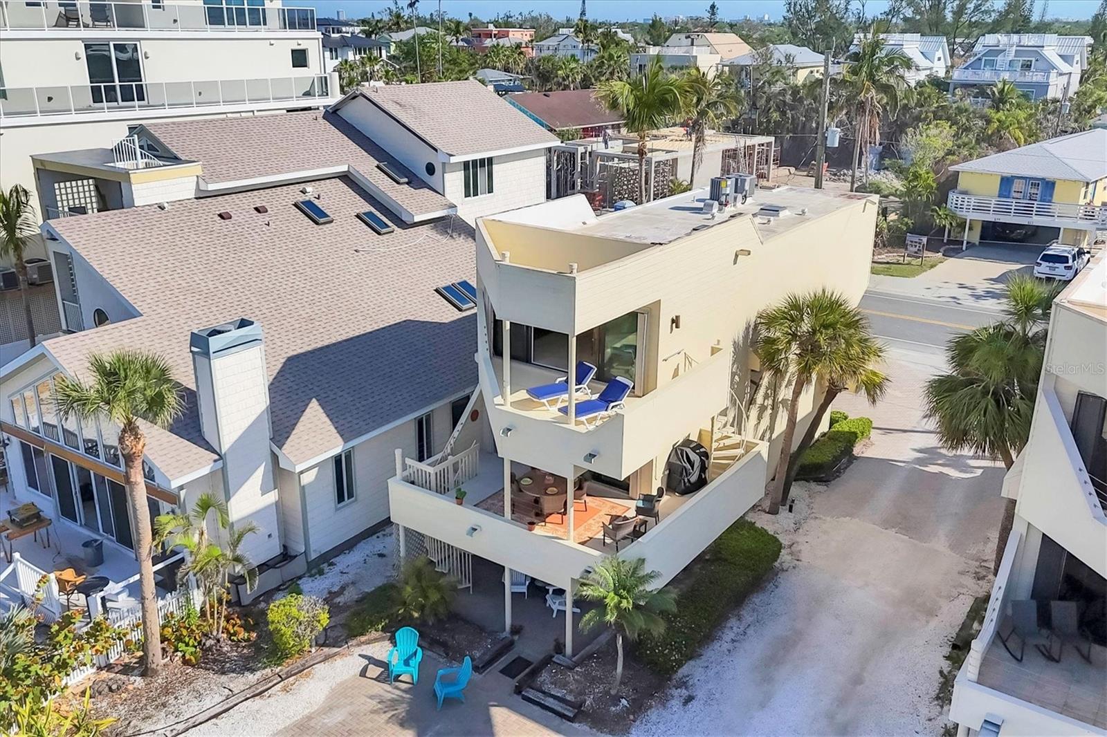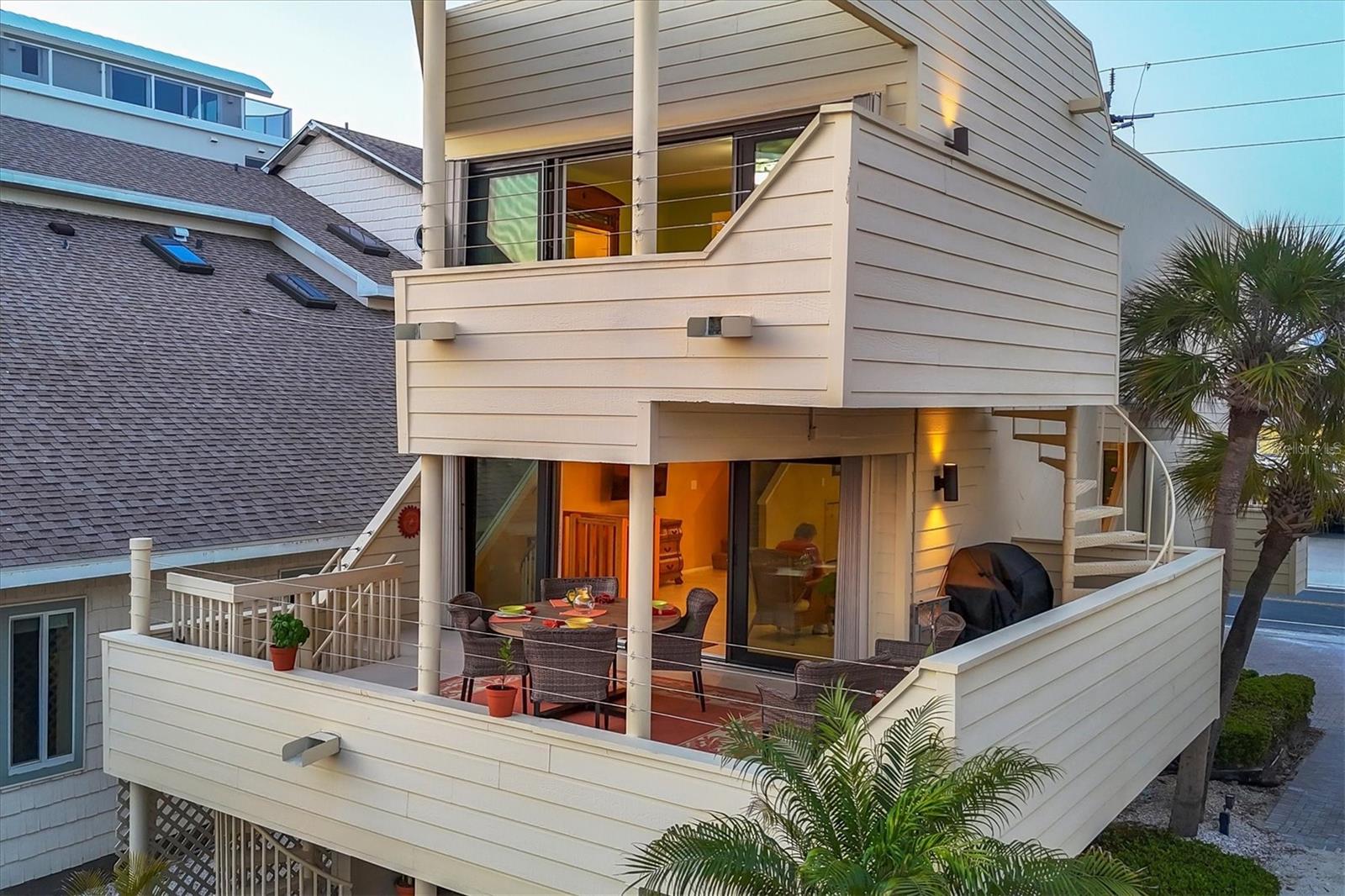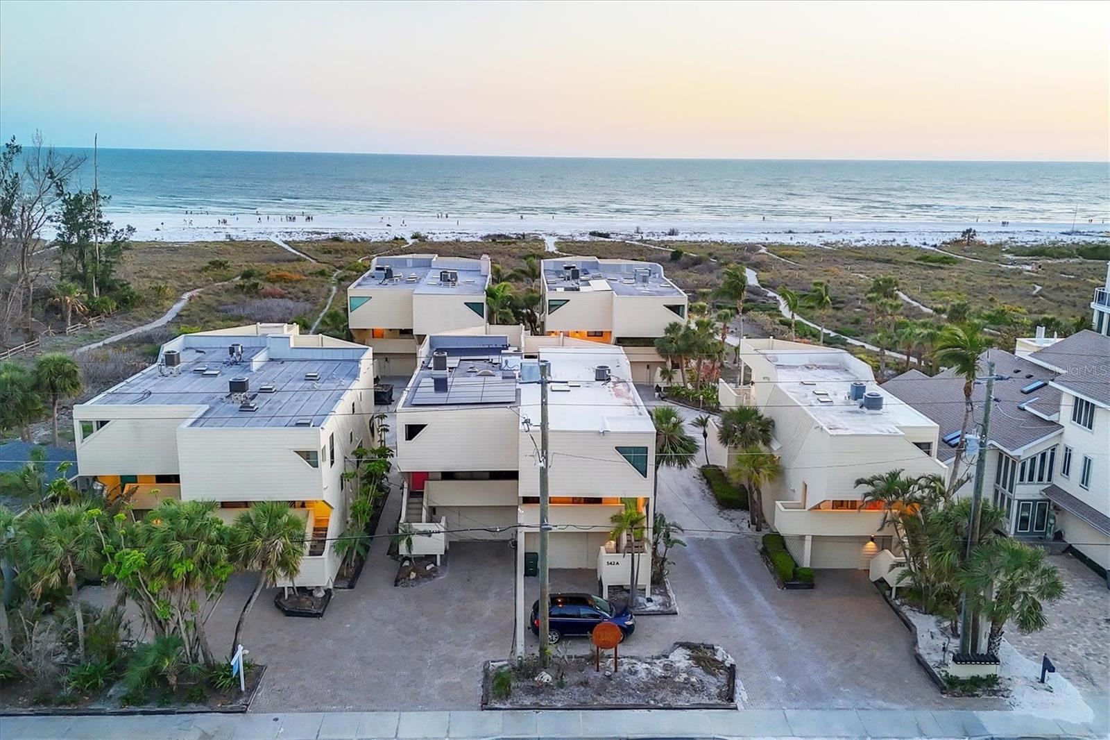 A beachfront home for the price of a condo. 540 Beach Road on Siesta Key is a three-story standalone Gulf front residence with private beach access and breathtaking views directly on famed Siesta Key Beach. Privacy and exclusivity await at Tiffany Sands, an enclave of only 9 units. With expansive Gulf views from the moment you open the front door, 540 Beach Road is a detached single-family condo overlooking the sandy shores of the #1 beach in America. This meticulously maintained 2 bedroom, 3 bath home features a bonus cabana room and one-car attached garage. With pride of ownership and nearly 1,900 sq ft under air, this maintenance-free standalone villa features private beach access. Every floor boasts floor-to-ceiling sliding glass doors and expansive terraces with stunning unobstructed views of the shimmering shores of the Gulf. With just over 3,000 sq ft total combined living space, the light-filled, open-plan main level consists of a recently remodeled kitchen, half bath, living room and dining area. 16' newly installed sliding glass doors provide access to the main covered deck, a great spot for your morning coffee and perfect for entertaining or relaxing as you revel at the majestic views of the beach and stunning sunsets. On the upper floor you will find 2 large en-suite bedrooms with private, newly updated full baths. The main suite has spectacular views with floor-to-ceiling sliding glass doors that open to a private deck, the perfect spot for sunning or reading a book. Main suite has 3 large closets and an oversized bathroom with double vanities and skylights. The 2nd bedroom features a cozy deck with sliders and a private bath with skylight. On the upper floor you will find a large laundry closet with new washer & dryer. The downstairs cabana room is complete with full bath and storage, floor-to-ceiling sliders and a covered patio with direct access to the beach. 540 Beach comes with private parking for 5 cars and additional guest parking. 540 Beach is situated precisely one-half mile to the heart of Siesta Key Village and a half mile to world renowned Siesta Key Public Beach. You have the option to make this your forever home or a lucrative vacation rental, as the present owners enjoy months of using the residence for their personal pleasure and rent it for a portion of the year, garnering substantial rental income. Home is equipped with 2 A/C units- one of which is BRAND NEW, new sliders on the upper levels, new hot water heater and storm shutters. 15+ years remain on the roof warranty. A one-of-a-kind property, 540 Beach is a private beachfront residence that feels like a home but is priced like a condo. Available turnkey furnished.