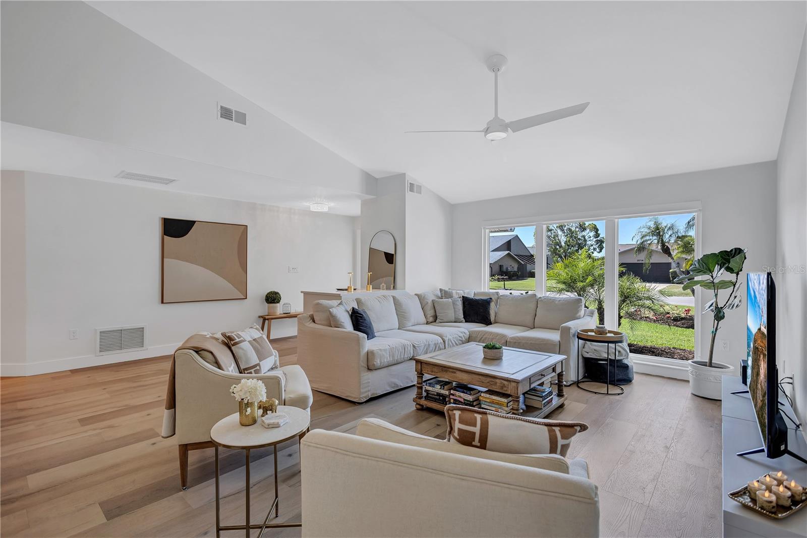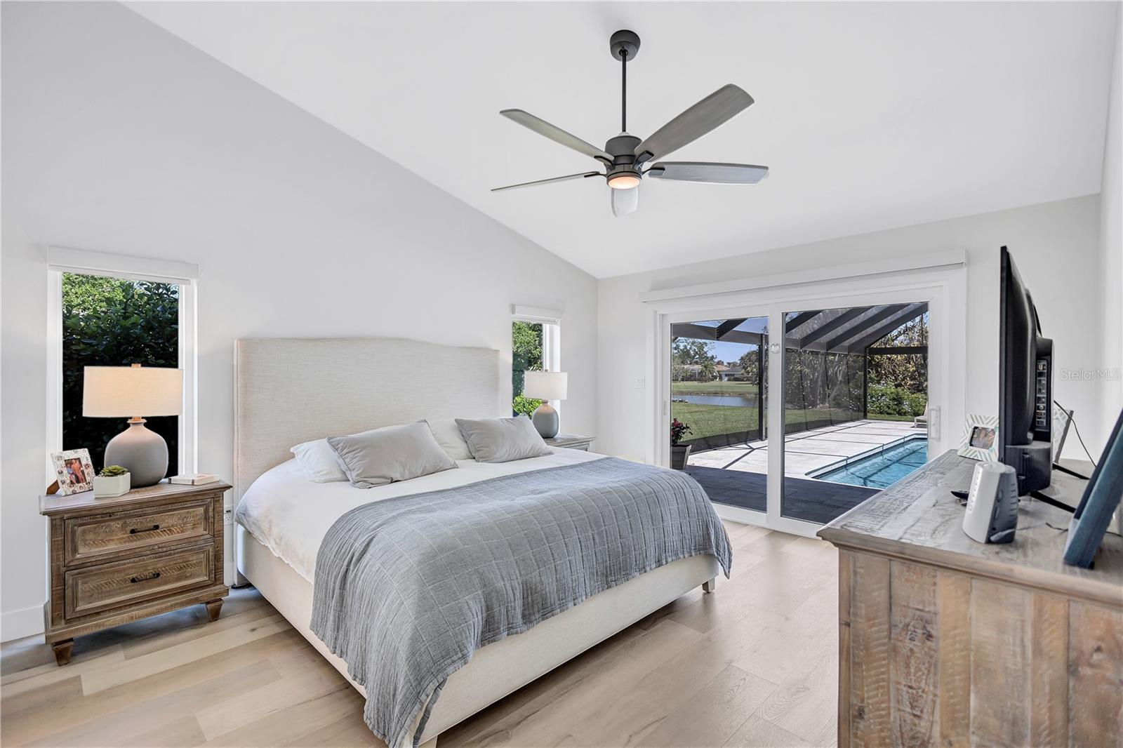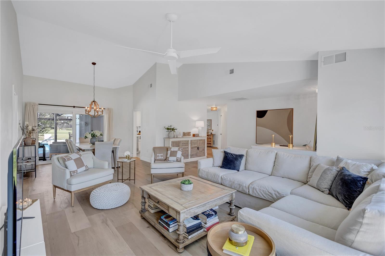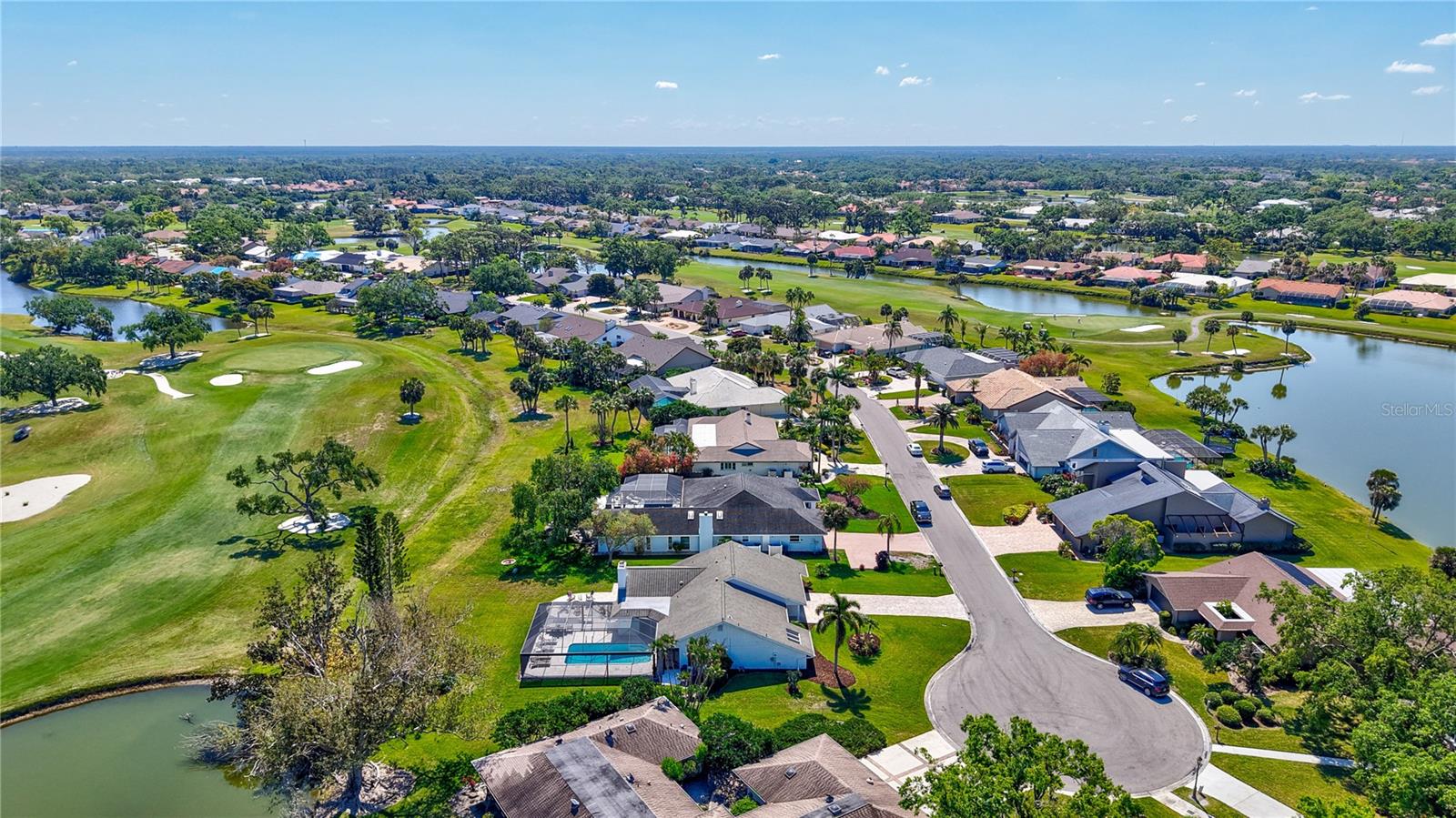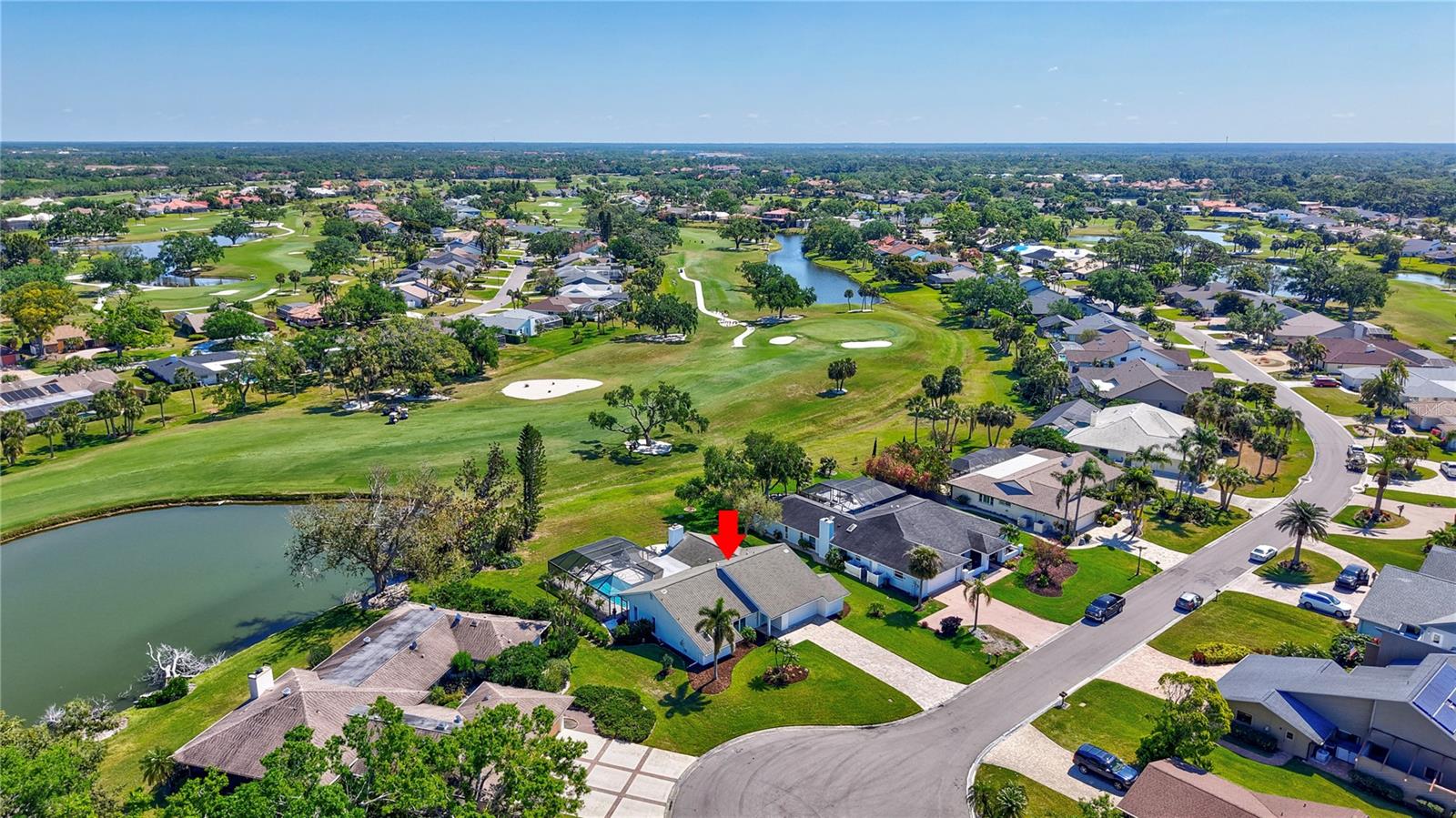 FULLY FURNISHED and MOVE-IN READY. Welcome home to the best of Sarasota. This updated home is located in Country Club of Sarasota in the heart of Palmer Ranch. Sitting on a spacious lot, this property allows golf course and lake views while strategically placed to offer a quiet and serene setting. Drenched in natural light, this 3-bedroom split plan home has been beautifully updated to enhance the vaulted ceilings, walls of sliding glass doors, and an open and inviting floorplan. Luxury vinyl wide plank flooring flows throughout allowing a smooth transition between rooms. Impact windows and sliders open to the expanded outdoor areas. The enlarged pool deck, panoramic pool cage and pavered outdoor sitting area with firepit are easily accessed to seamlessly merge inside with outside areas. The living/dining room is open and inviting. The kitchen is the hub of the home and connects the living/dining and family rooms. The updated and FULLY STOCKED kitchen opens to the family room with wood burning fireplace and views of the golf course. Quartz countertops, Kraftmaid cabinets and new appliances make the kitchen perfect for entertaining. The Primary Bedroom is had sliders opening to the pool, vaulted ceiling, and a large walking closet with built in shelving. The en-suite bathroom has his/her sink areas, a beautiful walk-shower, heated towel rack, and a private 12'x6' outdoor lounging patio. There are two additional bedrooms with a fully updated bath. One bedroom had sliders opening to the outdoor seating area, while the 3rd bedroom has a private patio area perfect for sunning. The pool area contains the 3rd full bath with shower. The upgrades are numerous including: interior and exterior painting, new pool heater, tumbled marble pool deck, impact garage door, electrical panel, new light fixtures. Join Prestancia and take your golf cart down the street and across the bridge to the golf courses. Country Club of Sarasota is close to Legacy Trail, Siesta Key beaches, Shopping/Entertainment, and all Sarasota has to offer. Don't miss this amazing property!