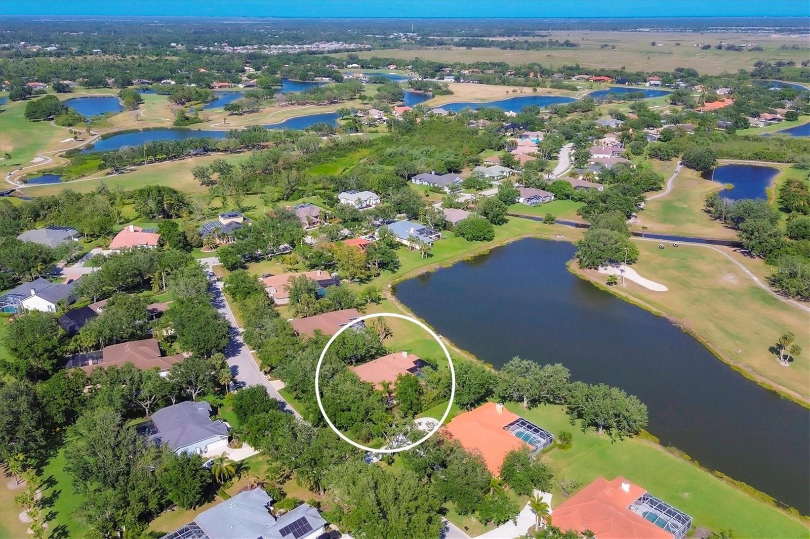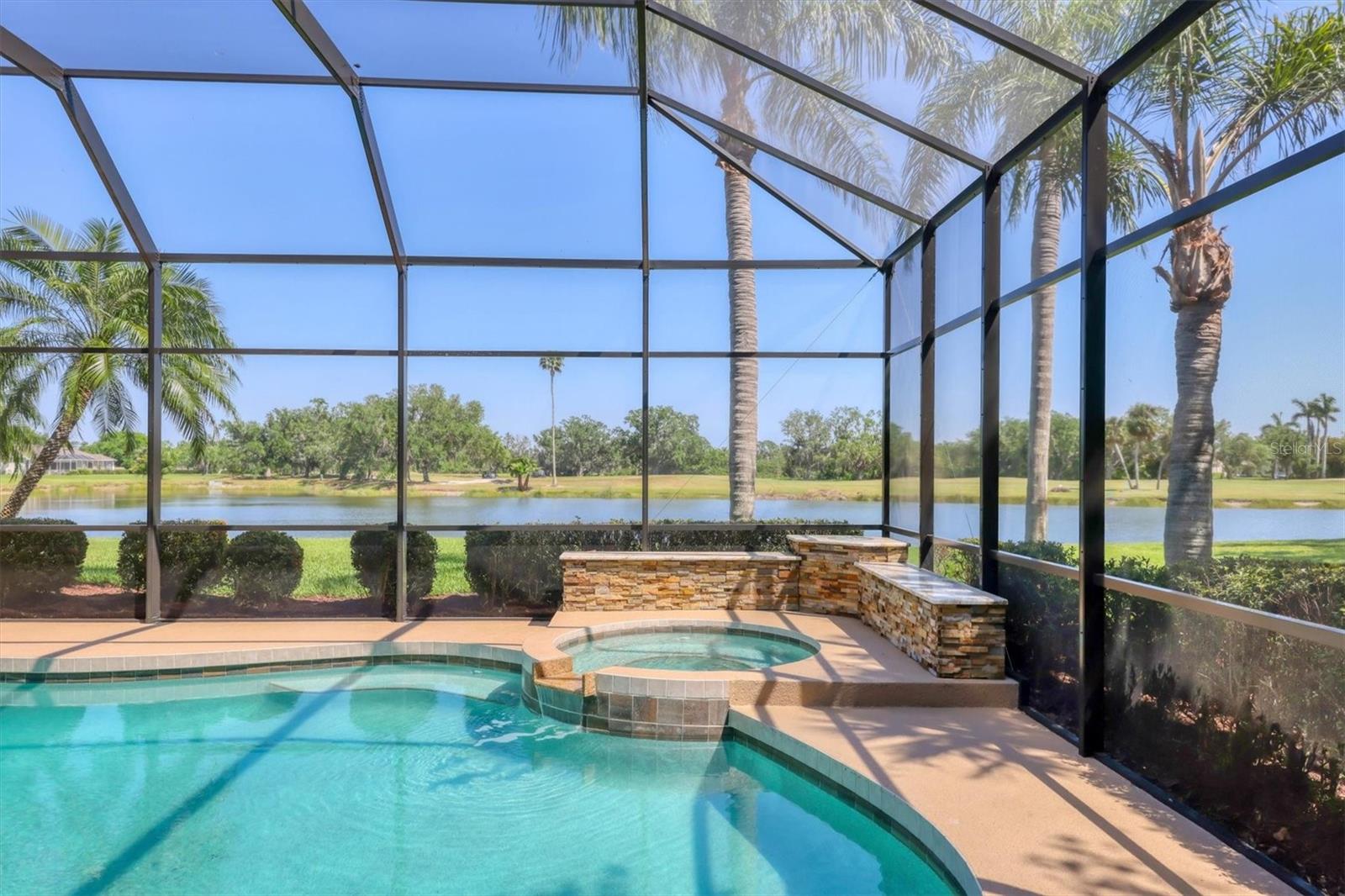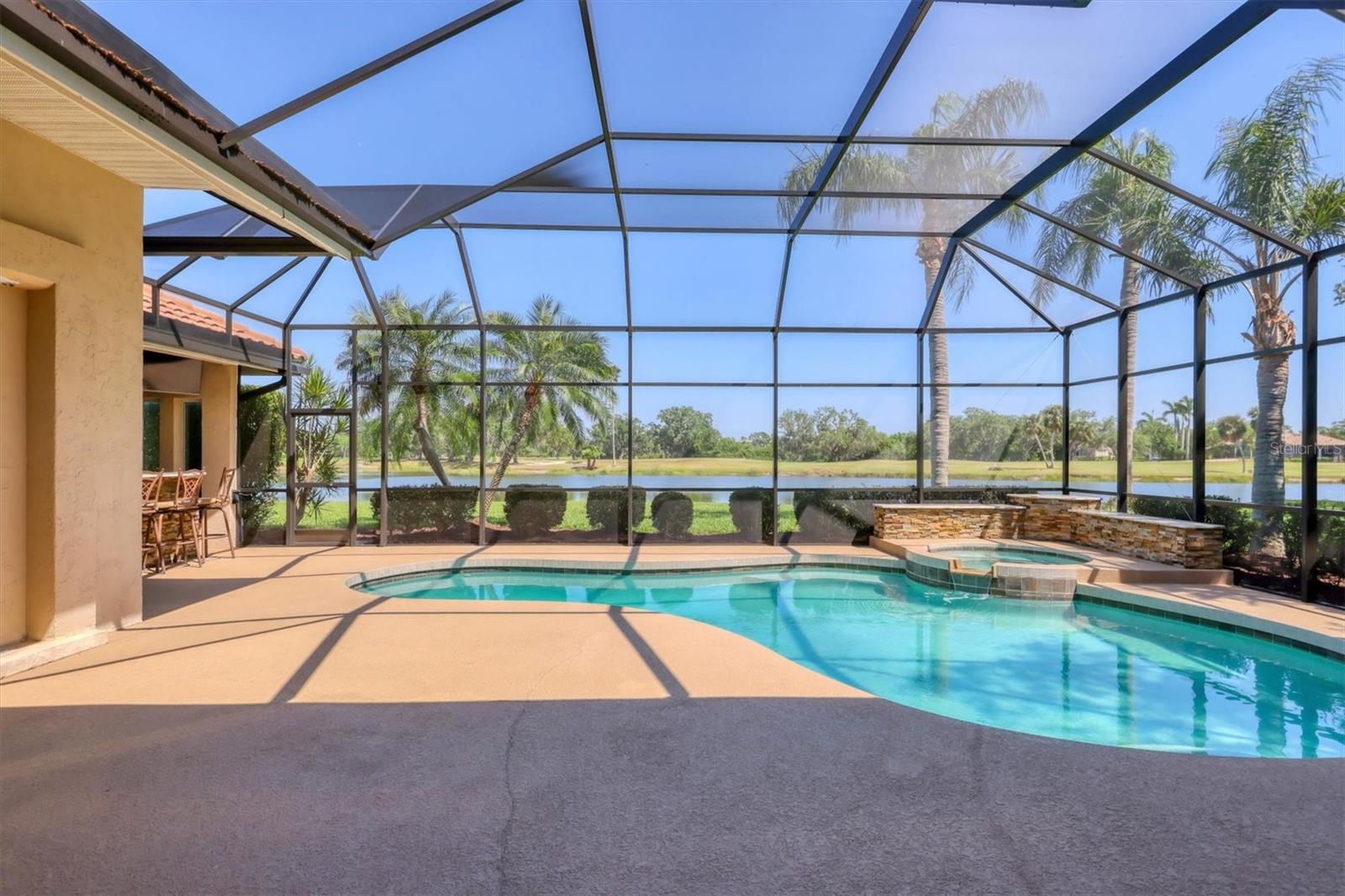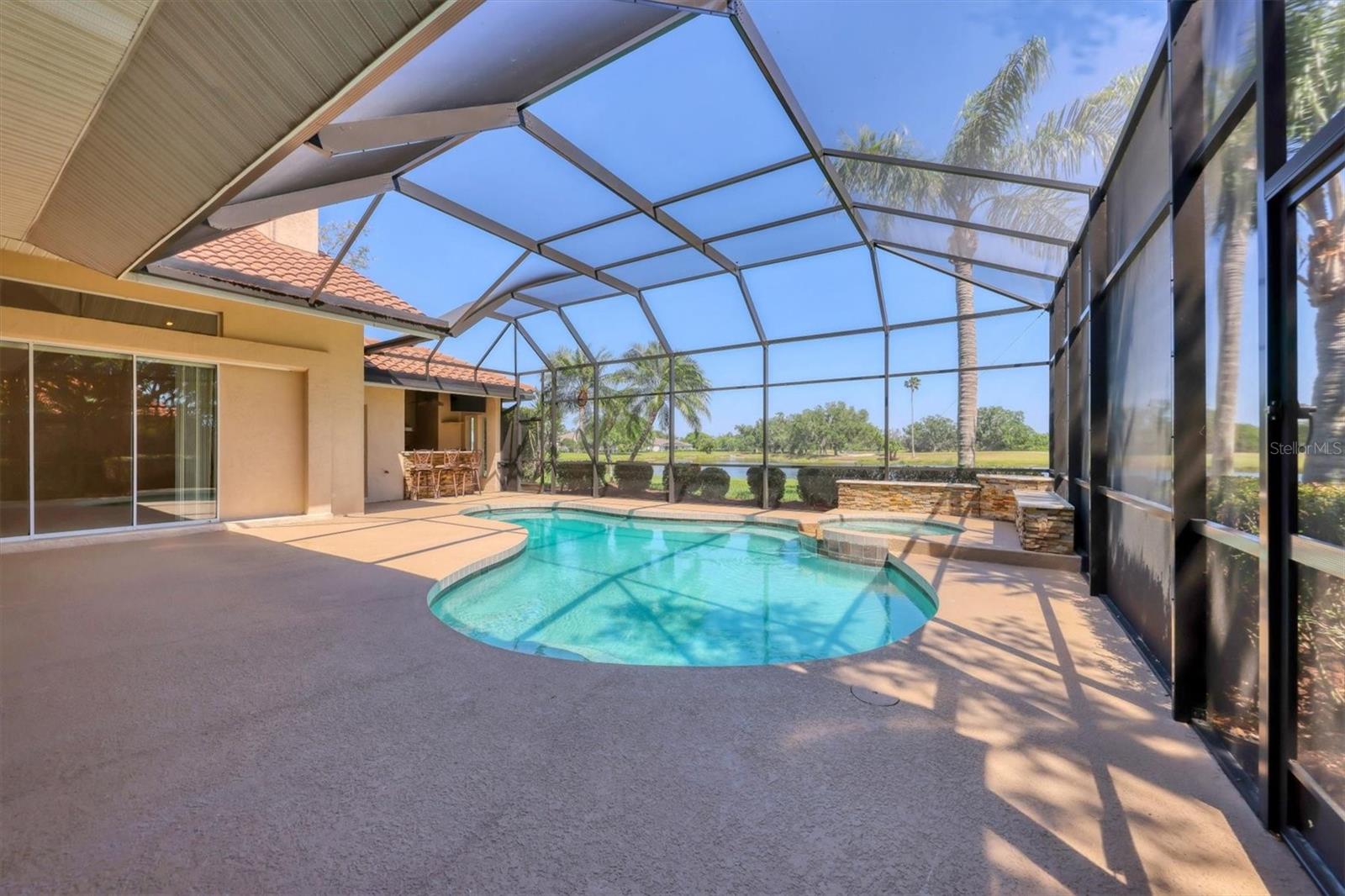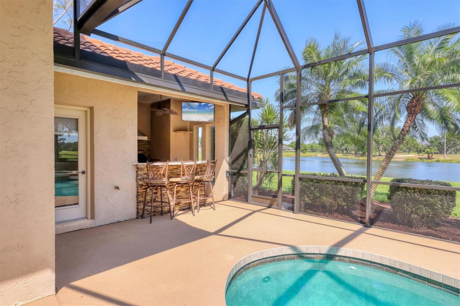 One or more photo(s) has been virtually staged. Nestled on slightly over 1/2 an acre in a picturesque setting of majestic oak canopies, and lush tropical foliage a custom-built home awaits. This property combines comfort, privacy, and breathtaking views offering a true Florida lifestyle in one of Sarasota's most desired gated golf communities, Serenoa. This beautifully designed residence features a spacious 2,848sq split floor plan offering, three bedrooms, three full bathrooms a formal living room, a family room, and a private office. The property has sliders throughout providing expansive views of the lake & 5th fairway filling each room with natural light. The primary suite is a peaceful retreat with french doors that open to the patio, while the en-suit bath provides two generous walk- in closets with a soaking tub and walk in- shower. The open concept living and dining areas provide the perfect setting for entertaining, while the breakfast nook with its large aquarium window offers a tranquil start to your day. A cozy fireplace in the family room adds warmth and charm, creating an inviting space to relax. Step outside to a must-see patio, where the saltwater pool and spa provide year-round enjoyment under the Florida sun. The outdoor kitchen is fully equipped with built-in grill, mini fridge, bar seating, and a true pool bath with shower-perfect for entertaining guest in style. The garage provides ample space to park two vehicles, along with built-in cabinets for additional storage. The property is also equipped with a well for the irrigation system, helping to ensure the landscape remains lush and beautiful. Serenoa is truly a one-of-a-kind community, each property situated on at least a half acre surrounding a beautifully maintained golf course nestled among mature oak trees, lush foliage, wildlife and multiple lakes, creating a picturesque and serene environment. Tennis and pickleball courts are available to all residents. ** Golf course membership is optional * Whitetails bar & Grill located at the club house provides on-site casual dining a perfect spot for socializing or grabbing a bite close to home. Conveniently located near, Publix, Twin lakes park, shopping, and just a short drive away from award winning Siesta Key beach, and UTC town center. *** EXTREMELY LOW HOA Fees** Improvements include**2015 Tile Roof **2018 NEW AC **2021 WATER HEATER ***2022 PROPERTY RE-PIPED***2025 NEW POOL CAGE***2025 New carpet***