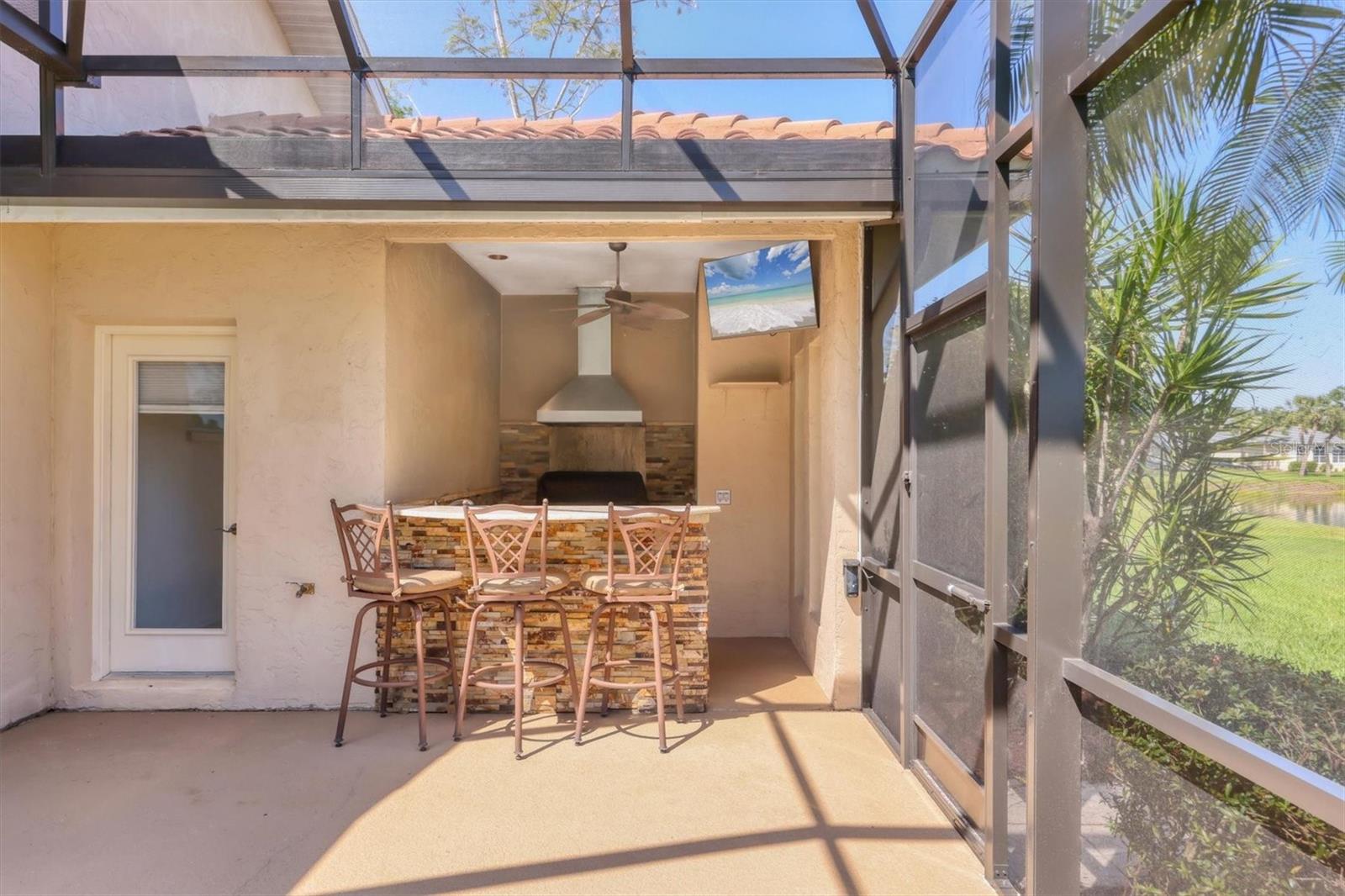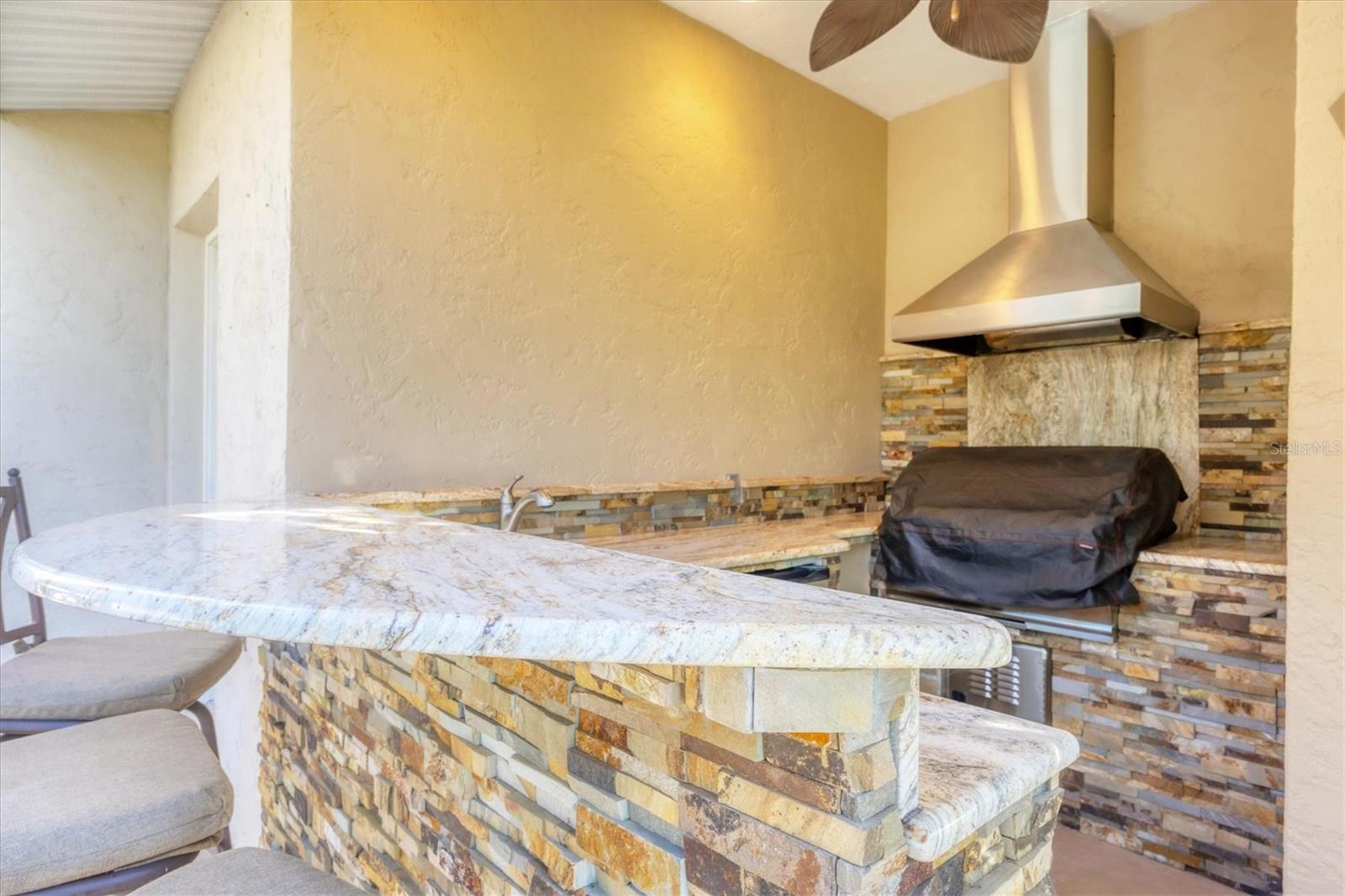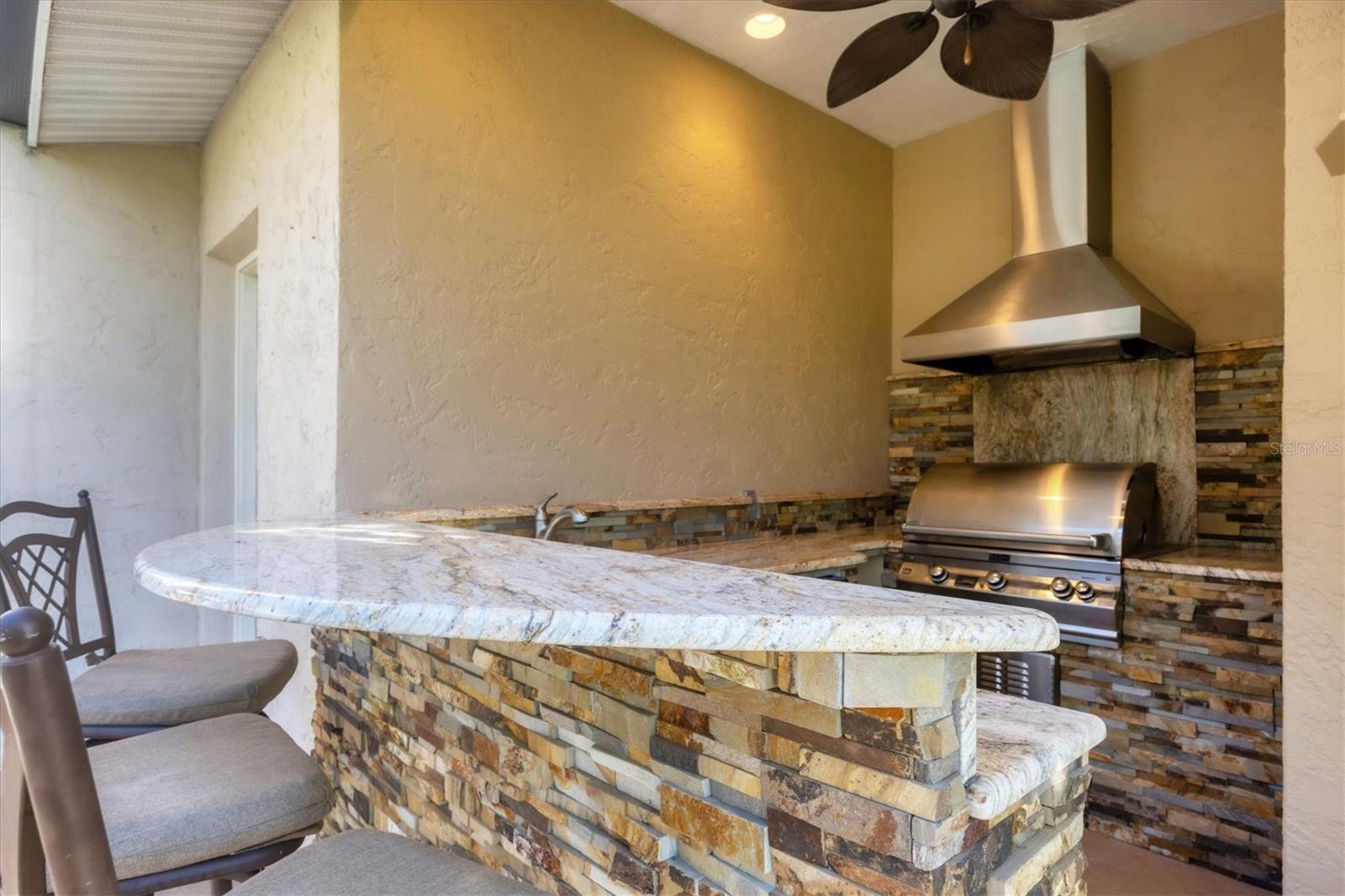 - Exterior: Outdoor Kitchen, Private Mailbox, Rain Gutters, Sliding Doors