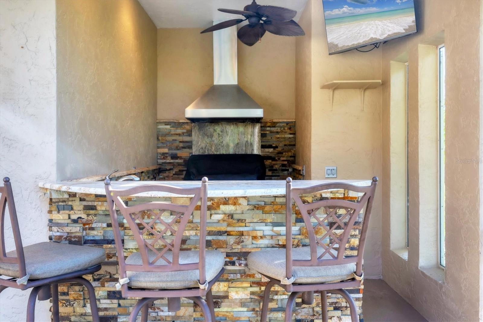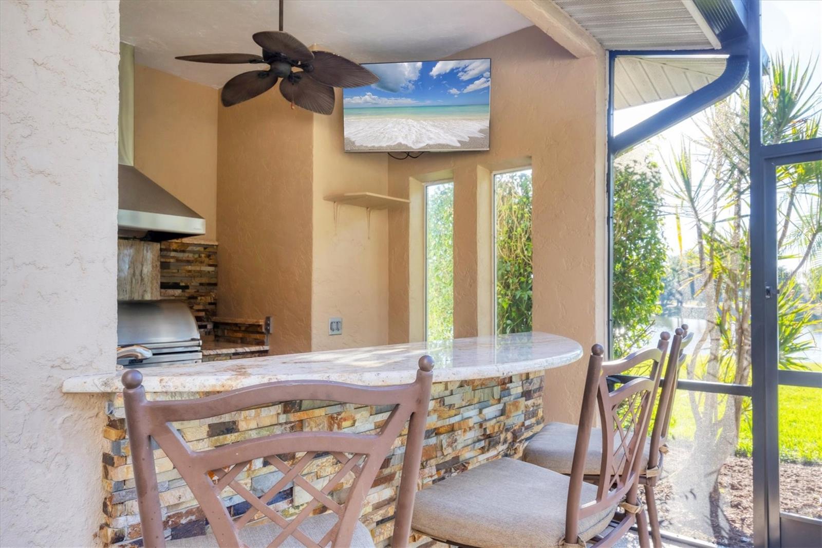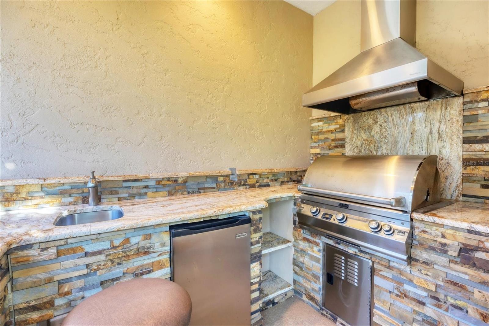 - Exterior: Outdoor Kitchen, Private Mailbox, Rain Gutters, Sliding Doors