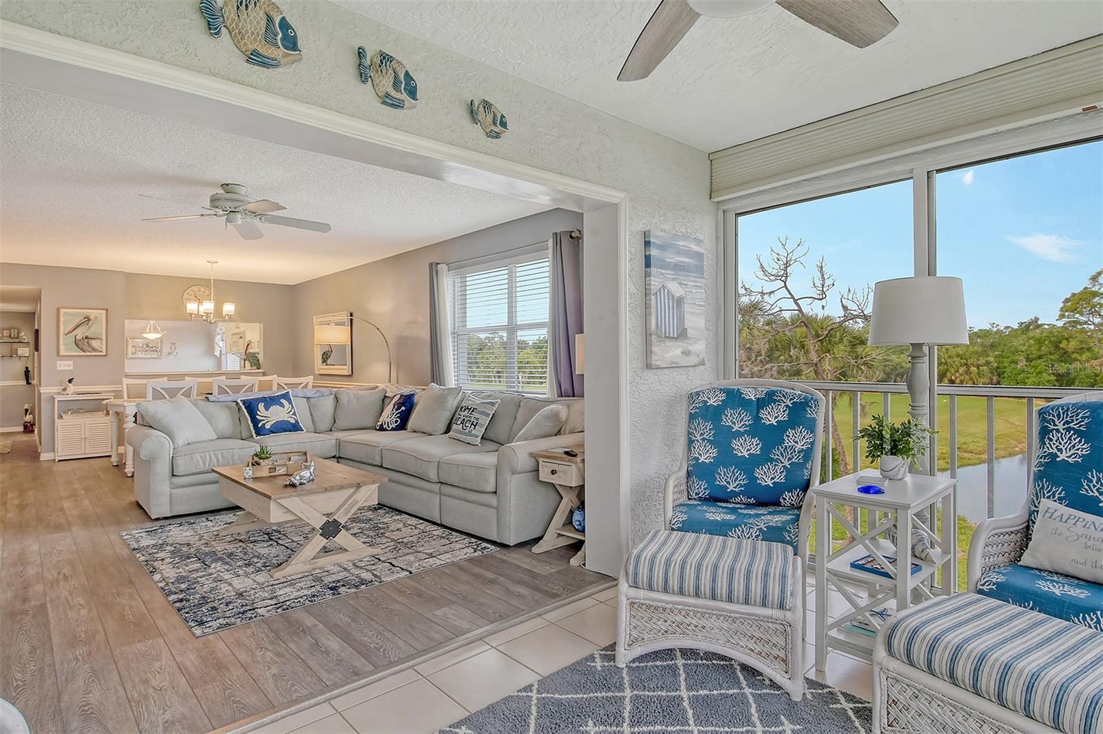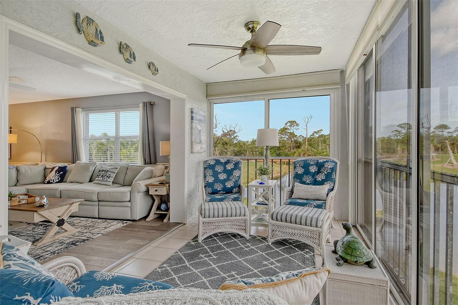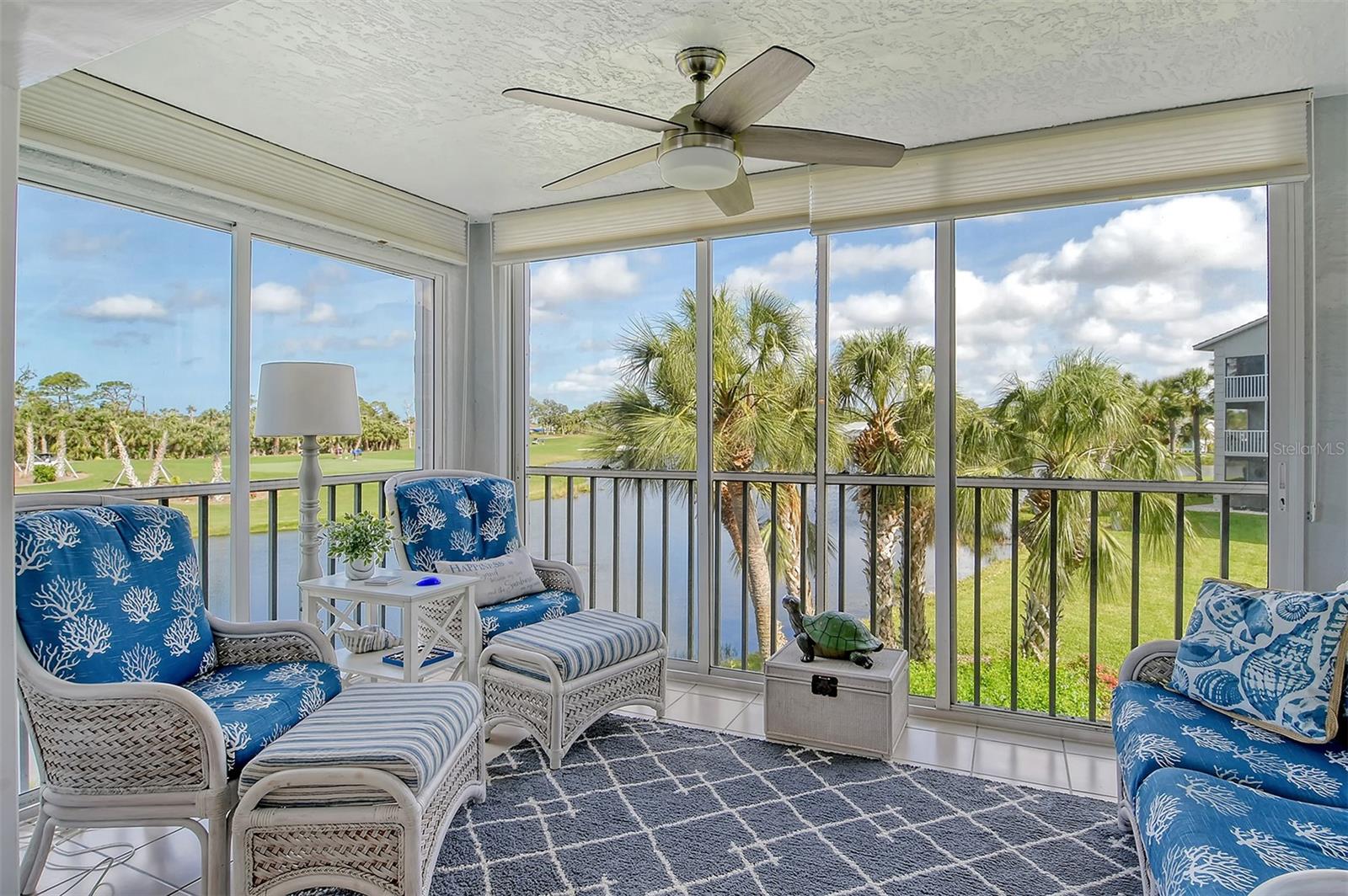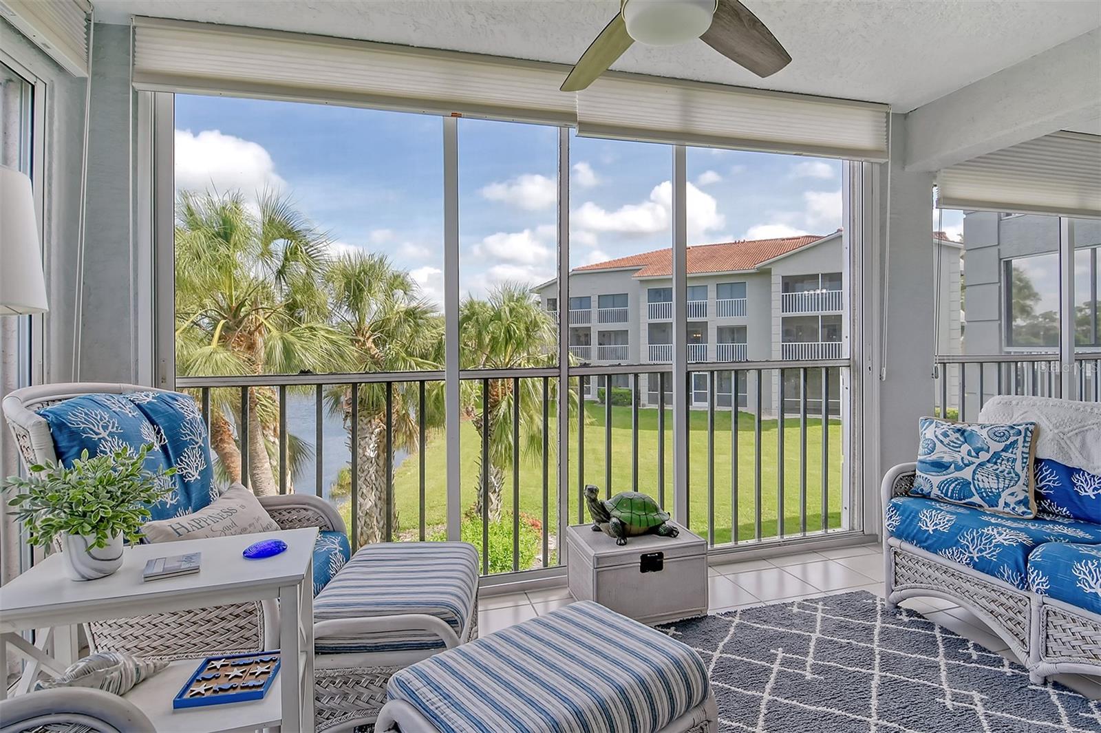Corner Unit with Glassed-in Lanai overlooking the big lake and new First Hole Green complex with views of the clubhouse in the distance! The Well-appointed Turnkey Furnished Condo has Luxury Vinyl Flooring throughout the living room and bedrooms. Primary bedroom with slider out to the lanai, walk-in closet. Guest Quarters down from a private hallway in the unit with guest bath and laundry closet. Community pool, tennis/pickle ball court and community grills nearby plus one car carport. A premier member-owned country club, Stoneybrook of Sarasota, is only a short distance from Siesta Key and offers easy access to shopping and borders the Legacy Trail. Ownership in Stoneybrook Golf and Country Club includes an updated clubhouse and restaurant, Har-Tru tennis facility, well-equipped fitness center and additional club pool and spa. Nestled between Downtown Sarasota and Downtown Venice. In 2024, the Golf Course went through a complete redesign, new greens, sand traps, fairways and rough and tee boxes.