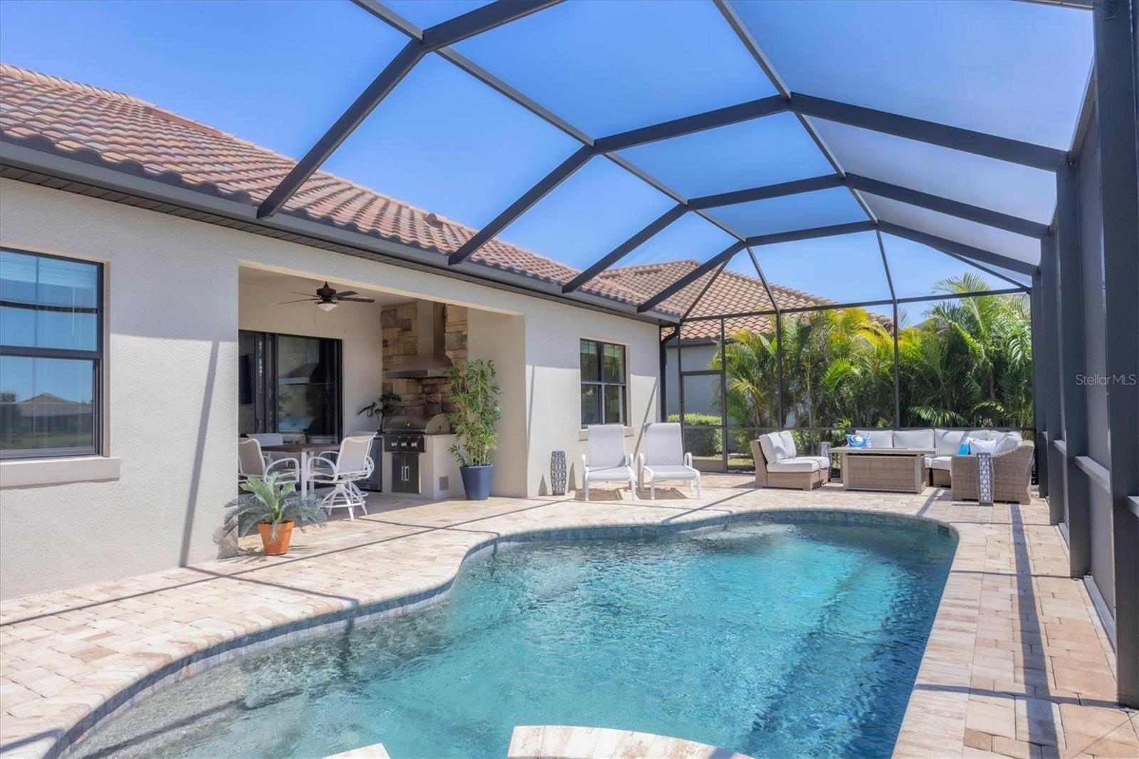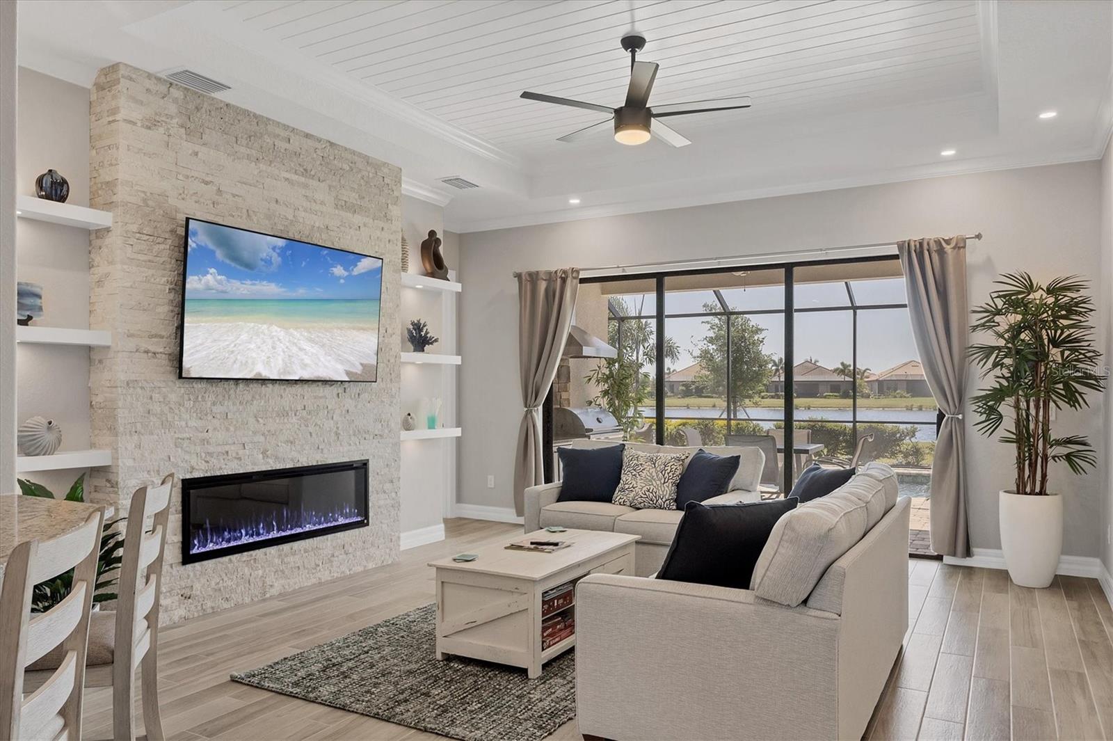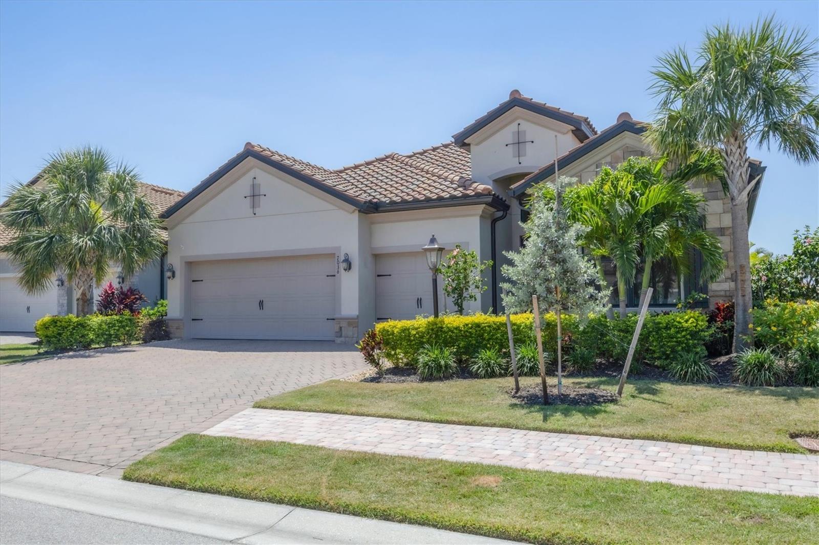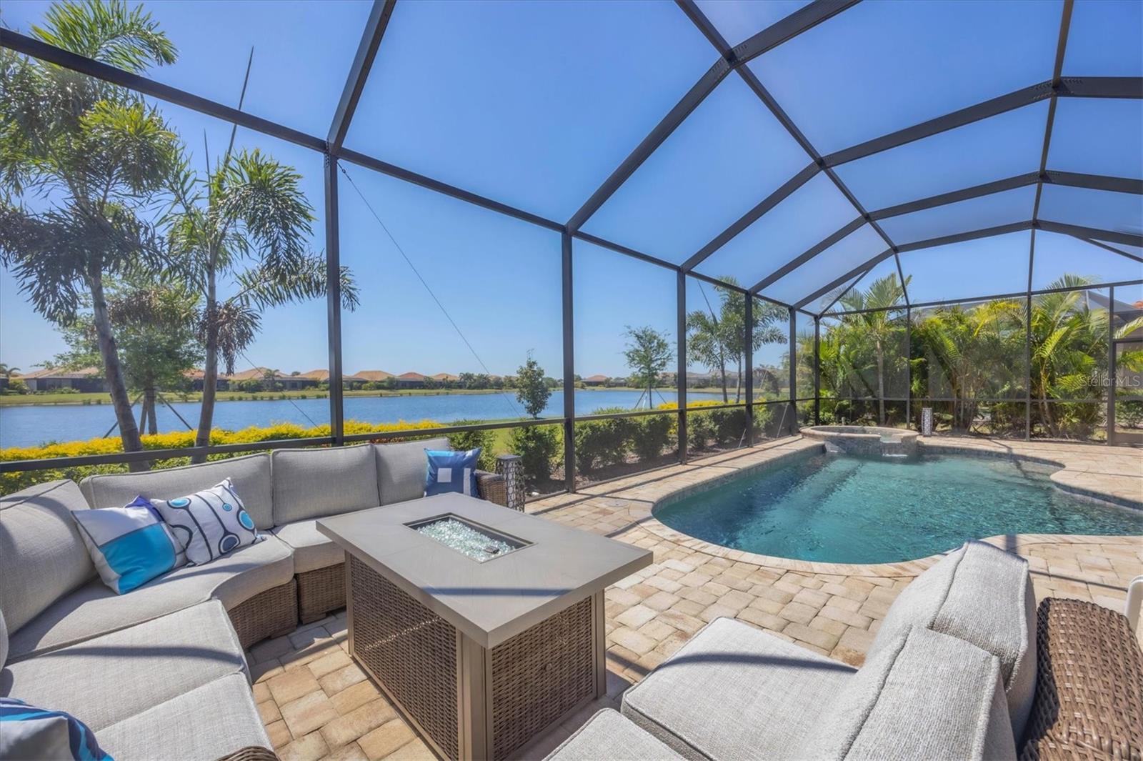 Nestled in the prestigious Country Club East of Lakewood Ranch, this stunning home, crafted by WCI in 2020, embodies modern elegance and comfort. The Stanford model offers four spacious bedrooms and three beautifully appointed bathrooms, perfect for both relaxation and entertaining.As you approach, a new glass front door invites you into a sunlit foyer, setting a welcoming tone. Inside, the living area is enhanced with an updated stacked stone wall, featuring an integrated fireplace and sleek shelving, creating a cozy yet sophisticated ambiance.Five rooms have been updated with recessed LED lighting, brightening the interior and enhancing the home's contemporary charm. The master suite serves as a tranquil retreat with its luxurious tub, while the secondary bathrooms boast chic shower doors.Step outside to the heart of this property--an entertainer's paradise. The outdoor kitchen, heated pool, and spa are set against the backdrop of a breathtaking lake view, offering stunning sunsets that paint the sky with vibrant hues.With a three-car garage providing ample storage, this home is as practical as it is beautiful. Discover the perfect blend of luxury and lifestyle in this Lakewood Ranch masterpiece. Your dream home awaits!