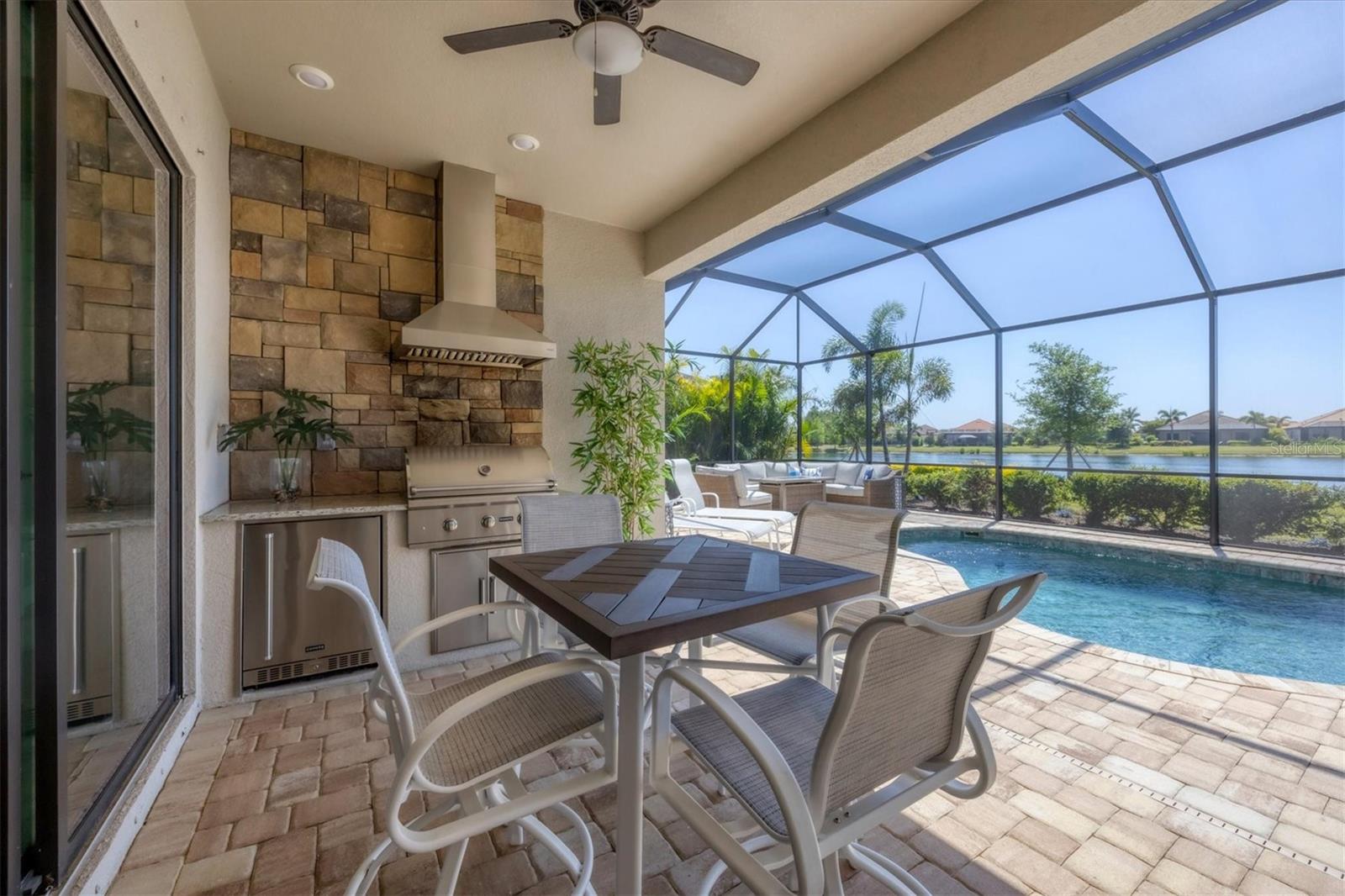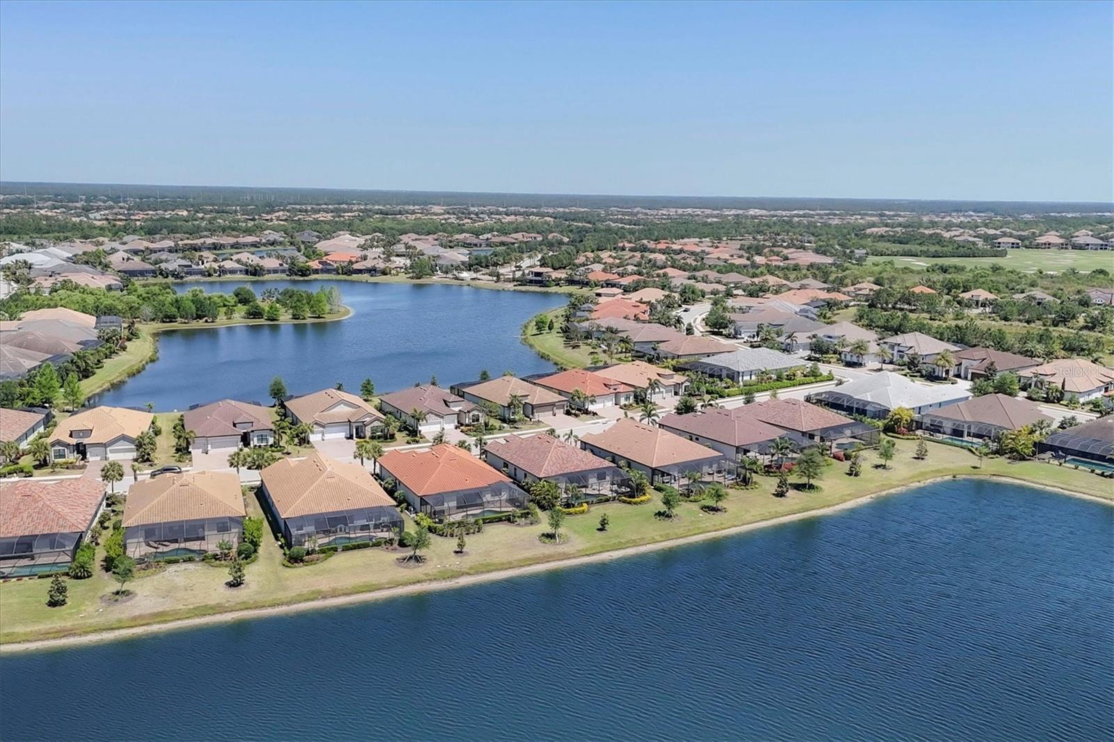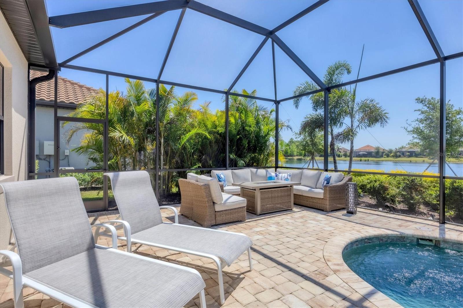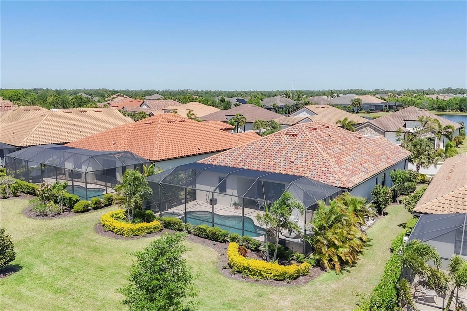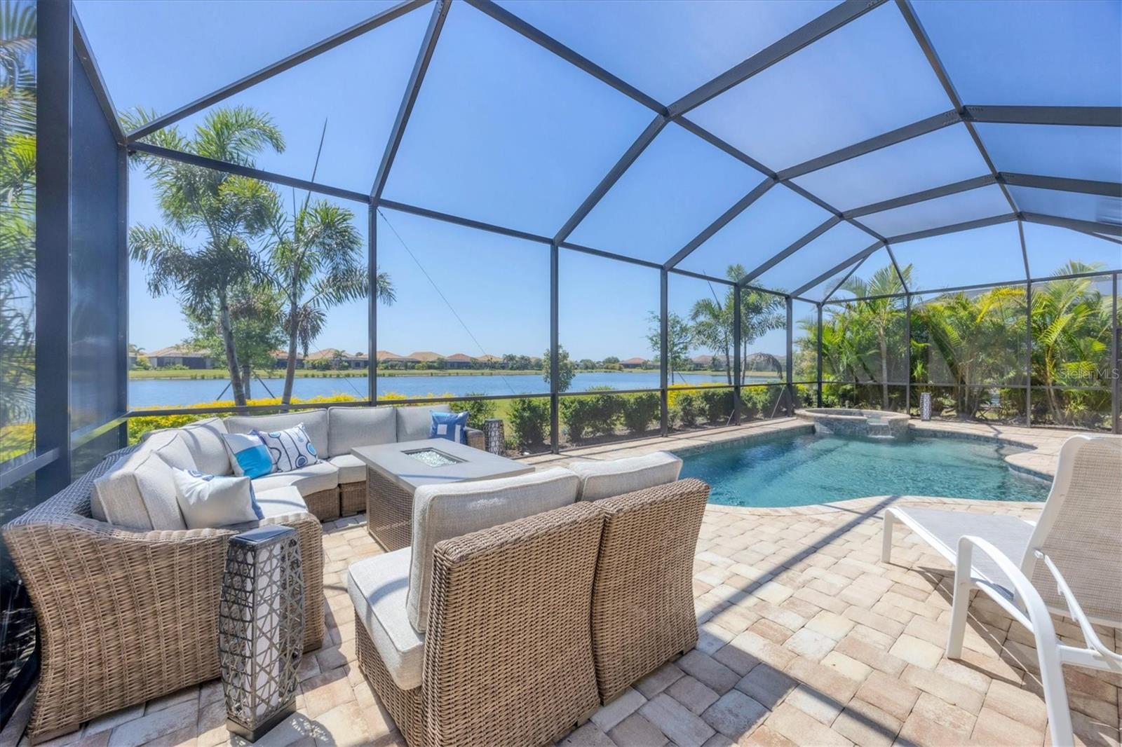 Nestled in the prestigious Country Club East of Lakewood Ranch, this stunning home, crafted by WCI in 2020, embodies modern elegance and comfort. The Stanford model offers four spacious bedrooms and three beautifully appointed bathrooms, perfect for both relaxation and entertaining.As you approach, a new glass front door invites you into a sunlit foyer, setting a welcoming tone. Inside, the living area is enhanced with an updated stacked stone wall, featuring an integrated fireplace and sleek shelving, creating a cozy yet sophisticated ambiance.Five rooms have been updated with recessed LED lighting, brightening the interior and enhancing the home's contemporary charm. The master suite serves as a tranquil retreat with its luxurious tub, while the secondary bathrooms boast chic shower doors.Step outside to the heart of this property--an entertainer's paradise. The outdoor kitchen, heated pool, and spa are set against the backdrop of a breathtaking lake view, offering stunning sunsets that paint the sky with vibrant hues.With a three-car garage providing ample storage, this home is as practical as it is beautiful. Discover the perfect blend of luxury and lifestyle in this Lakewood Ranch masterpiece. Your dream home awaits!