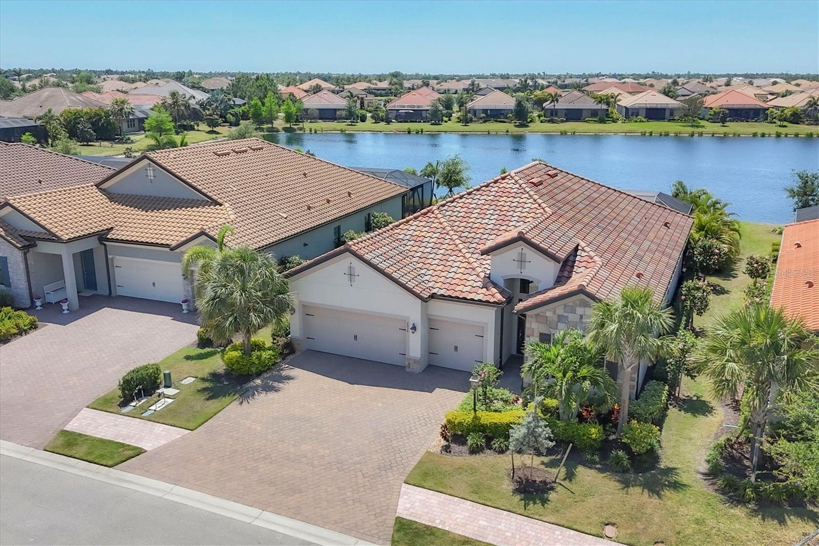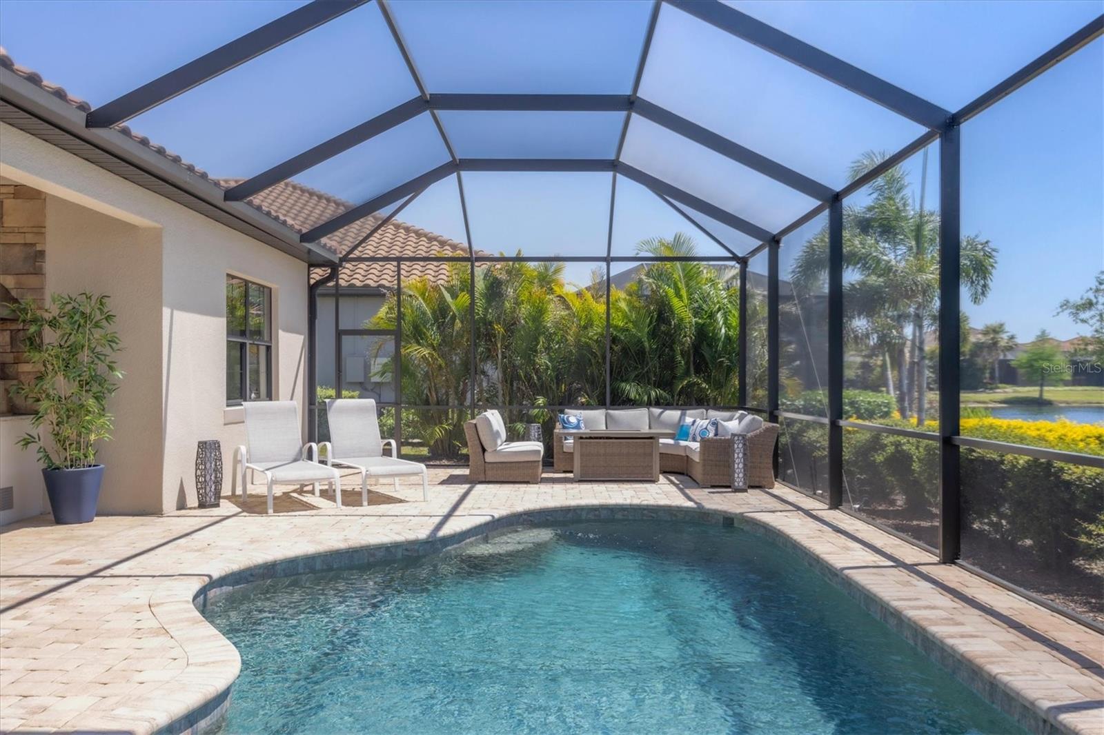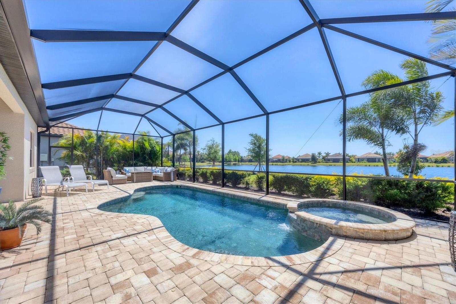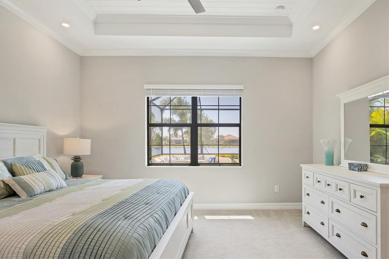 Nestled in the prestigious Country Club East of Lakewood Ranch, this stunning home, crafted by WCI in 2020, embodies modern elegance and comfort. The Stanford model offers four spacious bedrooms and three beautifully appointed bathrooms, perfect for both relaxation and entertaining.As you approach, a new glass front door invites you into a sunlit foyer, setting a welcoming tone. Inside, the living area is enhanced with an updated stacked stone wall, featuring an integrated fireplace and sleek shelving, creating a cozy yet sophisticated ambiance.Five rooms have been updated with recessed LED lighting, brightening the interior and enhancing the home's contemporary charm. The master suite serves as a tranquil retreat with its luxurious tub, while the secondary bathrooms boast chic shower doors.Step outside to the heart of this property--an entertainer's paradise. The outdoor kitchen, heated pool, and spa are set against the backdrop of a breathtaking lake view, offering stunning sunsets that paint the sky with vibrant hues.With a three-car garage providing ample storage, this home is as practical as it is beautiful. Discover the perfect blend of luxury and lifestyle in this Lakewood Ranch masterpiece. Your dream home awaits!