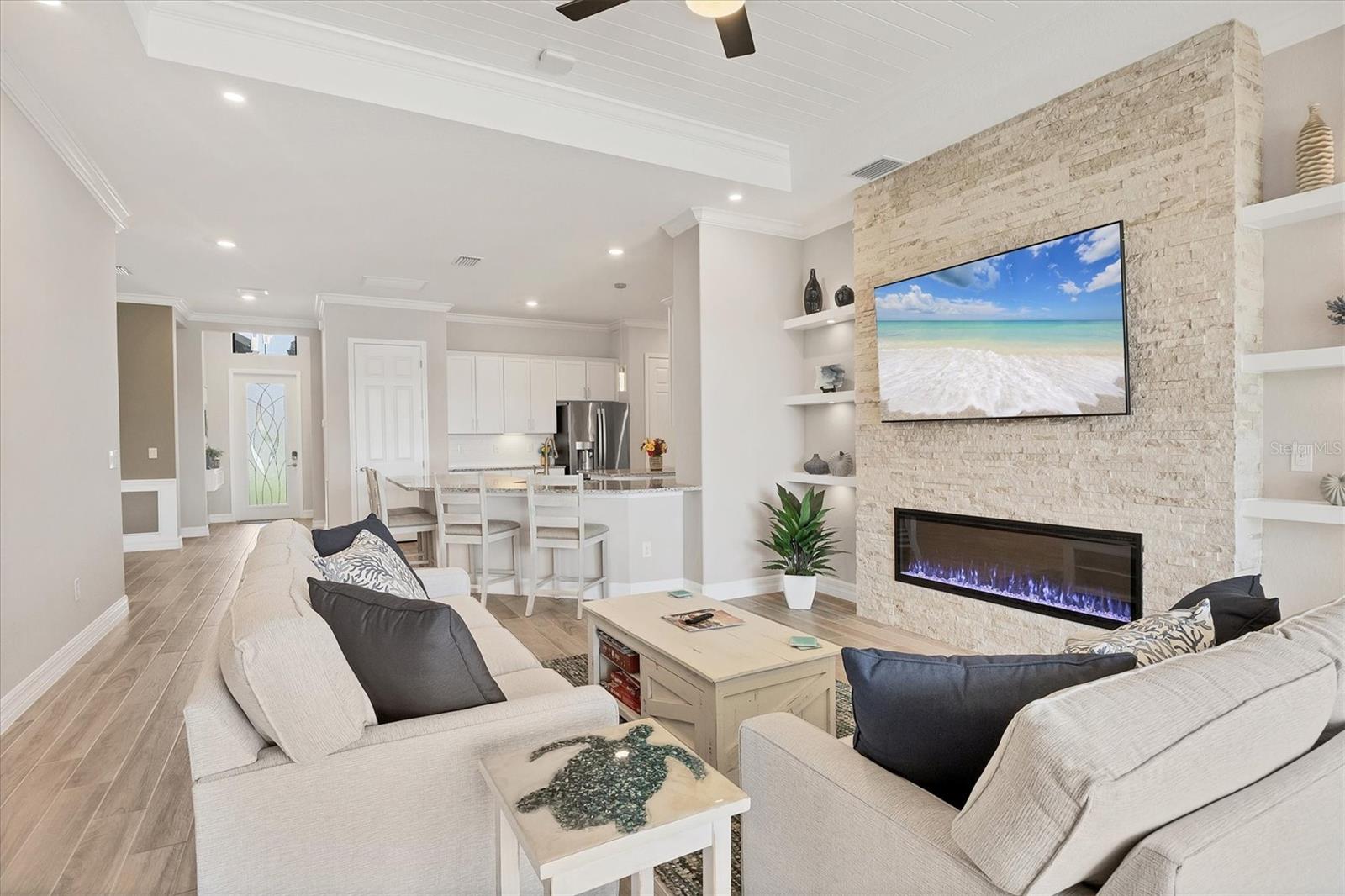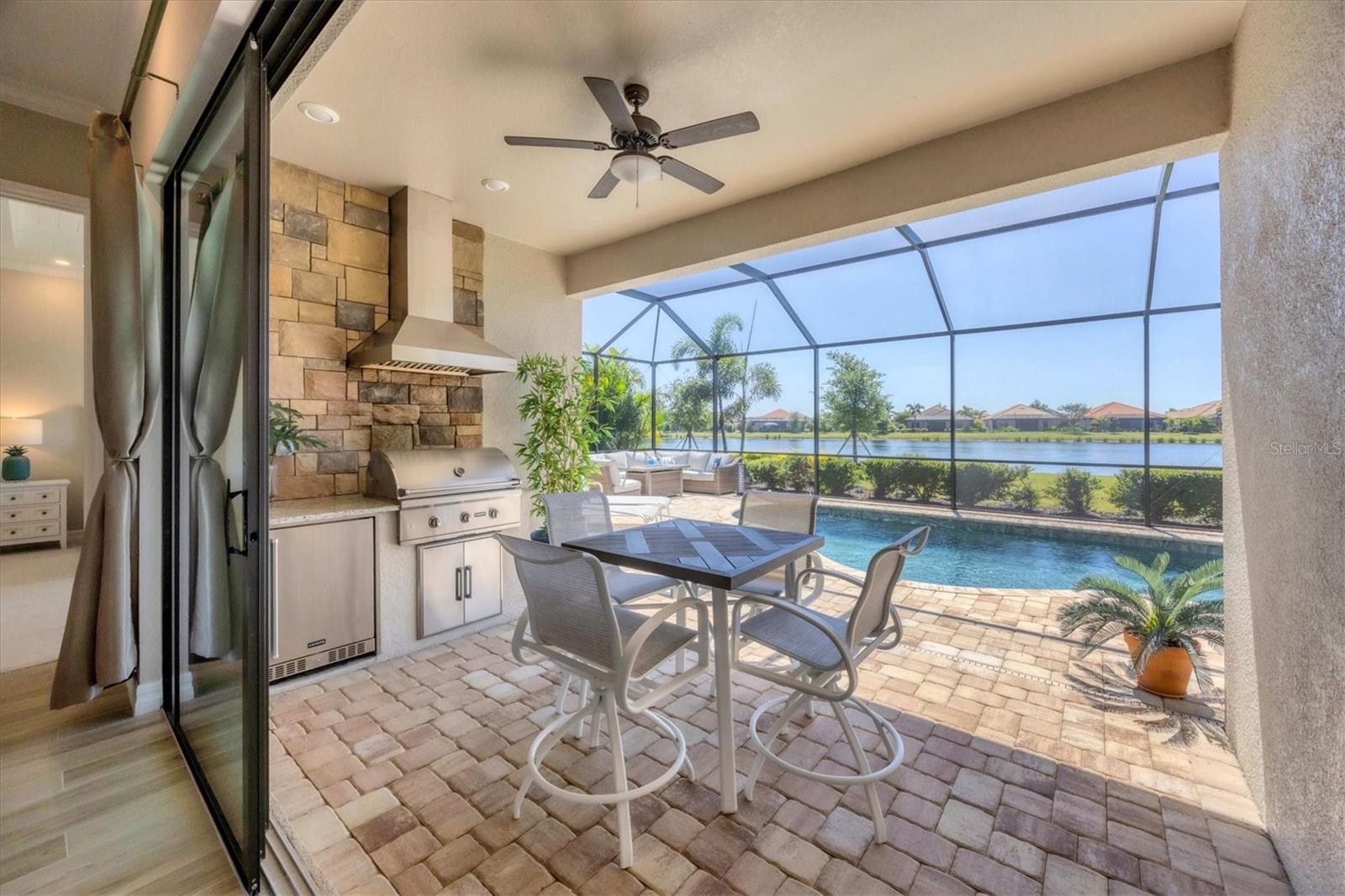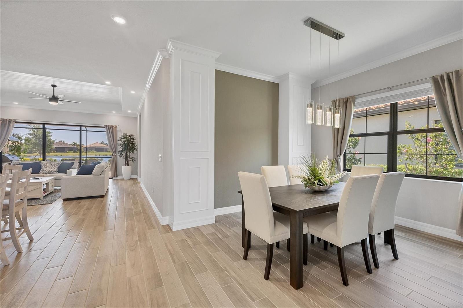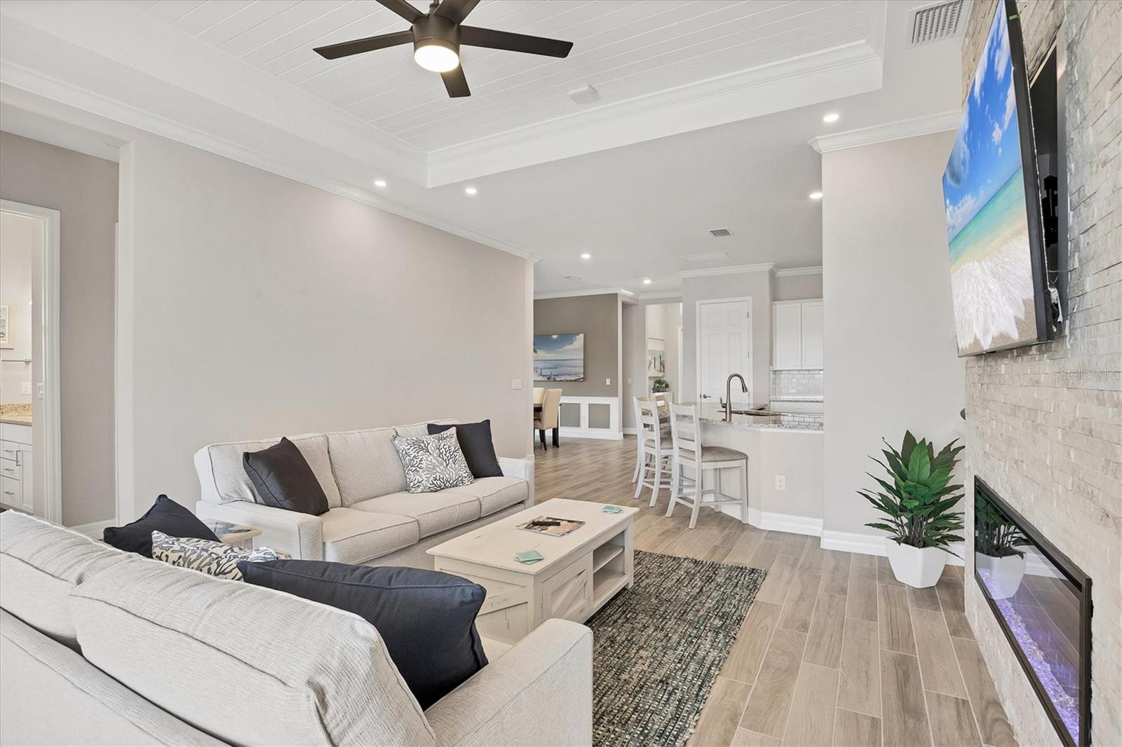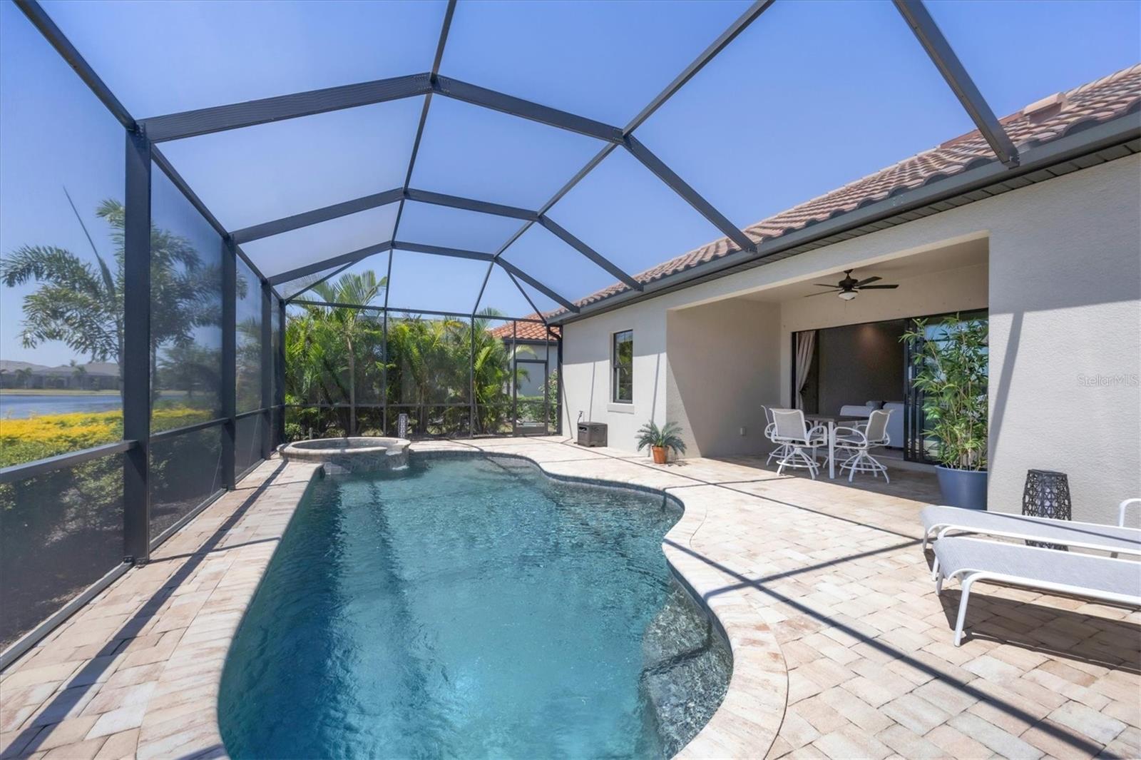 Nestled in the prestigious Country Club East of Lakewood Ranch, this stunning home, crafted by WCI in 2020, embodies modern elegance and comfort. The Stanford model offers four spacious bedrooms and three beautifully appointed bathrooms, perfect for both relaxation and entertaining.As you approach, a new glass front door invites you into a sunlit foyer, setting a welcoming tone. Inside, the living area is enhanced with an updated stacked stone wall, featuring an integrated fireplace and sleek shelving, creating a cozy yet sophisticated ambiance.Five rooms have been updated with recessed LED lighting, brightening the interior and enhancing the home's contemporary charm. The master suite serves as a tranquil retreat with its luxurious tub, while the secondary bathrooms boast chic shower doors.Step outside to the heart of this property--an entertainer's paradise. The outdoor kitchen, heated pool, and spa are set against the backdrop of a breathtaking lake view, offering stunning sunsets that paint the sky with vibrant hues.With a three-car garage providing ample storage, this home is as practical as it is beautiful. Discover the perfect blend of luxury and lifestyle in this Lakewood Ranch masterpiece. Your dream home awaits!