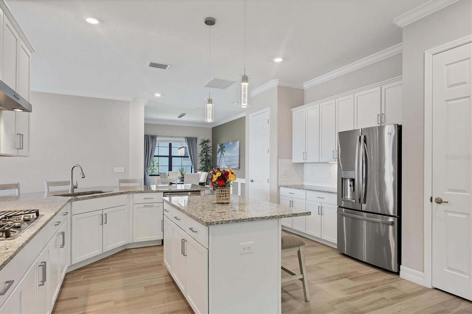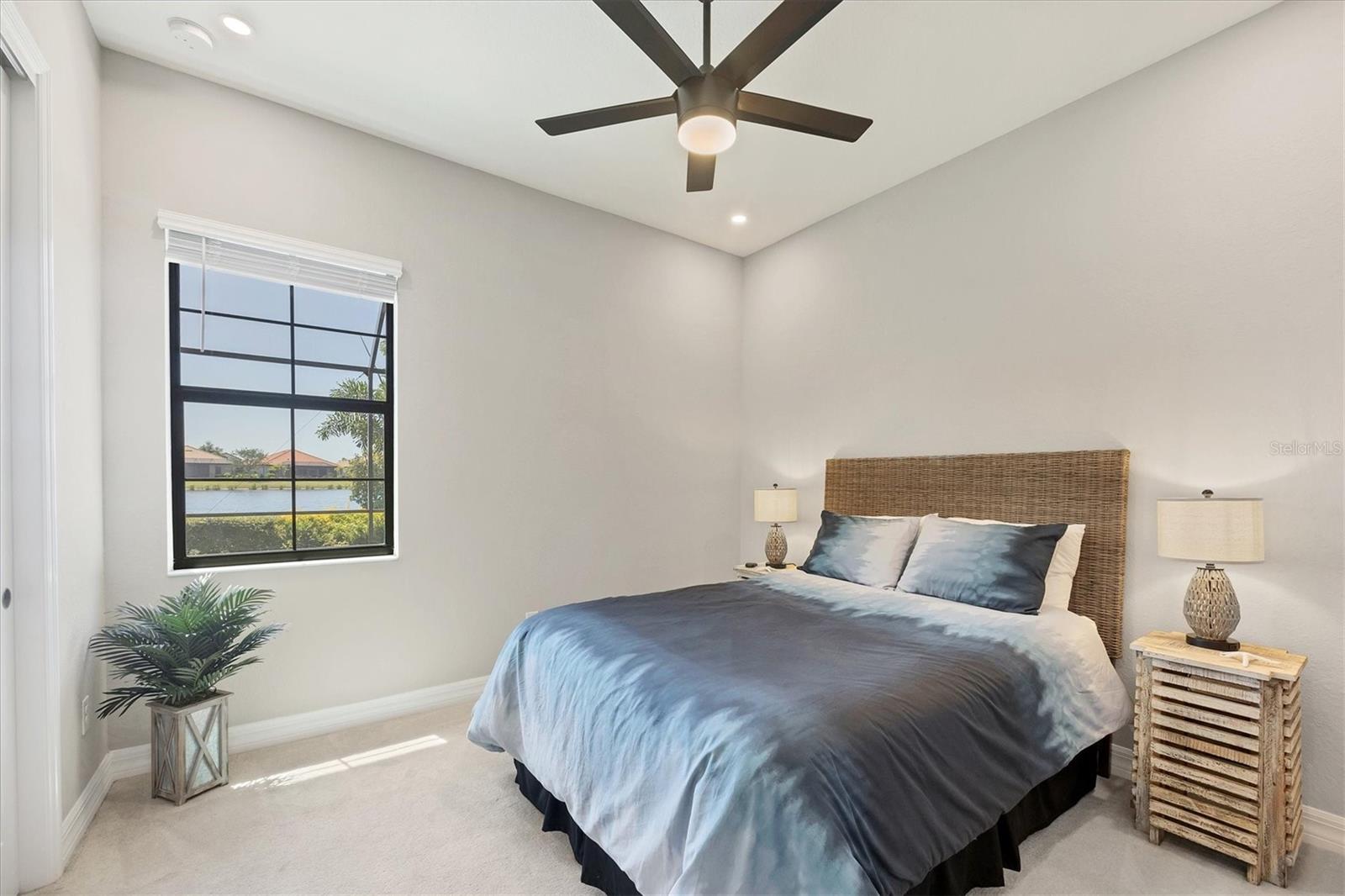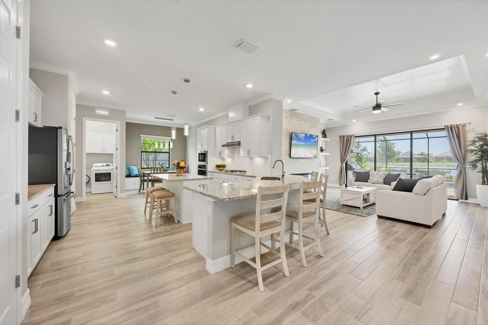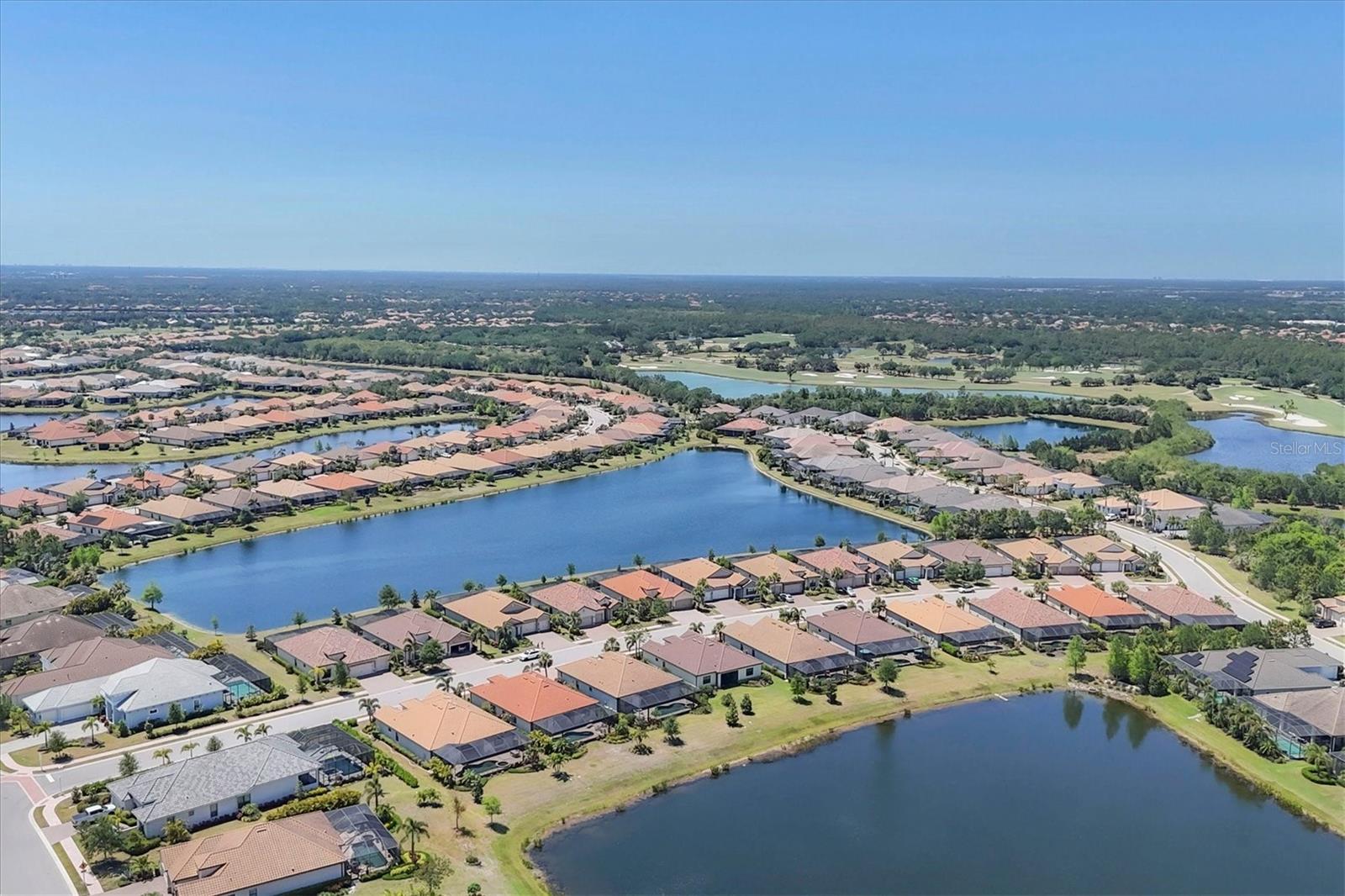 Nestled in the prestigious Country Club East of Lakewood Ranch, this stunning home, crafted by WCI in 2020, embodies modern elegance and comfort. The Stanford model offers four spacious bedrooms and three beautifully appointed bathrooms, perfect for both relaxation and entertaining.As you approach, a new glass front door invites you into a sunlit foyer, setting a welcoming tone. Inside, the living area is enhanced with an updated stacked stone wall, featuring an integrated fireplace and sleek shelving, creating a cozy yet sophisticated ambiance.Five rooms have been updated with recessed LED lighting, brightening the interior and enhancing the home's contemporary charm. The master suite serves as a tranquil retreat with its luxurious tub, while the secondary bathrooms boast chic shower doors.Step outside to the heart of this property--an entertainer's paradise. The outdoor kitchen, heated pool, and spa are set against the backdrop of a breathtaking lake view, offering stunning sunsets that paint the sky with vibrant hues.With a three-car garage providing ample storage, this home is as practical as it is beautiful. Discover the perfect blend of luxury and lifestyle in this Lakewood Ranch masterpiece. Your dream home awaits!