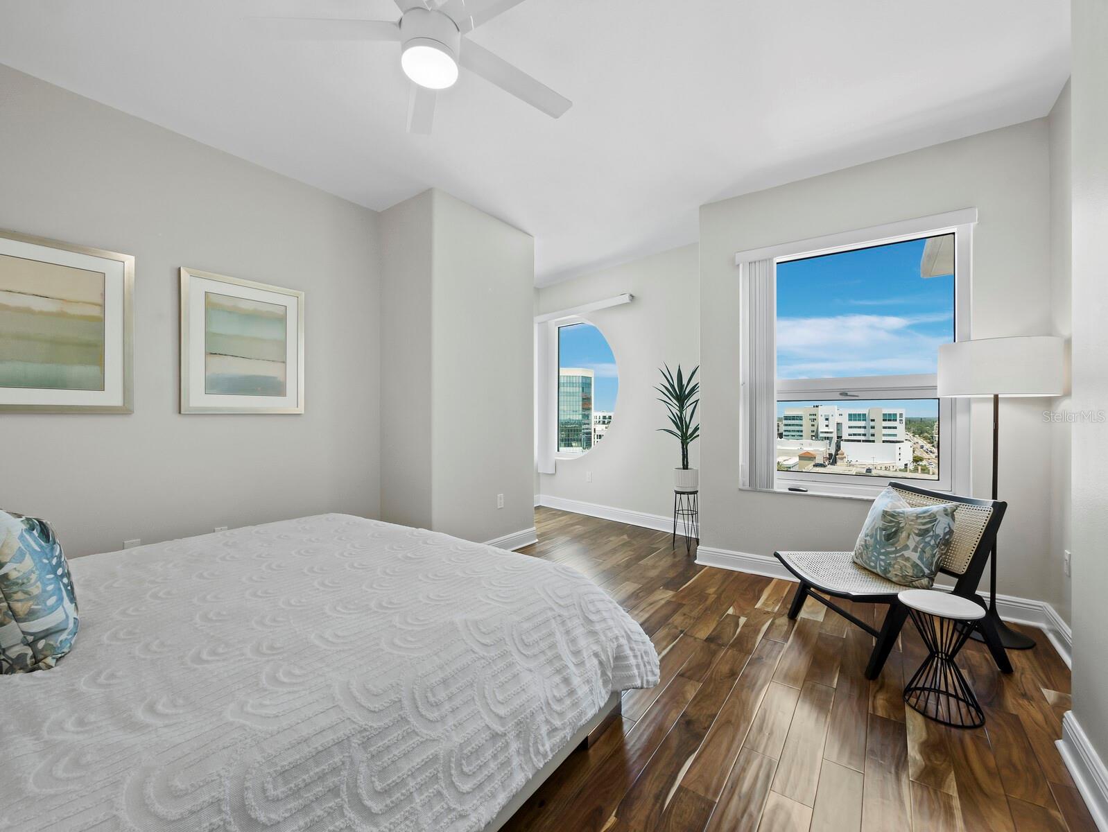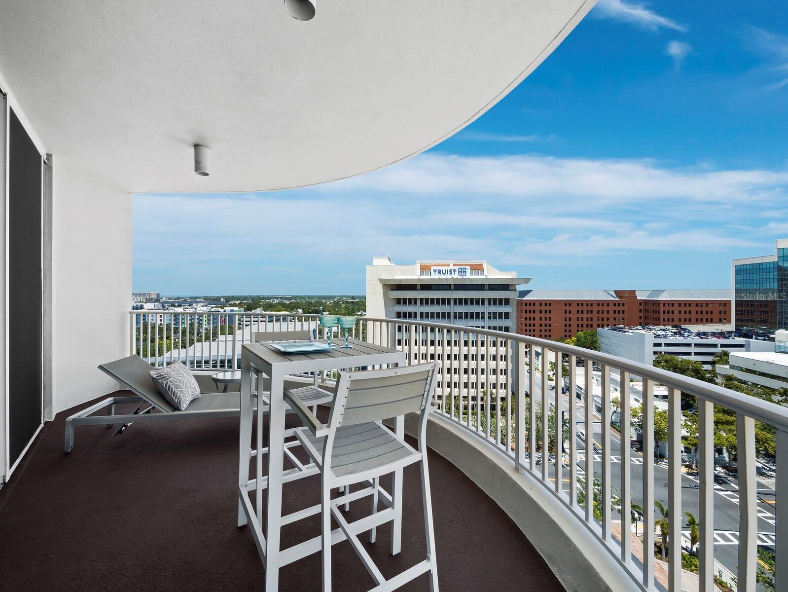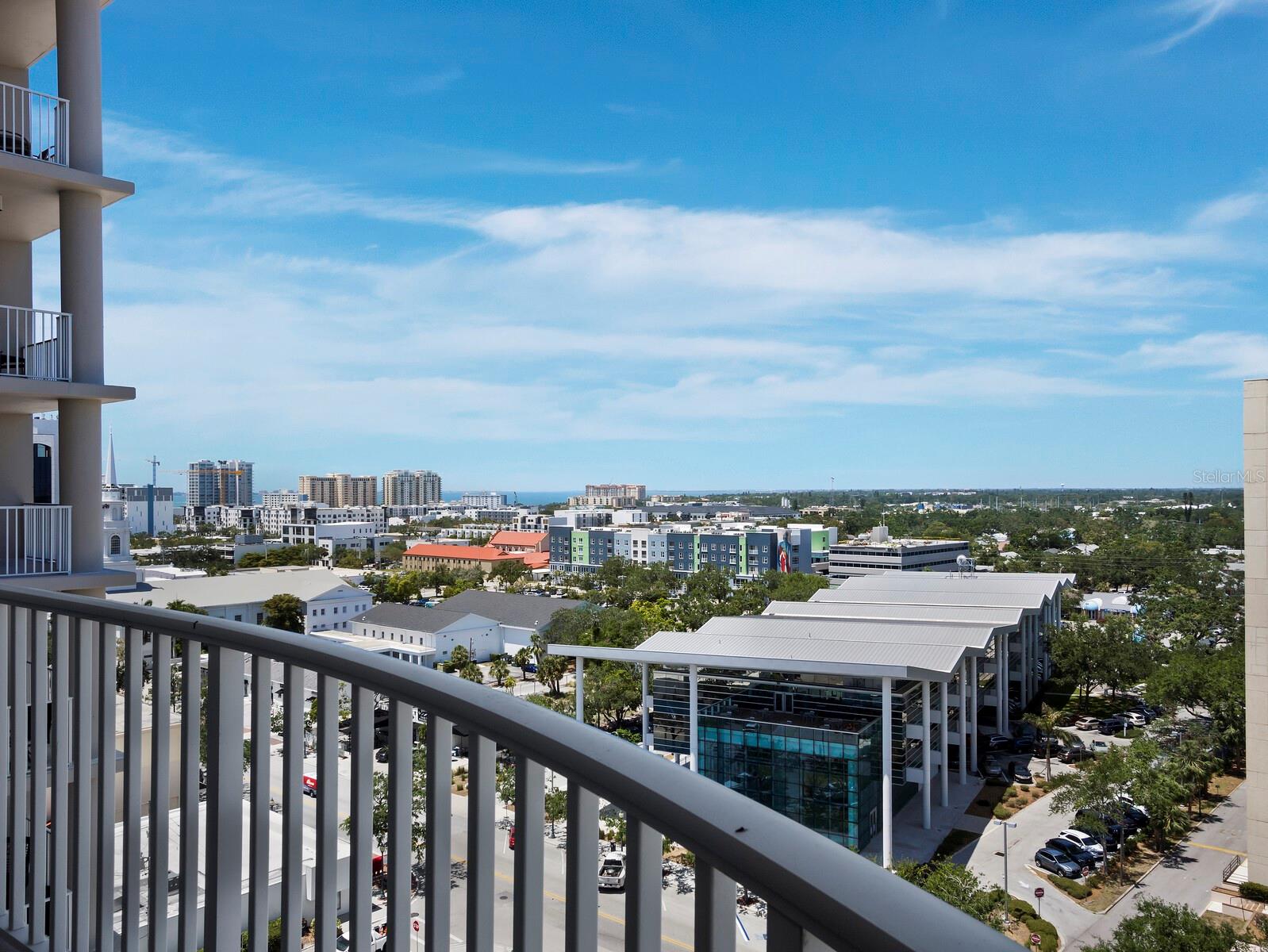 An excellent value with premium amenities in a desirable Downtown location, this high-floor residence at Rivo boasts generous living space, elevated views, and a large terrace that invites a luxurious indoor-outdoor flow. Situated on the eleventh floor of the building's preferred northeast corner, the home is oriented for gorgeous sunrise vistas, with a 16-foot wall of sliding glass doors enhancing unobstructed 270-degree views and expanding the open floor plan to the sizeable 20' x 9' balcony. Ideal for seasonal or full-time occupation, this home offers a notable price advantage for its size, with low monthly fees, two deeded parking spaces as well as plentiful guest parking, and an impressive array of amenities that include concierge, social activities, and more.Beyond the home's private foyer, the central living space is a seamless setting for comfort and convenience, encompassing a well-appointed kitchen with counter seating, a separate dining space, and a fantastic great room where double sliding doors showcase sky-high views and lead to the deep balcony for open-air dining and lounging. A welcoming and brightly lit retreat, the primary suite enjoys oversized windows, a walk-in closet, and en suite with double vanity, soaker tub, and walk-in shower. For maximum privacy, the guest bedroom is situated on the opposite side of the residence adjacent to a second full bath. Adjacent to the living room, a third bedroom adds value as flex space for working from home or occasional hospitality. A separate utility room with large-capacity washer and dryer offers convenience, while refined finishes like hardwood floors, granite countertops, and recessed lighting underpin the thoughtful design.Inspired by the elegance of luxury yachts, Rivo at Ringling features unique architectural details that celebrate maritime design, from a soaring atrium that welcomes natural light to the central conservatory, to large scale demilune windows and graciously curved private balconies. On the third floor, the amenity level includes a heated pool and spa with full sun and shade seating, grill station, fitness center, and conference and lounge spaces. Slightly east of Orange Avenue, Rivo's Downtown address enjoys proximity to restaurants, shops, and the waterfront.