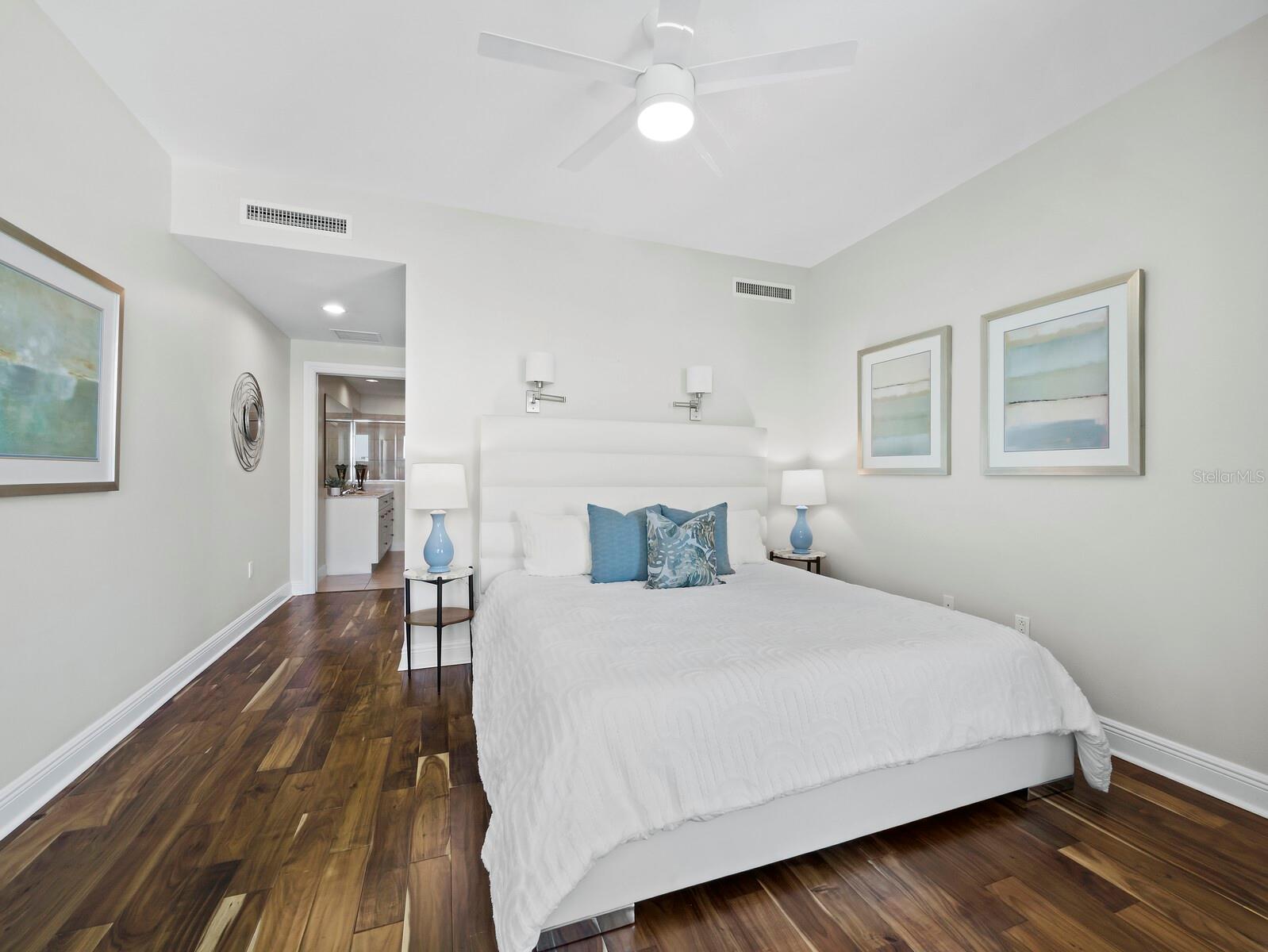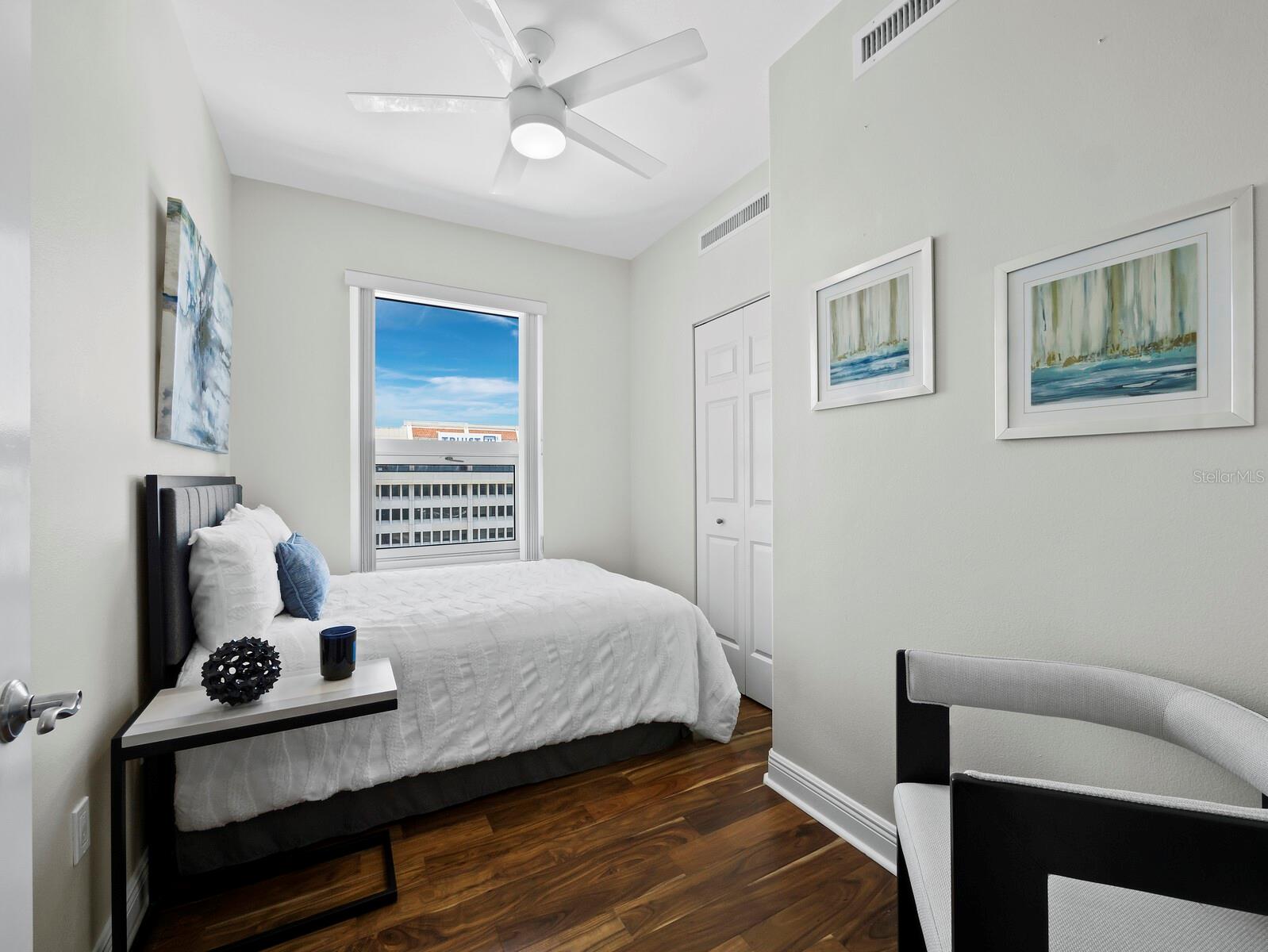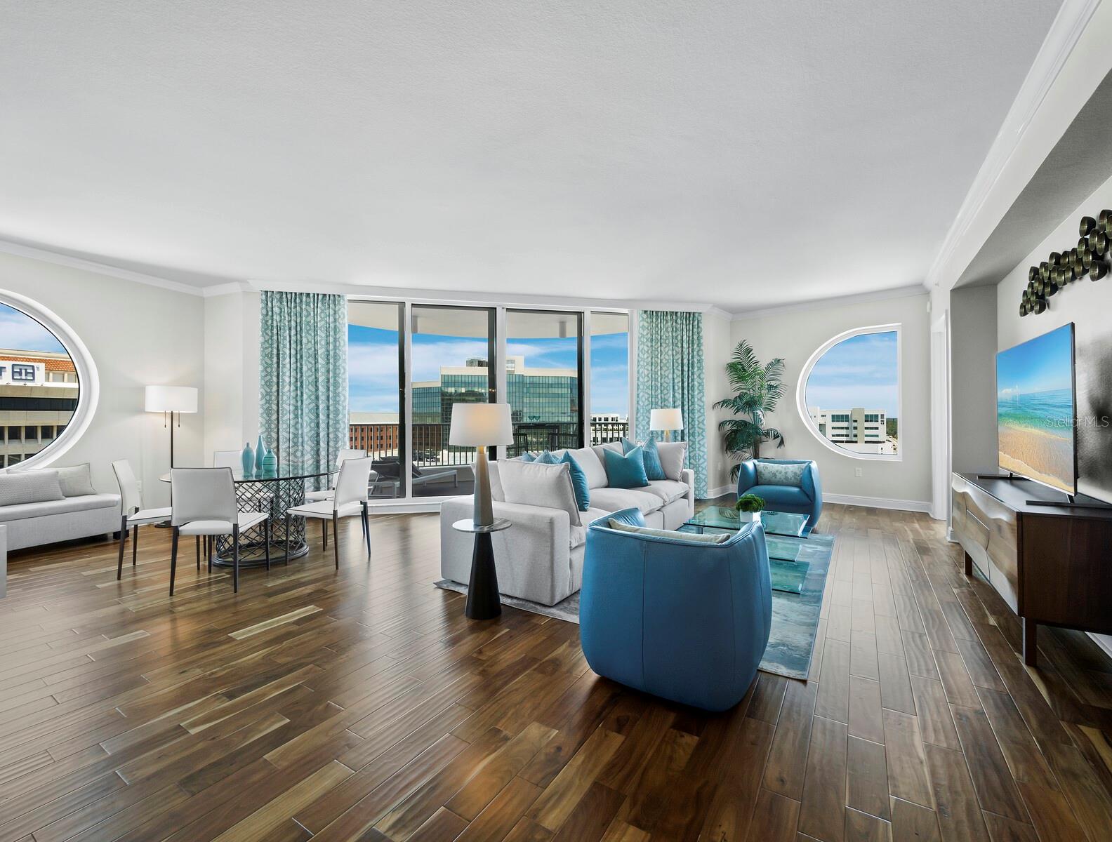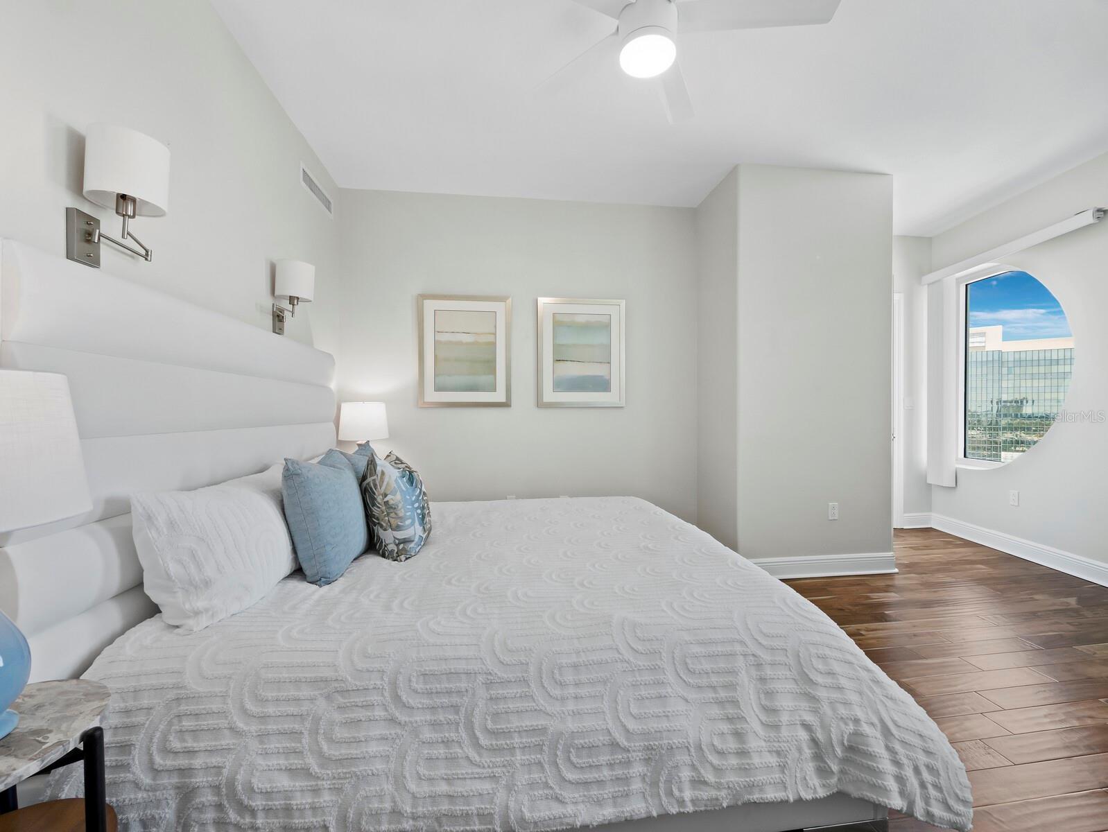An excellent value with premium amenities in a desirable Downtown location, this high-floor residence at Rivo boasts generous living space, elevated views, and a large terrace that invites a luxurious indoor-outdoor flow. Situated on the eleventh floor of the building's preferred northeast corner, the home is oriented for gorgeous sunrise vistas, with a 16-foot wall of sliding glass doors enhancing unobstructed 270-degree views and expanding the open floor plan to the sizeable 20' x 9' balcony. Ideal for seasonal or full-time occupation, this home offers a notable price advantage for its size, with low monthly fees, two deeded parking spaces as well as plentiful guest parking, and an impressive array of amenities that include concierge, social activities, and more.Beyond the home's private foyer, the central living space is a seamless setting for comfort and convenience, encompassing a well-appointed kitchen with counter seating, a separate dining space, and a fantastic great room where double sliding doors showcase sky-high views and lead to the deep balcony for open-air dining and lounging. A welcoming and brightly lit retreat, the primary suite enjoys oversized windows, a walk-in closet, and en suite with double vanity, soaker tub, and walk-in shower. For maximum privacy, the guest bedroom is situated on the opposite side of the residence adjacent to a second full bath. Adjacent to the living room, a third bedroom adds value as flex space for working from home or occasional hospitality. A separate utility room with large-capacity washer and dryer offers convenience, while refined finishes like hardwood floors, granite countertops, and recessed lighting underpin the thoughtful design.Inspired by the elegance of luxury yachts, Rivo at Ringling features unique architectural details that celebrate maritime design, from a soaring atrium that welcomes natural light to the central conservatory, to large scale demilune windows and graciously curved private balconies. On the third floor, the amenity level includes a heated pool and spa with full sun and shade seating, grill station, fitness center, and conference and lounge spaces. Slightly east of Orange Avenue, Rivo's Downtown address enjoys proximity to restaurants, shops, and the waterfront.