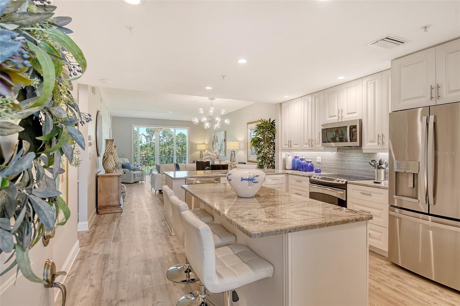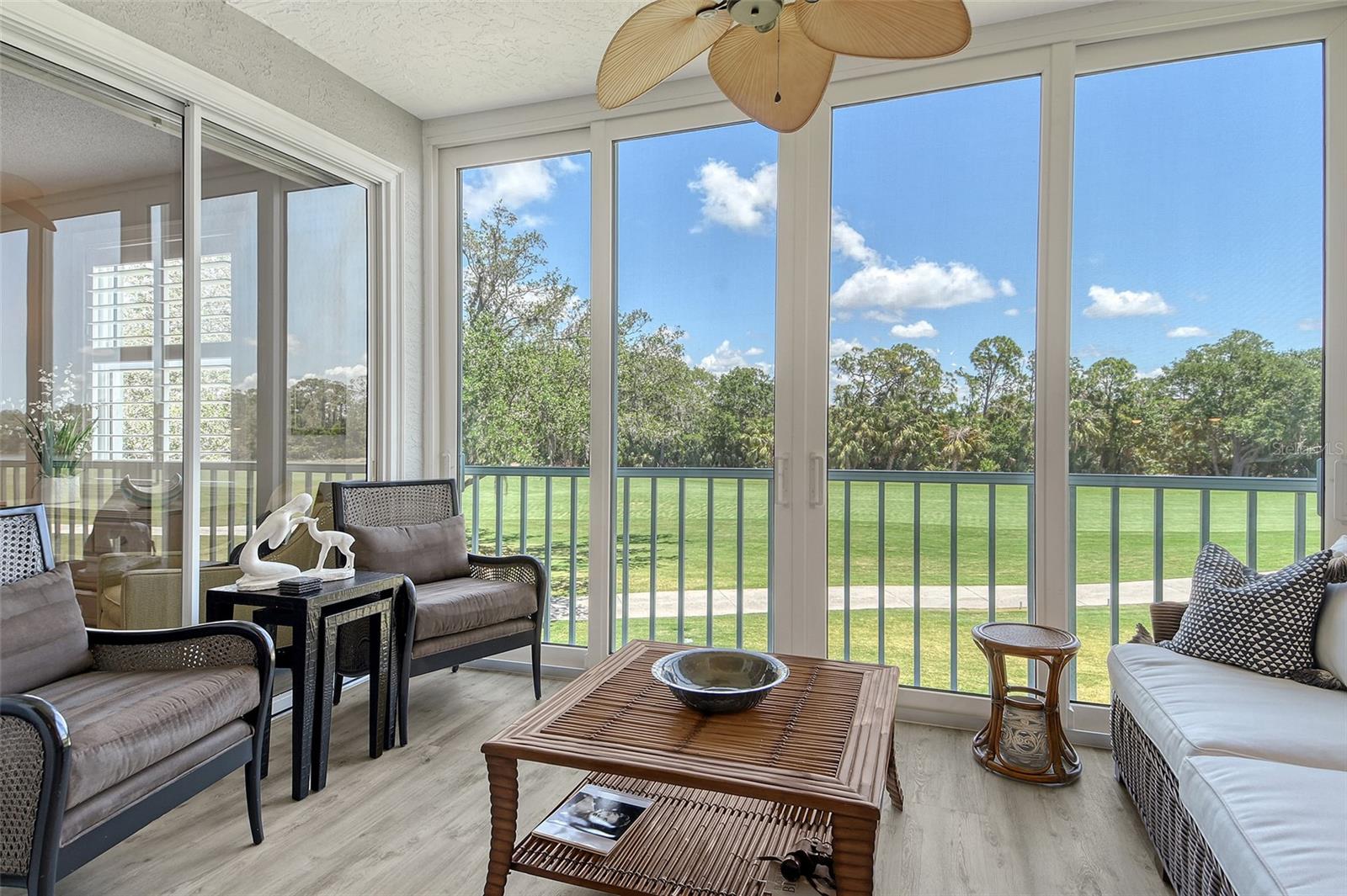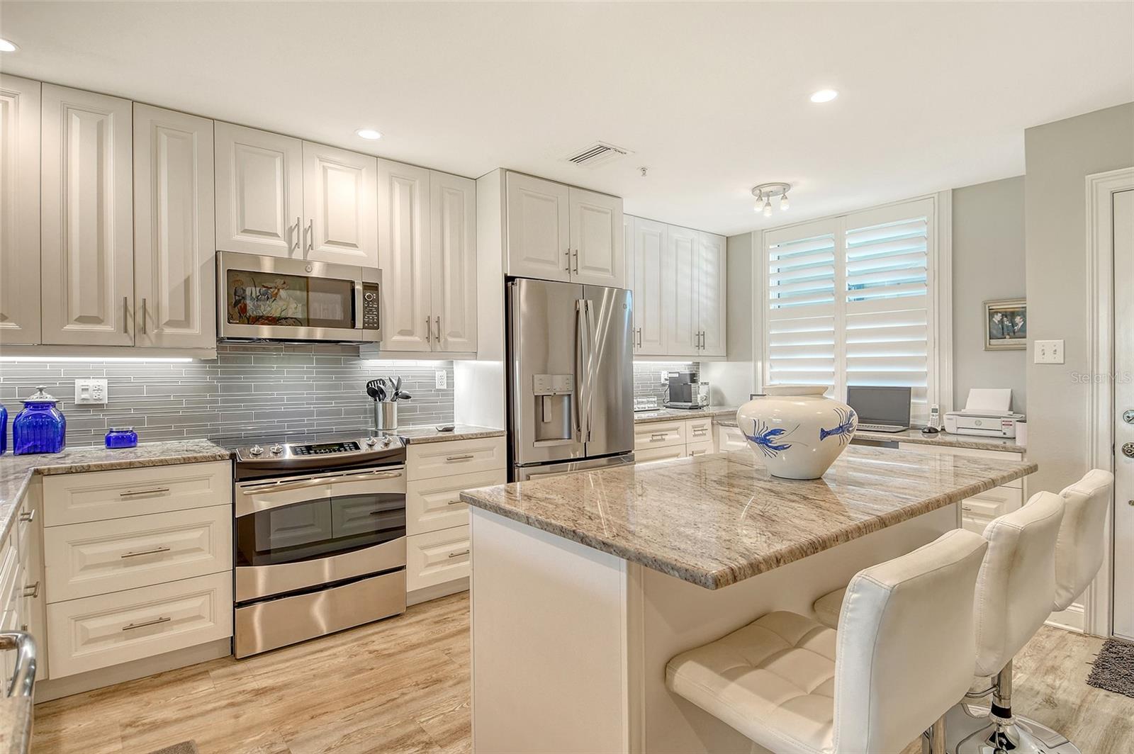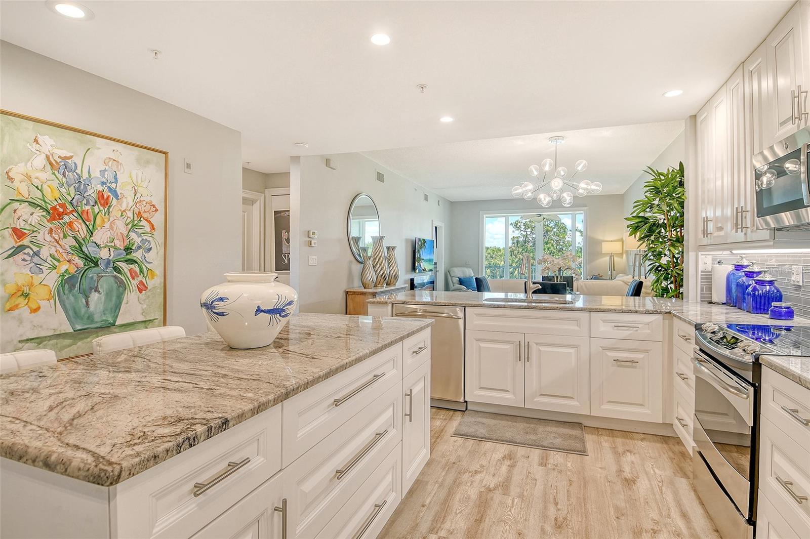 Wow!! Totally updated, modern design Condo Home with large Glassed-in Lanai featuring views of the 8th fairway and preserves. Completely updated Kitchen with Island design, granite counters, stainless steel appliances, glass tiled backsplash and built in desk area. Modern Luxury Vinyl floors through out! Plantation Shutters! Beautiful fixtures throughout the home. Primary Bedroom has its own slider to the lanai area, updated Primary Bathroom with twin sinks, additional cabinetry storage, updated shower. Guest quarters bath updated. The Terraces is a very active community with nightly gatherings, grills for owners use, carport and additional storage shed, community pool and pickleball/tennis court for the unit's owners. A premier member-owned country club, Stoneybrook of Sarasota, is only a short distance from Siesta Key and offers easy access to shopping and borders the Legacy Trail. Ownership in Stoneybrook Golf and Country Club includes an updated clubhouse and restaurant, Har-Tru tennis facility, well-equipped fitness center and additional club pool and spa. Nestled between Downtown Sarasota and Downtown Venice. In 2024, the Golf Course went through a complete redesign and is now complete and open to the members! Schedule your tour of this amazing unit before its too late.