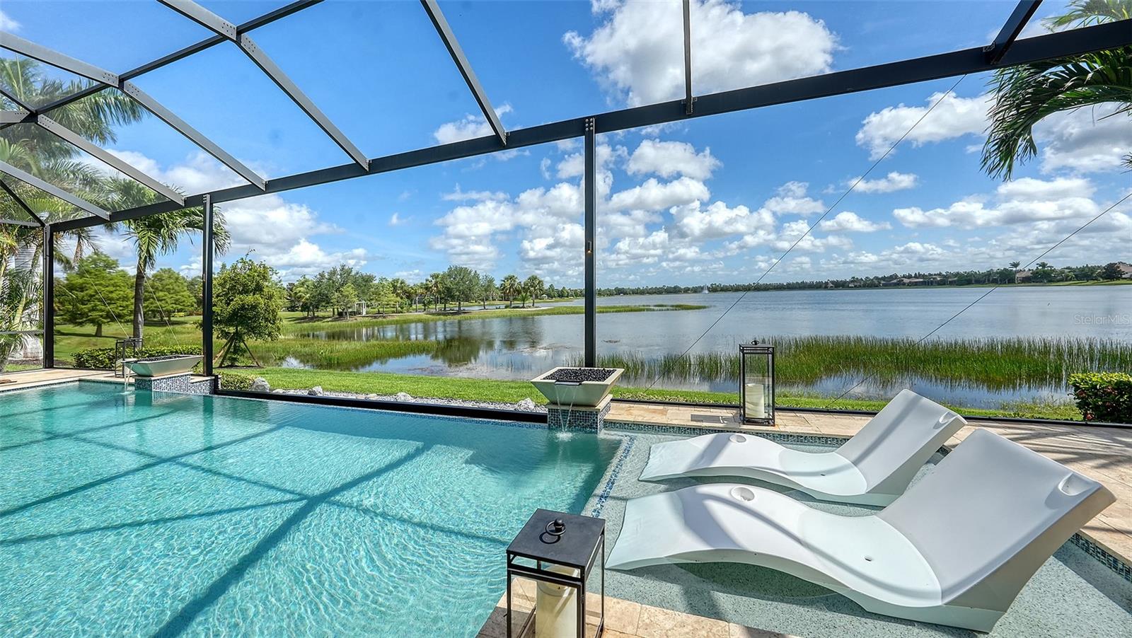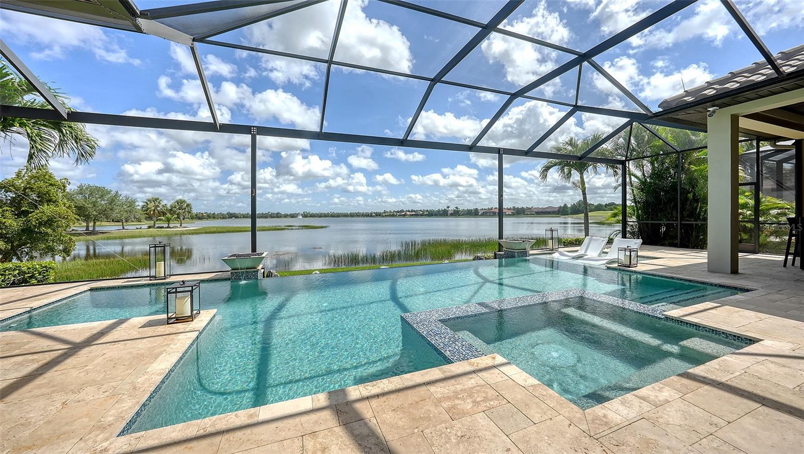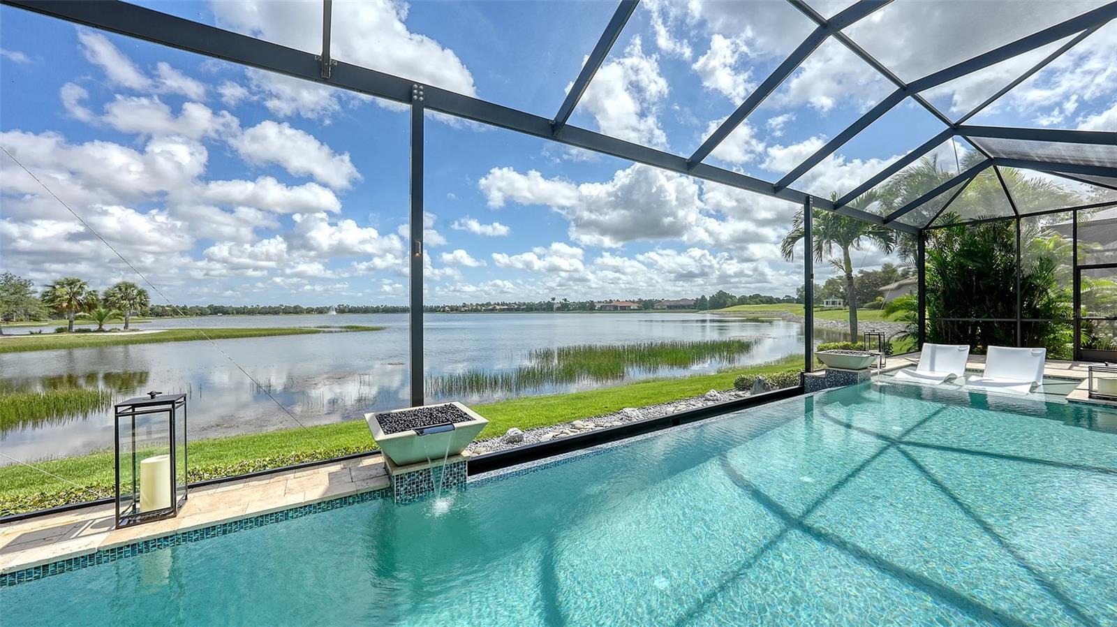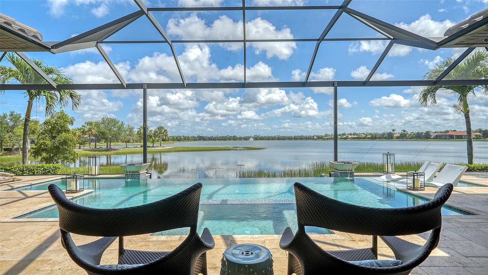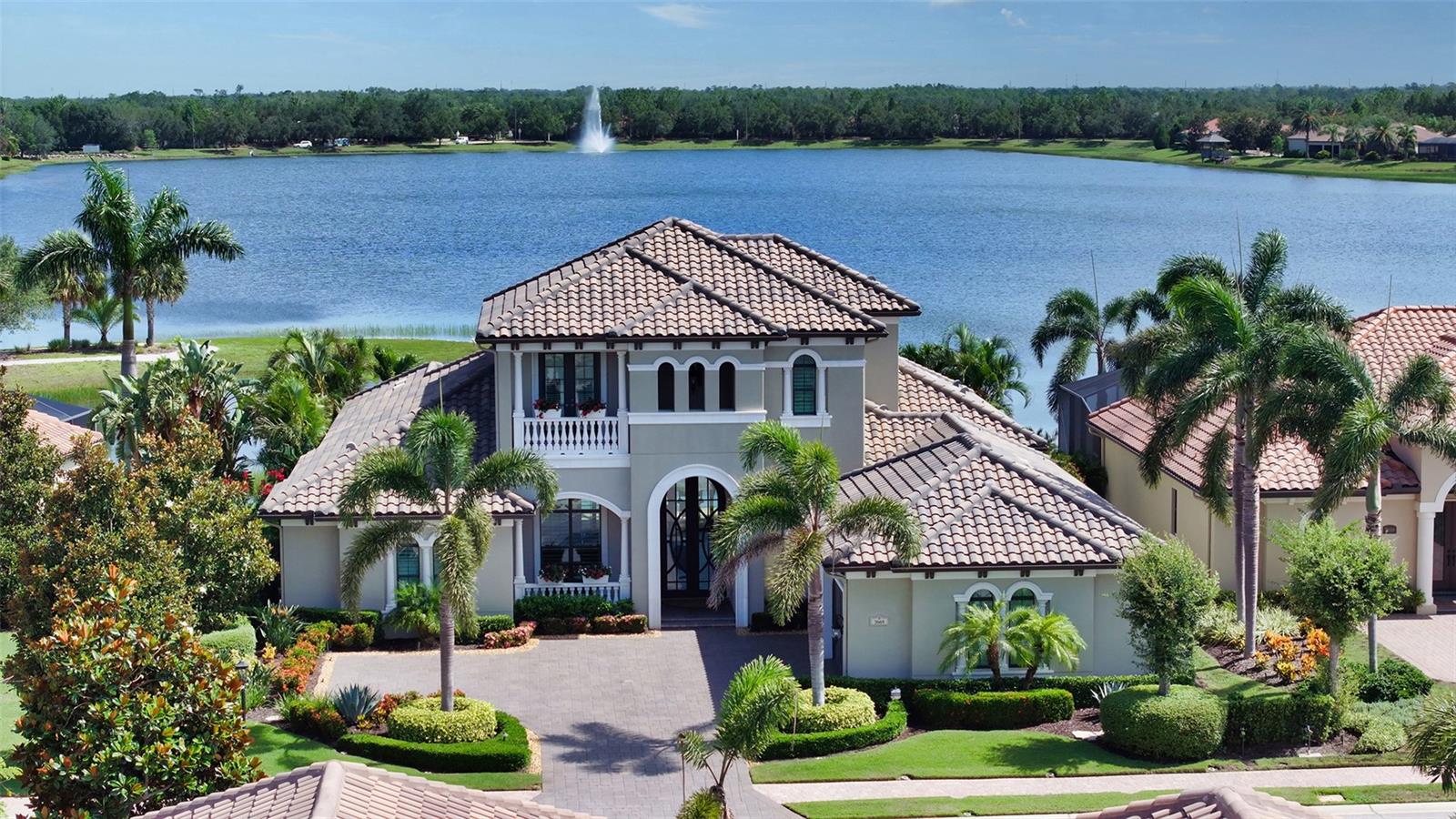 Unparalleled luxury and privacy await in this custom-designed Arthur Rutenberg home, perfectly situated in the gated community of Country Club East in Lakewood Ranch. From the moment you arrive, you'll be captivated by the stunning curb appeal, with impeccably upgraded landscaping, exterior lighting, and a stately presence that sets this home apart. Positioned on a premium homesite with unobstructed, panoramic long lake views, this residence offers a rare combination of elegance and seclusion.Step inside to a sophisticated interior where thoughtful design meets modern convenience. The open living space is anchored by pocketing sliders that lead to an exceptional outdoor oasis featuring a resort-style infinity-edge pool and spa with fire bowls and water feature, wood-paneled ceilings, a covered lanai with a cozy outdoor fireplace seating area, an outdoor kitchen, and convenient access to a cabana bath--ideal for both relaxing and entertaining year-round. Inside, the gourmet kitchen is a dream for any chef, complete with granite countertops, a marble stone backsplash, built-in oven, cooktop, large island with seating and storage, and a walk-in pantry.The main floor features a luxurious primary suite overlooking the lake, as well as a private guest suite and a dedicated office. Upstairs, two additional guest suites and a spacious bonus room with a wet bar open to a rear balcony, creating the perfect retreat for family or guests. Throughout the home, you'll find high-end finishes including porcelain tile and engineered hardwood floors, solid wood interior core doors, as well as advanced features such as whole-house Control4 smart home technology, whole-house audio, central vacuum, and a dedicated wine area for entertaining.Built for comfort and efficiency, the home includes a whole-house generator, impact glass windows and doors, energy-efficient Icynene insulation, and ample storage throughout. The garage is equally impressive with split AC, an EV charger, and extensive built-in storage solutions.This is a rare opportunity to own one of the most thoughtfully designed and immaculately maintained homes in Country Club East, where luxury meets lifestyle in the heart of Lakewood Ranch. Schedule your private showing today and experience the serenity, sophistication, and smart living this exceptional property offers.