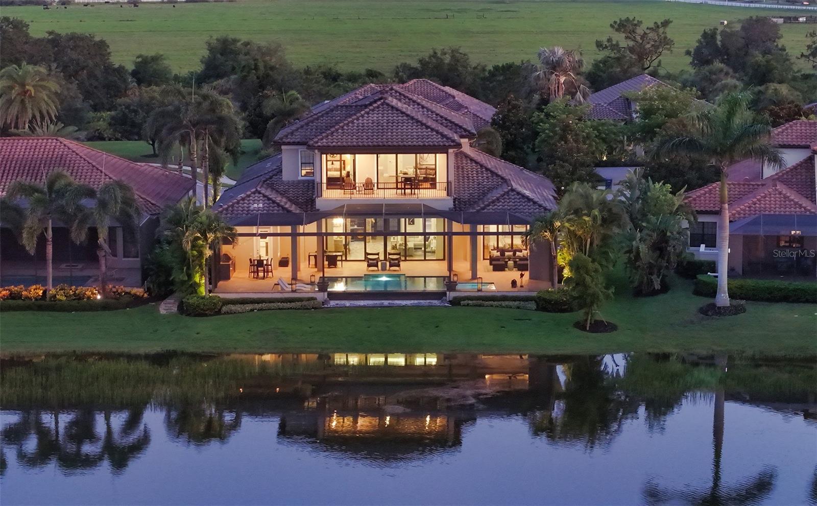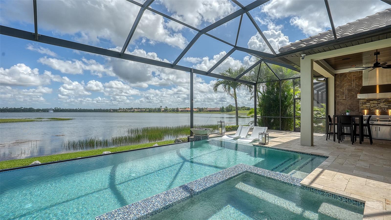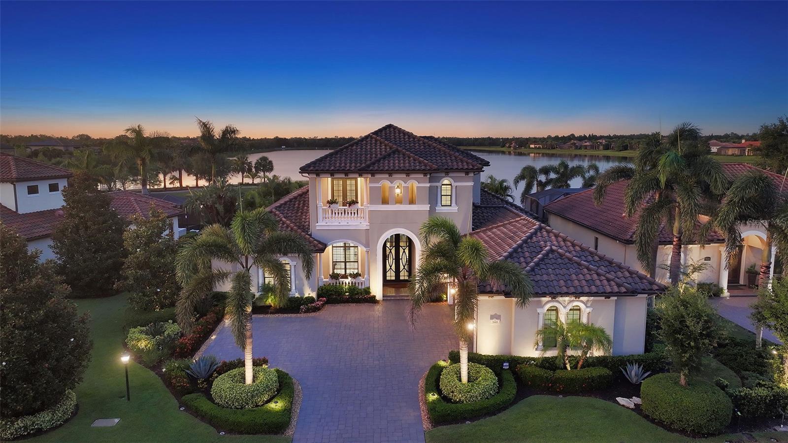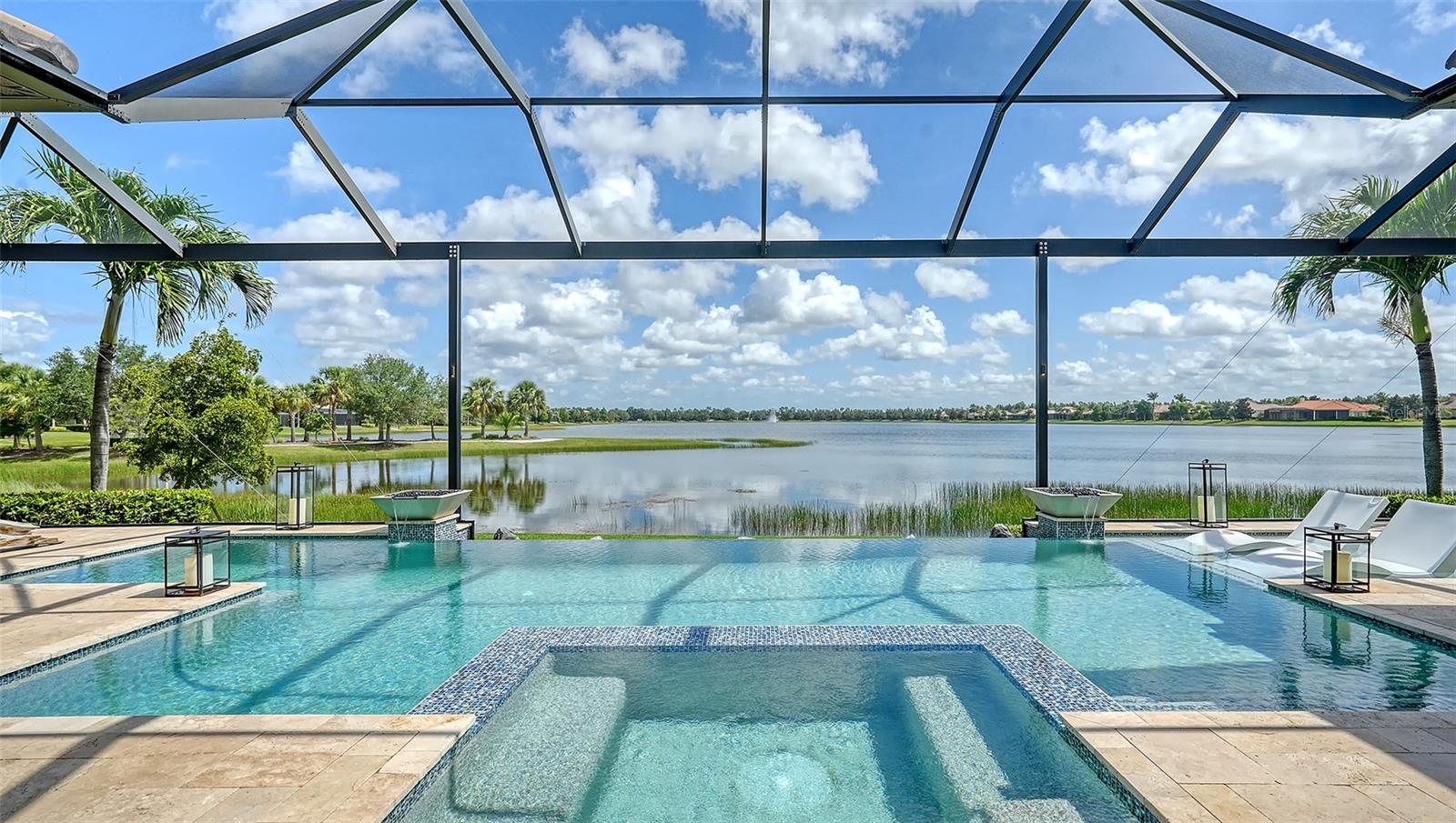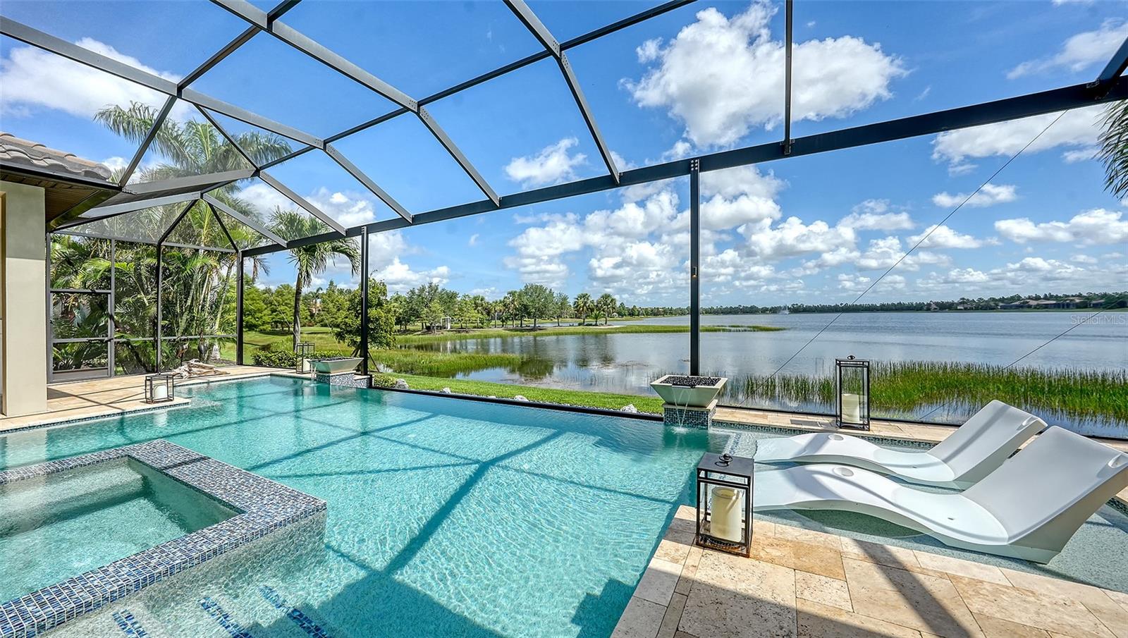 Unparalleled luxury and privacy await in this custom-designed Arthur Rutenberg home, perfectly situated in the gated community of Country Club East in Lakewood Ranch. From the moment you arrive, you'll be captivated by the stunning curb appeal, with impeccably upgraded landscaping, exterior lighting, and a stately presence that sets this home apart. Positioned on a premium homesite with unobstructed, panoramic long lake views, this residence offers a rare combination of elegance and seclusion.Step inside to a sophisticated interior where thoughtful design meets modern convenience. The open living space is anchored by pocketing sliders that lead to an exceptional outdoor oasis featuring a resort-style infinity-edge pool and spa with fire bowls and water feature, wood-paneled ceilings, a covered lanai with a cozy outdoor fireplace seating area, an outdoor kitchen, and convenient access to a cabana bath--ideal for both relaxing and entertaining year-round. Inside, the gourmet kitchen is a dream for any chef, complete with granite countertops, a marble stone backsplash, built-in oven, cooktop, large island with seating and storage, and a walk-in pantry.The main floor features a luxurious primary suite overlooking the lake, as well as a private guest suite and a dedicated office. Upstairs, two additional guest suites and a spacious bonus room with a wet bar open to a rear balcony, creating the perfect retreat for family or guests. Throughout the home, you'll find high-end finishes including porcelain tile and engineered hardwood floors, solid wood interior core doors, as well as advanced features such as whole-house Control4 smart home technology, whole-house audio, central vacuum, and a dedicated wine area for entertaining.Built for comfort and efficiency, the home includes a whole-house generator, impact glass windows and doors, energy-efficient Icynene insulation, and ample storage throughout. The garage is equally impressive with split AC, an EV charger, and extensive built-in storage solutions.This is a rare opportunity to own one of the most thoughtfully designed and immaculately maintained homes in Country Club East, where luxury meets lifestyle in the heart of Lakewood Ranch. Schedule your private showing today and experience the serenity, sophistication, and smart living this exceptional property offers.
