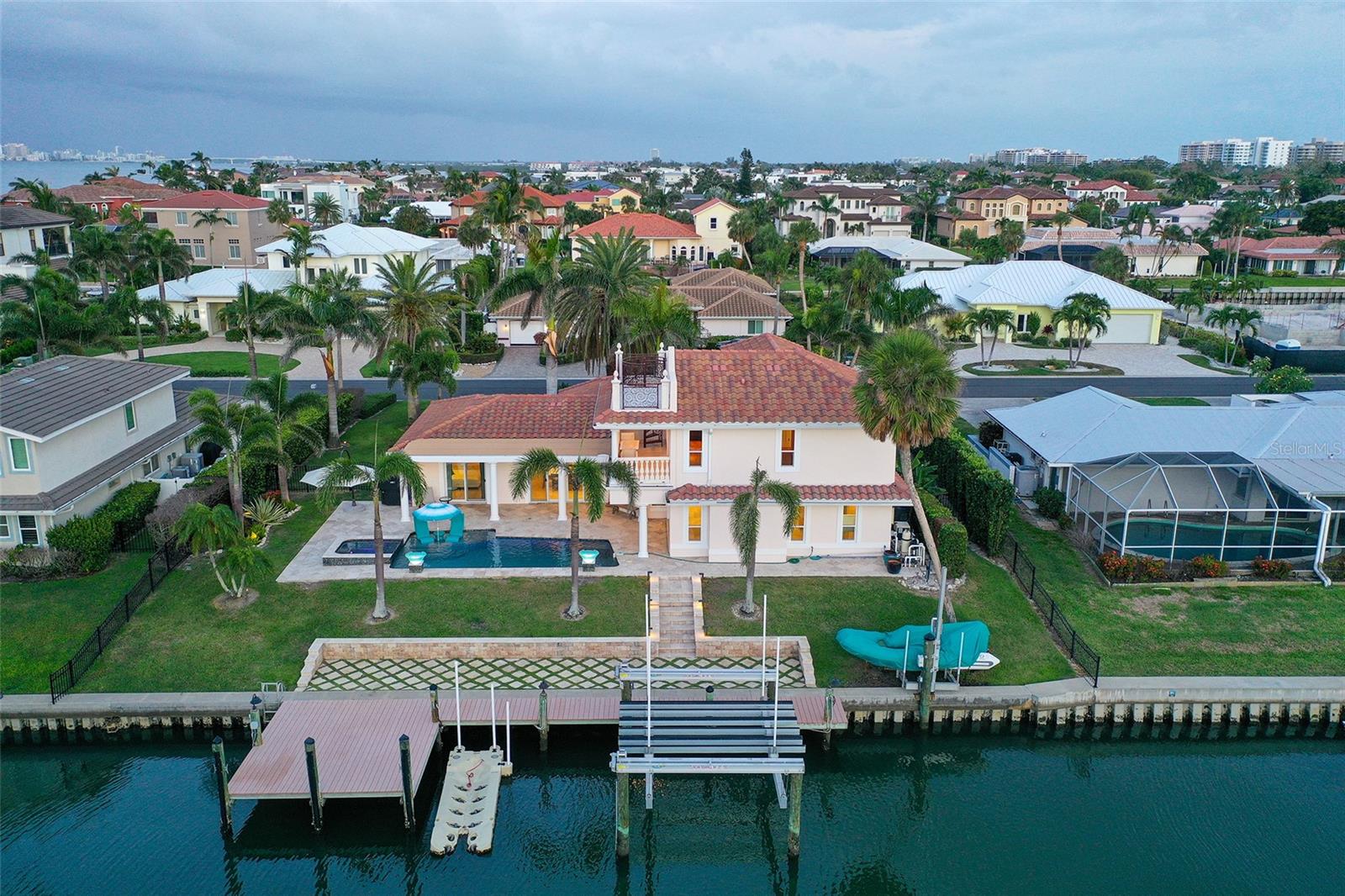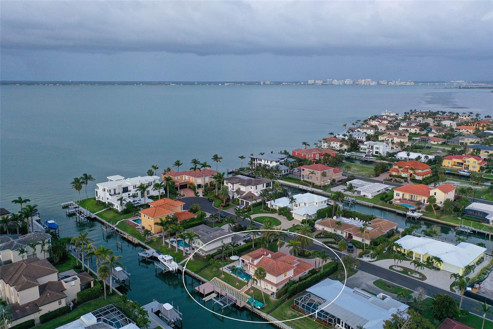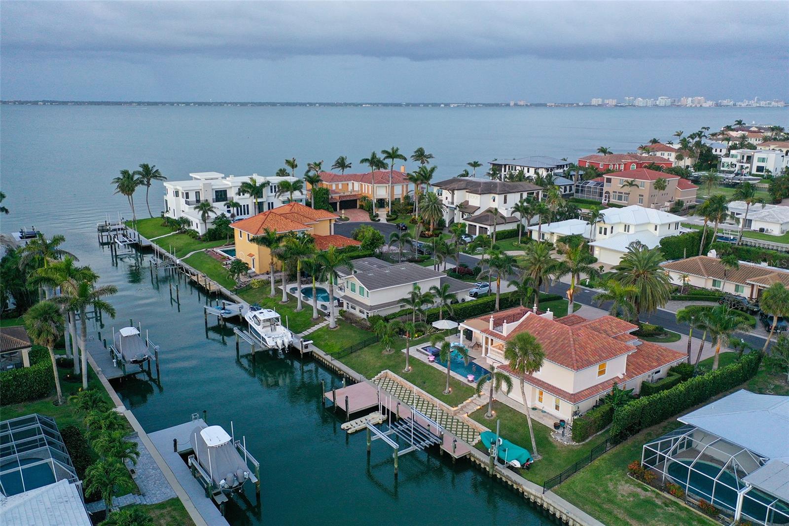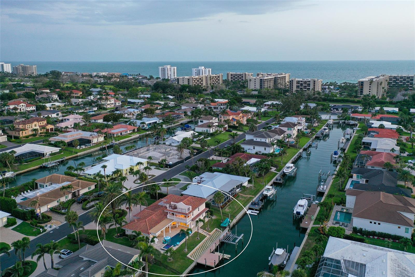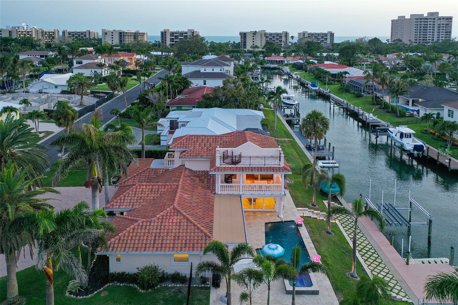 Country Club Shores at its finest. Three homes in from the bay. Attention to detail has created a spectacular updated home, featuring a newer kitchen and appliances, porcelain tile in two bedrooms, newly refinished marble flooring in common areas and baths, custom light fixtures, doors, and trim, along with crown molding. The home is finished with updated high-impact windows and sliders. The details have been extended to the finely appointed, updated baths, featuring marble counters throughout. A wet bar with an ice maker, conveniently just off the family room, makes an excellent feature for you and your guests. A main floor office in addition to two guest bedrooms, one with an en-suite bath, with an abundance of built-ins, with access to the pool and spa, and the other with private access to the full guest bath. The second level features a private primary suite oasis, complete with a balcony and a rooftop terrace, accessed by a spiral staircase offering views of the canal, spectacular sunrises, sunsets, and the Intracoastal Waterway. The primary bath comes complete with double sinks imported from Italy, a claw tub, and a separate shower. If you're looking for a custom walk-in closet, look no further - this home features one. The home features an additional fuel source, a 250-gallon propane tank, which provides gas cooking on the five-burner countertop kitchen range, heating for the hot water tank and spa, and is also roughed in for use on the rooftop terrace. Both the saltwater pool and spa underwent remodeling, featuring the added luxury of shallow pool lounging and flowing water fountains. The garage features its mini-split air conditioning unit, enabling you to work extended hours on projects. The dock comes complete with a 20,000-pound boat lift, a jet ski lift, electricity, and a jet ski port. The inspiring exterior custom lighting transforms the day into an evening of soft flickering glows with accents of palm trees, landscaping, and architectural splendor. Luxury has no boundaries in this renovated, finely appointed canal-front home, with deeded beach access just across the Gulf of Mexico Drive at the crosswalk. South of Publix, CVS, banks, places of worship, public tennis, and a short drive to St. Armands Circle, along with Sarasota and all it offers.
