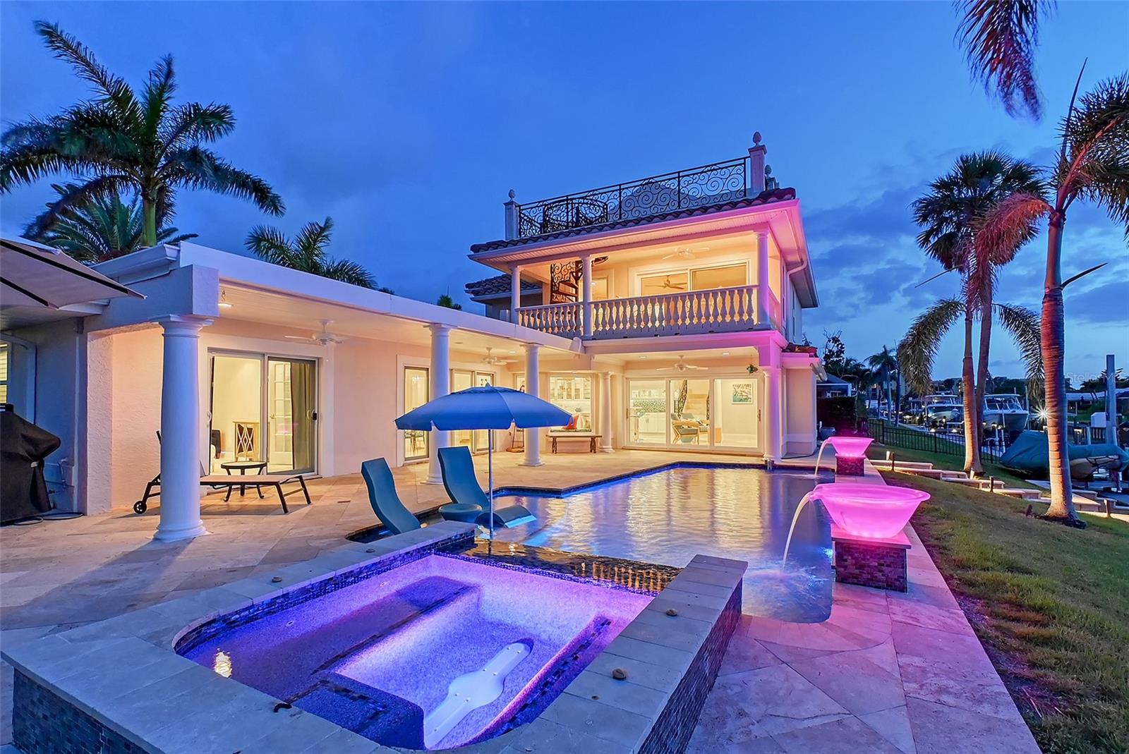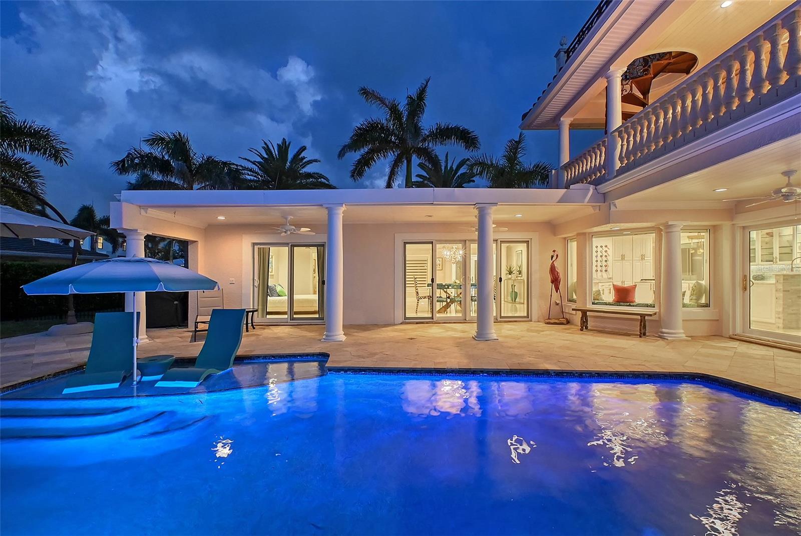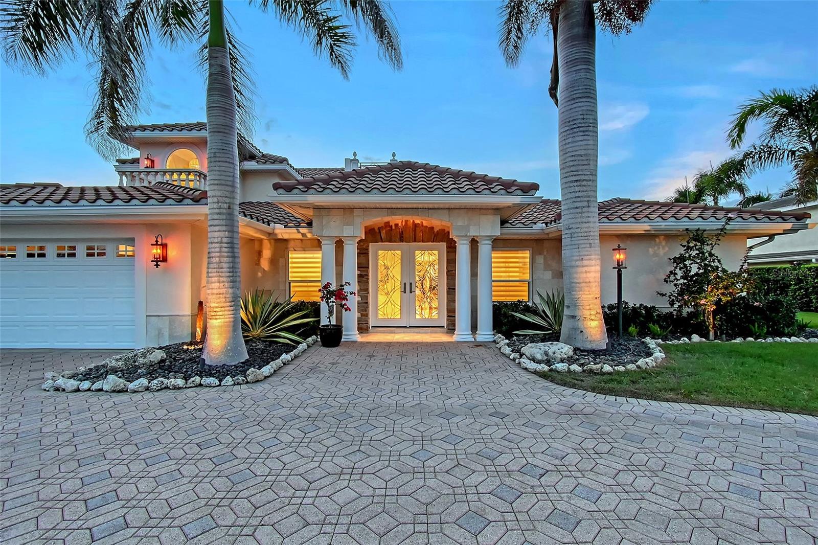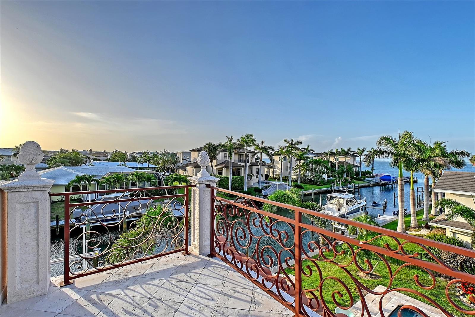 Country Club Shores at its finest. Three homes in from the bay. Attention to detail has created a spectacular updated home, featuring a newer kitchen and appliances, porcelain tile in two bedrooms, newly refinished marble flooring in common areas and baths, custom light fixtures, doors, and trim, along with crown molding. The home is finished with updated high-impact windows and sliders. The details have been extended to the finely appointed, updated baths, featuring marble counters throughout. A wet bar with an ice maker, conveniently just off the family room, makes an excellent feature for you and your guests. A main floor office in addition to two guest bedrooms, one with an en-suite bath, with an abundance of built-ins, with access to the pool and spa, and the other with private access to the full guest bath. The second level features a private primary suite oasis, complete with a balcony and a rooftop terrace, accessed by a spiral staircase offering views of the canal, spectacular sunrises, sunsets, and the Intracoastal Waterway. The primary bath comes complete with double sinks imported from Italy, a claw tub, and a separate shower. If you're looking for a custom walk-in closet, look no further - this home features one. The home features an additional fuel source, a 250-gallon propane tank, which provides gas cooking on the five-burner countertop kitchen range, heating for the hot water tank and spa, and is also roughed in for use on the rooftop terrace. Both the saltwater pool and spa underwent remodeling, featuring the added luxury of shallow pool lounging and flowing water fountains. The garage features its mini-split air conditioning unit, enabling you to work extended hours on projects. The dock comes complete with a 20,000-pound boat lift, a jet ski lift, electricity, and a jet ski port. The inspiring exterior custom lighting transforms the day into an evening of soft flickering glows with accents of palm trees, landscaping, and architectural splendor. Luxury has no boundaries in this renovated, finely appointed canal-front home, with deeded beach access just across the Gulf of Mexico Drive at the crosswalk. South of Publix, CVS, banks, places of worship, public tennis, and a short drive to St. Armands Circle, along with Sarasota and all it offers.