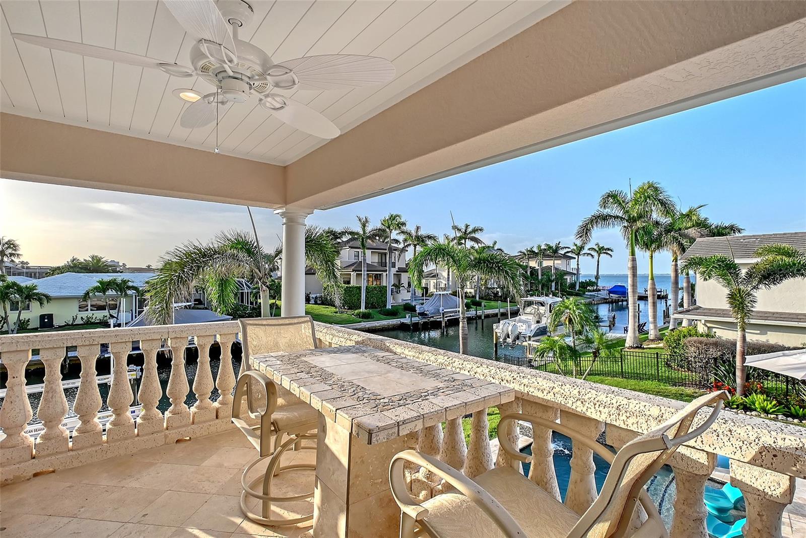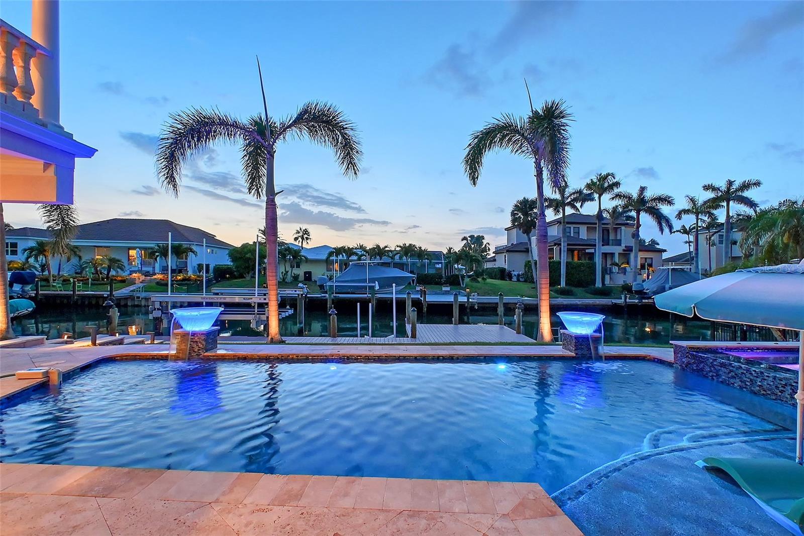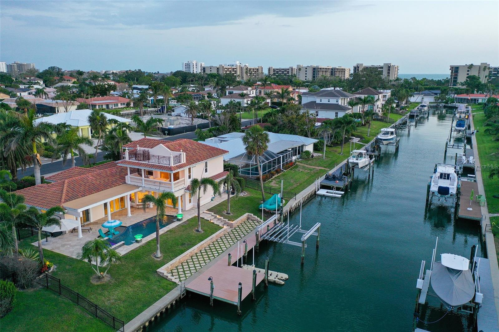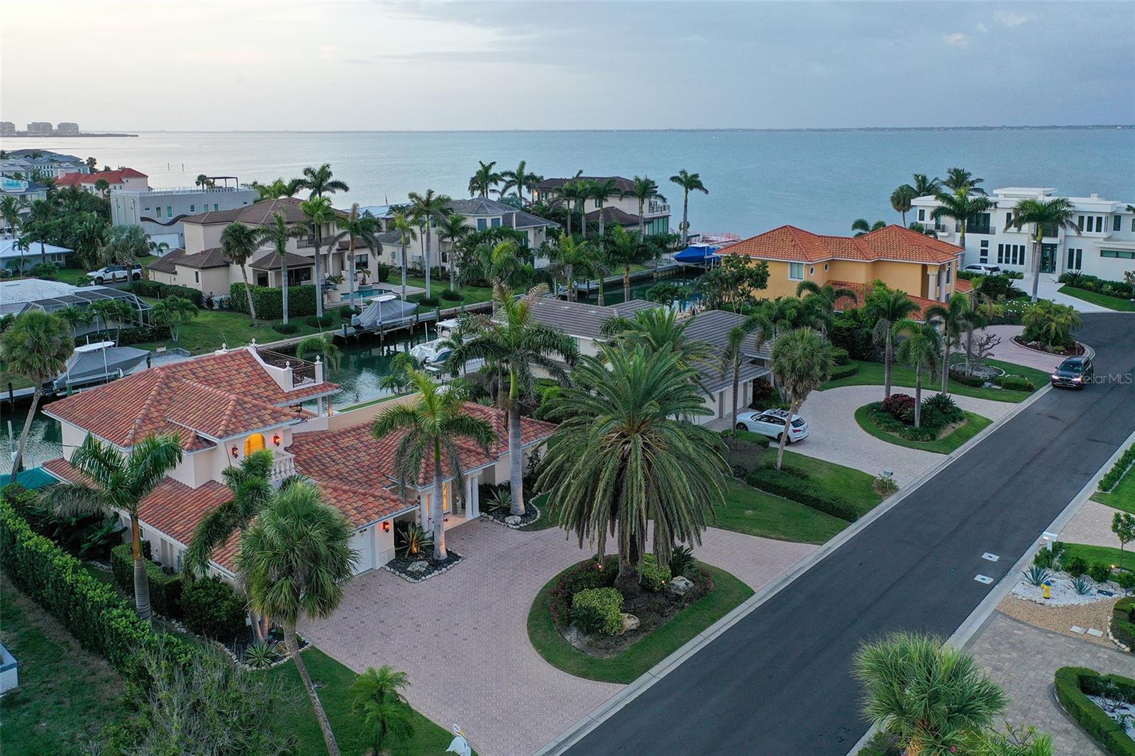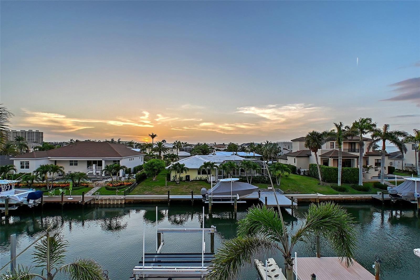 Country Club Shores at its finest. Three homes in from the bay. Attention to detail has created a spectacular updated home, featuring a newer kitchen and appliances, porcelain tile in two bedrooms, newly refinished marble flooring in common areas and baths, custom light fixtures, doors, and trim, along with crown molding. The home is finished with updated high-impact windows and sliders. The details have been extended to the finely appointed, updated baths, featuring marble counters throughout. A wet bar with an ice maker, conveniently just off the family room, makes an excellent feature for you and your guests. A main floor office in addition to two guest bedrooms, one with an en-suite bath, with an abundance of built-ins, with access to the pool and spa, and the other with private access to the full guest bath. The second level features a private primary suite oasis, complete with a balcony and a rooftop terrace, accessed by a spiral staircase offering views of the canal, spectacular sunrises, sunsets, and the Intracoastal Waterway. The primary bath comes complete with double sinks imported from Italy, a claw tub, and a separate shower. If you're looking for a custom walk-in closet, look no further - this home features one. The home features an additional fuel source, a 250-gallon propane tank, which provides gas cooking on the five-burner countertop kitchen range, heating for the hot water tank and spa, and is also roughed in for use on the rooftop terrace. Both the saltwater pool and spa underwent remodeling, featuring the added luxury of shallow pool lounging and flowing water fountains. The garage features its mini-split air conditioning unit, enabling you to work extended hours on projects. The dock comes complete with a 20,000-pound boat lift, a jet ski lift, electricity, and a jet ski port. The inspiring exterior custom lighting transforms the day into an evening of soft flickering glows with accents of palm trees, landscaping, and architectural splendor. Luxury has no boundaries in this renovated, finely appointed canal-front home, with deeded beach access just across the Gulf of Mexico Drive at the crosswalk. South of Publix, CVS, banks, places of worship, public tennis, and a short drive to St. Armands Circle, along with Sarasota and all it offers.