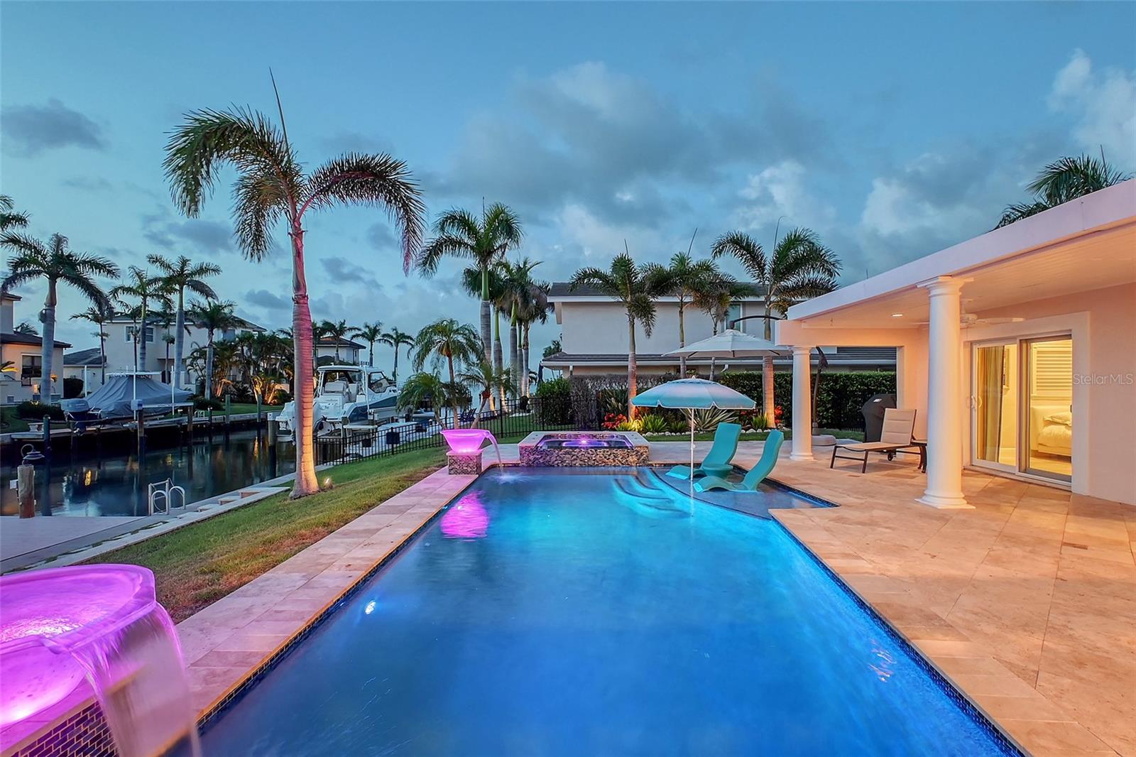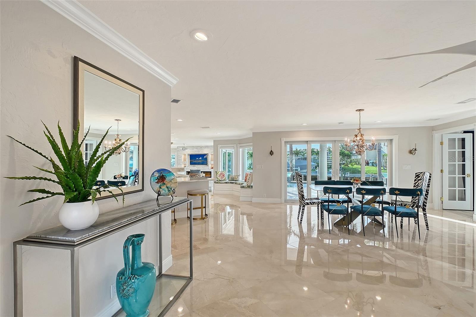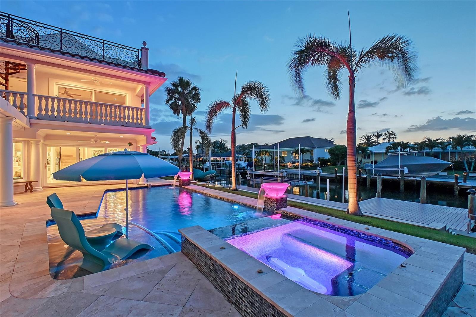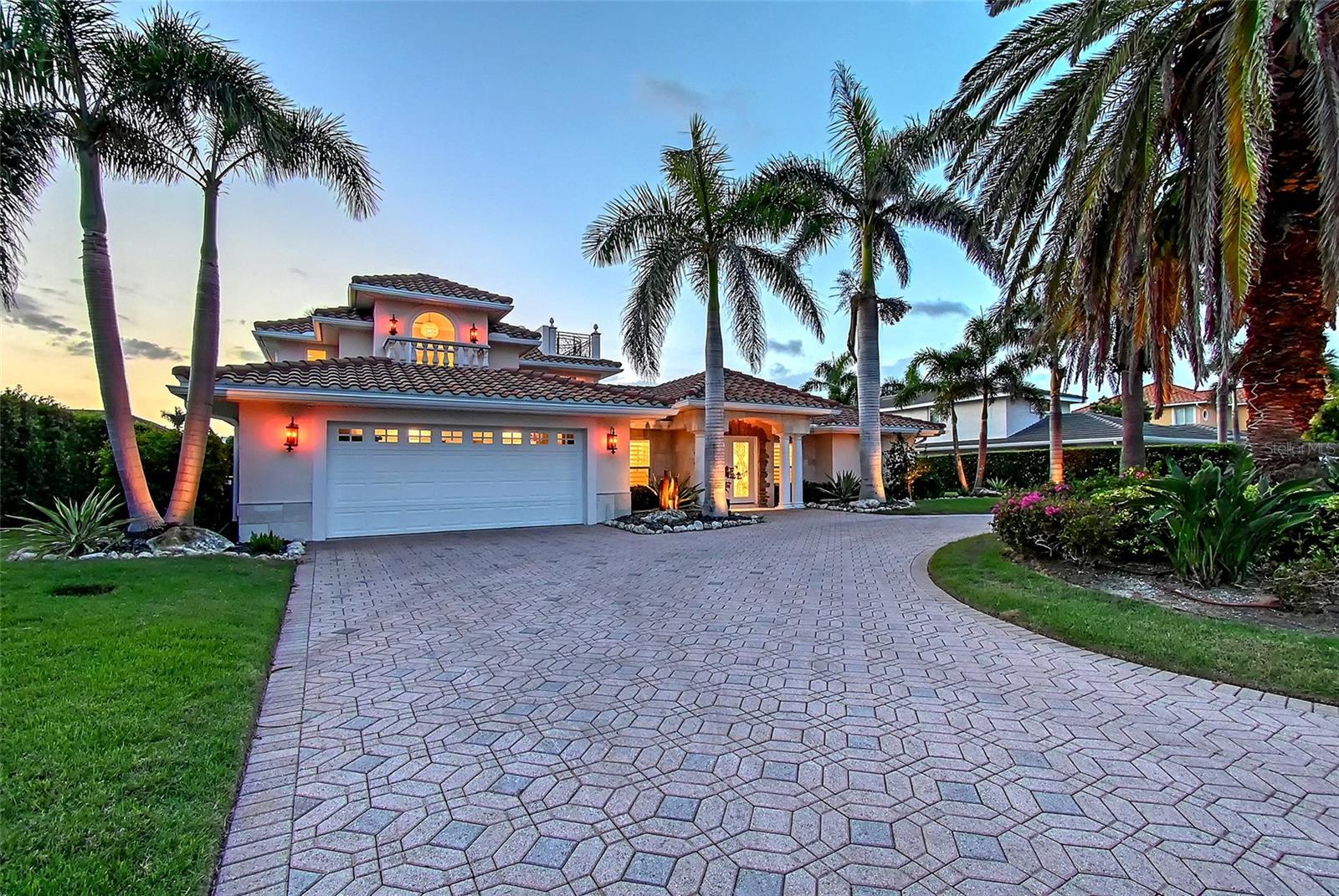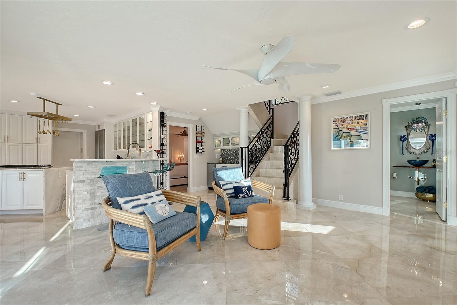 Country Club Shores at its finest. Three homes in from the bay. Attention to detail has created a spectacular updated home, featuring a newer kitchen and appliances, porcelain tile in two bedrooms, newly refinished marble flooring in common areas and baths, custom light fixtures, doors, and trim, along with crown molding. The home is finished with updated high-impact windows and sliders. The details have been extended to the finely appointed, updated baths, featuring marble counters throughout. A wet bar with an ice maker, conveniently just off the family room, makes an excellent feature for you and your guests. A main floor office in addition to two guest bedrooms, one with an en-suite bath, with an abundance of built-ins, with access to the pool and spa, and the other with private access to the full guest bath. The second level features a private primary suite oasis, complete with a balcony and a rooftop terrace, accessed by a spiral staircase offering views of the canal, spectacular sunrises, sunsets, and the Intracoastal Waterway. The primary bath comes complete with double sinks imported from Italy, a claw tub, and a separate shower. If you're looking for a custom walk-in closet, look no further - this home features one. The home features an additional fuel source, a 250-gallon propane tank, which provides gas cooking on the five-burner countertop kitchen range, heating for the hot water tank and spa, and is also roughed in for use on the rooftop terrace. Both the saltwater pool and spa underwent remodeling, featuring the added luxury of shallow pool lounging and flowing water fountains. The garage features its mini-split air conditioning unit, enabling you to work extended hours on projects. The dock comes complete with a 20,000-pound boat lift, a jet ski lift, electricity, and a jet ski port. The inspiring exterior custom lighting transforms the day into an evening of soft flickering glows with accents of palm trees, landscaping, and architectural splendor. Luxury has no boundaries in this renovated, finely appointed canal-front home, with deeded beach access just across the Gulf of Mexico Drive at the crosswalk. South of Publix, CVS, banks, places of worship, public tennis, and a short drive to St. Armands Circle, along with Sarasota and all it offers.