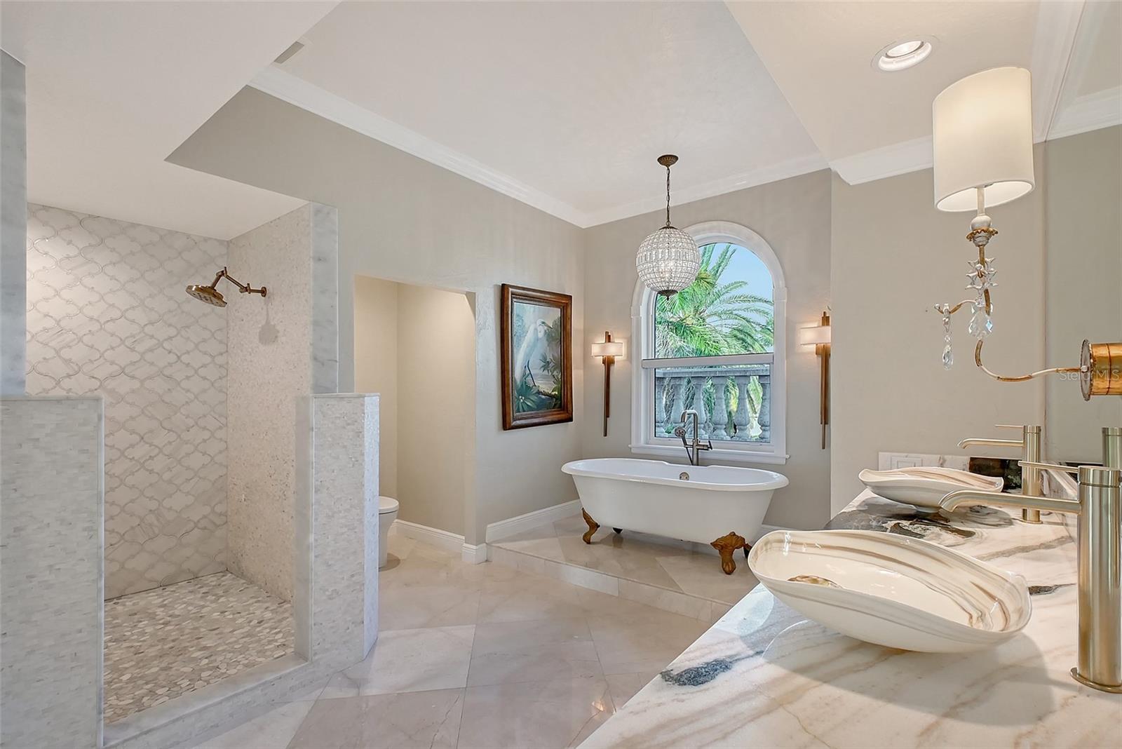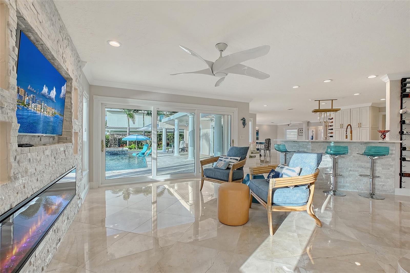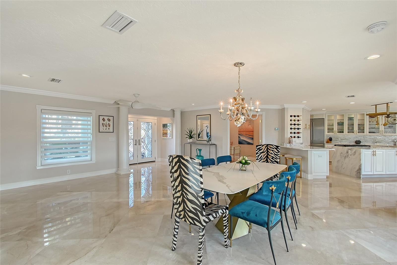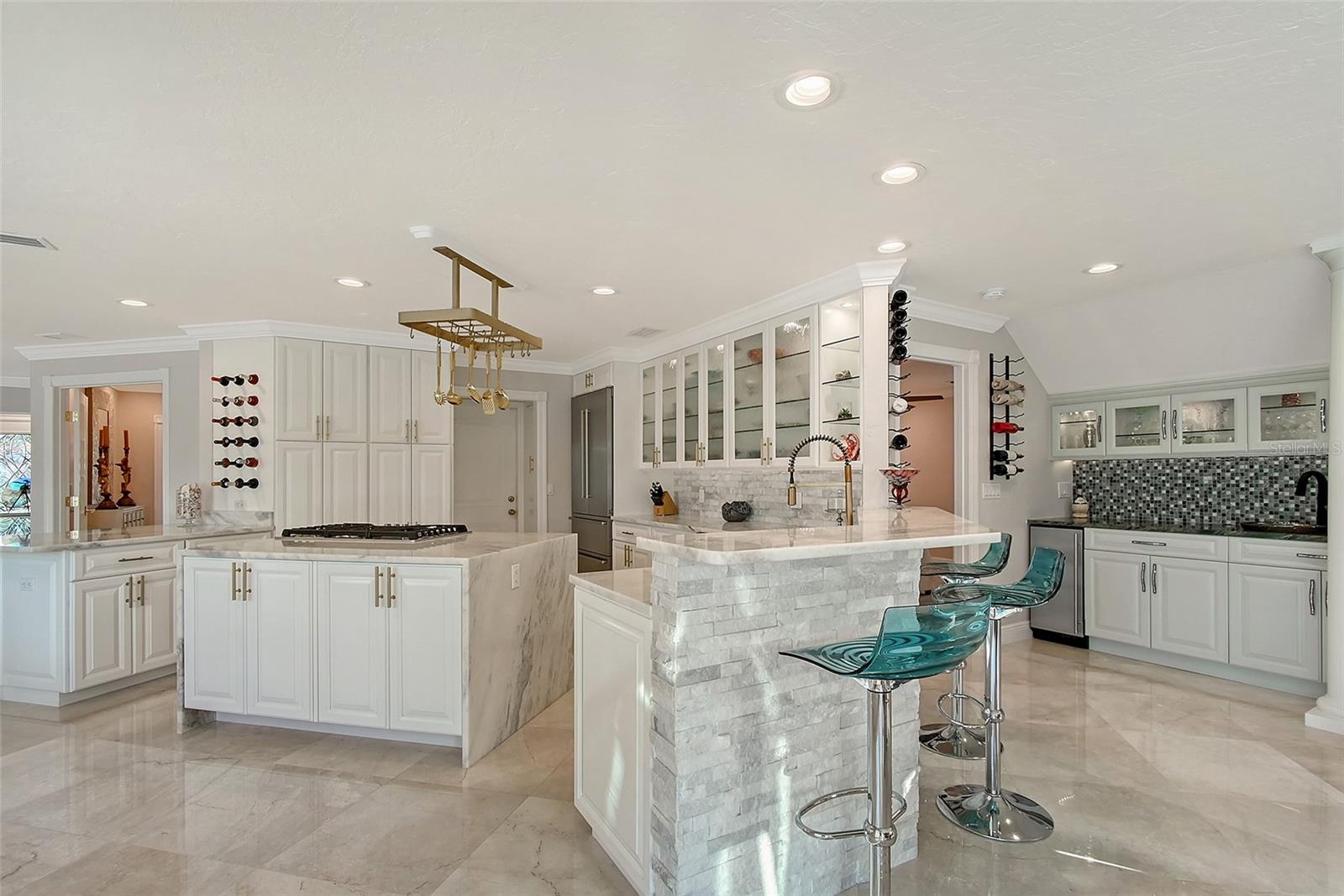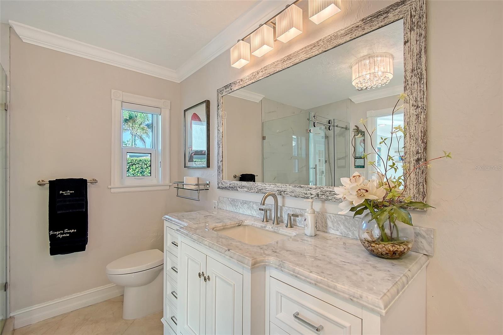 Country Club Shores at its finest. Three homes in from the bay. Attention to detail has created a spectacular updated home, featuring a newer kitchen and appliances, porcelain tile in two bedrooms, newly refinished marble flooring in common areas and baths, custom light fixtures, doors, and trim, along with crown molding. The home is finished with updated high-impact windows and sliders. The details have been extended to the finely appointed, updated baths, featuring marble counters throughout. A wet bar with an ice maker, conveniently just off the family room, makes an excellent feature for you and your guests. A main floor office in addition to two guest bedrooms, one with an en-suite bath, with an abundance of built-ins, with access to the pool and spa, and the other with private access to the full guest bath. The second level features a private primary suite oasis, complete with a balcony and a rooftop terrace, accessed by a spiral staircase offering views of the canal, spectacular sunrises, sunsets, and the Intracoastal Waterway. The primary bath comes complete with double sinks imported from Italy, a claw tub, and a separate shower. If you're looking for a custom walk-in closet, look no further - this home features one. The home features an additional fuel source, a 250-gallon propane tank, which provides gas cooking on the five-burner countertop kitchen range, heating for the hot water tank and spa, and is also roughed in for use on the rooftop terrace. Both the saltwater pool and spa underwent remodeling, featuring the added luxury of shallow pool lounging and flowing water fountains. The garage features its mini-split air conditioning unit, enabling you to work extended hours on projects. The dock comes complete with a 20,000-pound boat lift, a jet ski lift, electricity, and a jet ski port. The inspiring exterior custom lighting transforms the day into an evening of soft flickering glows with accents of palm trees, landscaping, and architectural splendor. Luxury has no boundaries in this renovated, finely appointed canal-front home, with deeded beach access just across the Gulf of Mexico Drive at the crosswalk. South of Publix, CVS, banks, places of worship, public tennis, and a short drive to St. Armands Circle, along with Sarasota and all it offers.