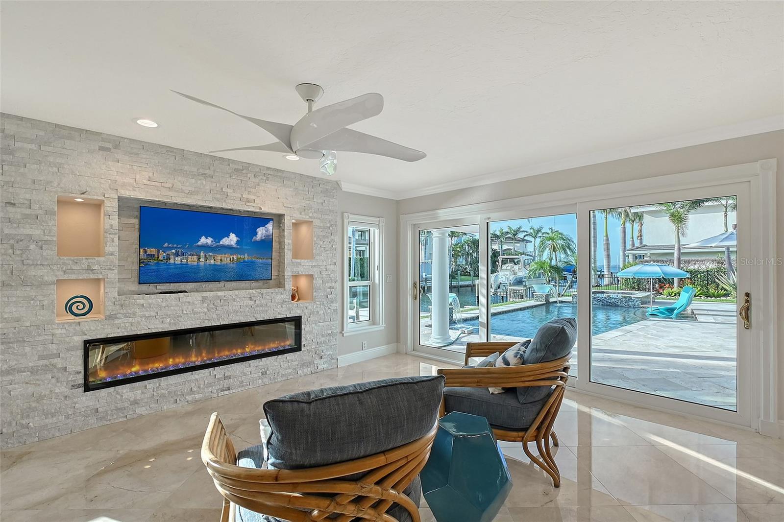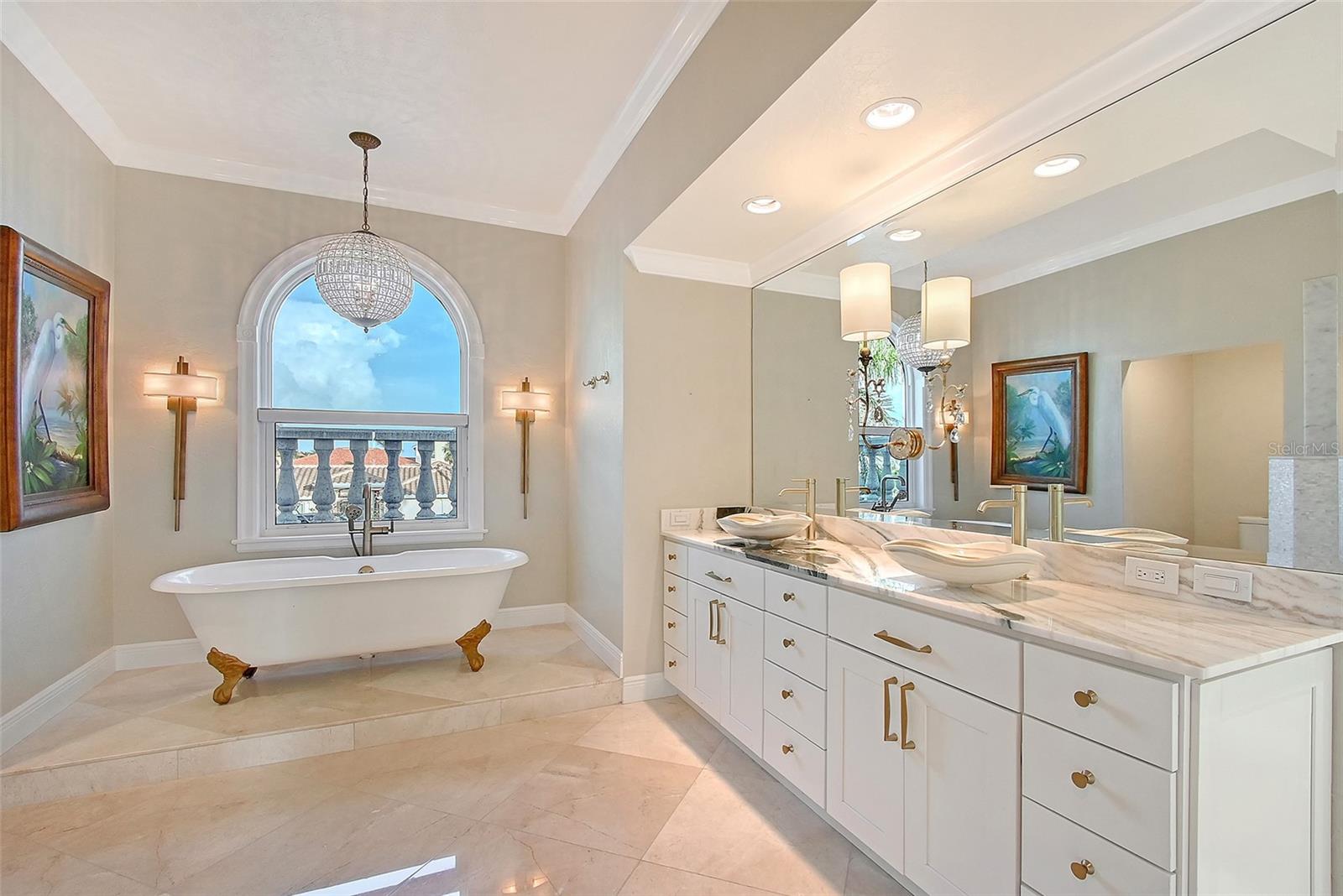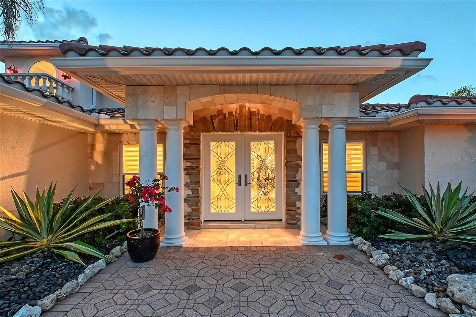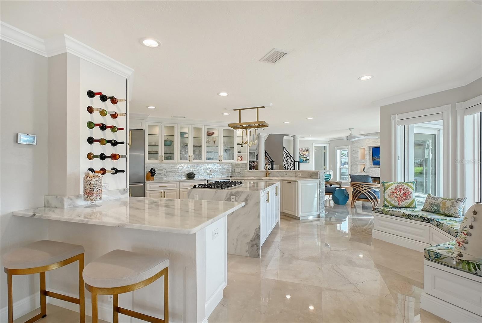 Country Club Shores at its finest. Three homes in from the bay. Attention to detail has created a spectacular updated home, featuring a newer kitchen and appliances, porcelain tile in two bedrooms, newly refinished marble flooring in common areas and baths, custom light fixtures, doors, and trim, along with crown molding. The home is finished with updated high-impact windows and sliders. The details have been extended to the finely appointed, updated baths, featuring marble counters throughout. A wet bar with an ice maker, conveniently just off the family room, makes an excellent feature for you and your guests. A main floor office in addition to two guest bedrooms, one with an en-suite bath, with an abundance of built-ins, with access to the pool and spa, and the other with private access to the full guest bath. The second level features a private primary suite oasis, complete with a balcony and a rooftop terrace, accessed by a spiral staircase offering views of the canal, spectacular sunrises, sunsets, and the Intracoastal Waterway. The primary bath comes complete with double sinks imported from Italy, a claw tub, and a separate shower. If you're looking for a custom walk-in closet, look no further - this home features one. The home features an additional fuel source, a 250-gallon propane tank, which provides gas cooking on the five-burner countertop kitchen range, heating for the hot water tank and spa, and is also roughed in for use on the rooftop terrace. Both the saltwater pool and spa underwent remodeling, featuring the added luxury of shallow pool lounging and flowing water fountains. The garage features its mini-split air conditioning unit, enabling you to work extended hours on projects. The dock comes complete with a 20,000-pound boat lift, a jet ski lift, electricity, and a jet ski port. The inspiring exterior custom lighting transforms the day into an evening of soft flickering glows with accents of palm trees, landscaping, and architectural splendor. Luxury has no boundaries in this renovated, finely appointed canal-front home, with deeded beach access just across the Gulf of Mexico Drive at the crosswalk. South of Publix, CVS, banks, places of worship, public tennis, and a short drive to St. Armands Circle, along with Sarasota and all it offers.